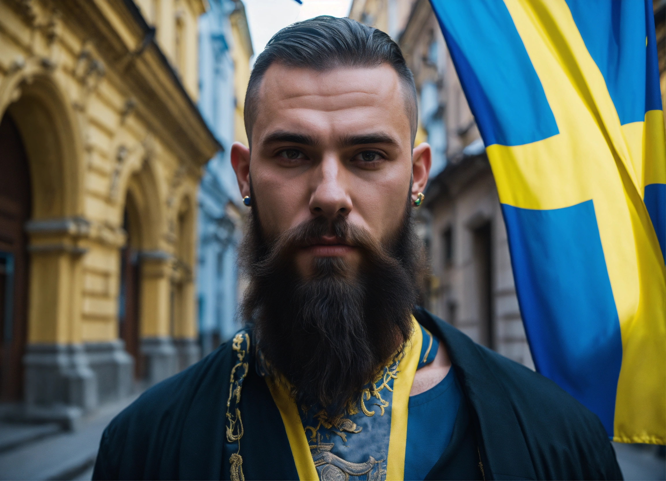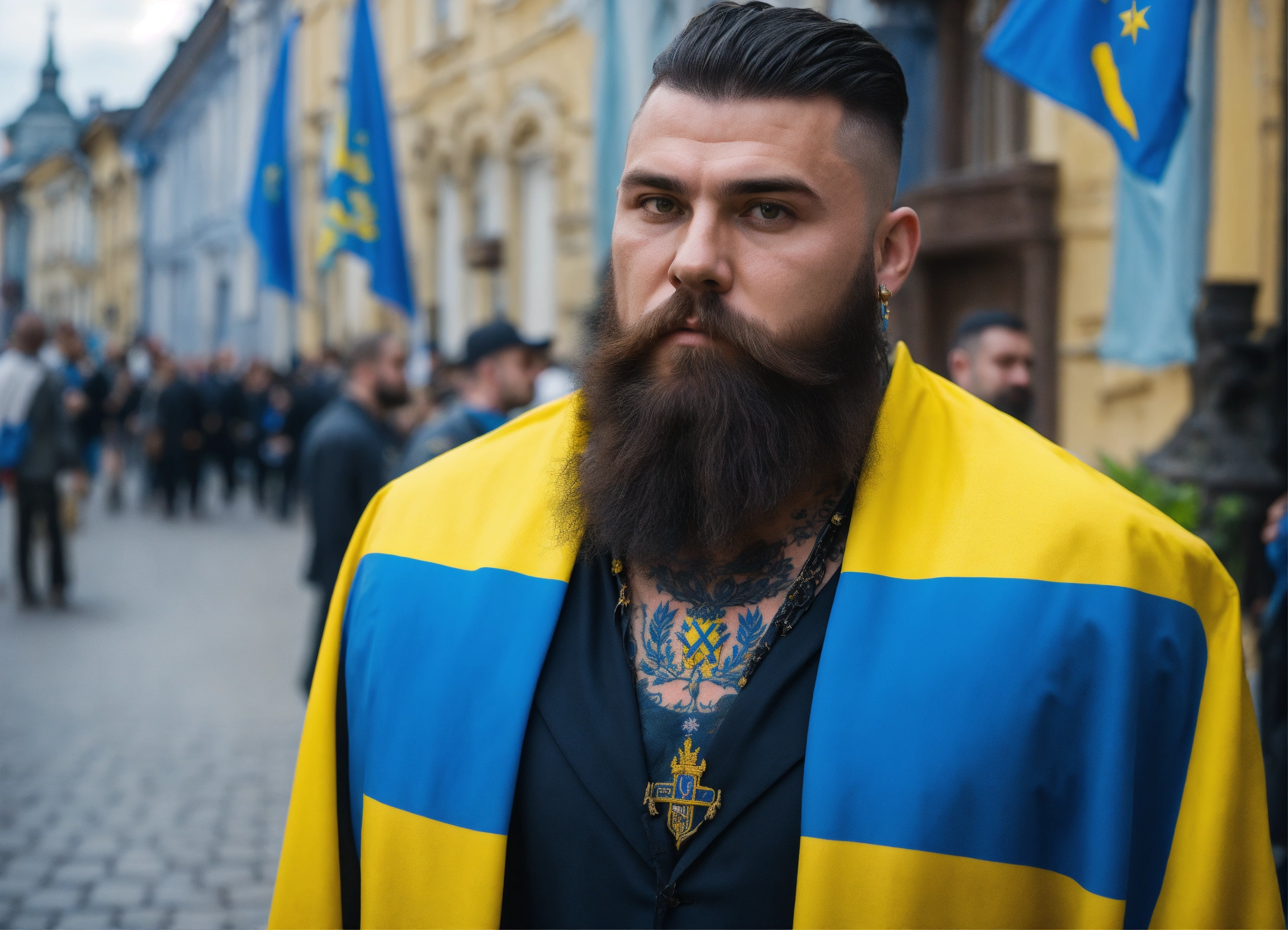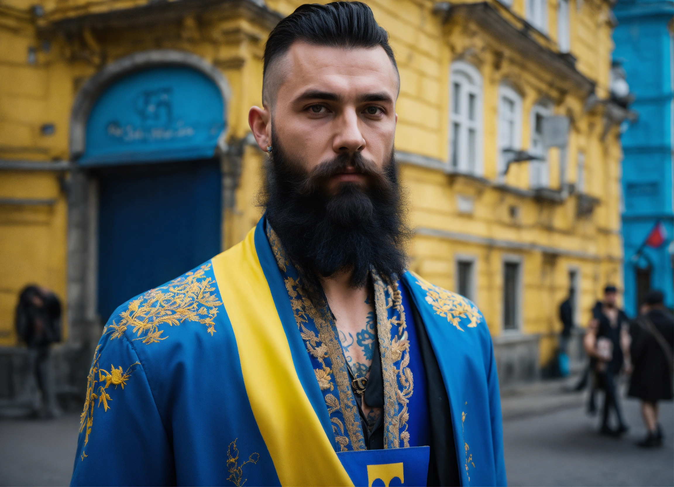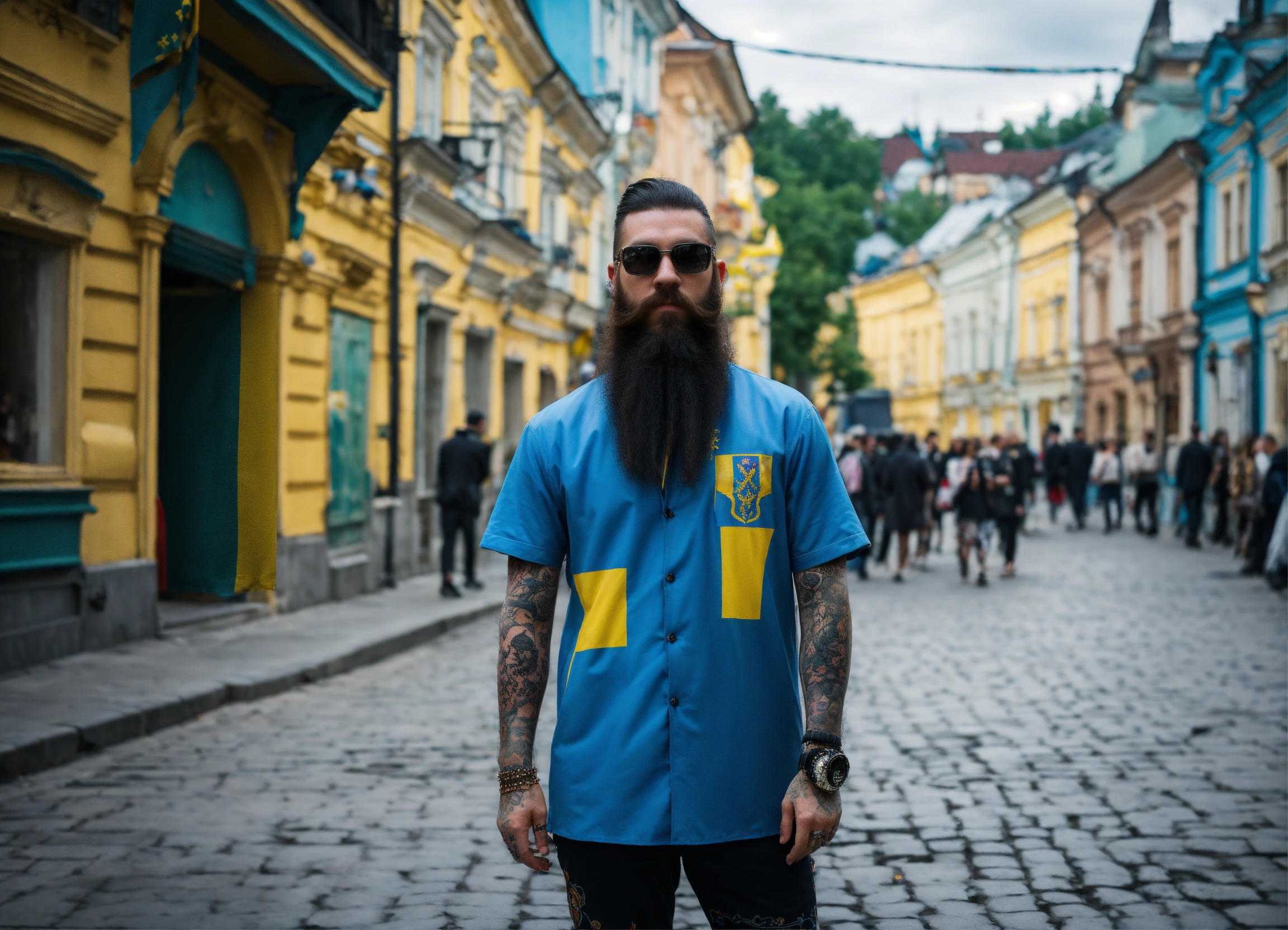 Cyberpunk сute man with ukraine flag, on street lviv, without glasess, blue background, turism, black hair, coat of arms of ukraine, turism, cyberpunk style, azov, long beard, tattoos, summer, bold, dressed in embroidered shirt