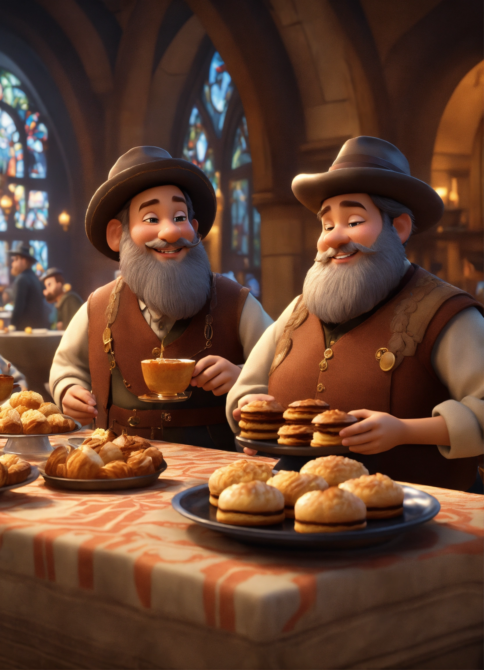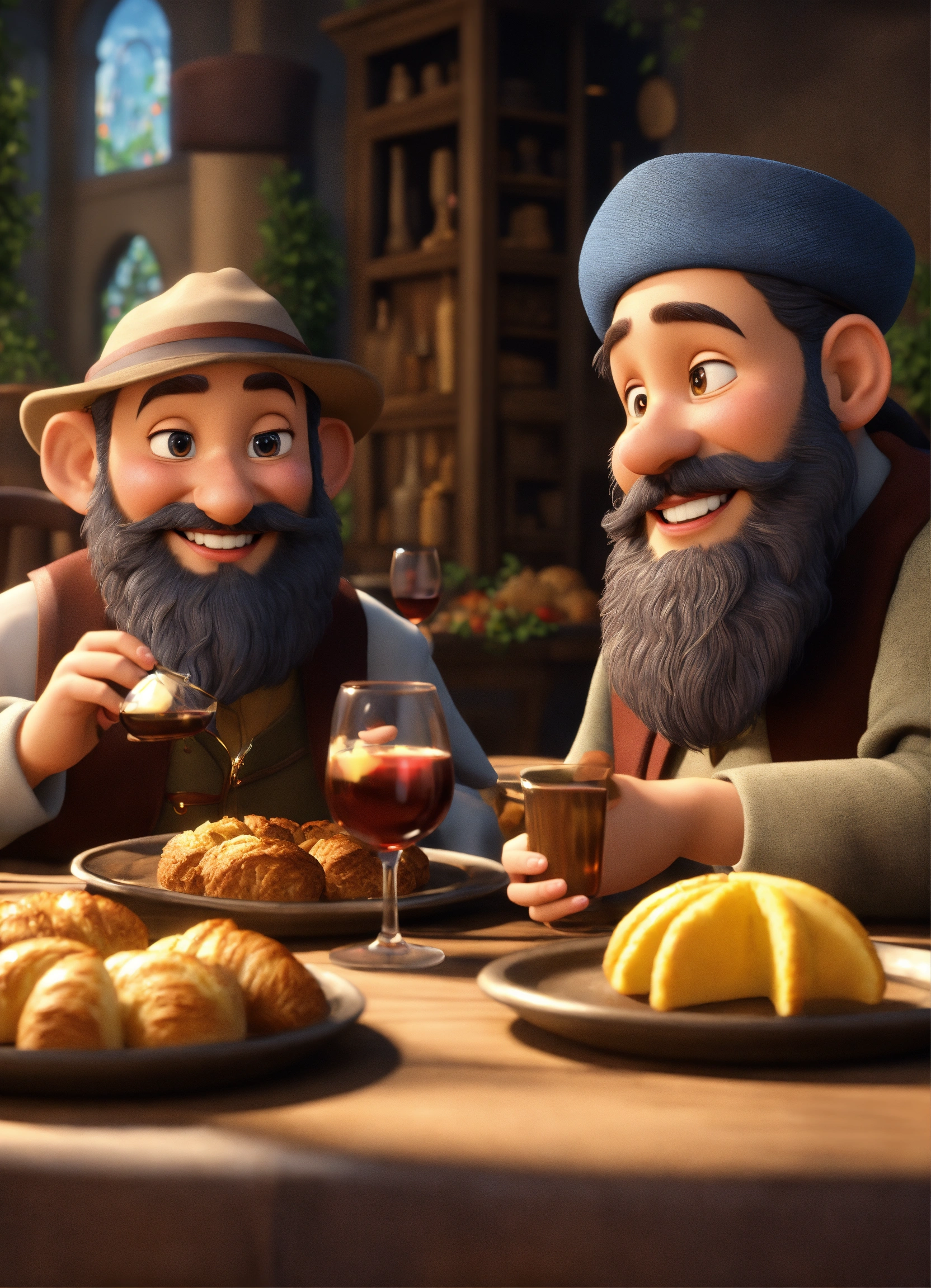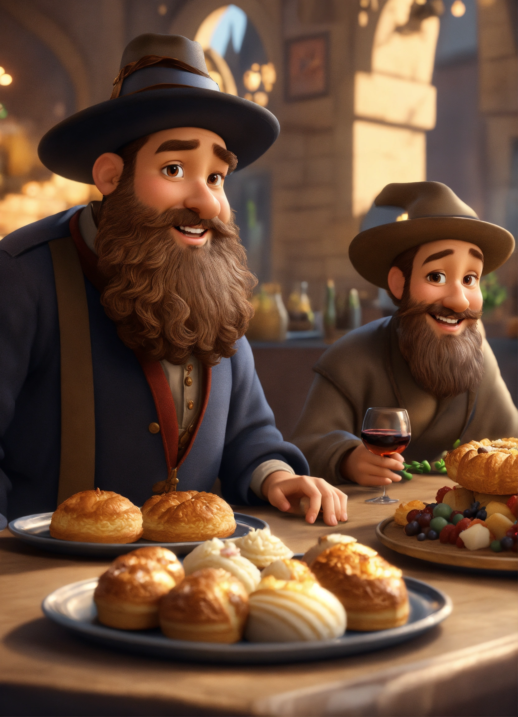 Pious jews from the middle ages, with beards, one black and one white, smiling, with a low-brimmed hat, in the background tables set with pastries and decorated wine glasses, masterpiece, very detailed, hyper realistic, 3d style, disney style, 8k, beautiful, live style, cartoon character in pixar style, pixar style, 3d style, looks real, masterpiece, very detailed, hyper realistic, 3d style, disney style, 8k, beautiful, live style, cartoon character in pixar style, pixar style, 3d style