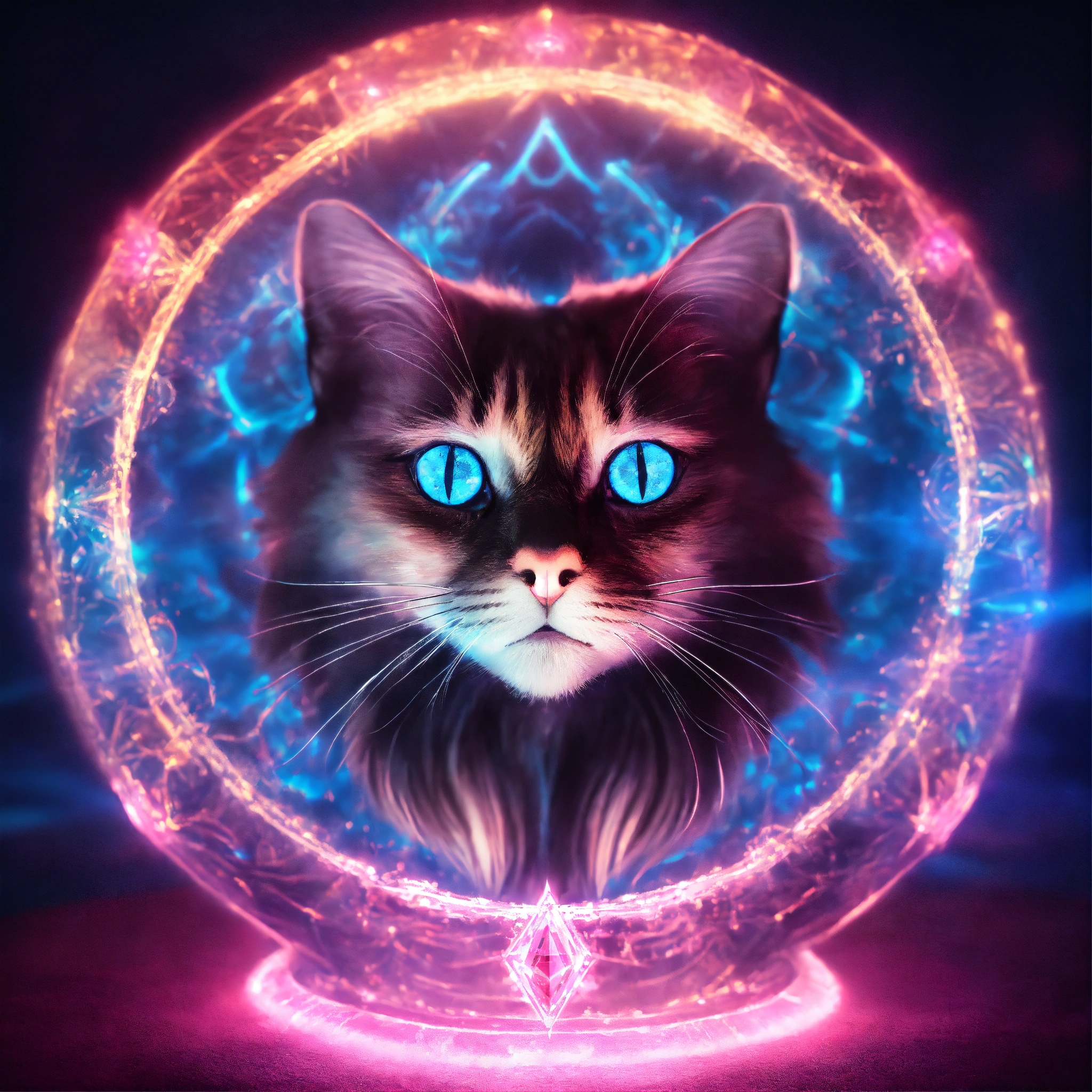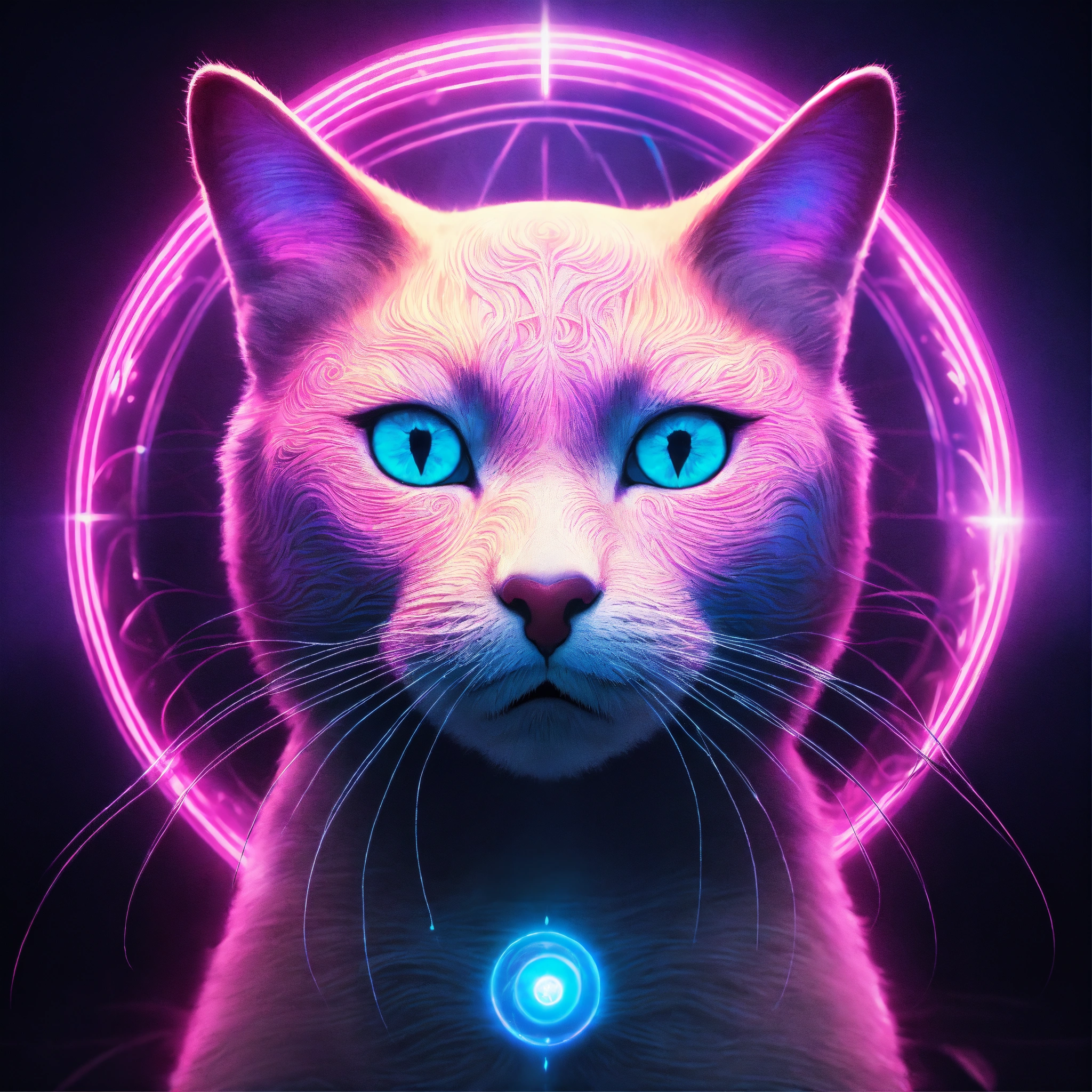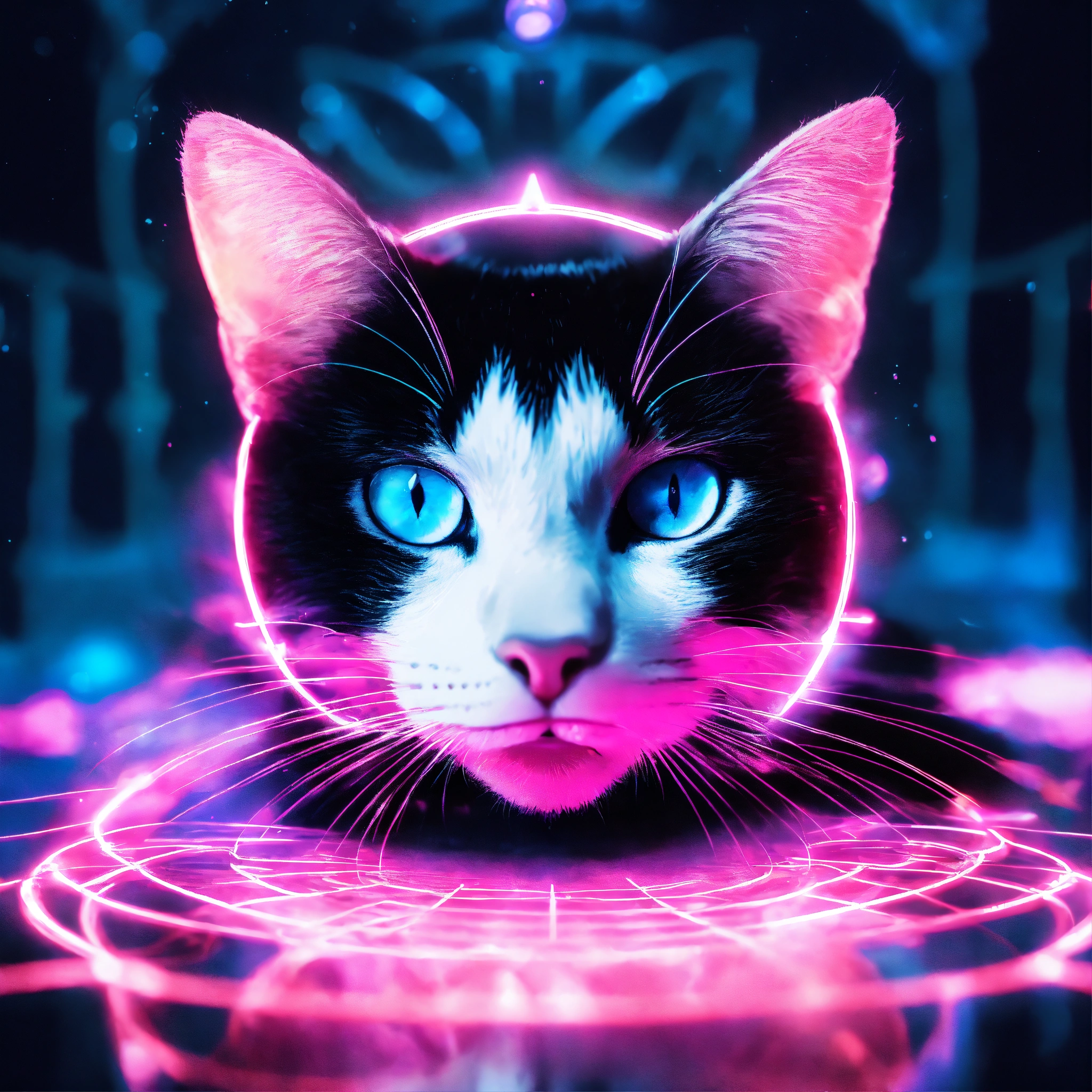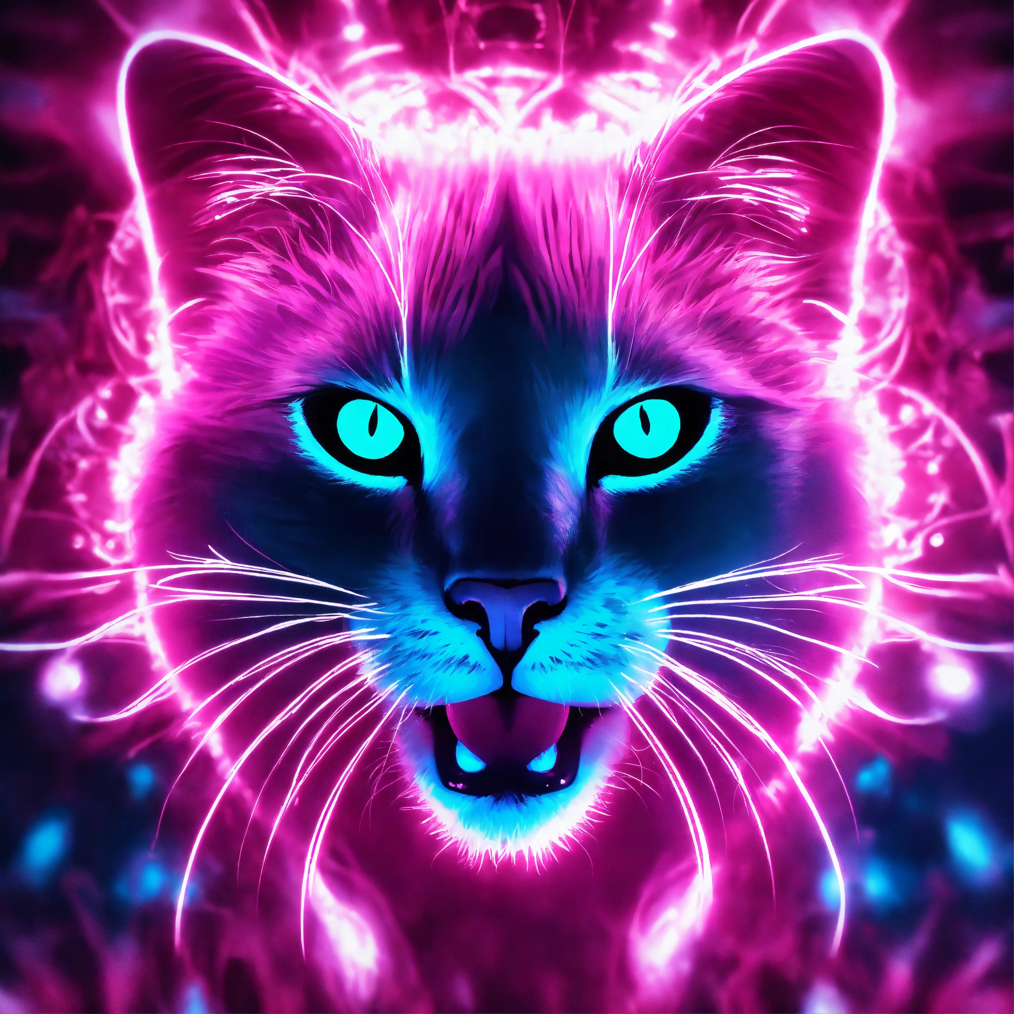 Underwater portrait photography, long exposure, powerful smiley mystic white and black cat face portrait facing front, blue eyes. front view. front portrait, no angle. backlit. positive. smiling. white pink neon glow. angelic face. sacred geometry patterns on the face, in the style of disney, pixar, tim burton, chronicles of narnia, beauty and the beast, and peter pan. enchanting glowing orb aura. fractal, volumetric lighting, backlit. the power of the god. god-like, spirit-like.