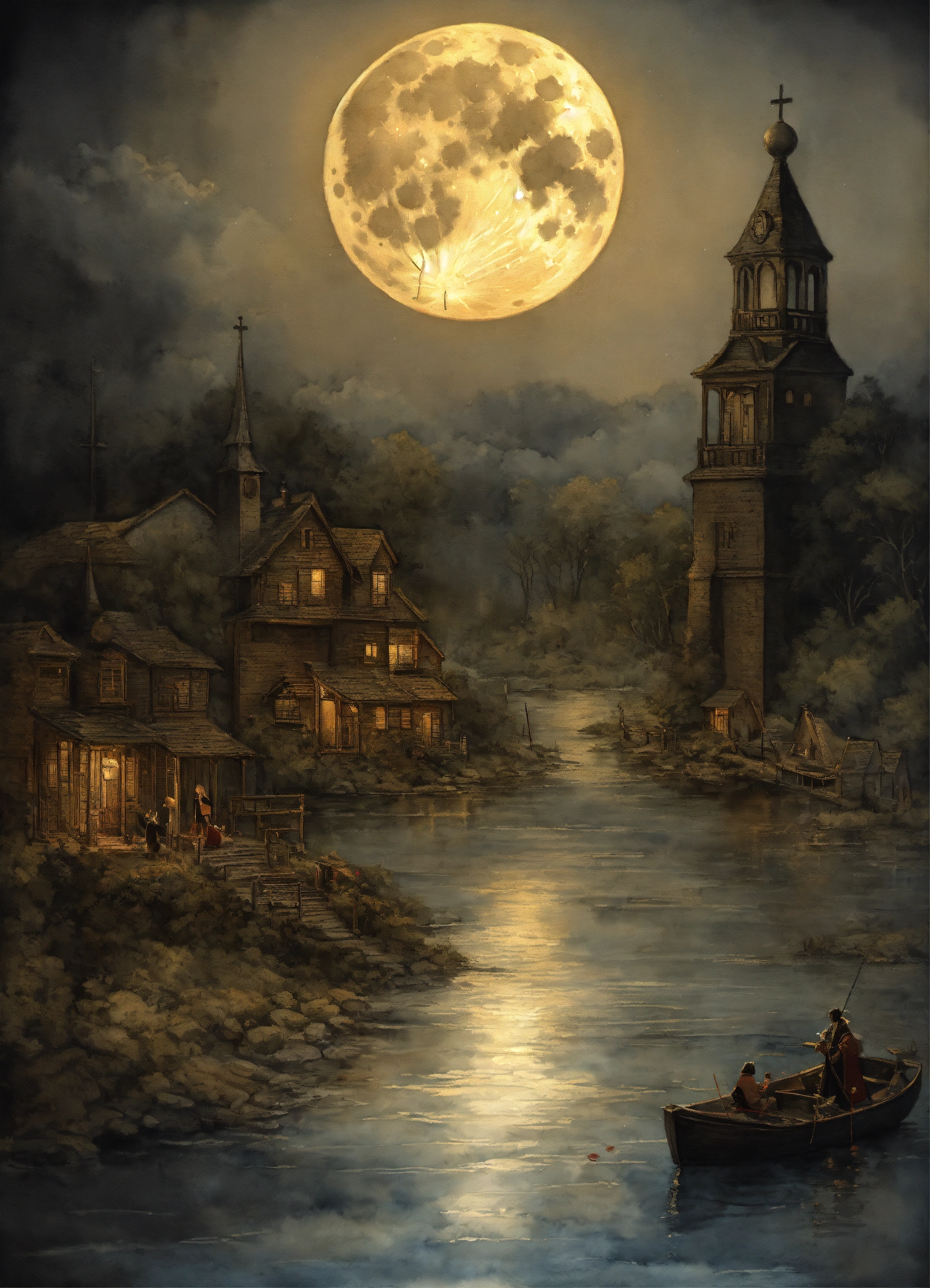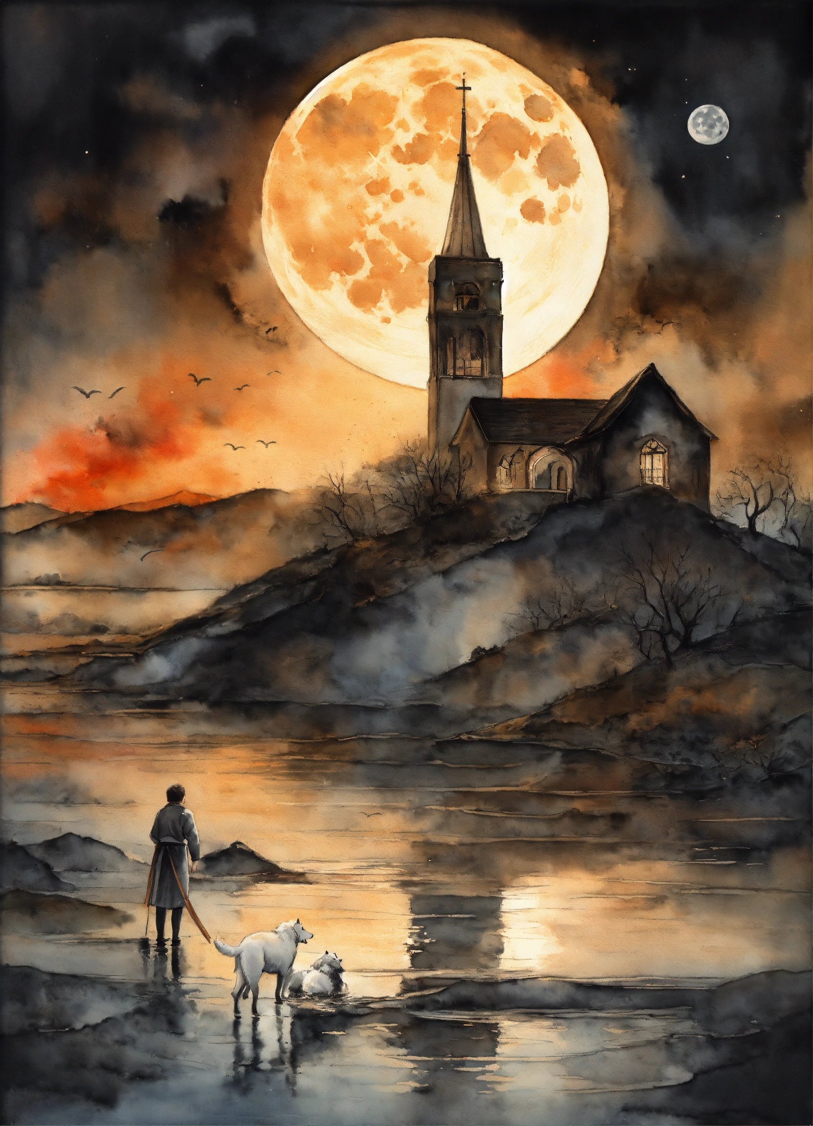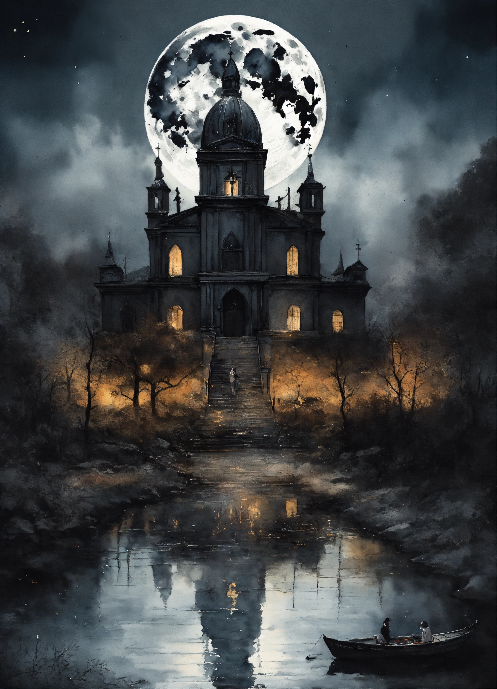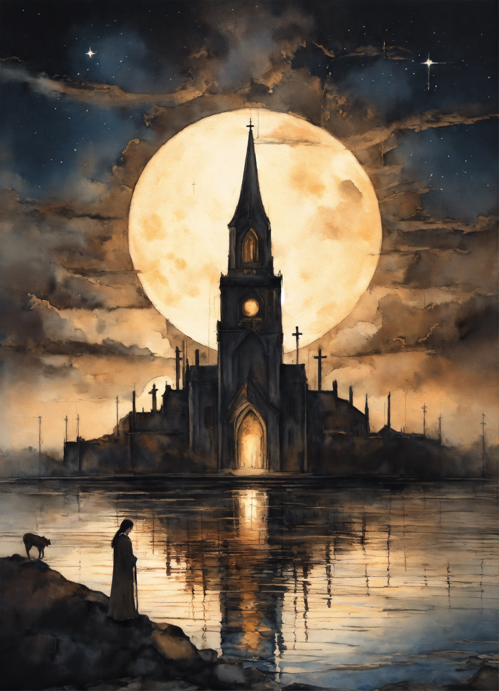 Blend of two styles (1, 2) 1. graphite art to meticulously capture the raw emotion and depth of the narrative. watercolor splatter reflecting the passionate and tumultuous relationship with faith, love, and sacrifice. 2. noir art emphasizing the duality of sin and salvation, devotion and betrayal. theme the intense struggle of love, faith, and sacrifice, entwined with the concept of worship and the harsh realities of devotion and earthly desires. central imagery a full moon with a smiling face, surrounded by stars. below, there are two towers and a mysterious path. two dogs and a lobster also emerge from the water. background full moon juxtaposed with lush, sunlit landscapes symbolizing the radiant presence.