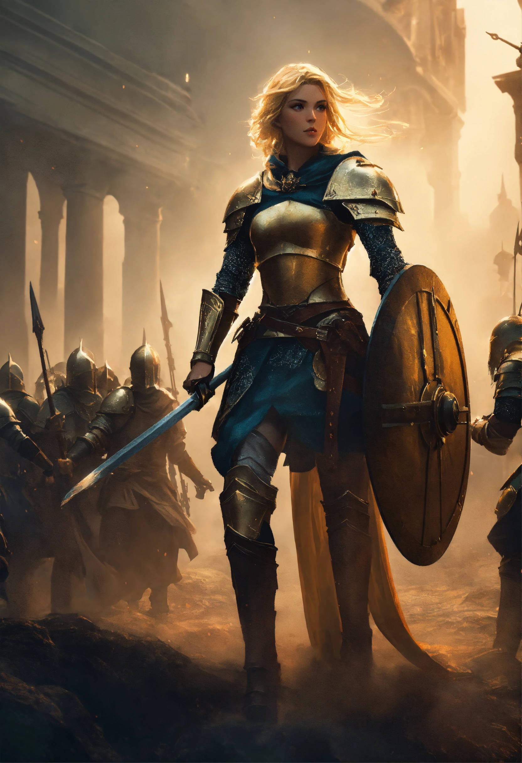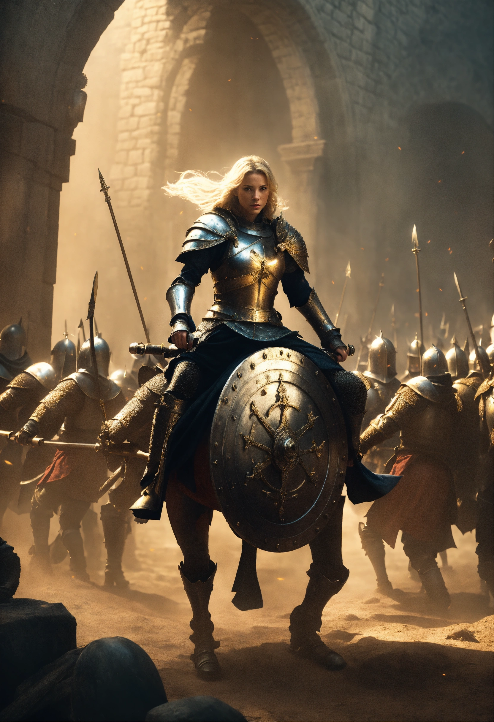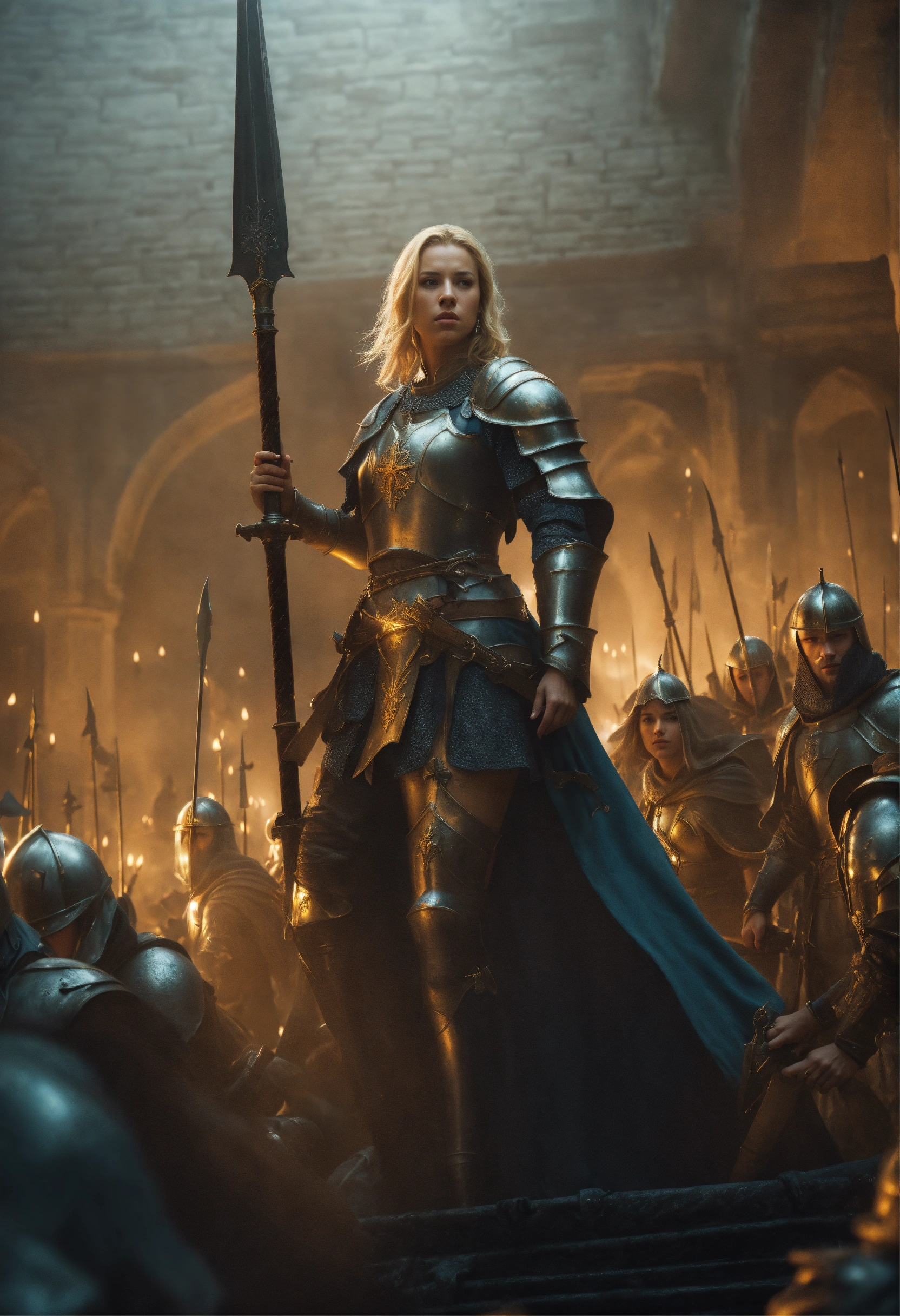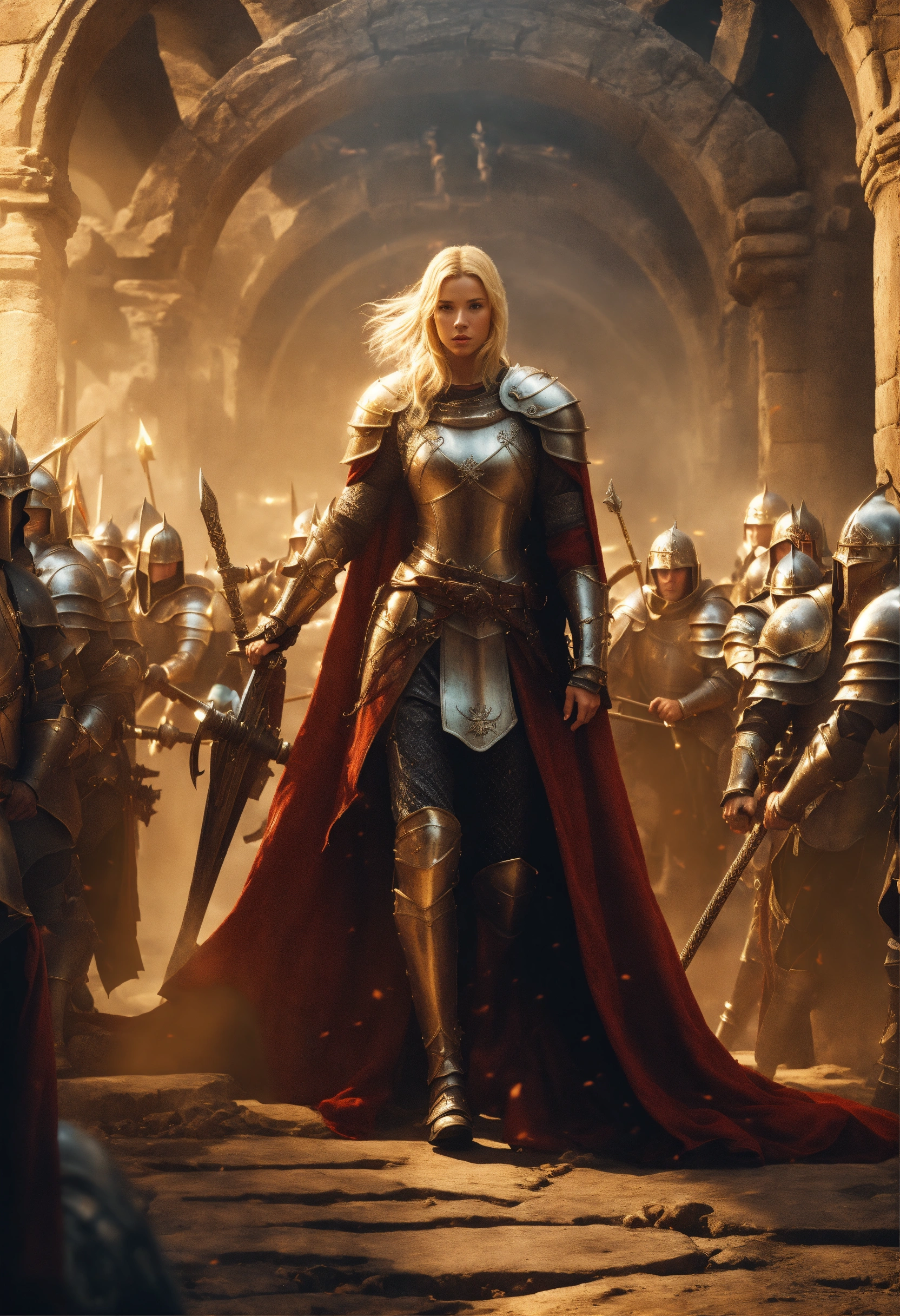 An epic fantasy scene featuring a gorgeous beautiful blonde female crusader stretched on a big wheel, surrounded of male warriors in a misty tomb. cinematic view, sharp detail.
