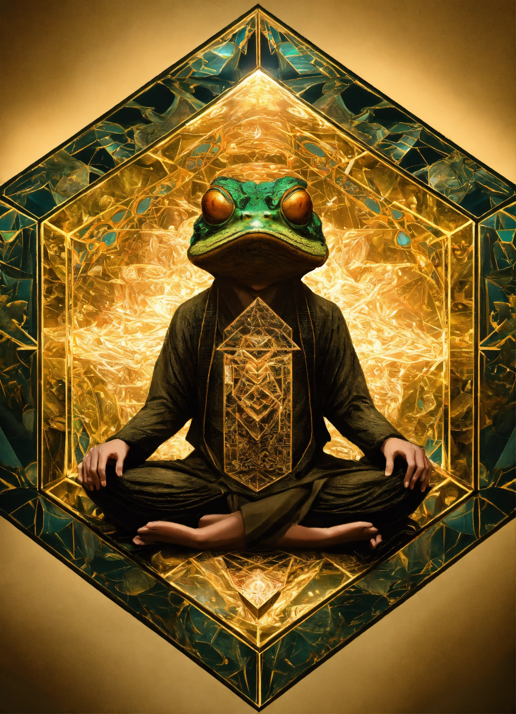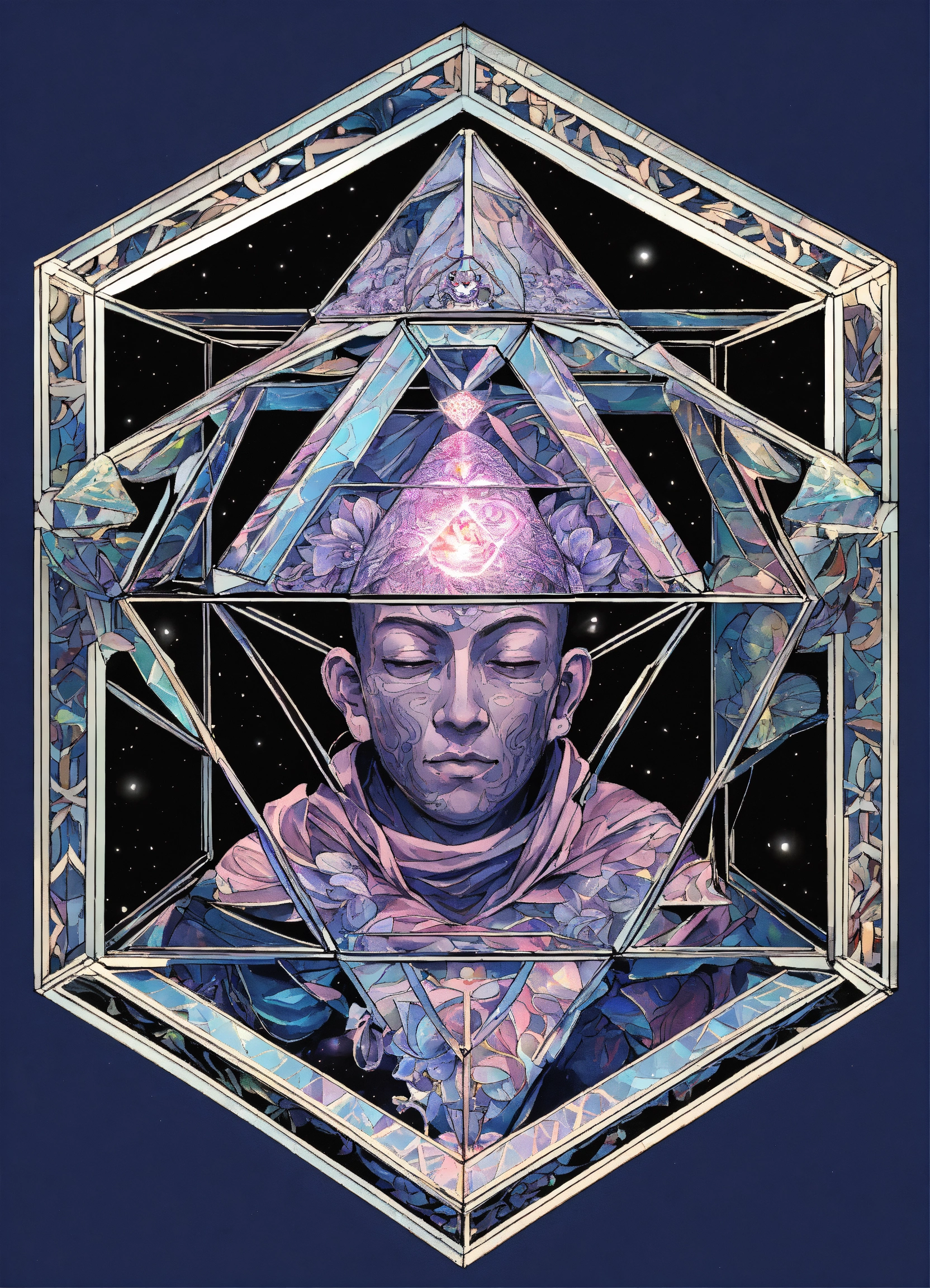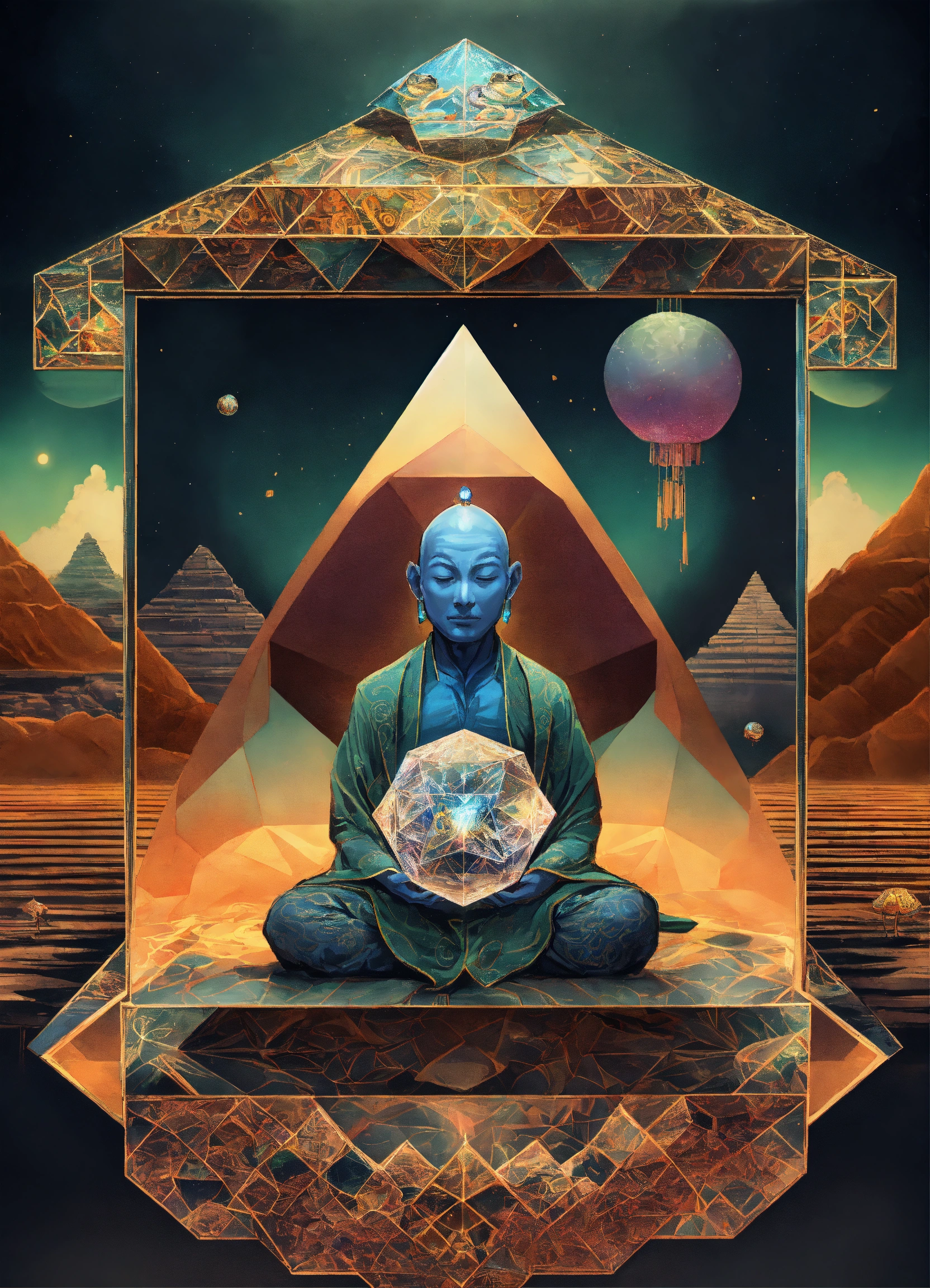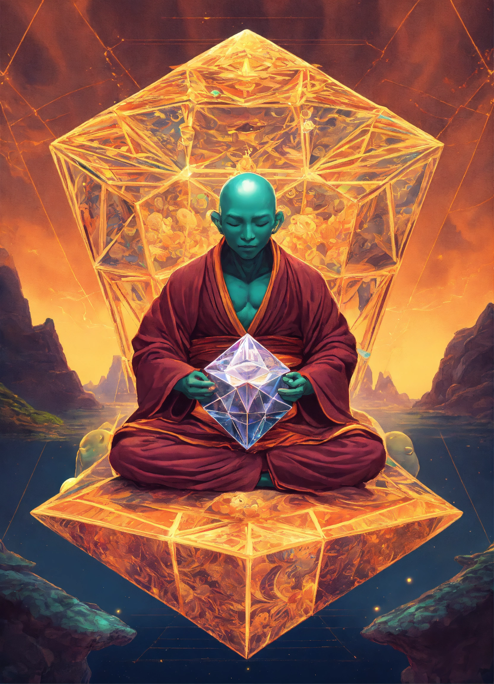 Diamond toad that is taoist monk that is meditating in a tesseract fractal three point perspective hypercube mirror zen face brain mayan mantis jellyfish face