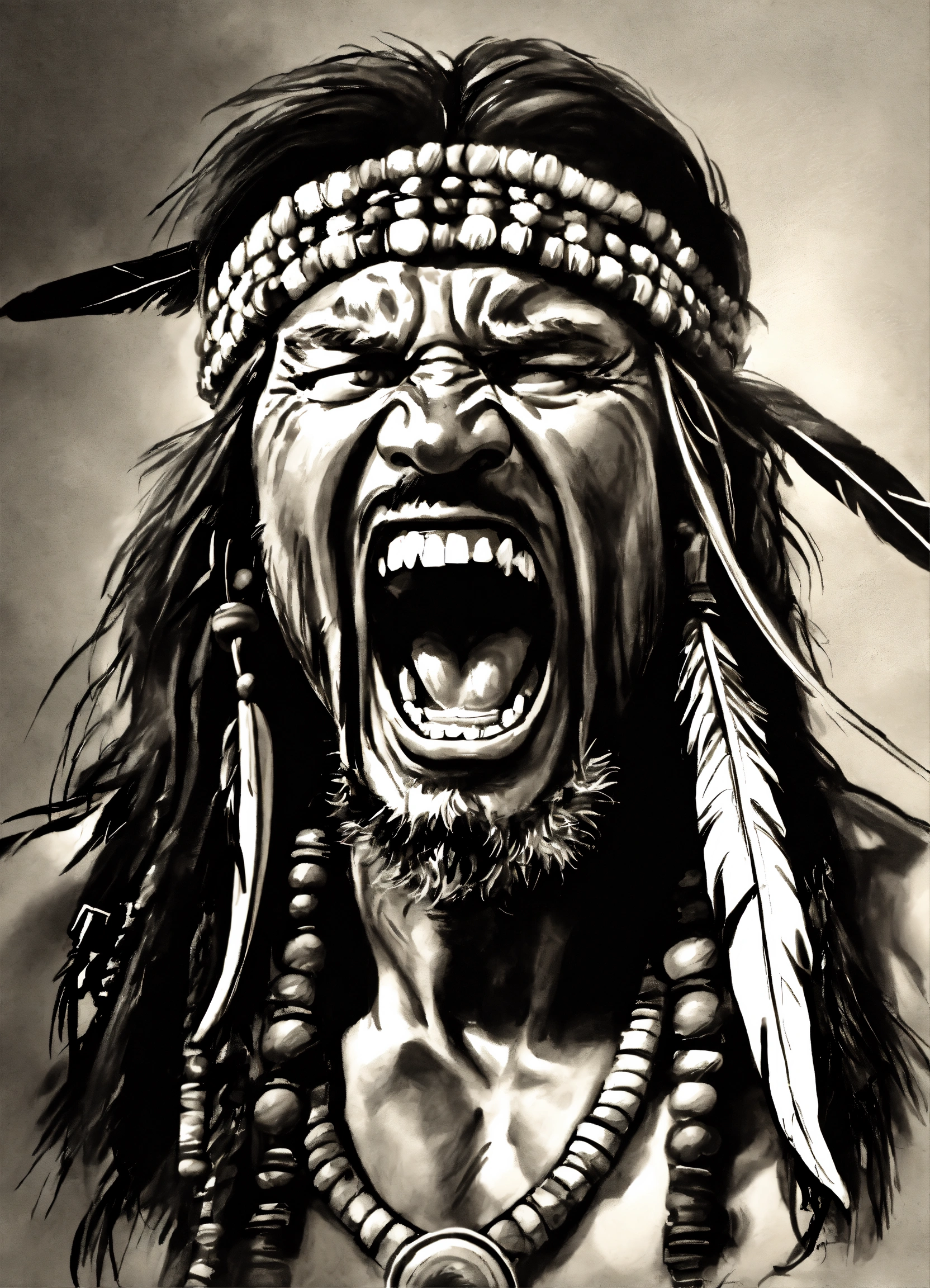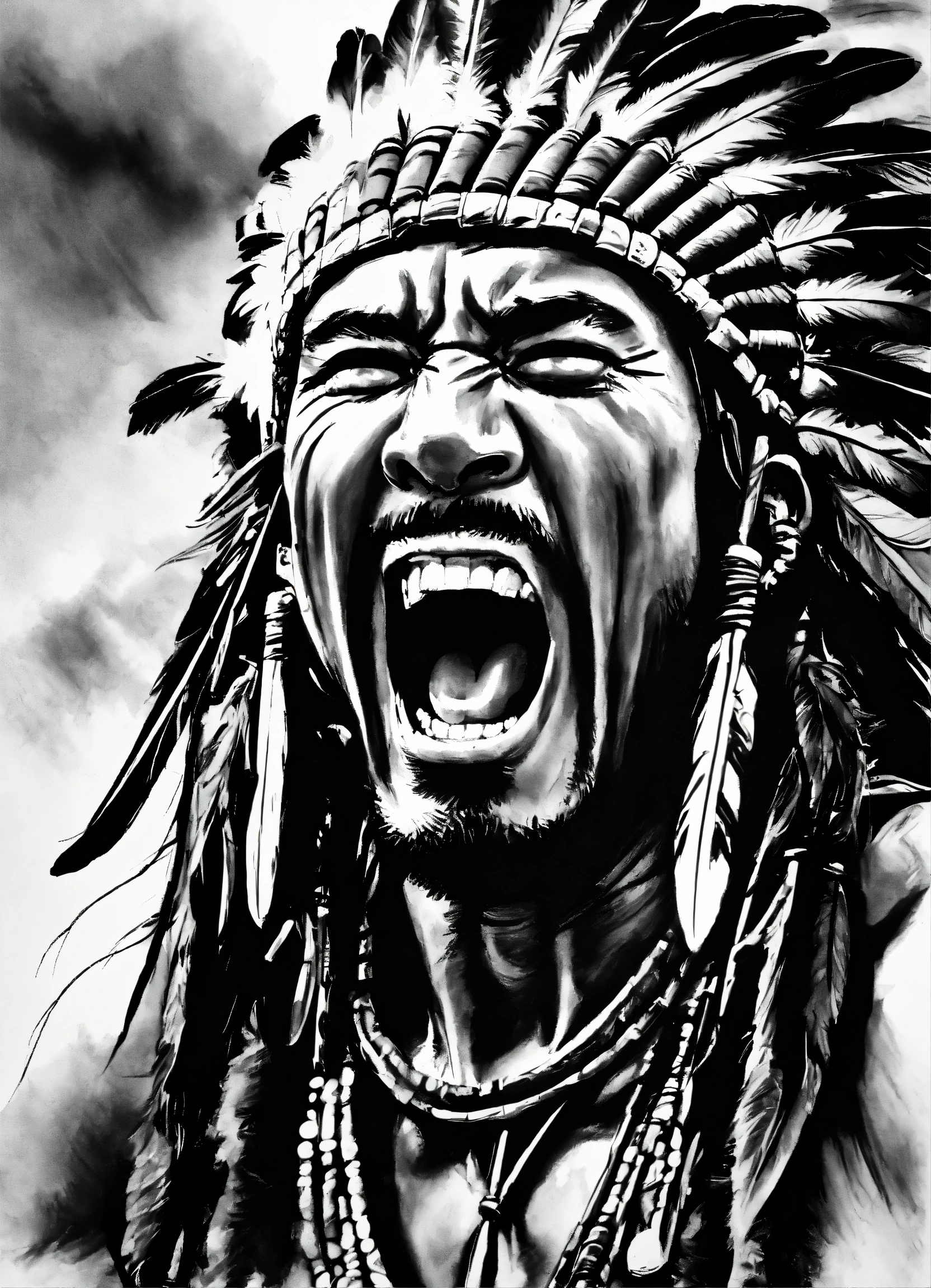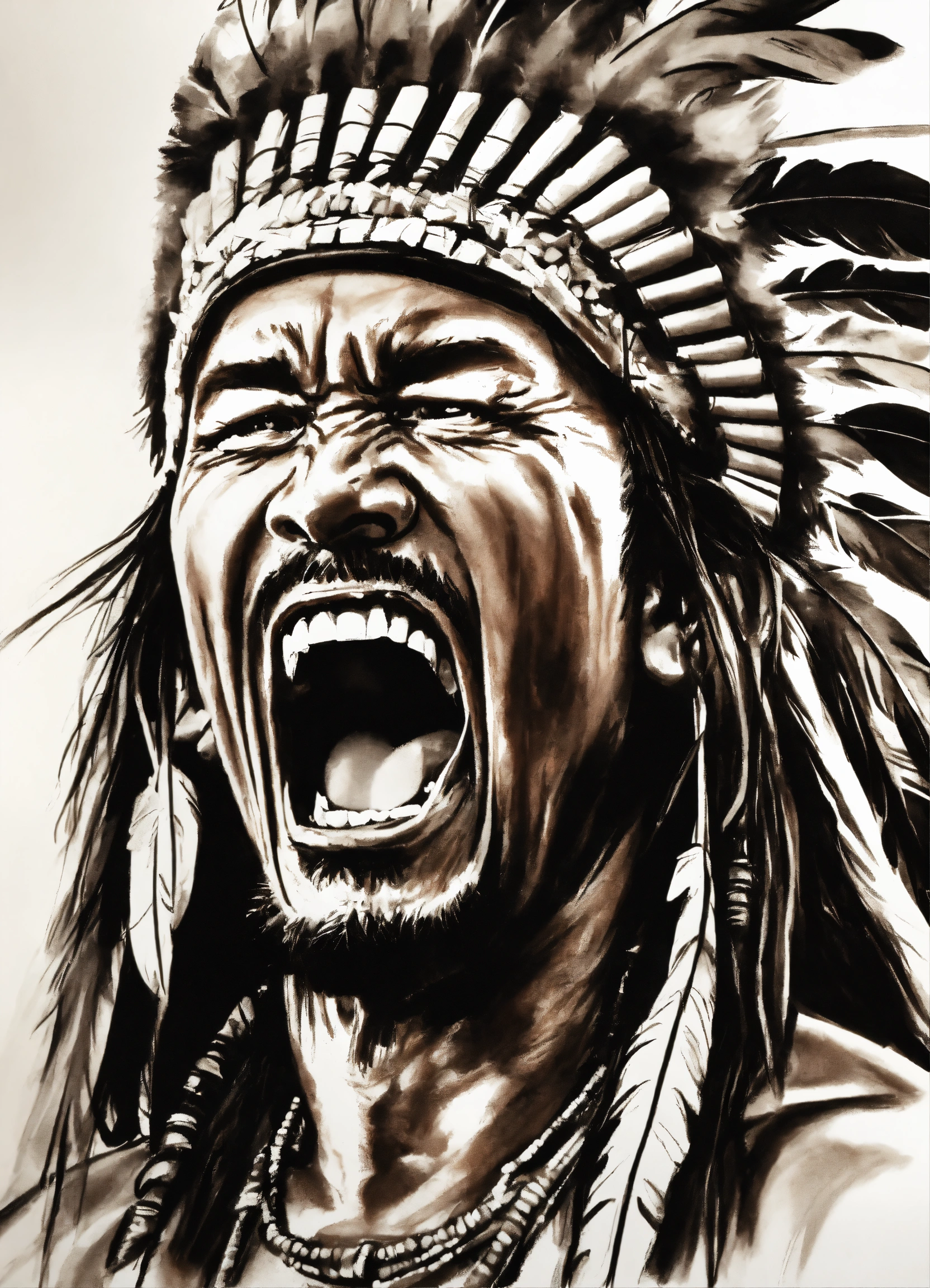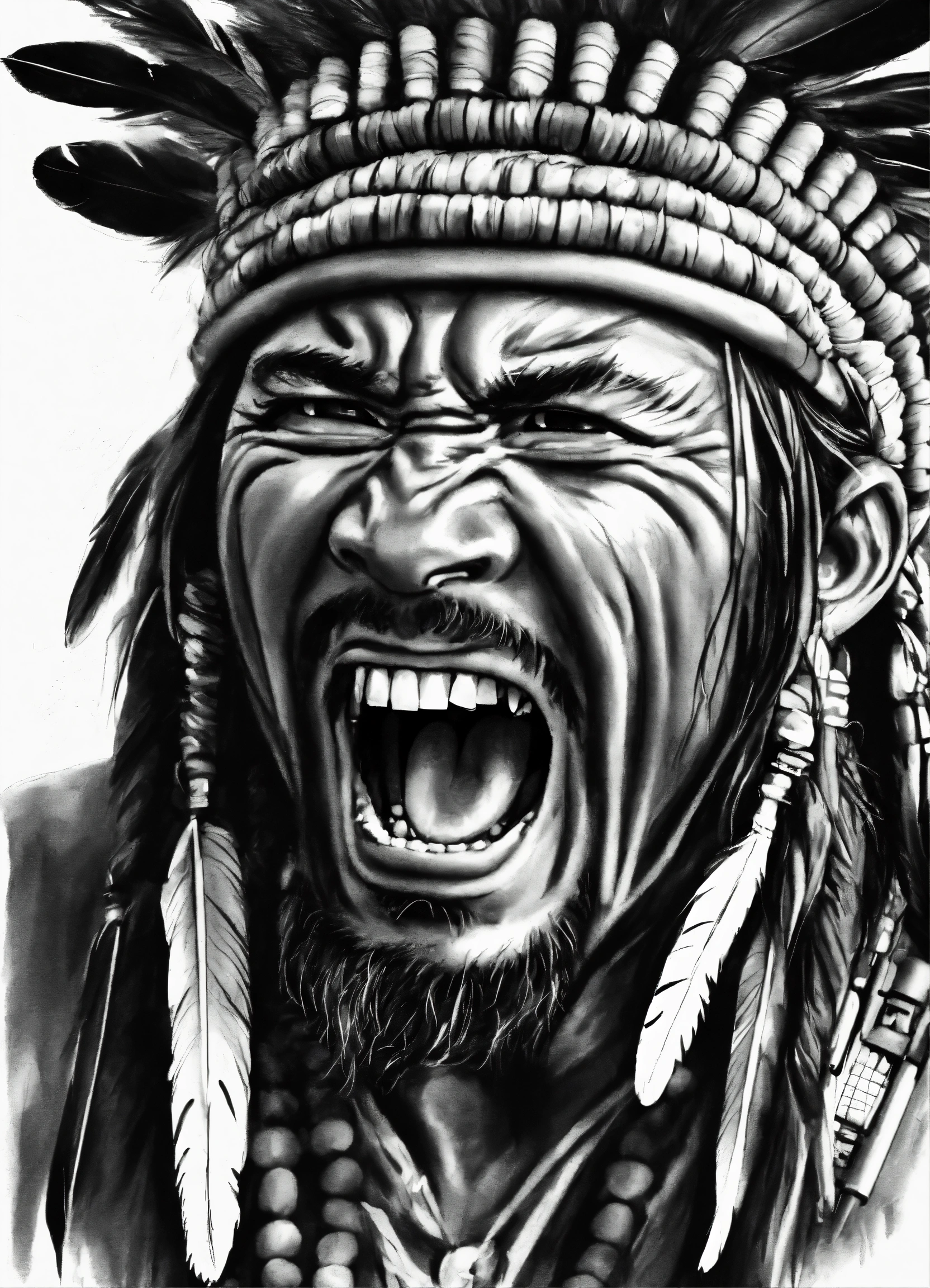 Sketch a realistic full apache screaming on white paper