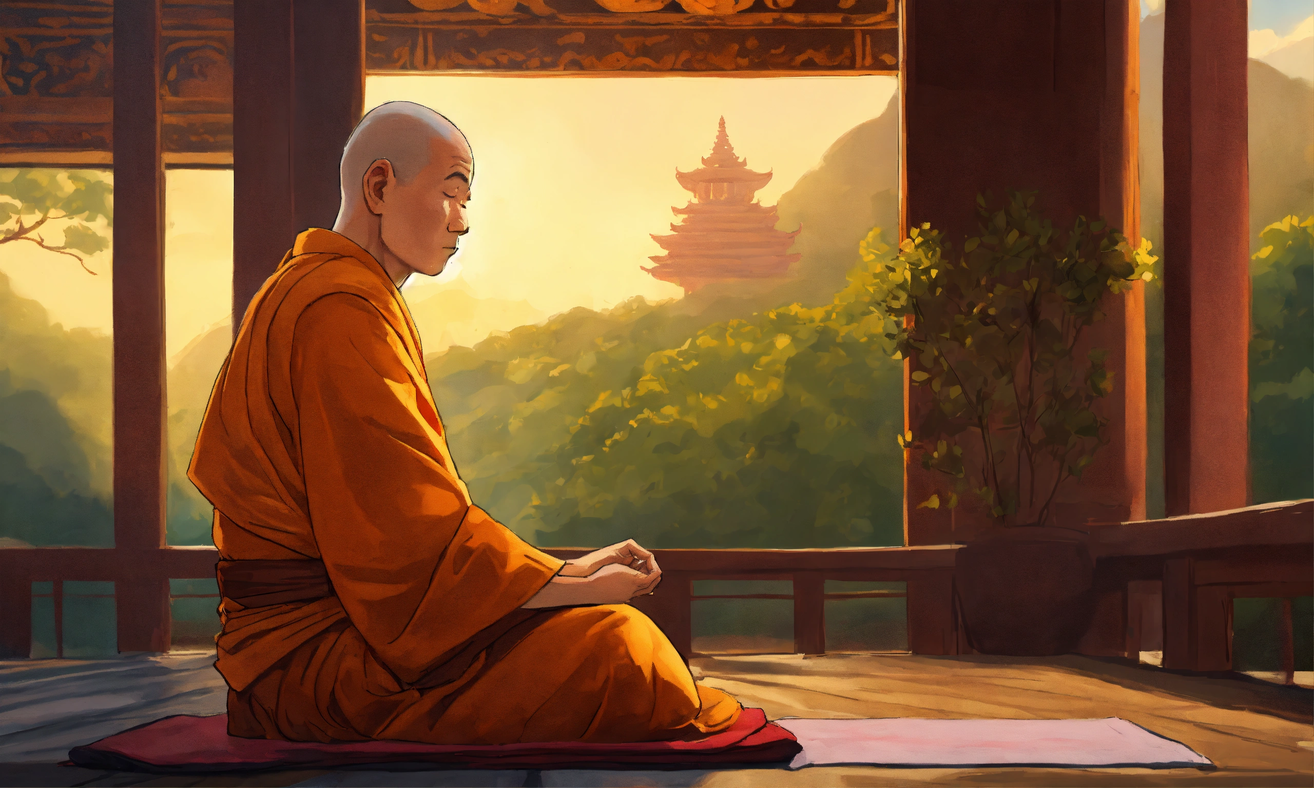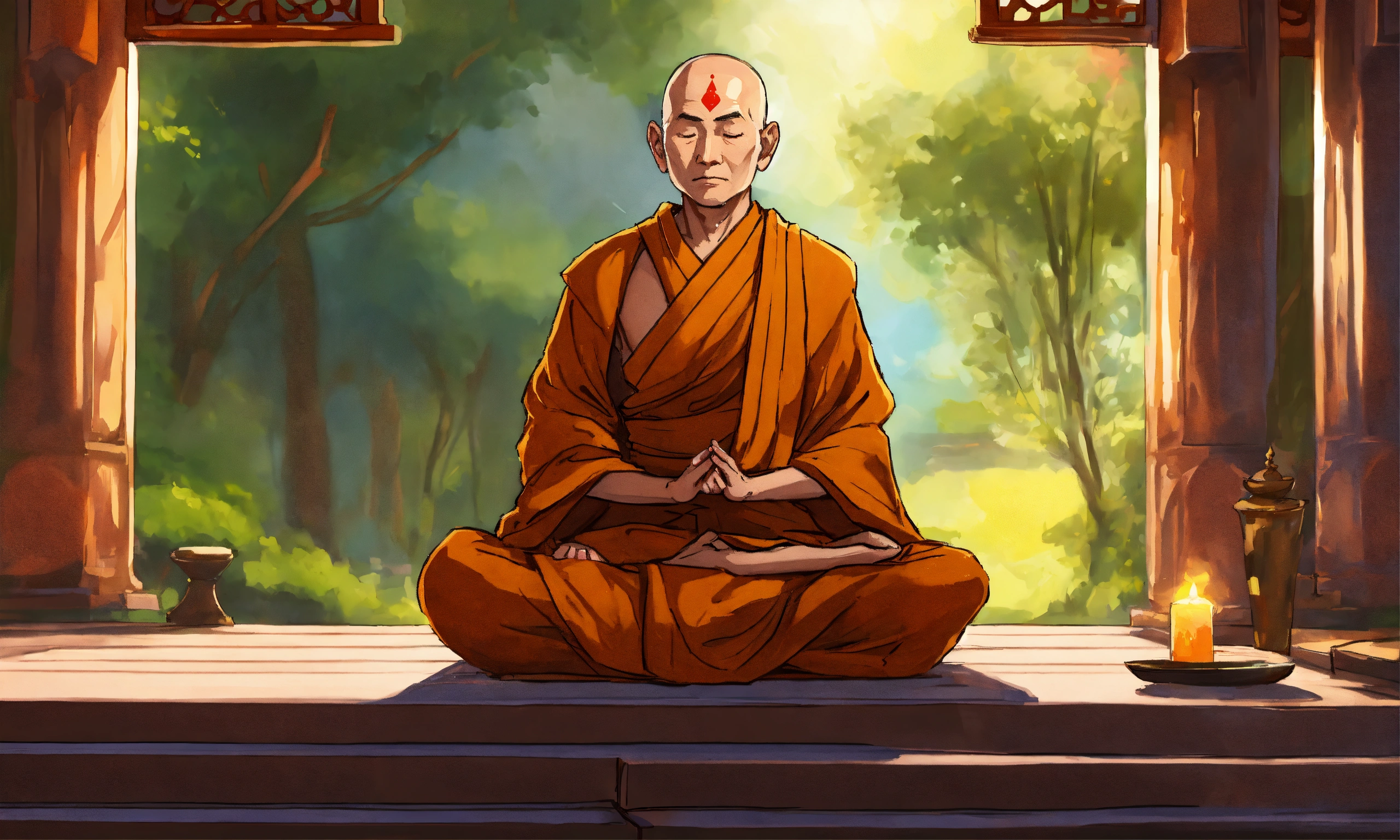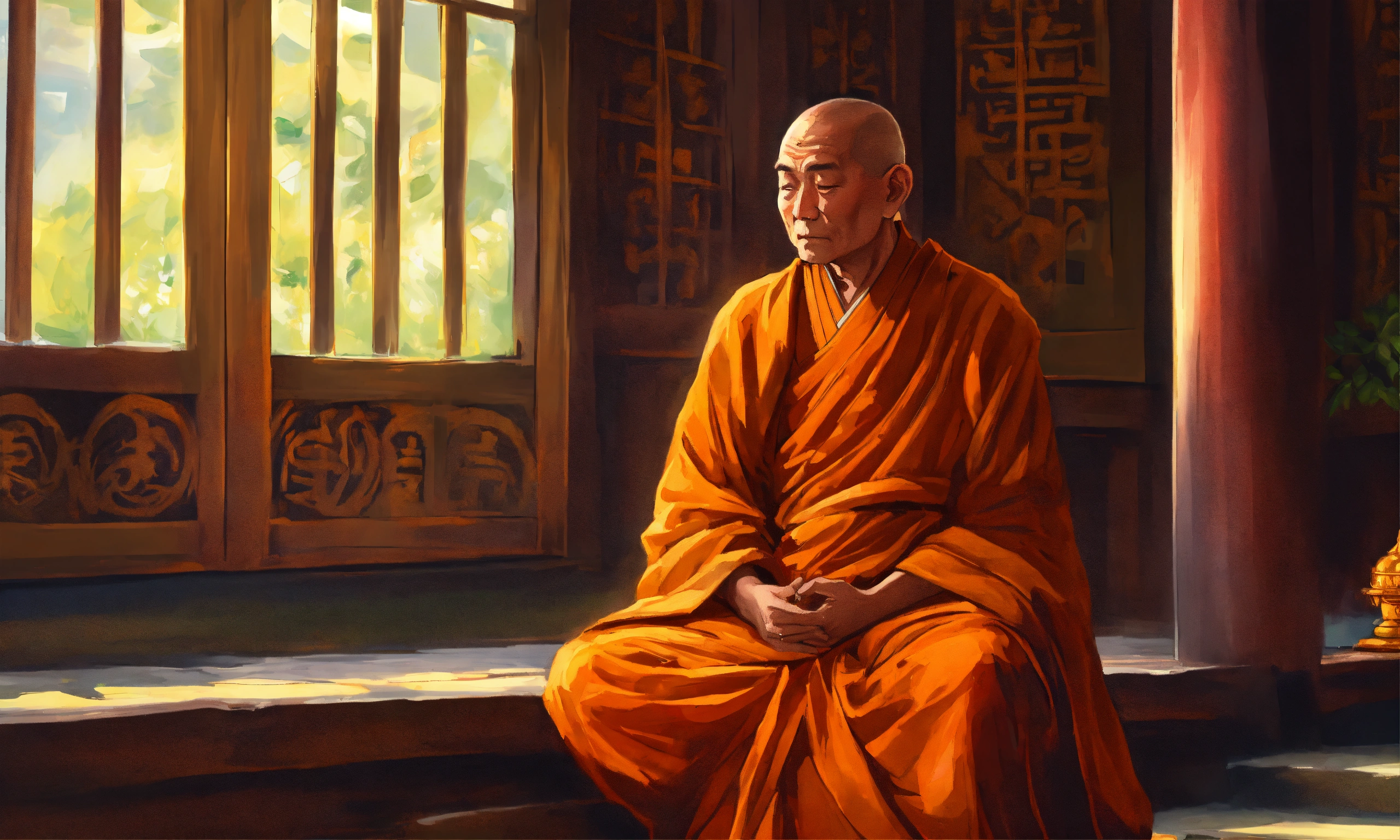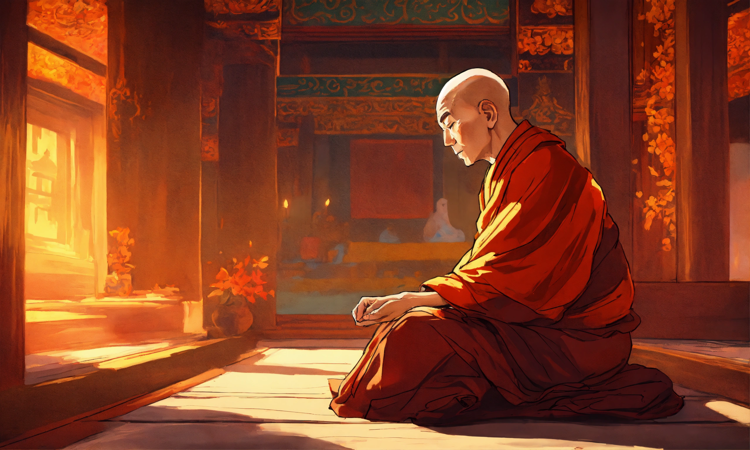 A hand drawn painting of an old buddhist monk engrossed in meditation in monastery, 4k, sharp, vibrant, lively