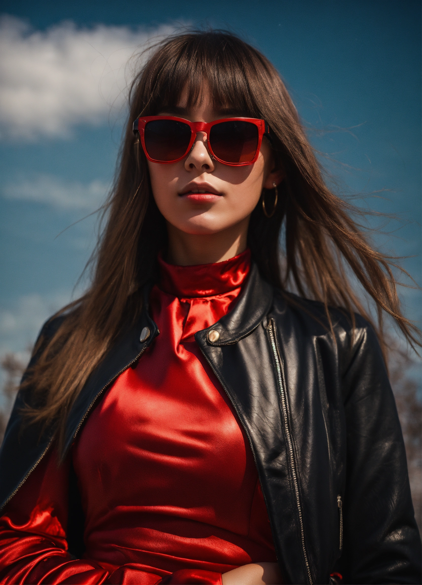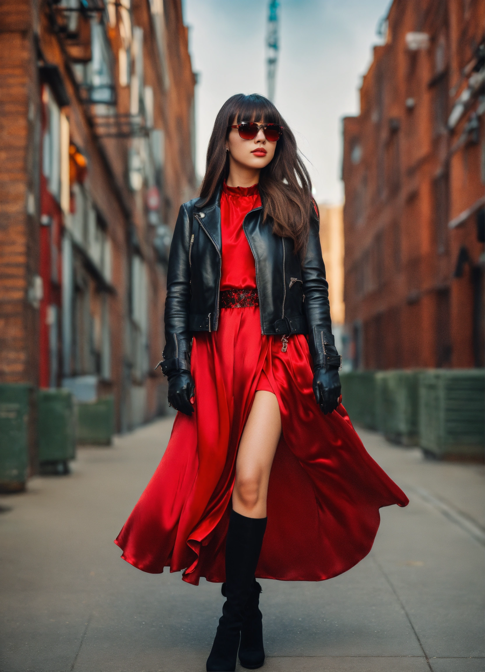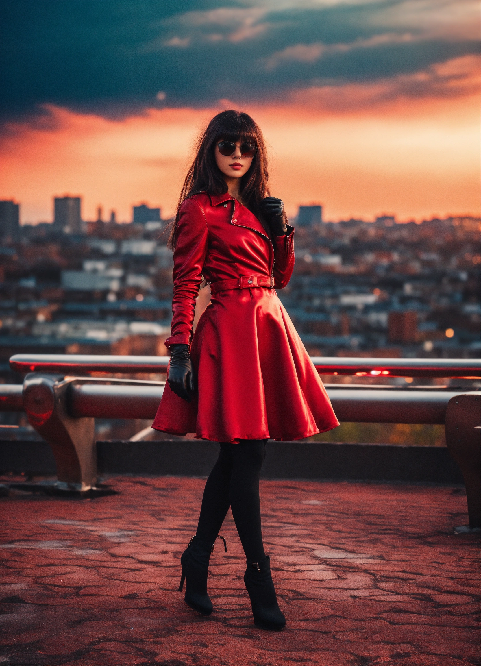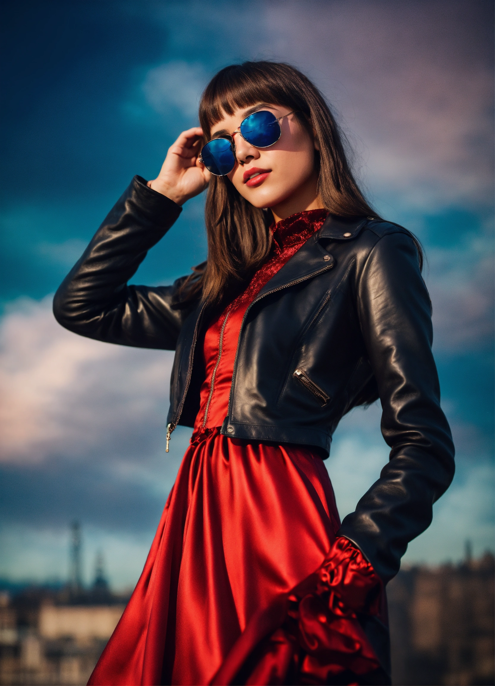 A real photo of a 25 year old girl with a "bangs hairstyle" long hair, wearing a red satin dress and black leather jacket and gloves. urban background in the sky we see the galaxy. full body sunglasses