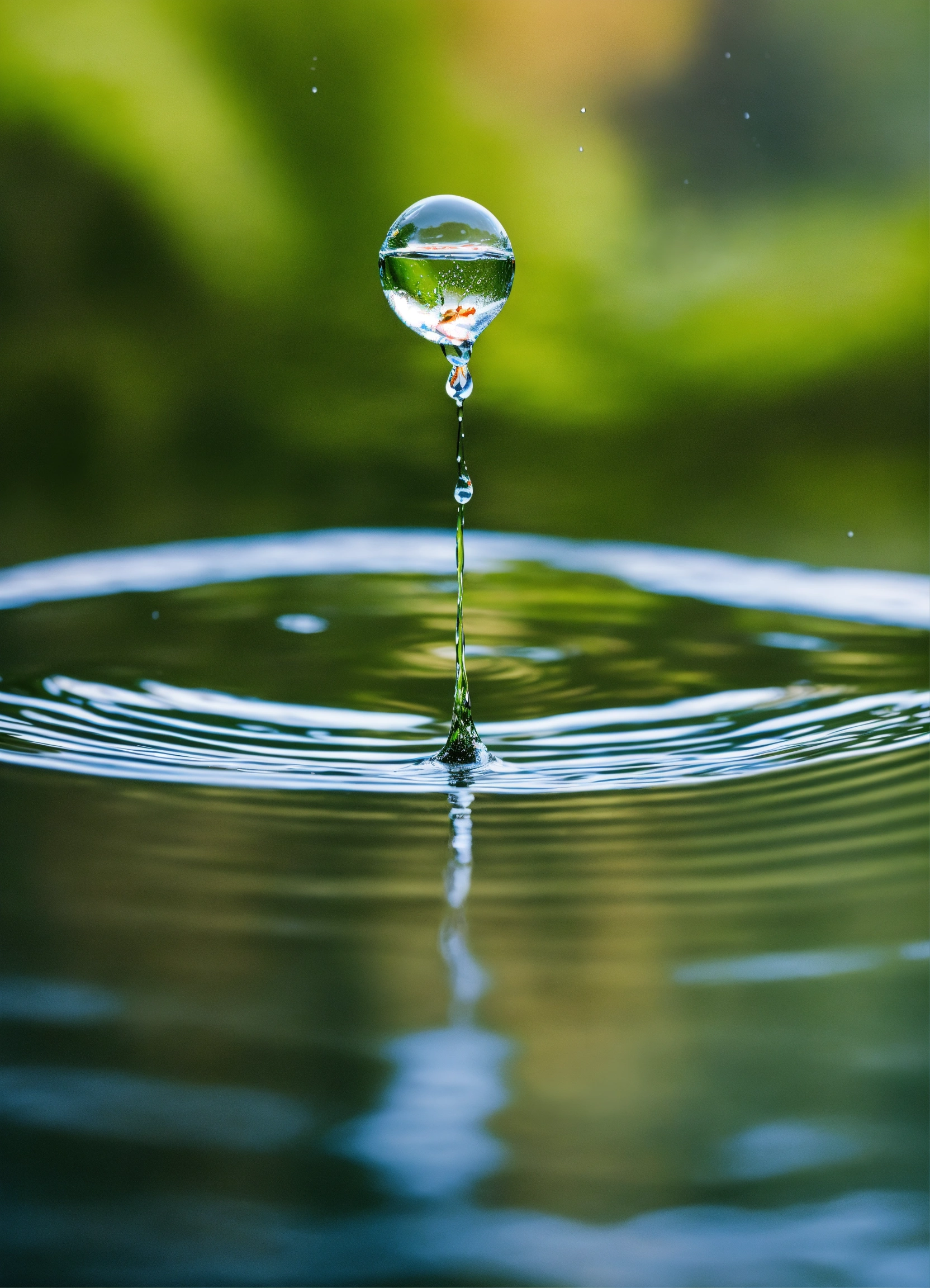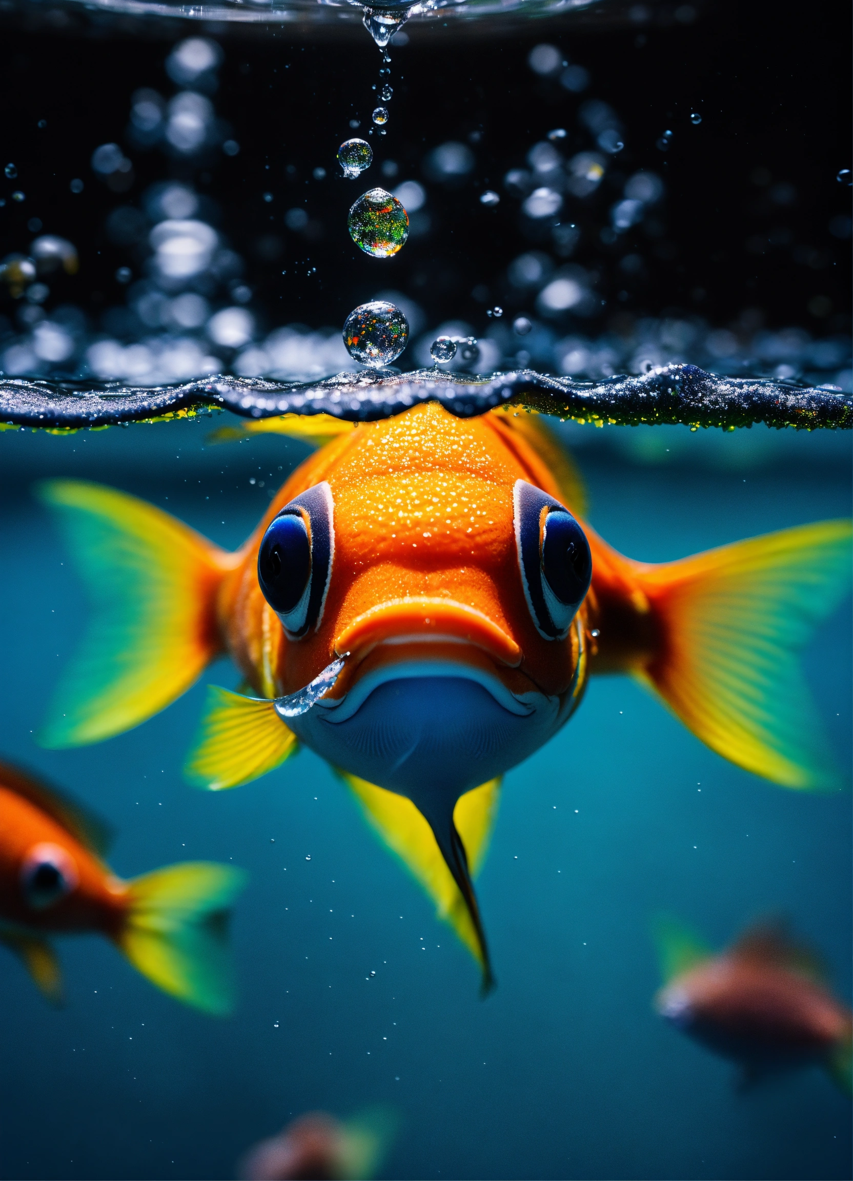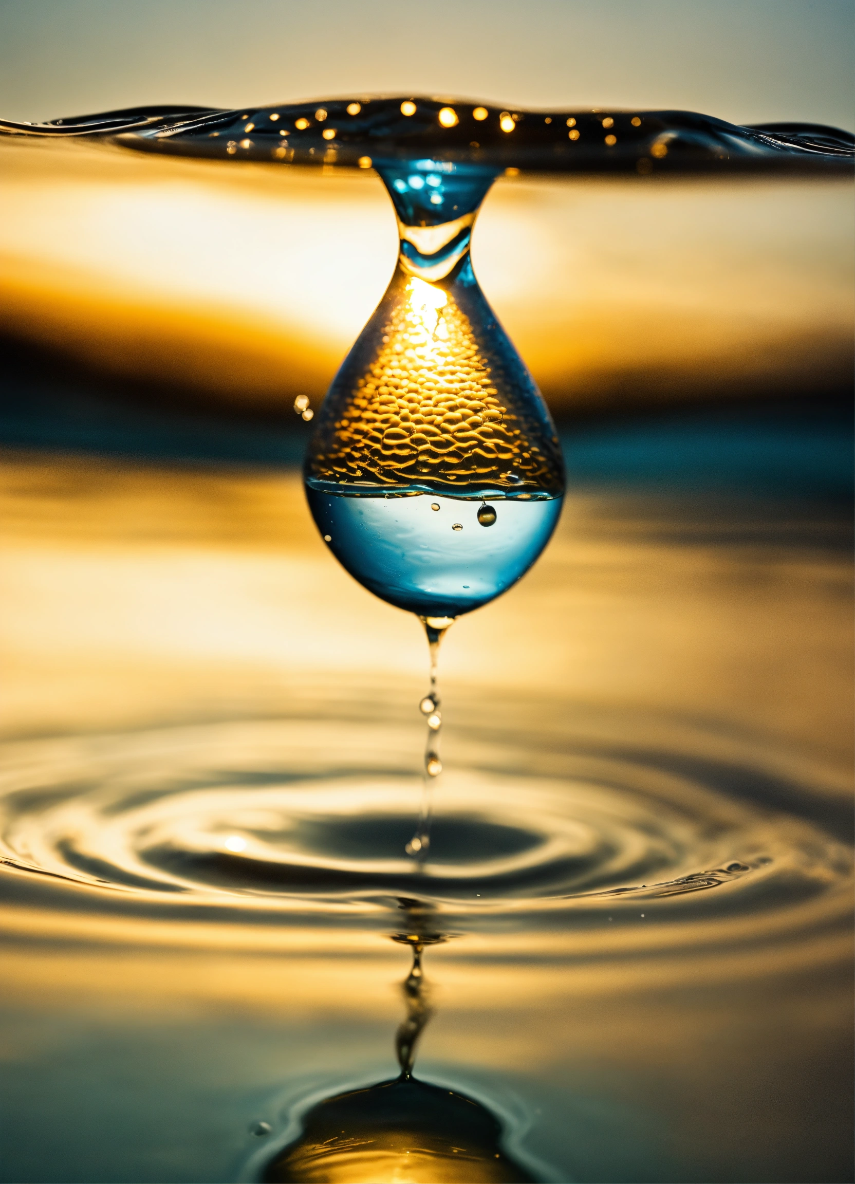 The water drop falls below the water surface, it morphs into a liquid textured small fish diving nose down into the water. this transformation is accompanied by a soft ripple and a small splash of water above the surface.