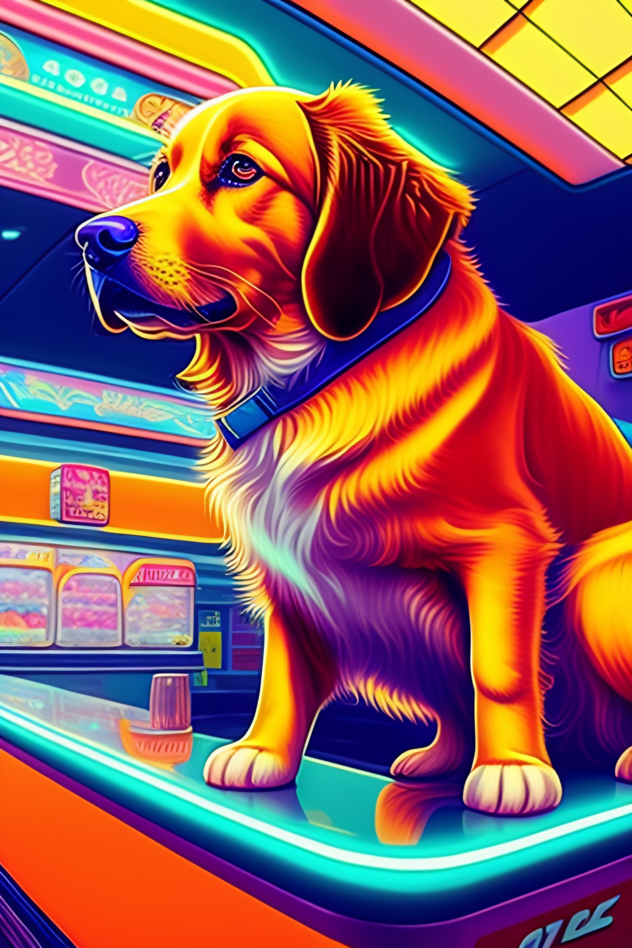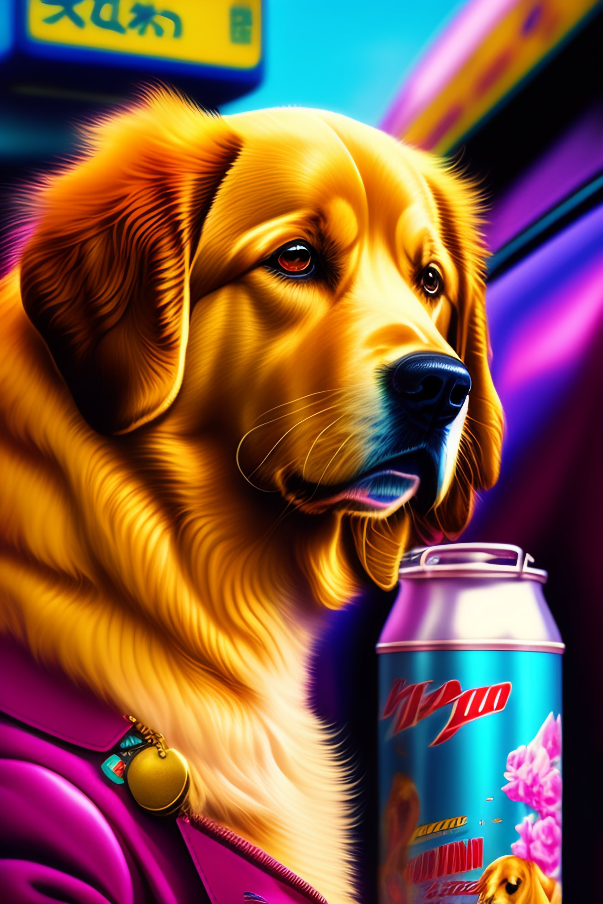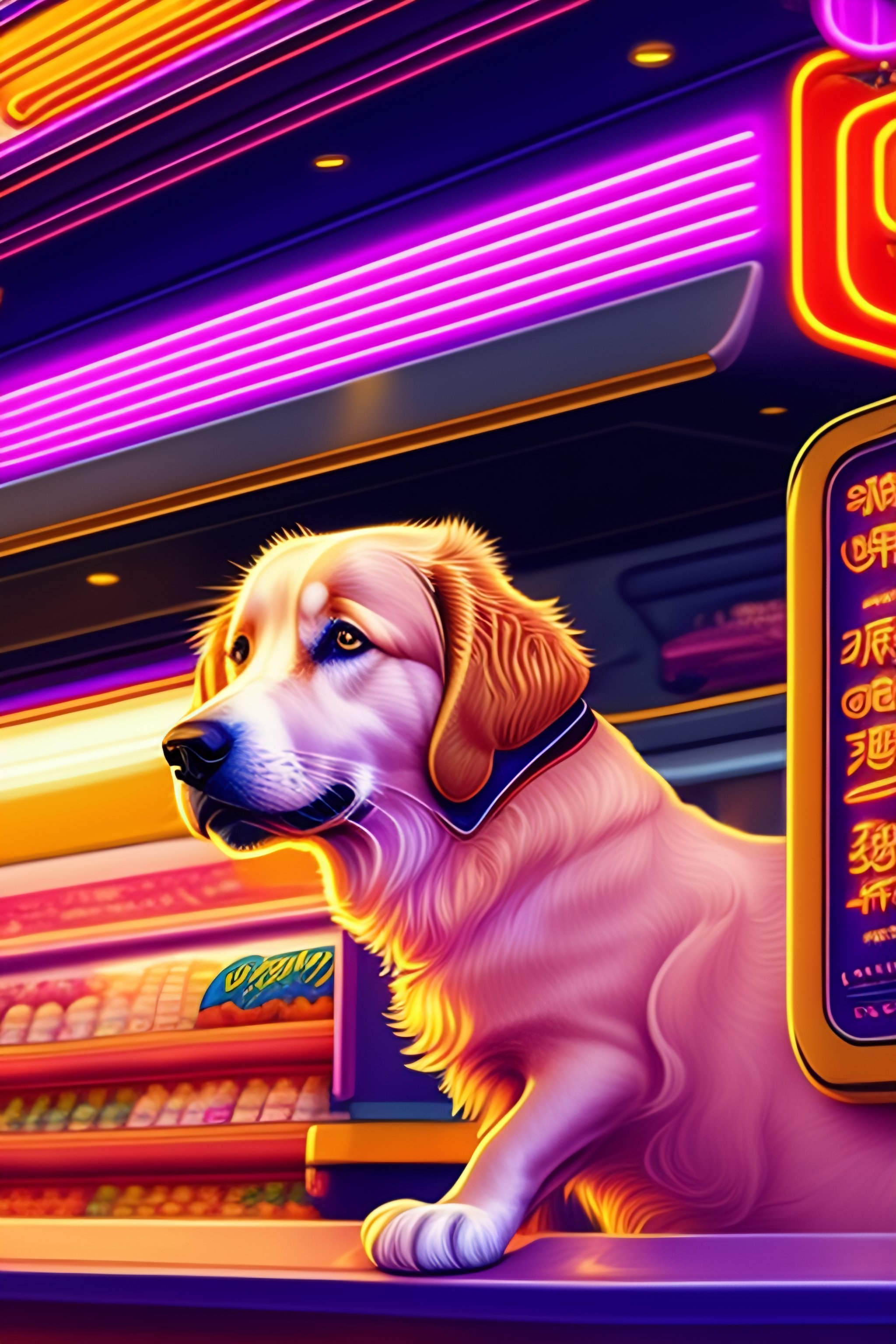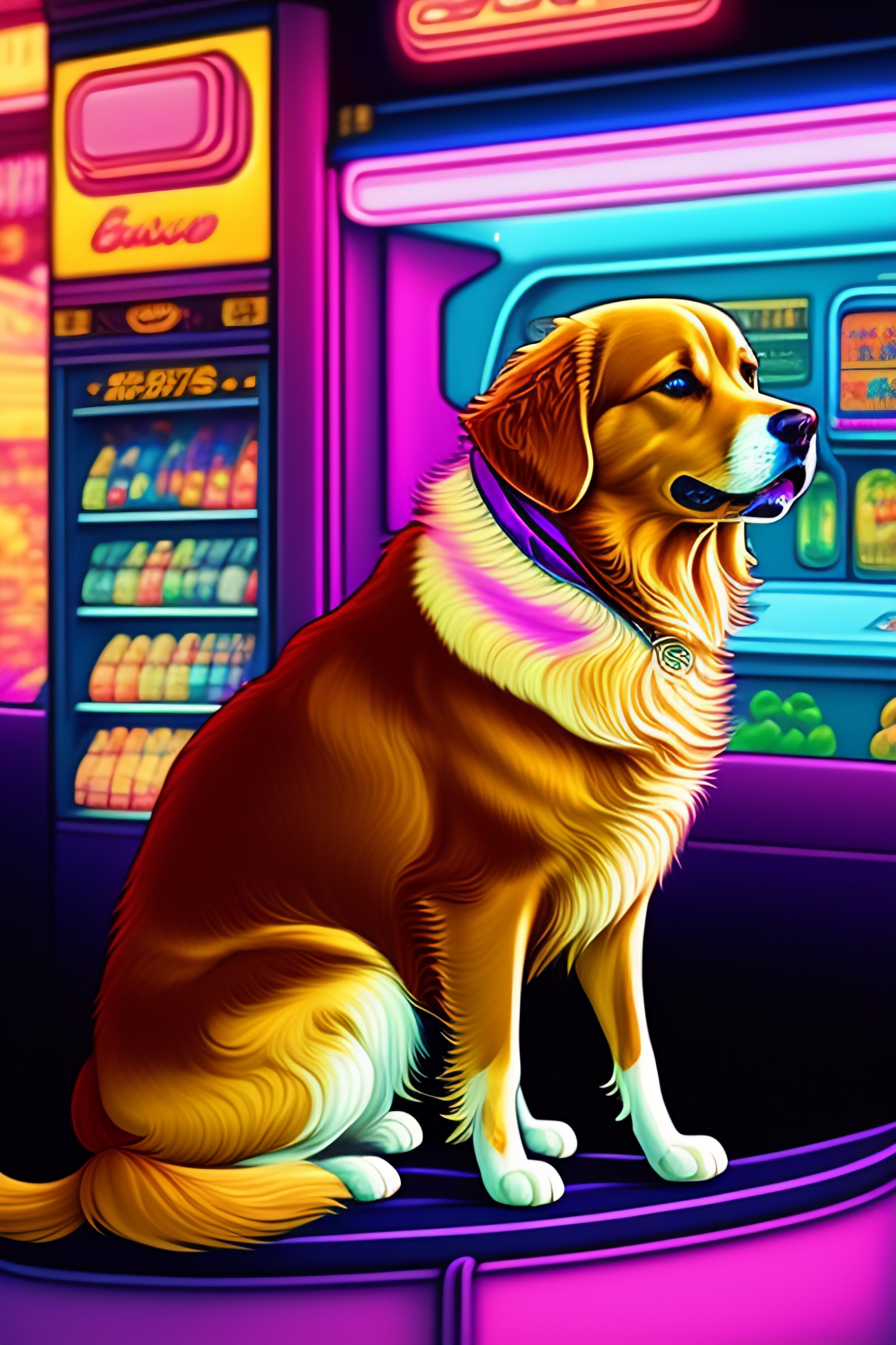 Golden retriever in the style of 90's vintage anime, surrealism, akira style. detailed line art. fine details. inside a 7/11 convenience store. drink aisle. neon.