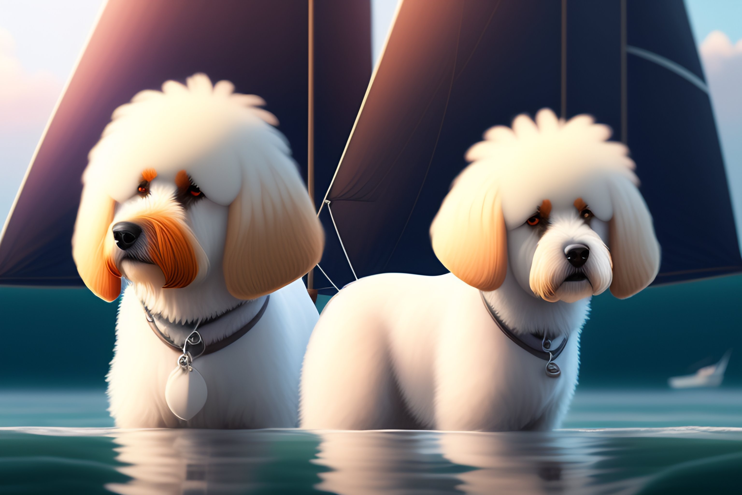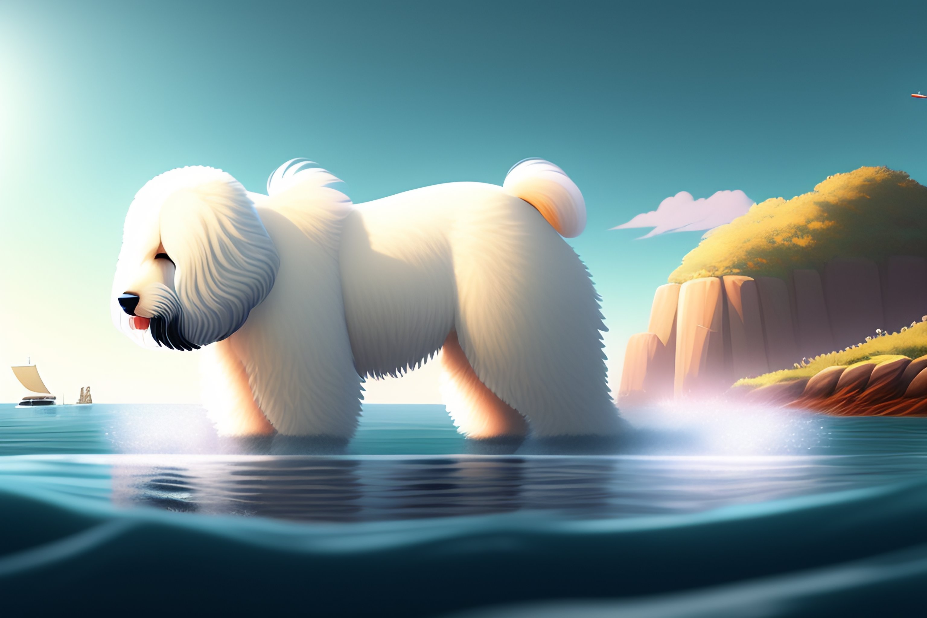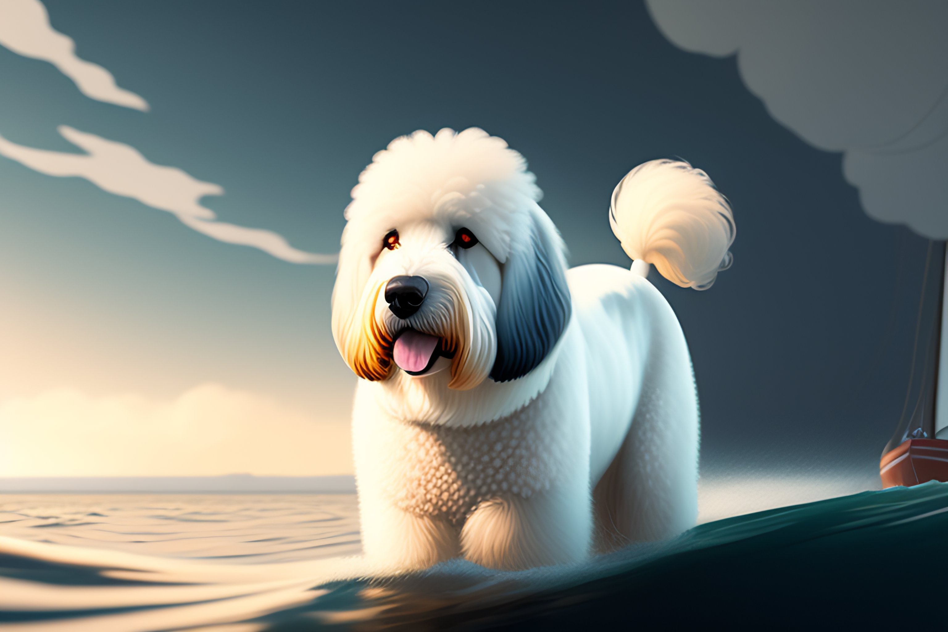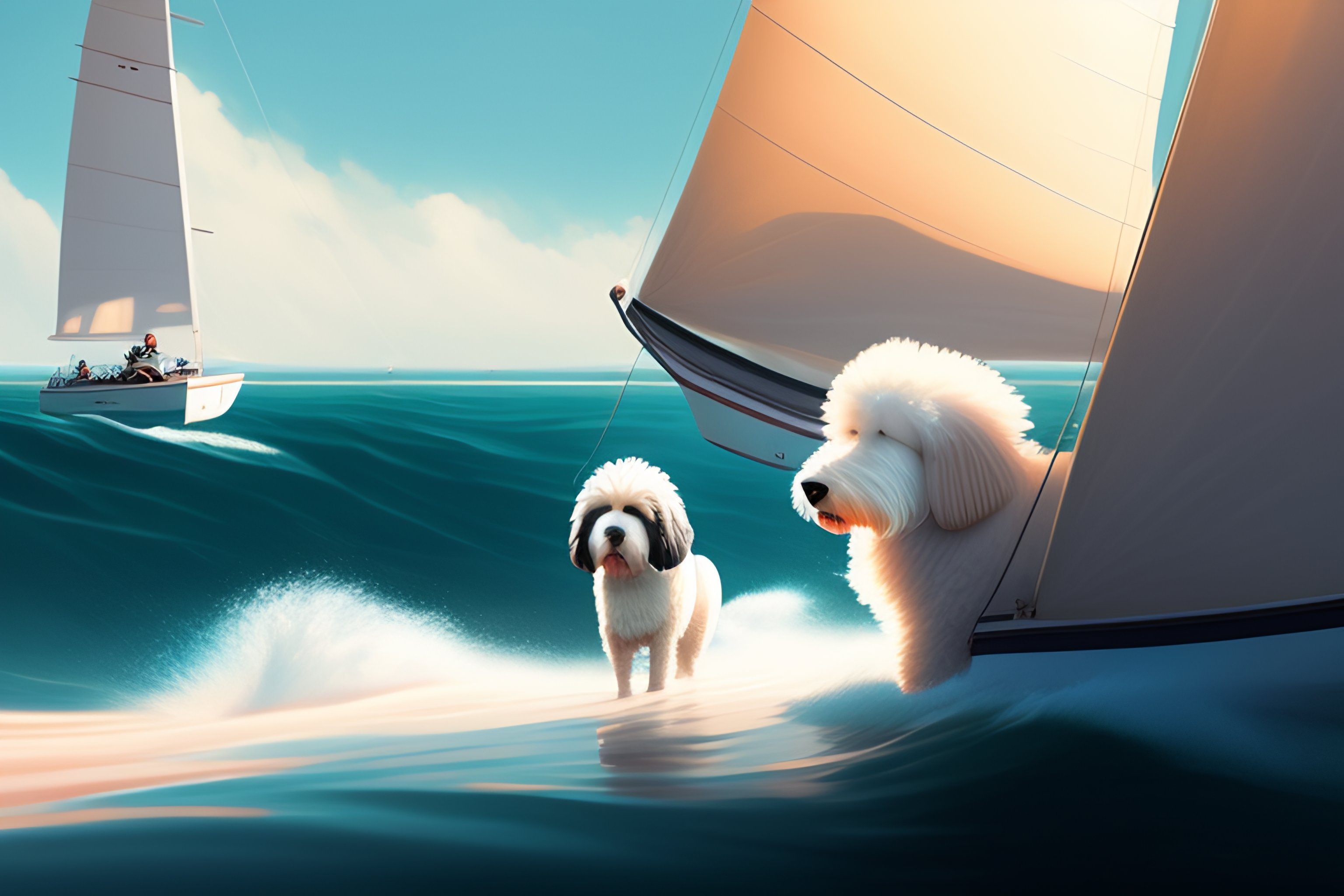 A cream - colored old english sheepdog dog, sailing on an america's cup boat, hydrofoil, atey ghailan, goro fujita, studio ghibli, rim light, exquisite lighting, clear focus, very coherent