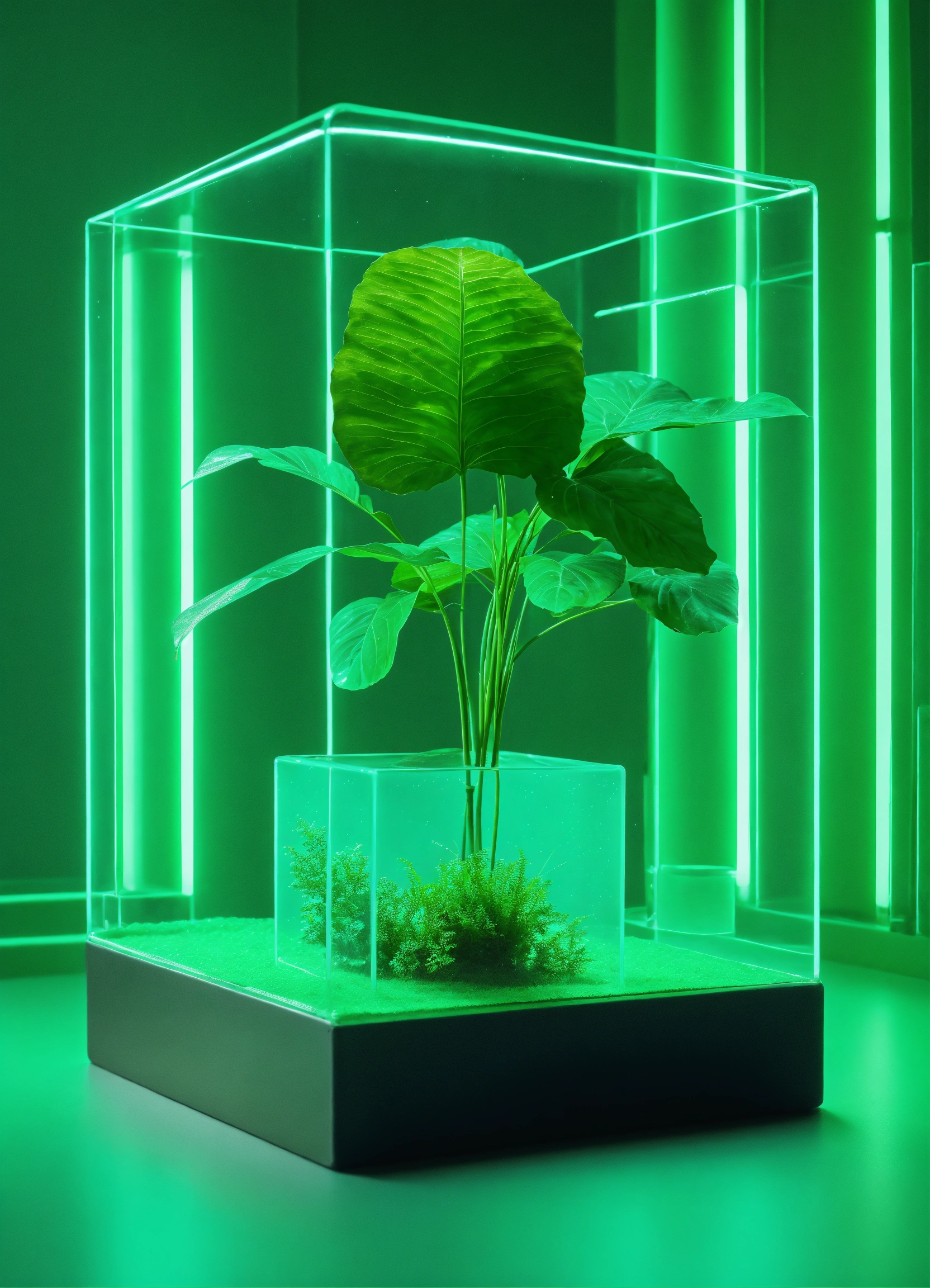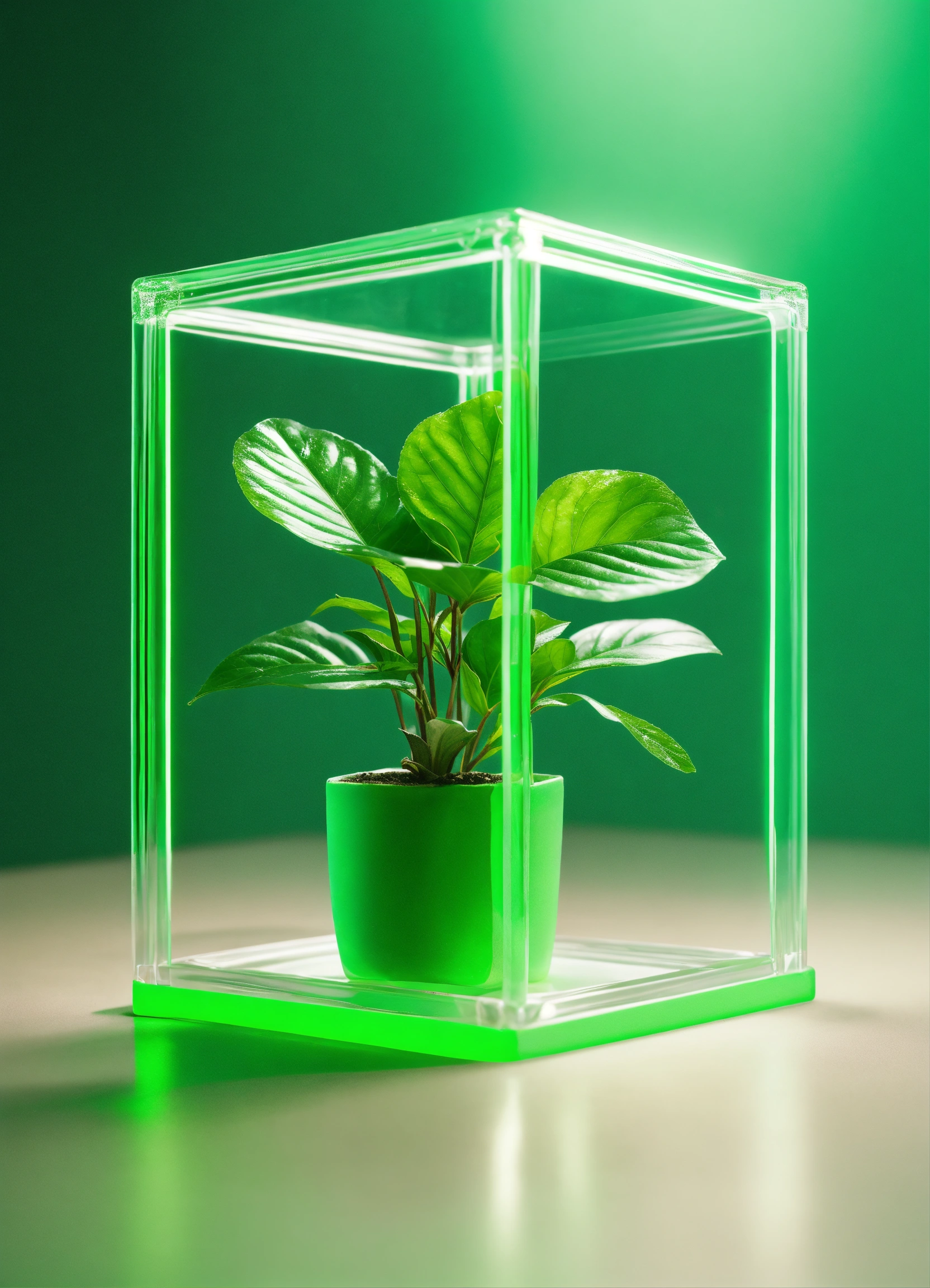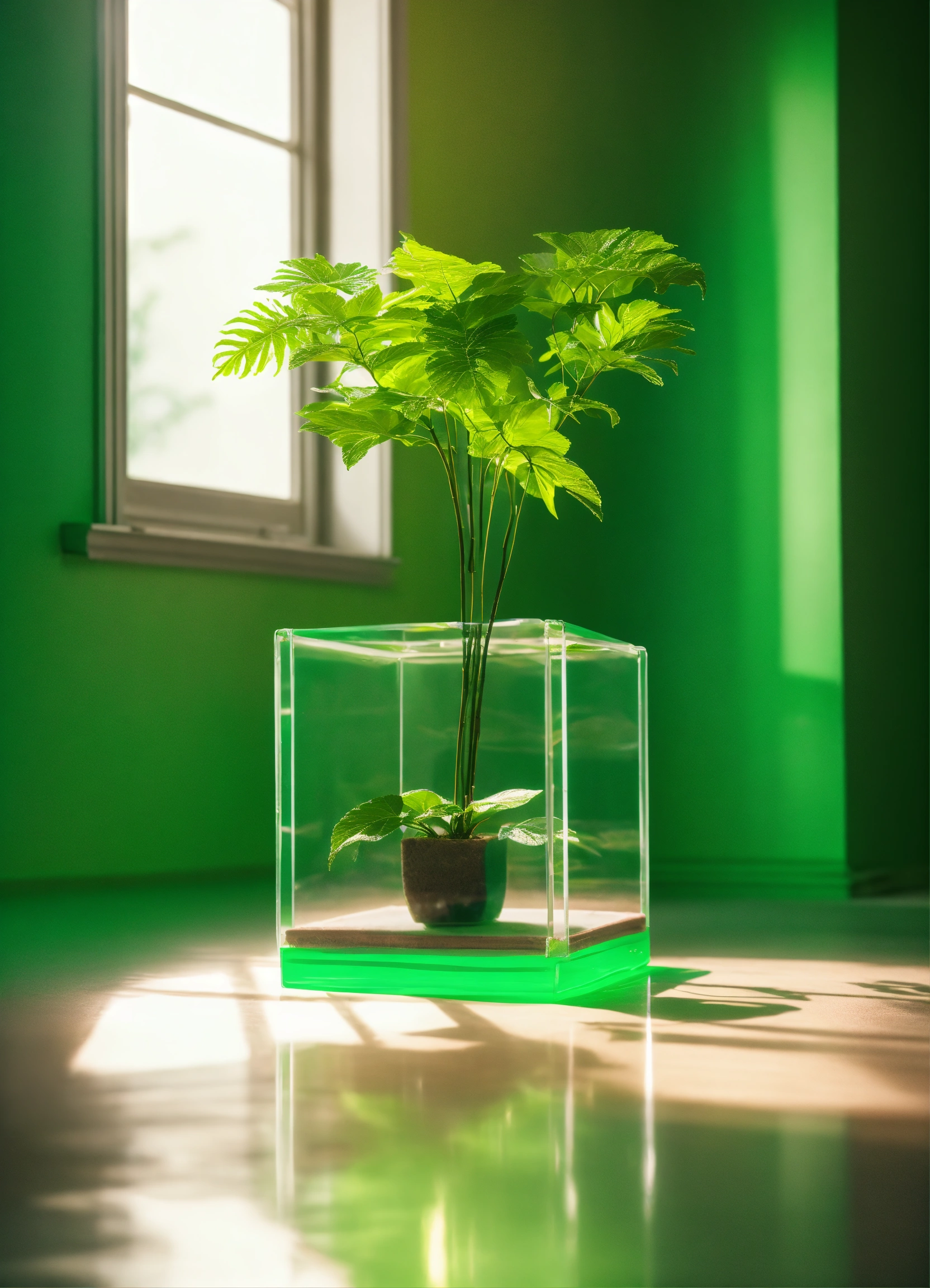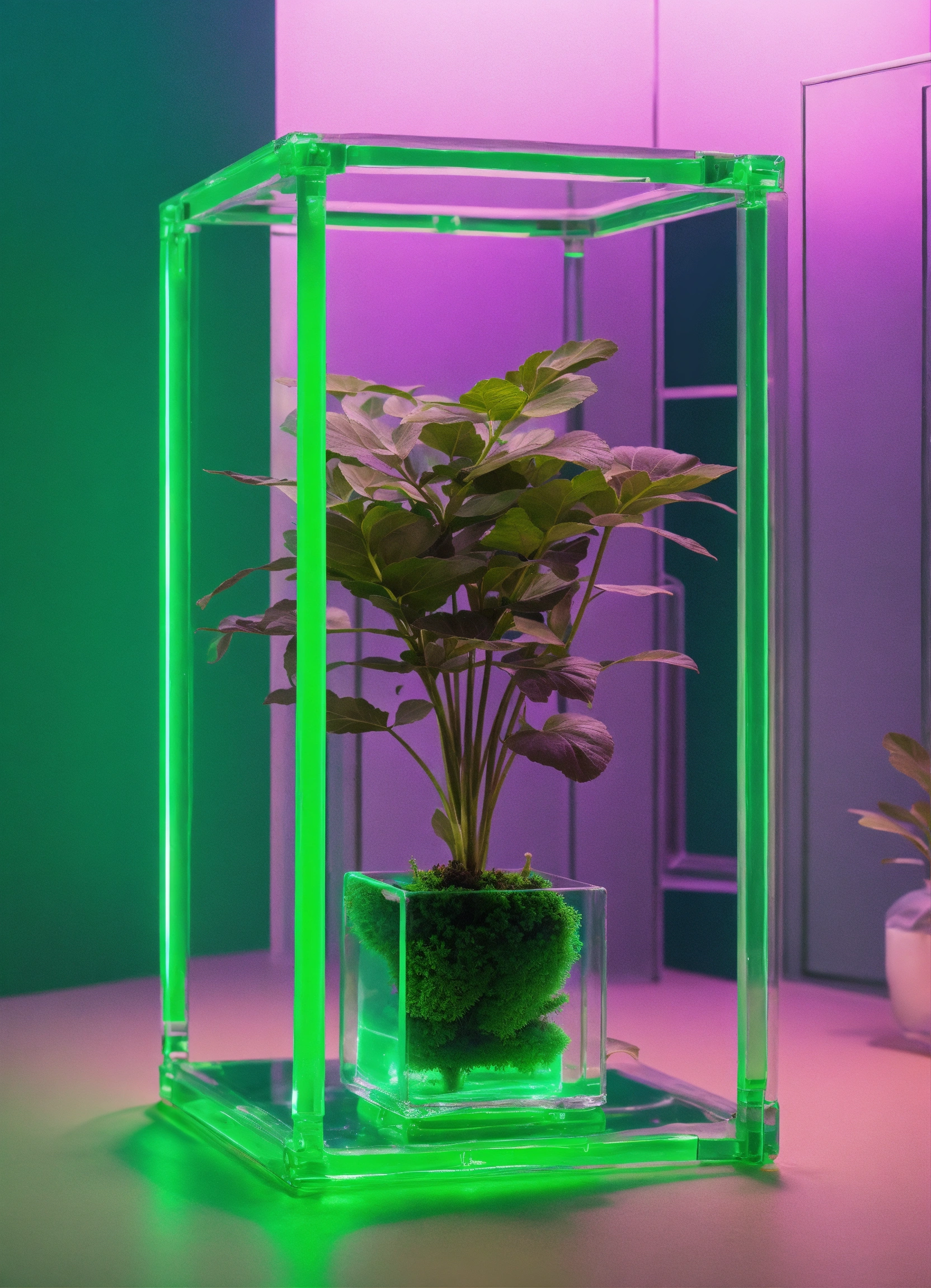 Floating clear plastic cube full of one plant. sophisticated green roman columns in background, studio photography, some neon green accent color, 4k, iridescent, muted color background! realistic!