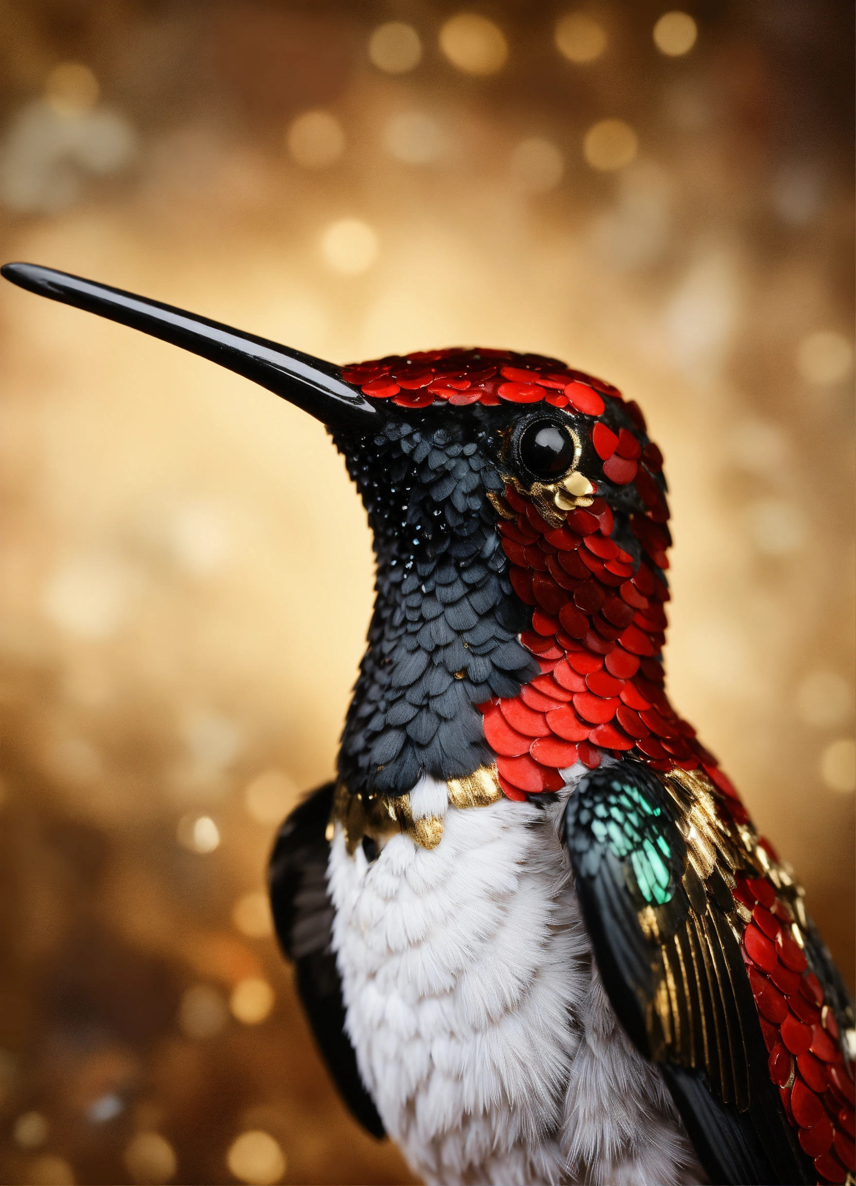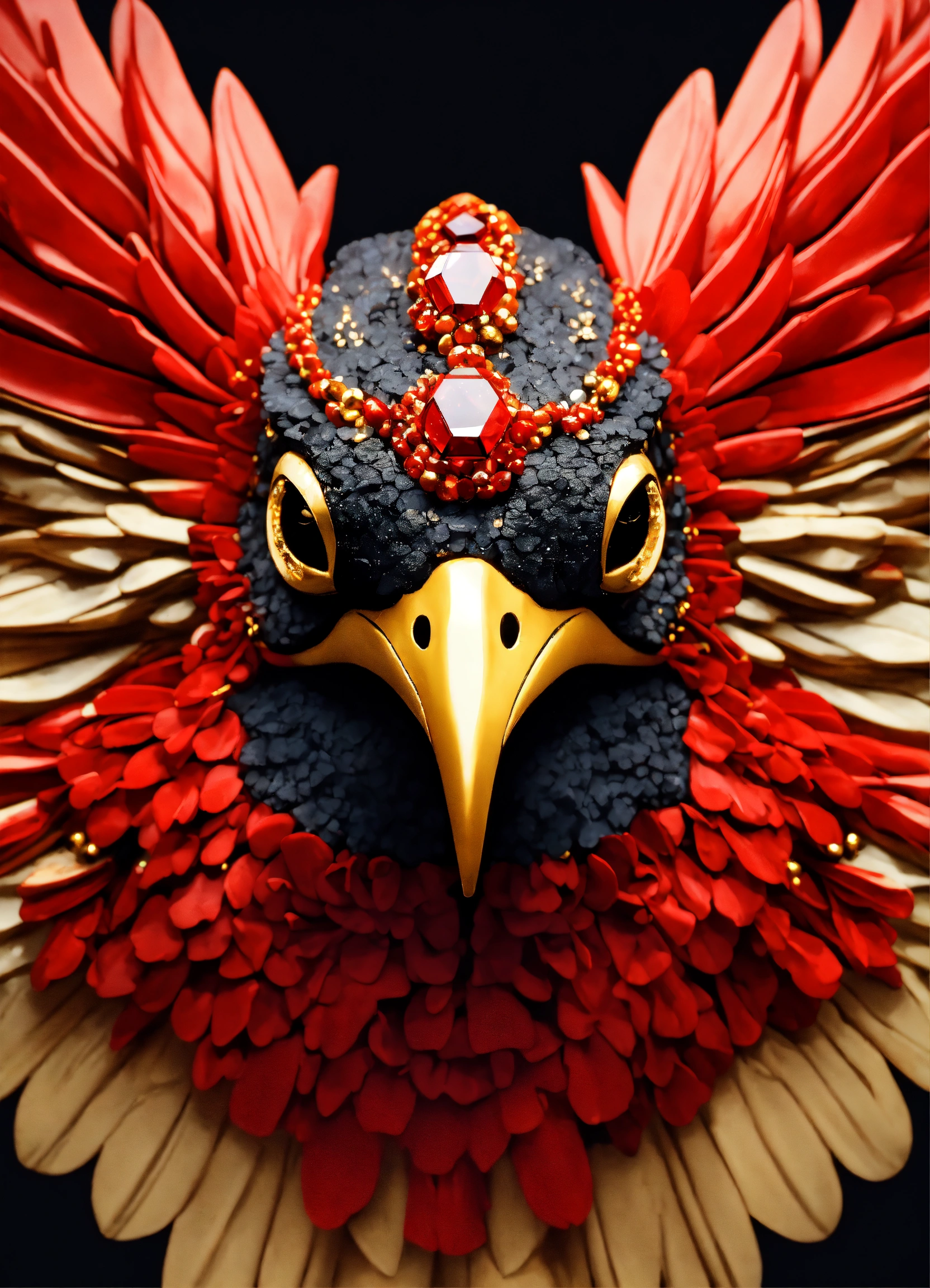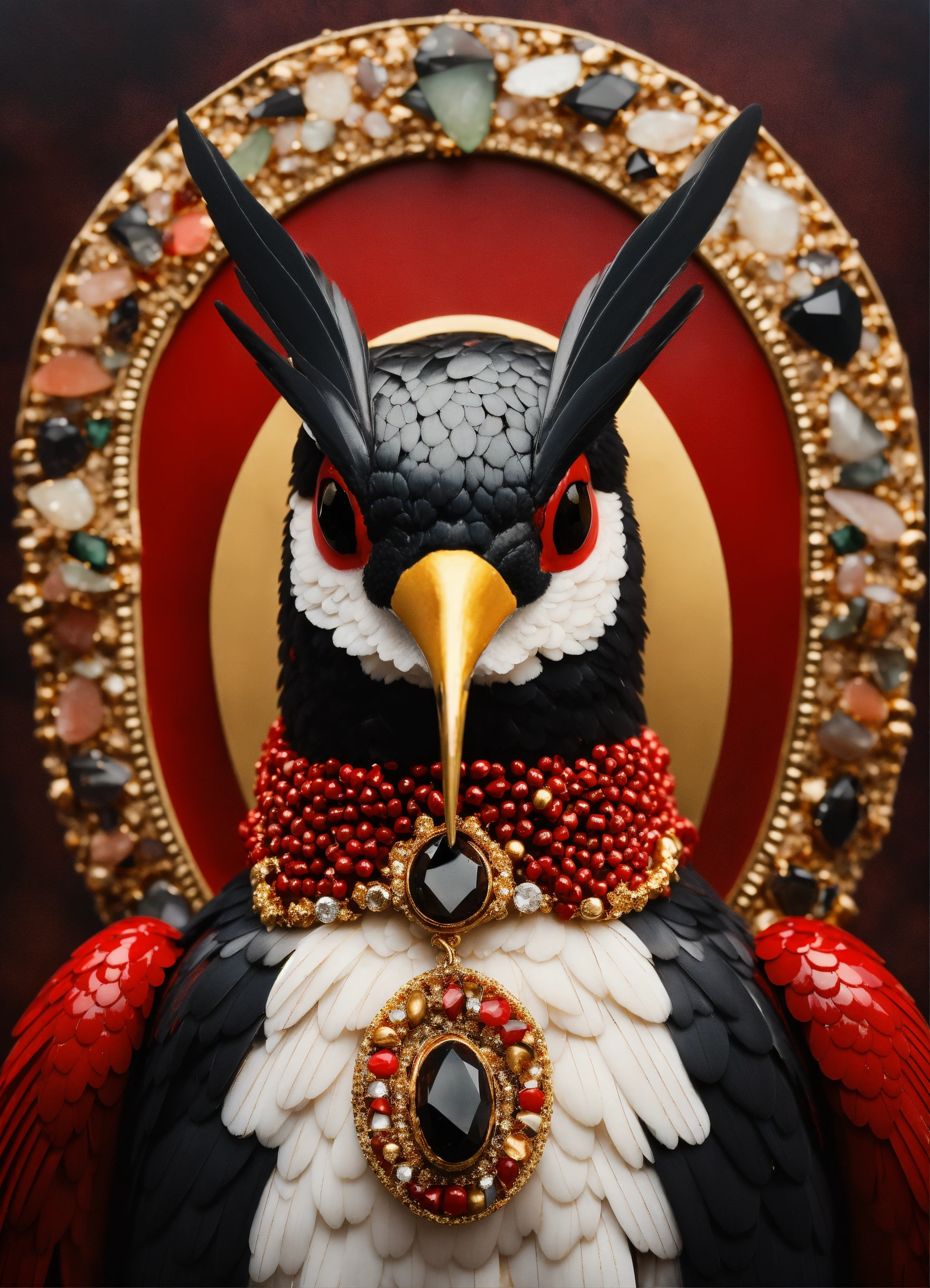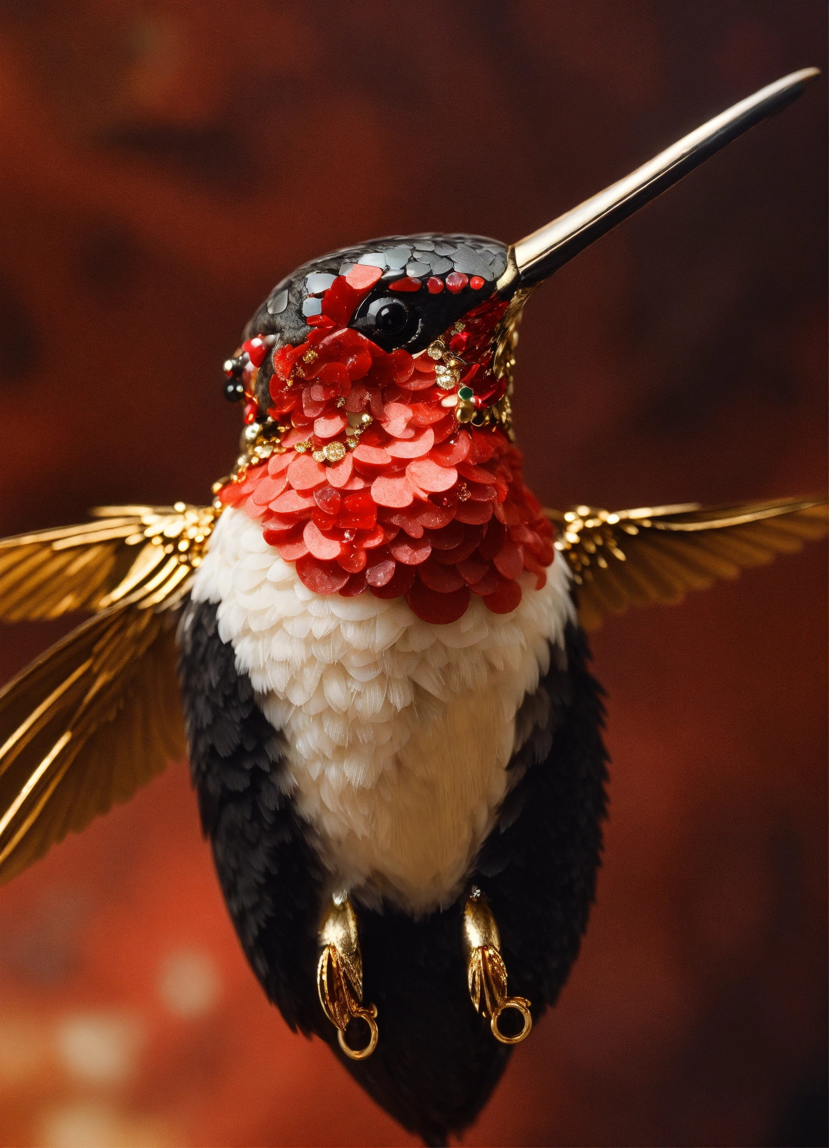 Realistic anthropomorphic red white and black hummingbird face frontal made of red coral, mahogany, black obsidian, bloodstone, tourmaline and gold, elegant, diamonds, gold, elegant, masterpiece, concept art, tectonic, gold shiny background, nikon photography, shot photography by wes anderson, kodak color, hd, 300mm
