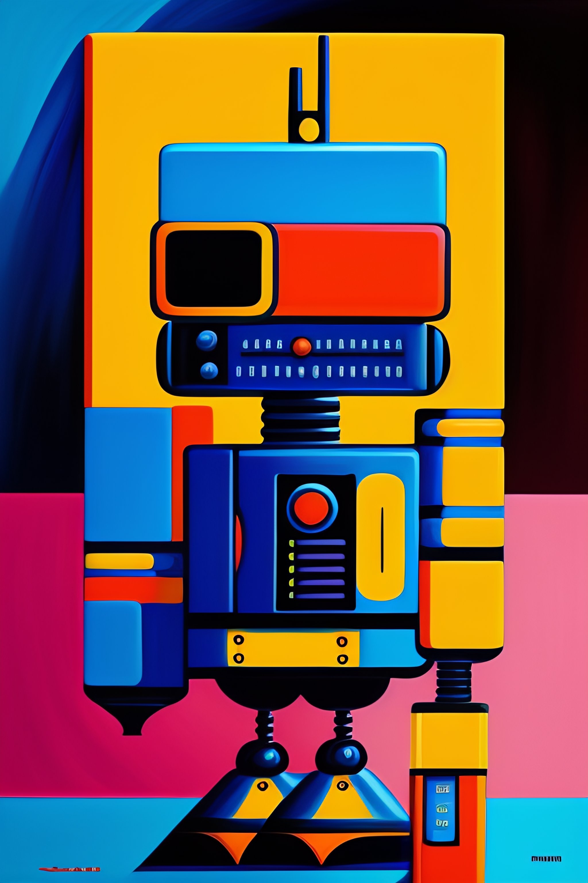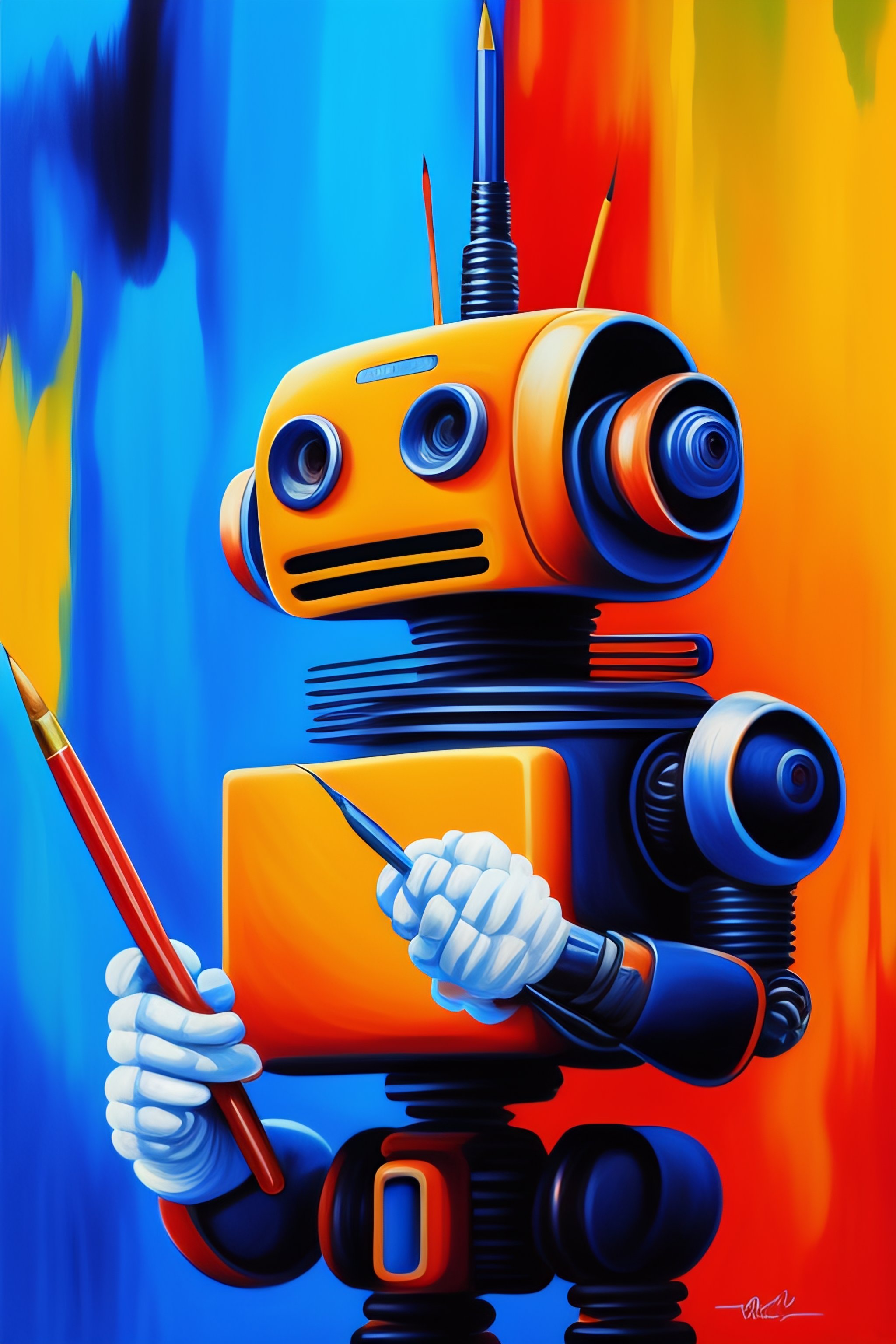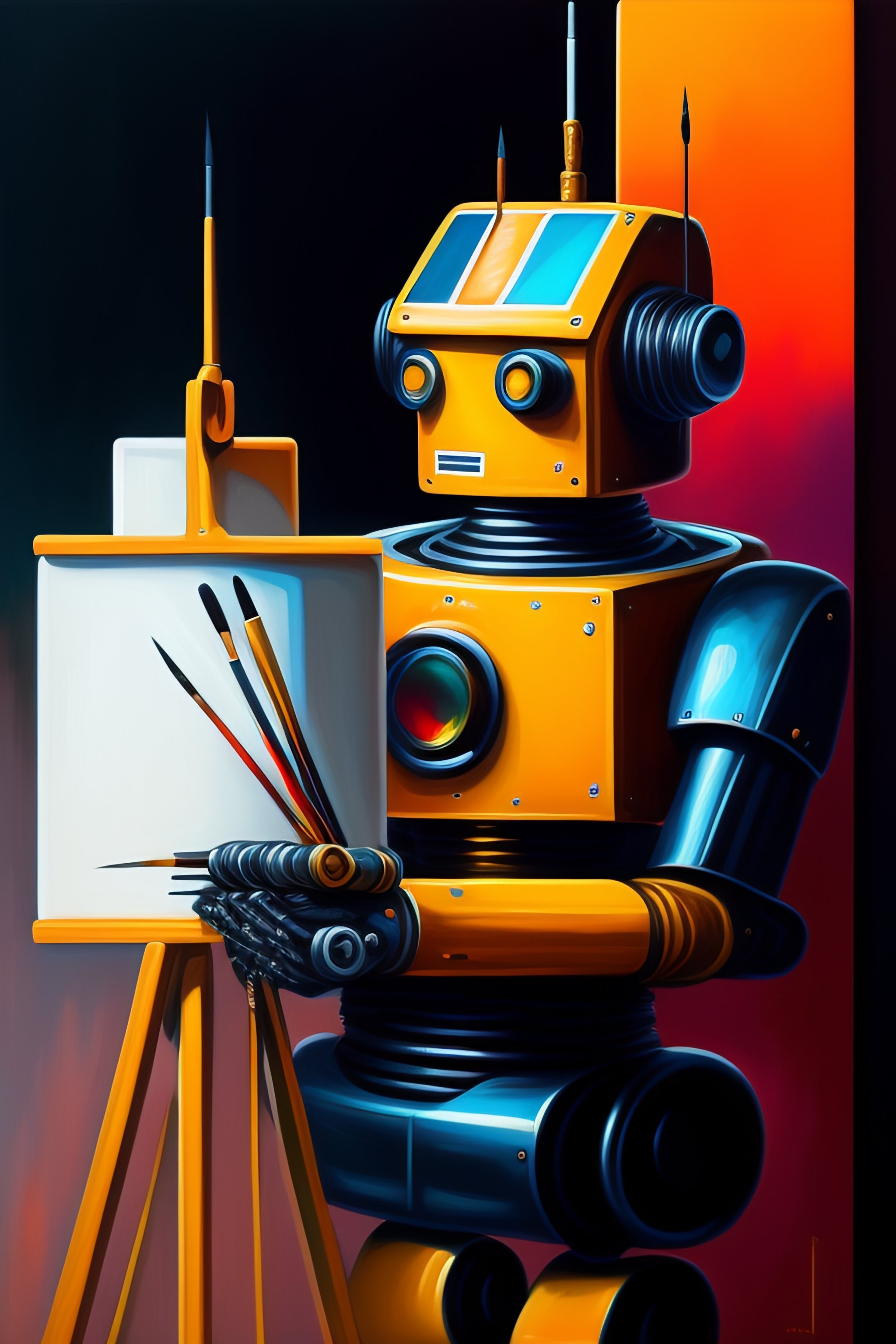 Painting of a robot holding a paintbrush and painting on a canvas, facing his canvas, background art studio