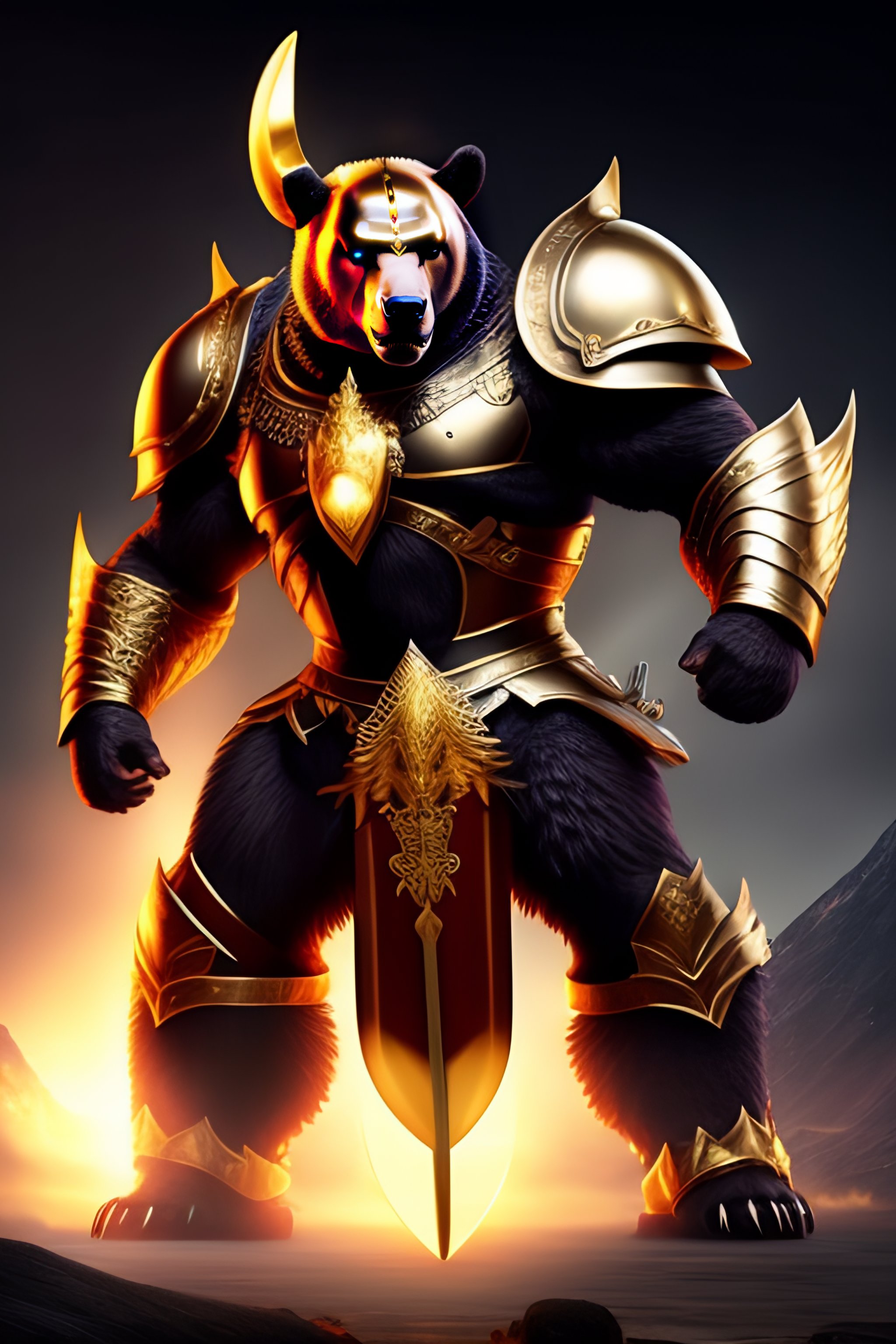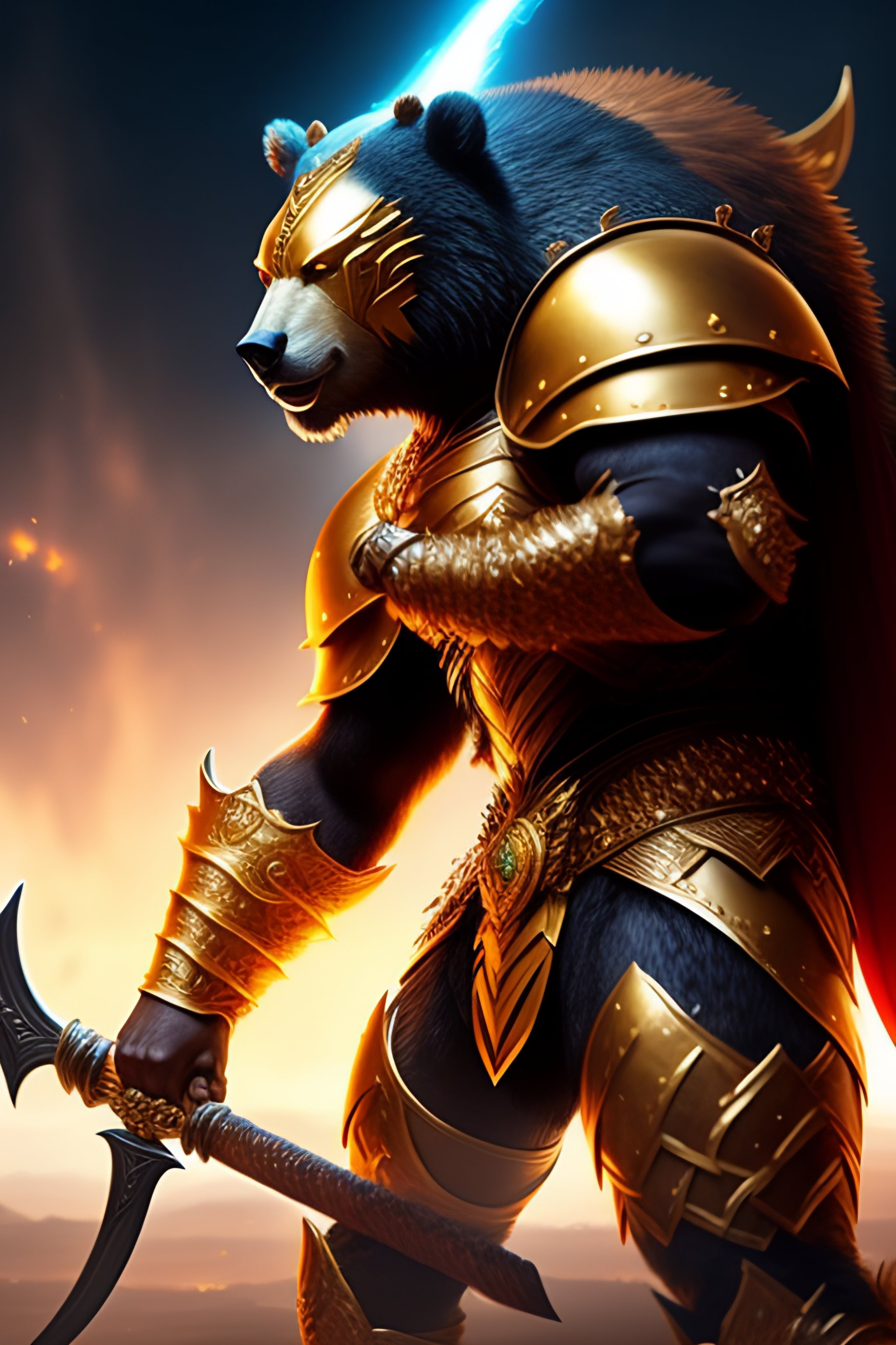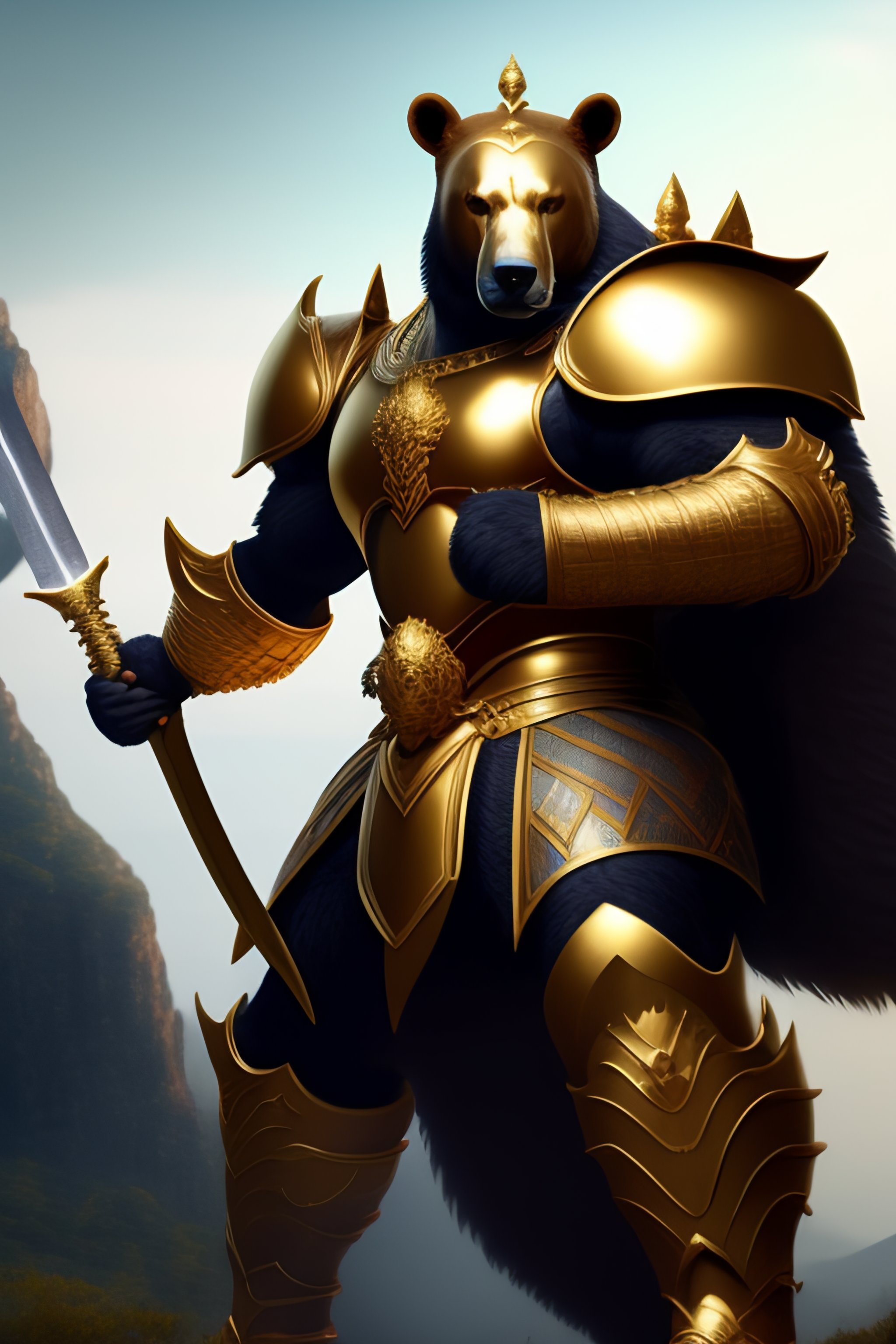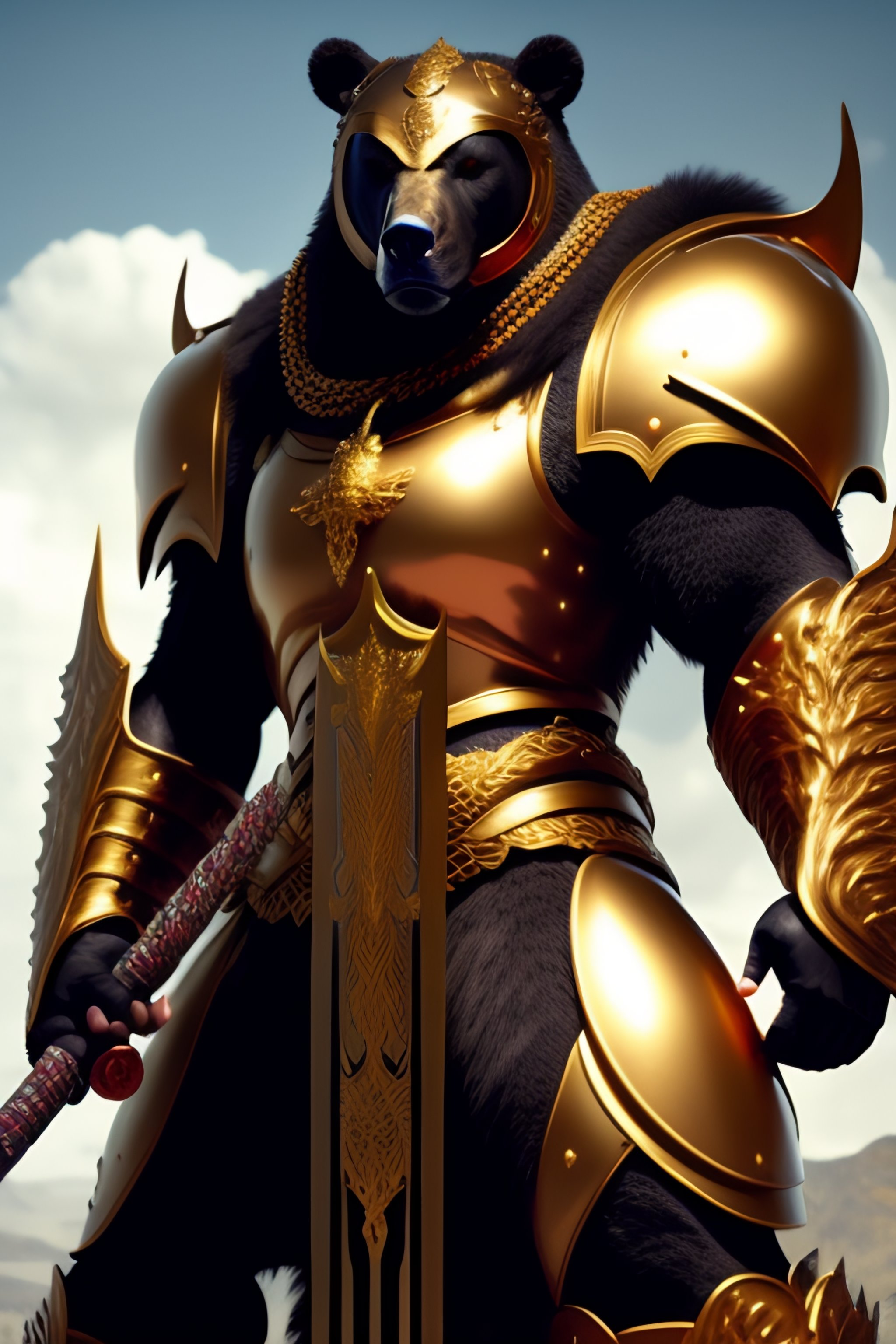 Humanoid warrior bear wearing golden armor weilding a giant sword, fighting giant spider monster, fantasy, realistic.