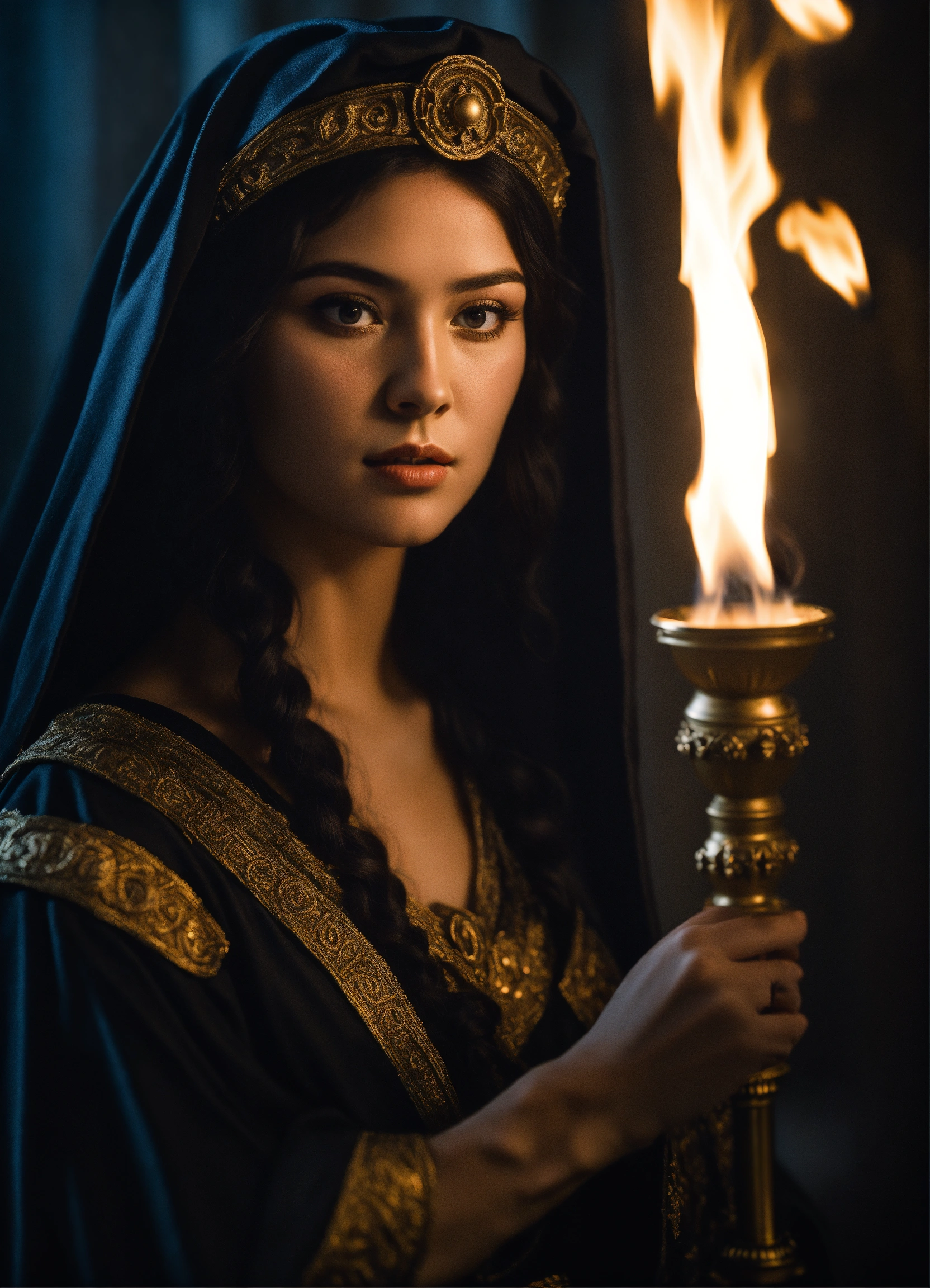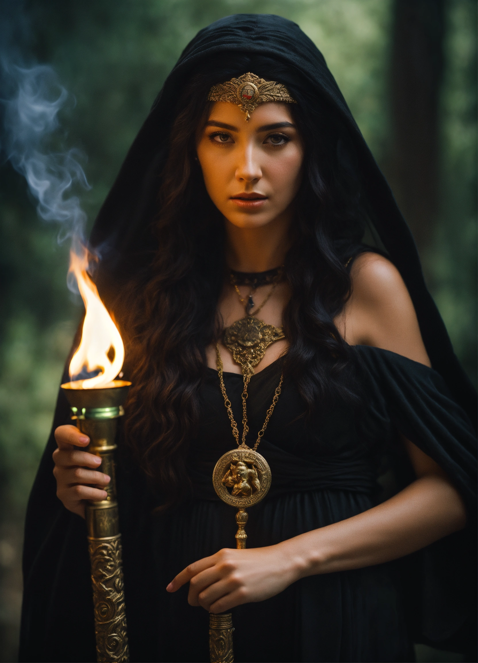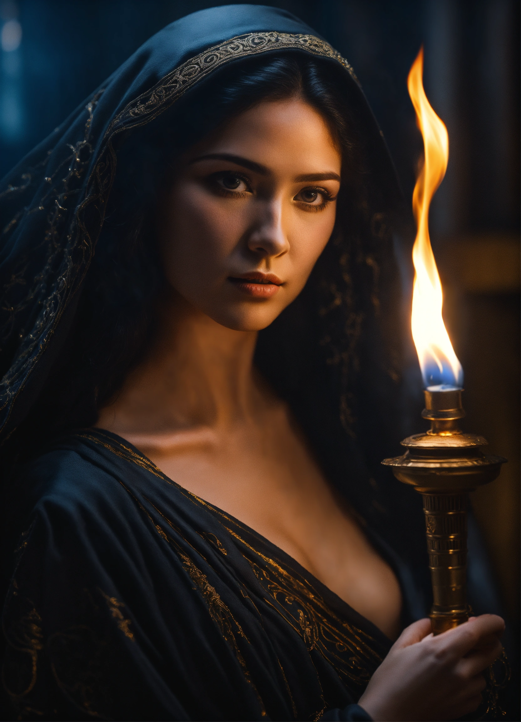 Greek mythology, goddess hecate holding a torch, black hair, flowing black robe, highly detailed, portrait photography, taken with a 50mm lens, hyper-realistic