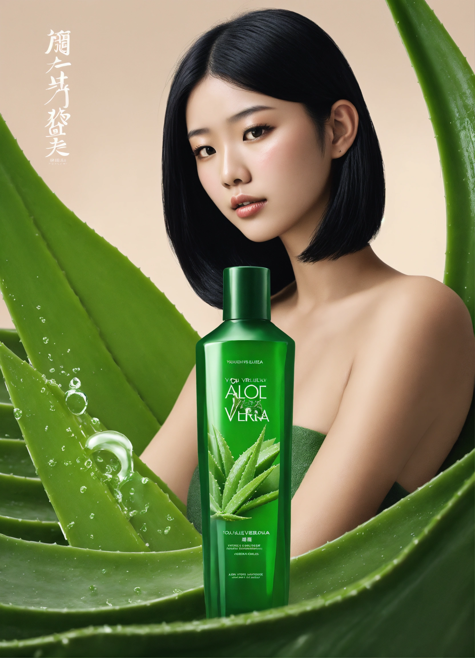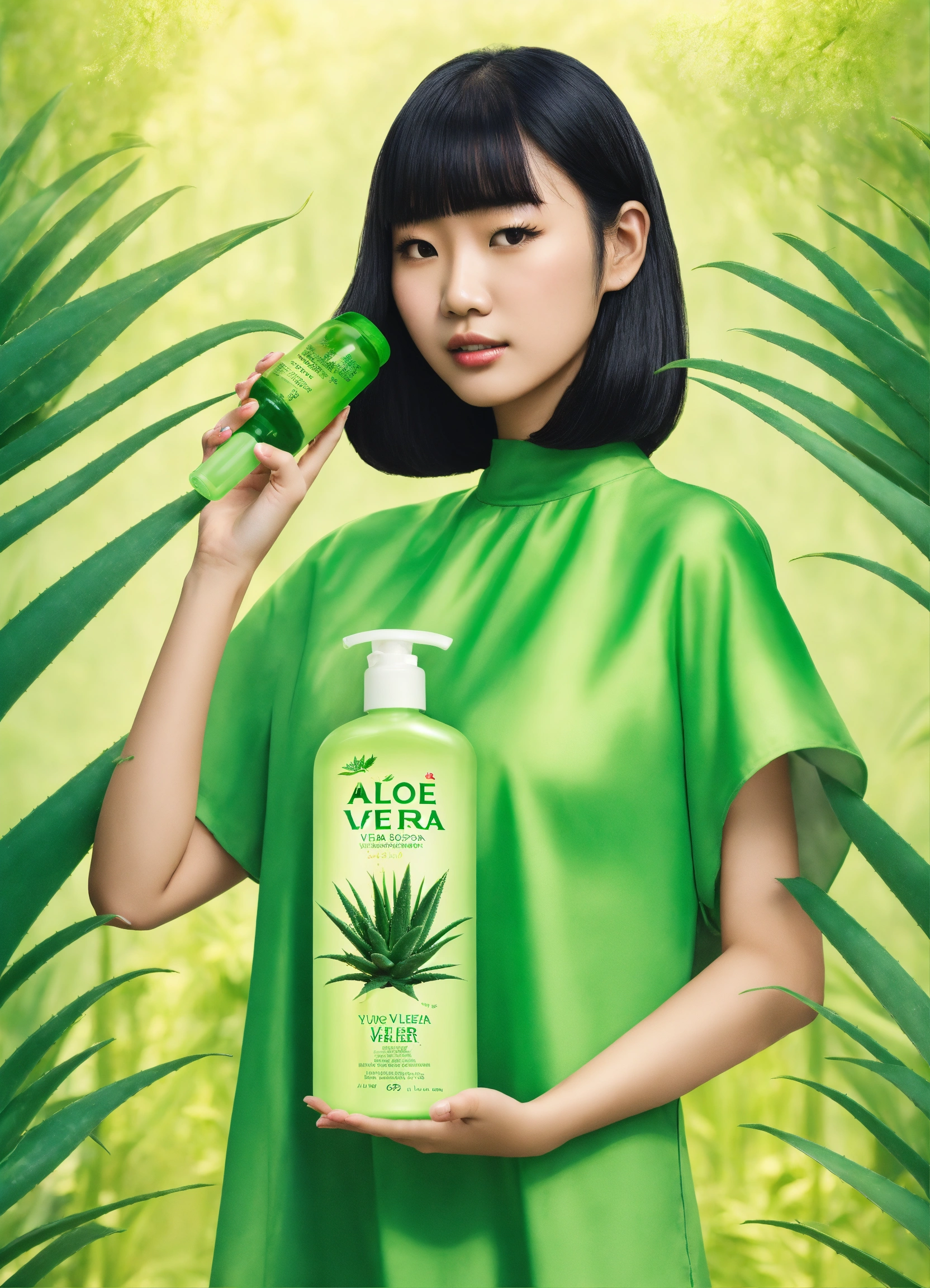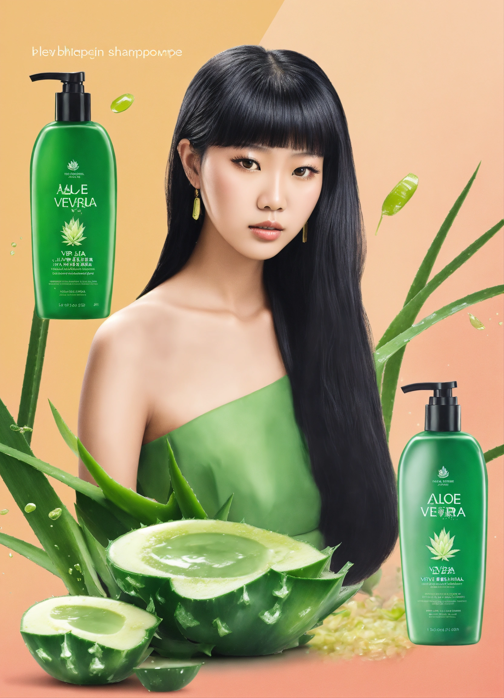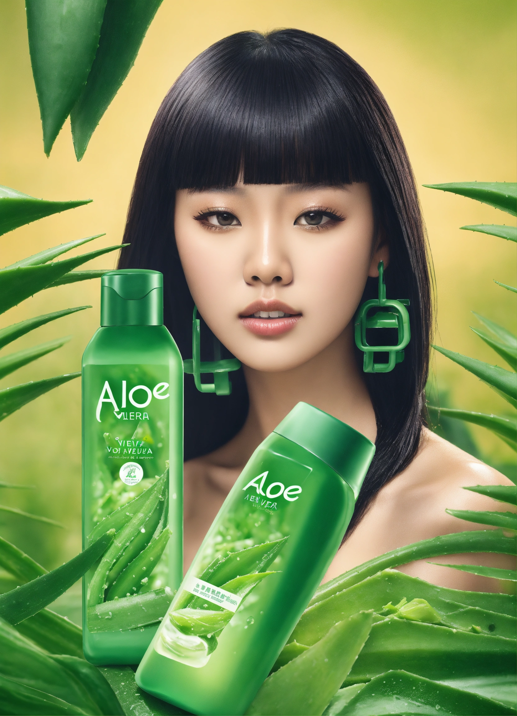Aloe vera shampoo advertisements design, young asian woman with black hair shampoo bottle, festival concept, art collection, colors full tone, cloudy tone, inspiration idea, green tone