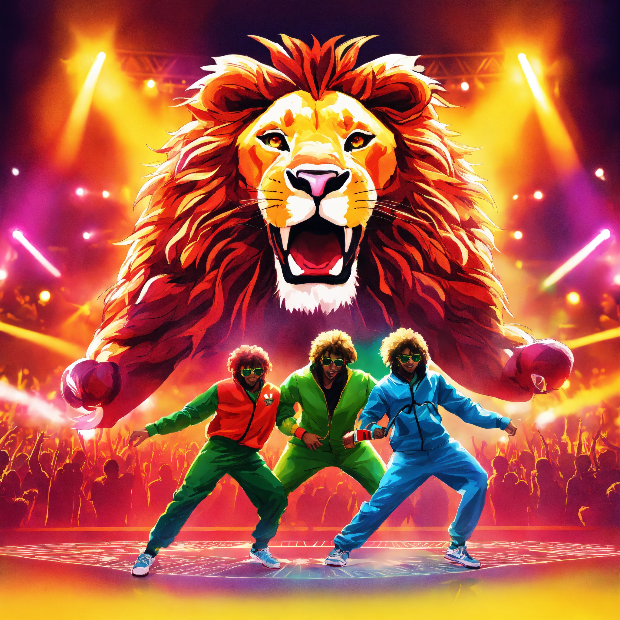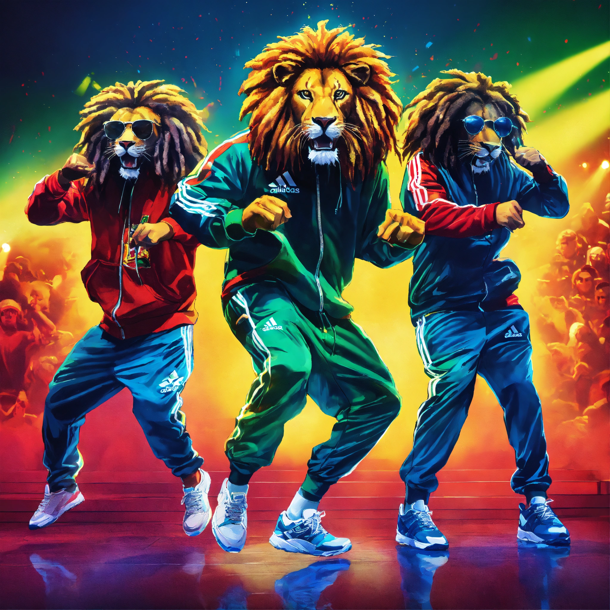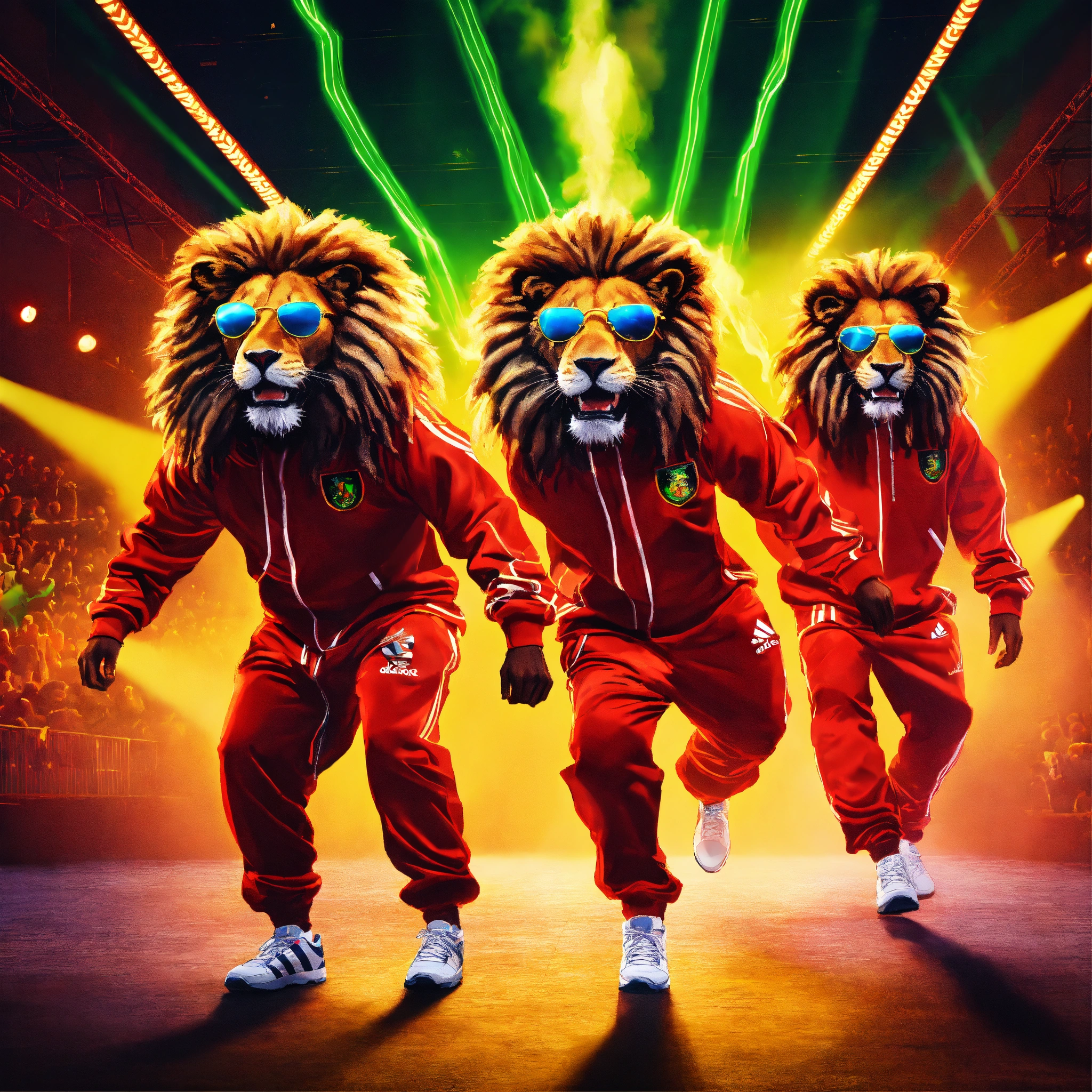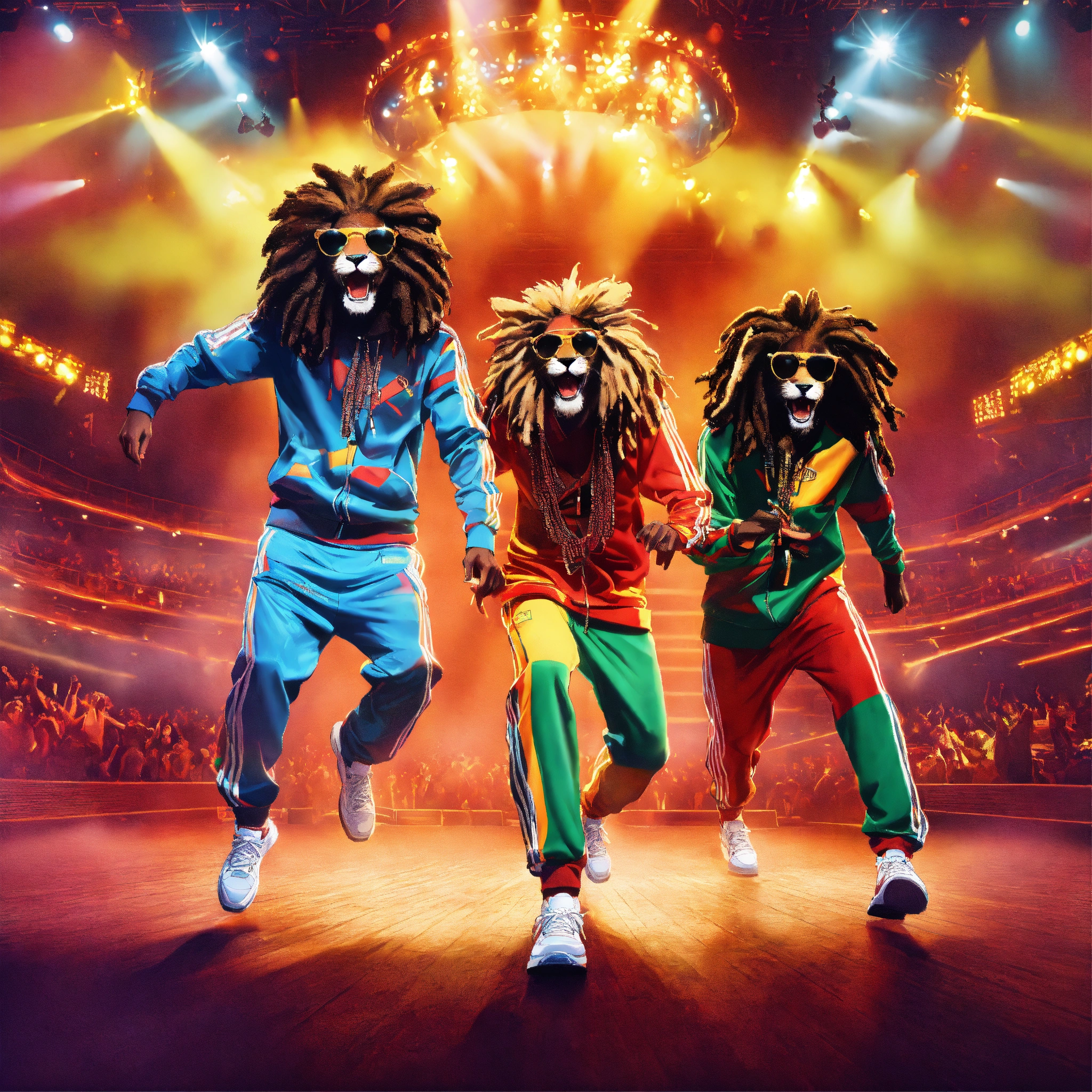 Artistic image type of image illustration prompt description create an electrifying illustration featuring three rasta lions wearing trendy sunglasses, dressed in adidas jumpsuits, showcasing their breakdancing skills like the jabbawockeez on a dynamic stage. the stage will be the focal point, with a massive and exuberant crowd cheering them on. the atmosphere will be filled with vibrant and colorful lights, creating a mesmerizing light show. a hazy mist of smoke will envelop the stage, adding to the energy and excitement.