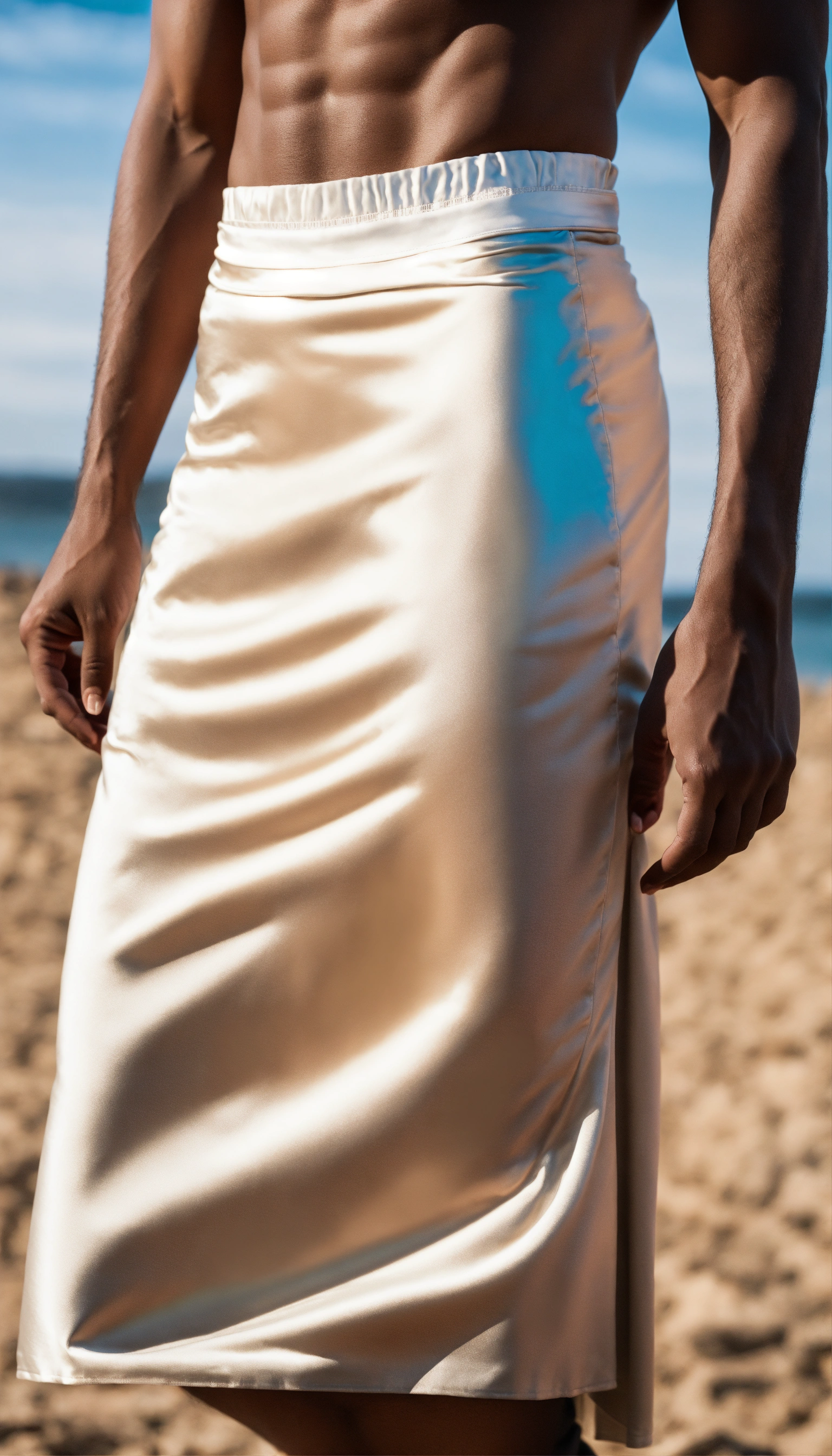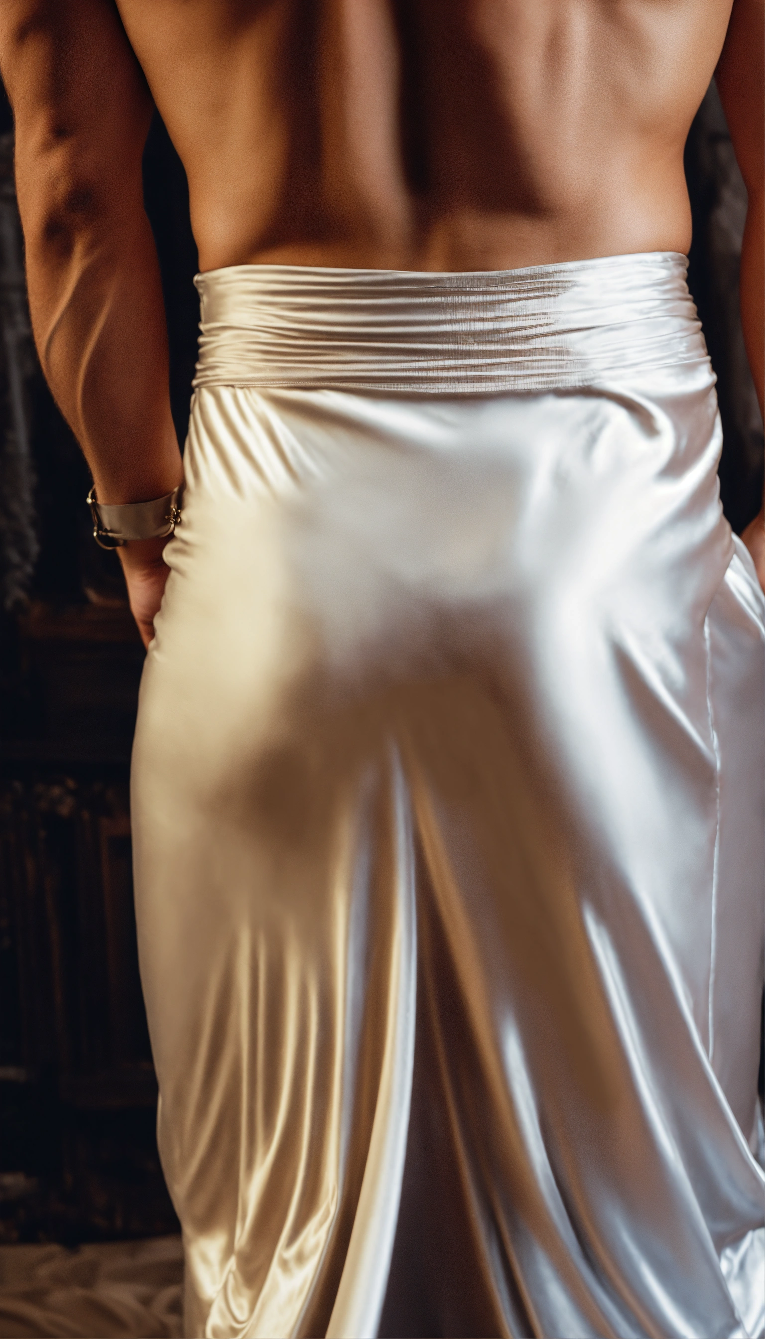 Close up of man wearing white satin shiny figure-hugging clingy pencil maxi skirt, pulled taut. close up. manly body part straining through fabric. toned bulking body. bu lge. ere ct. intimate. tumescent. extremely tight skirt. hard outline.
