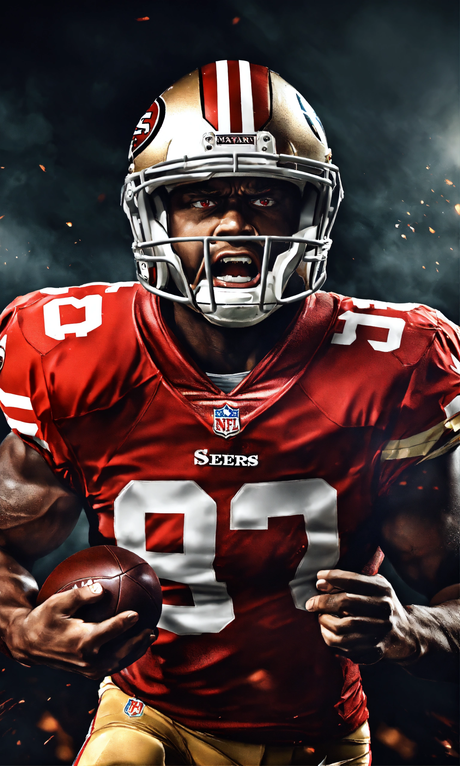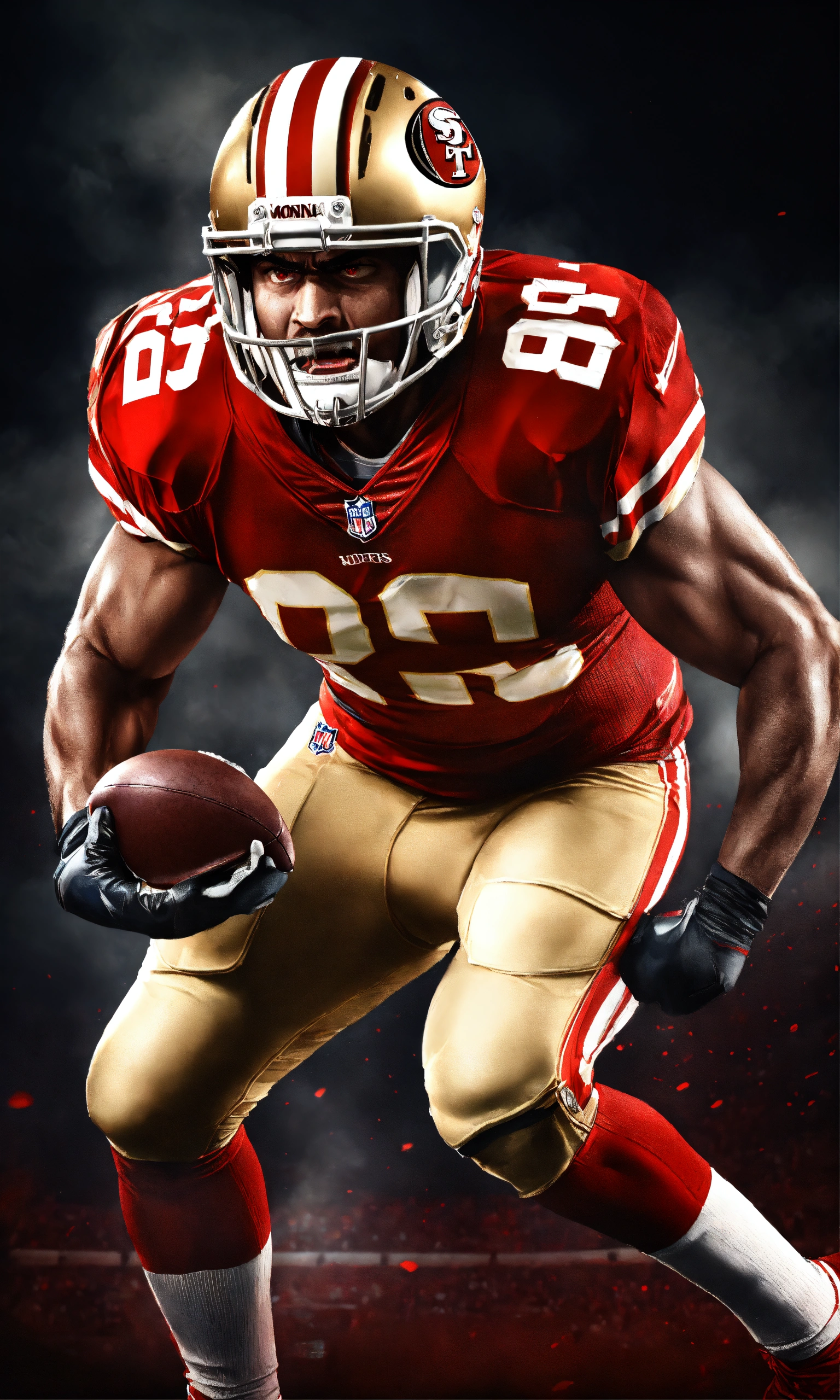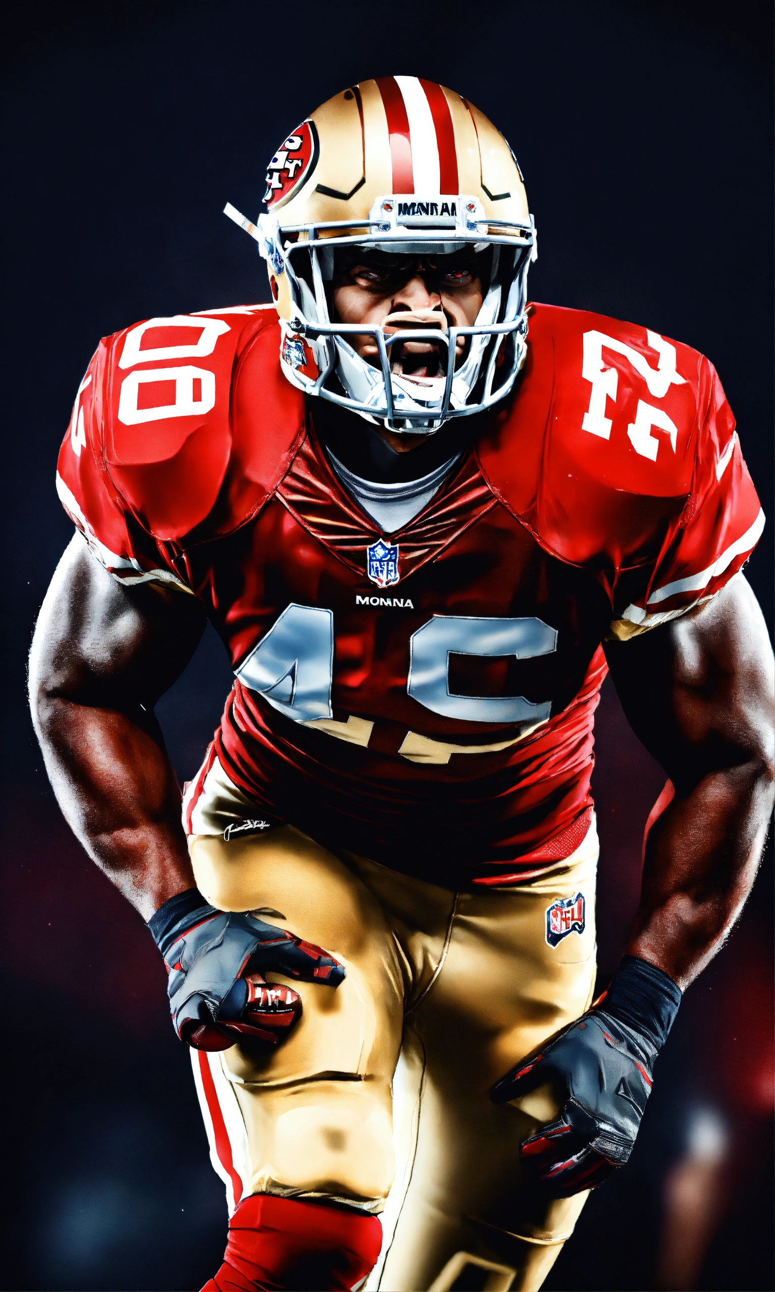 High end aggressive nfl football player, photography, dramatic lighting, hyper detailed, hyper realistic, black background, angry face, tough looking, red eyes, video game cover, nfl blitz, hyper realistic photo, in defensive position, intimidating, san francisco 49ers, facial details, scary, growling, ready to tackle, strong arms, big shoulders, madden football, joe montana