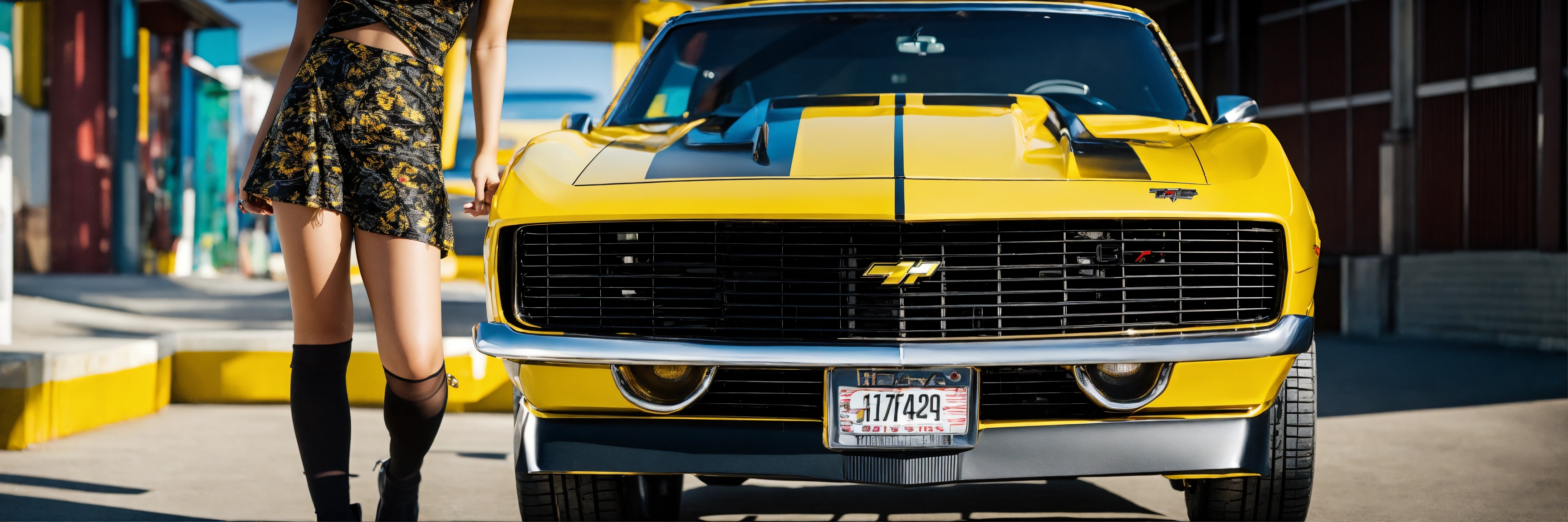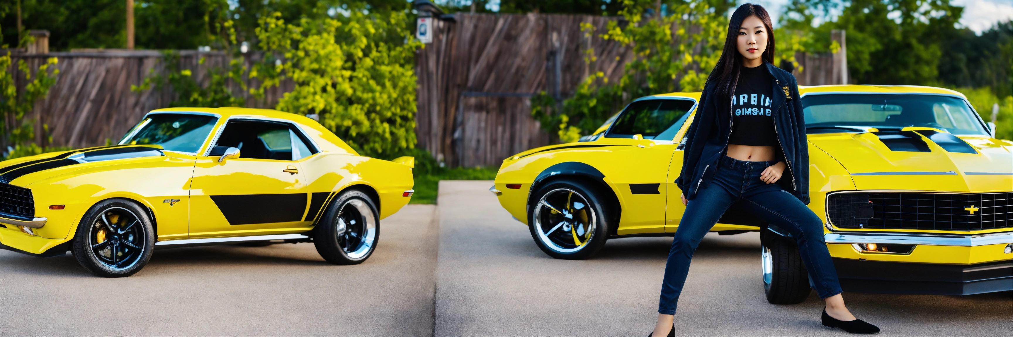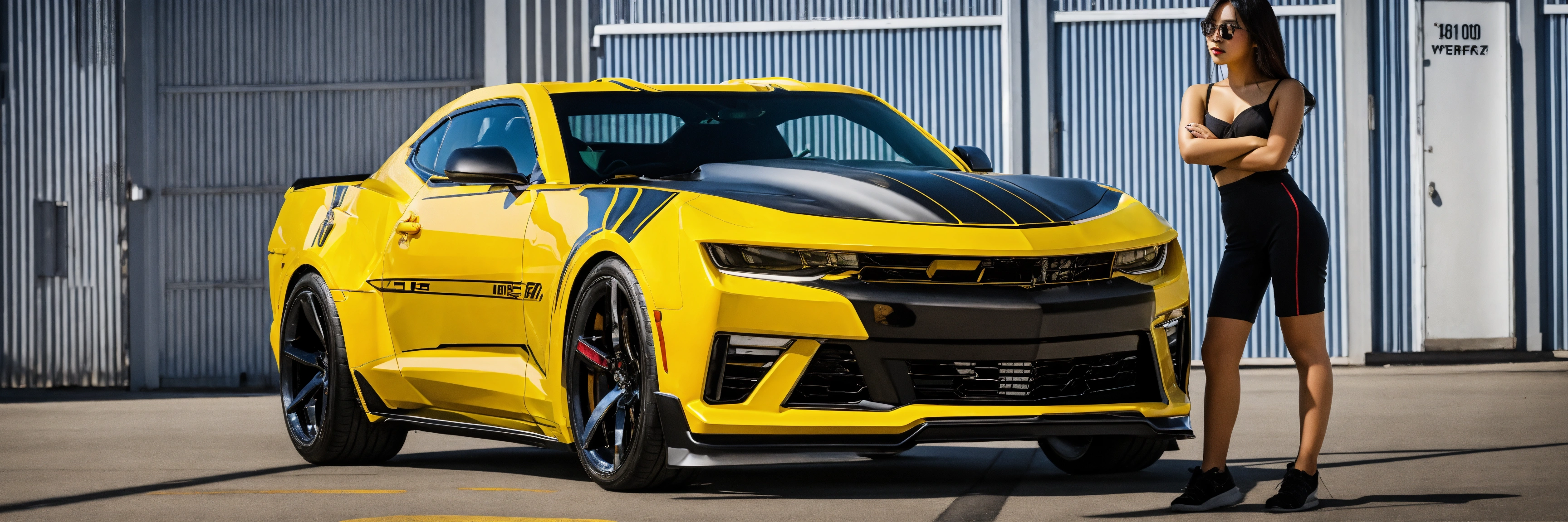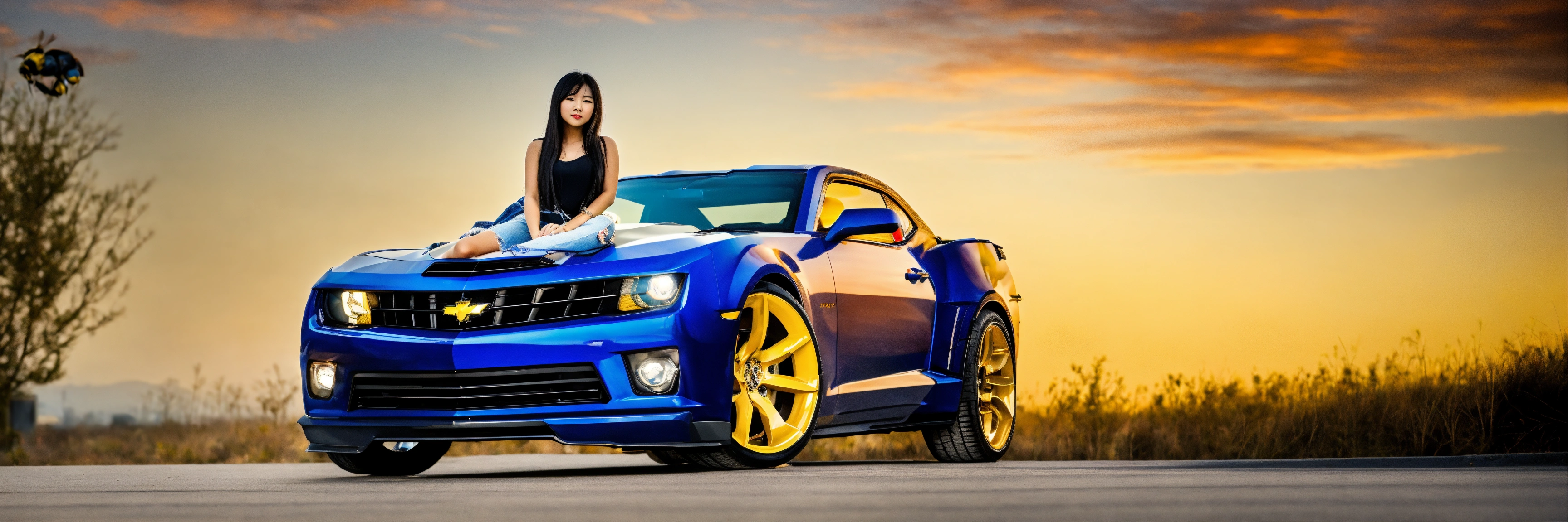 Asian girl posing beside bumblebee camaro