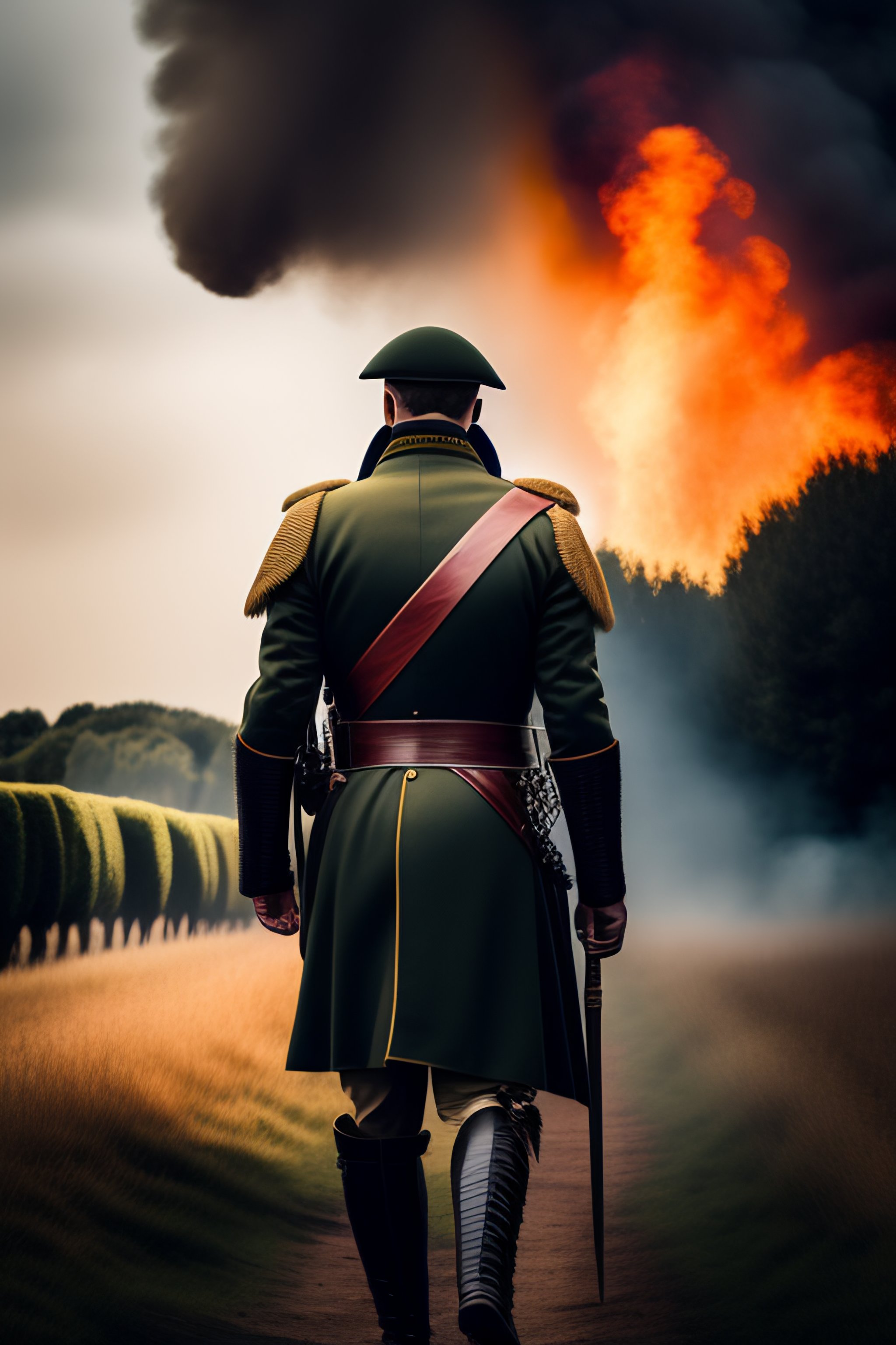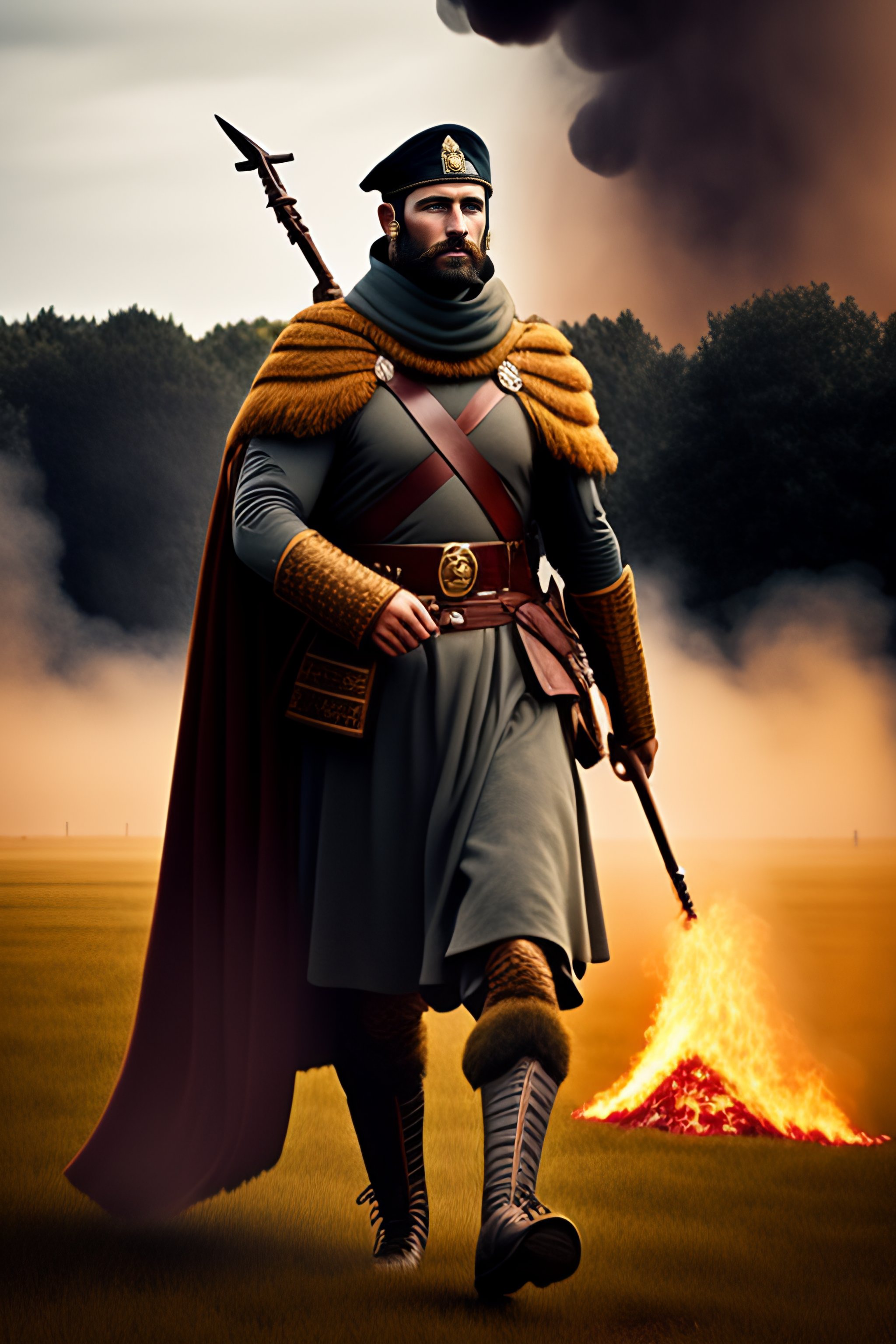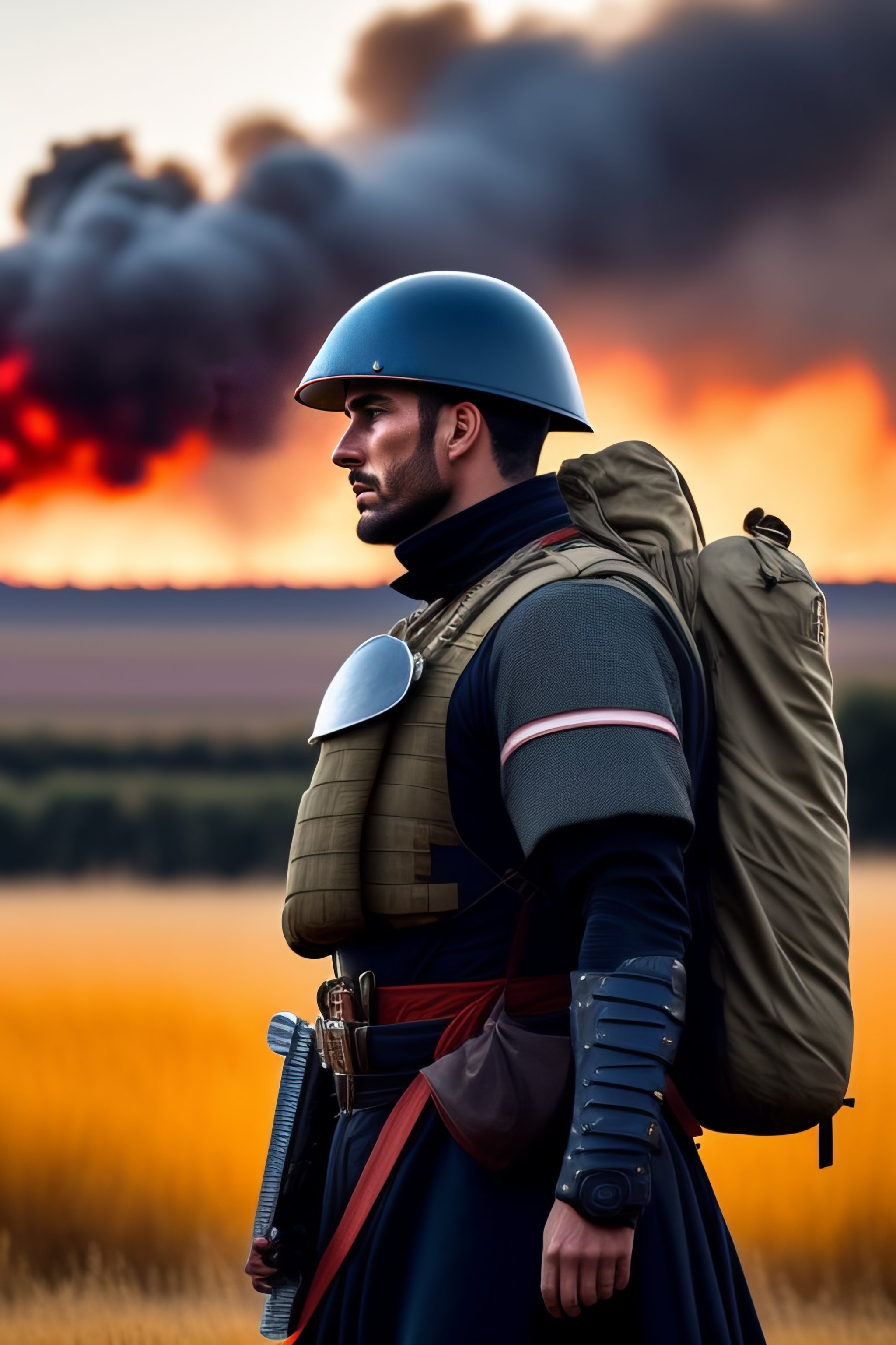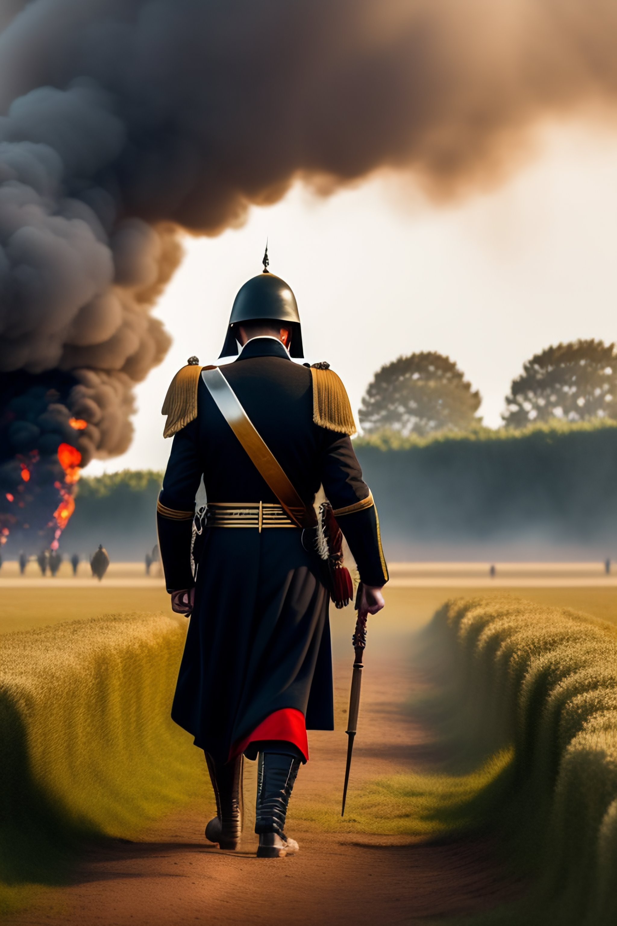 with black smoke of a fire in background