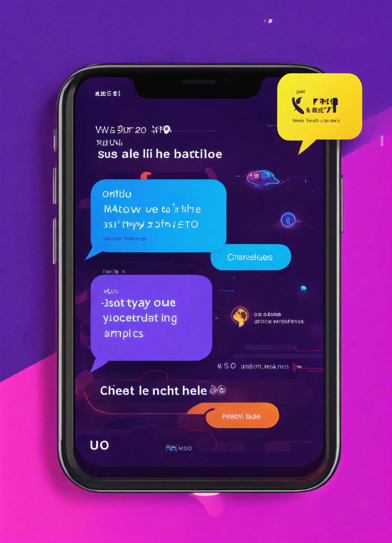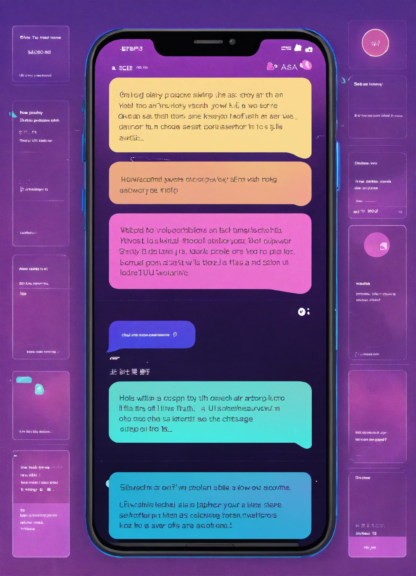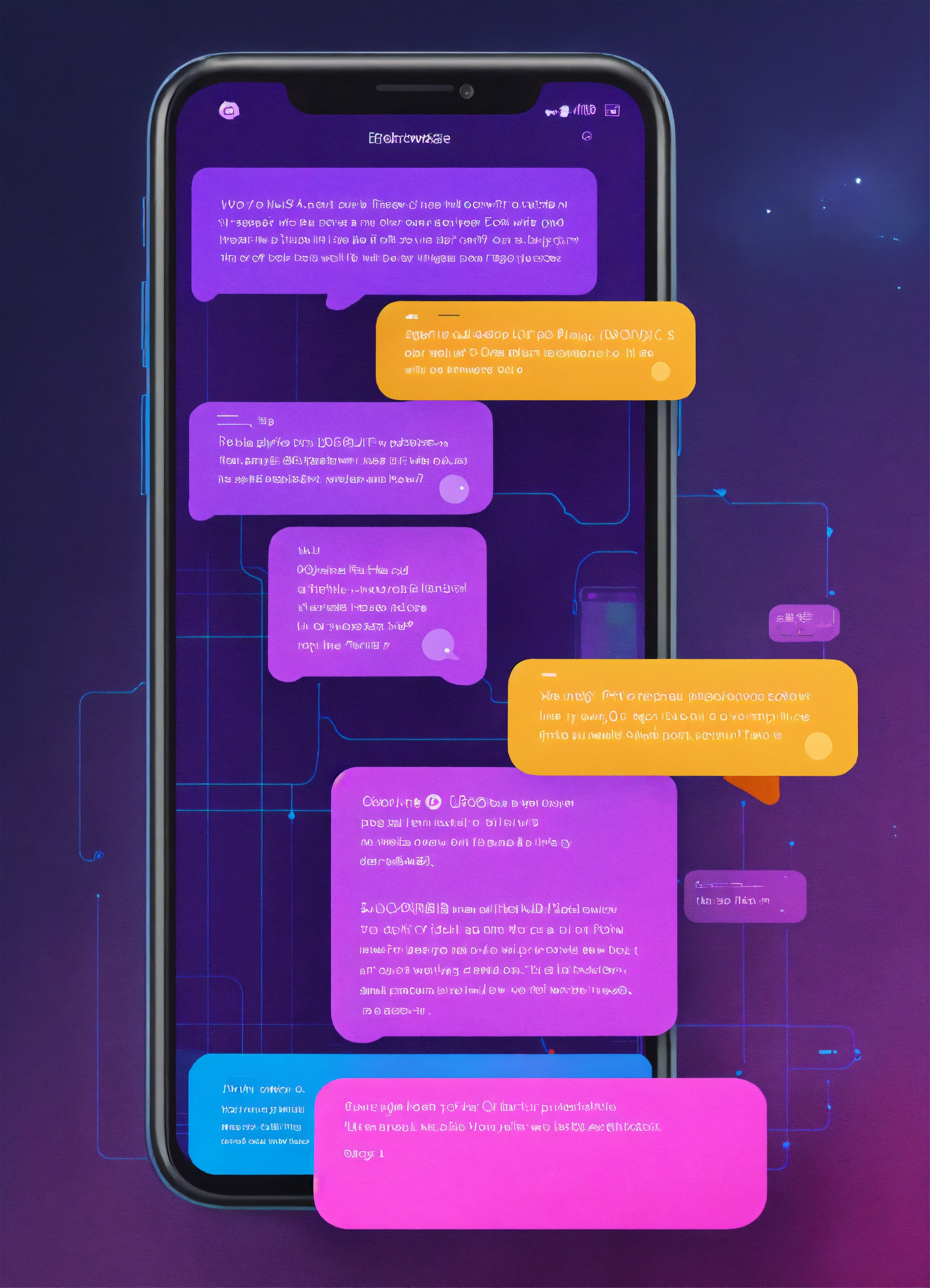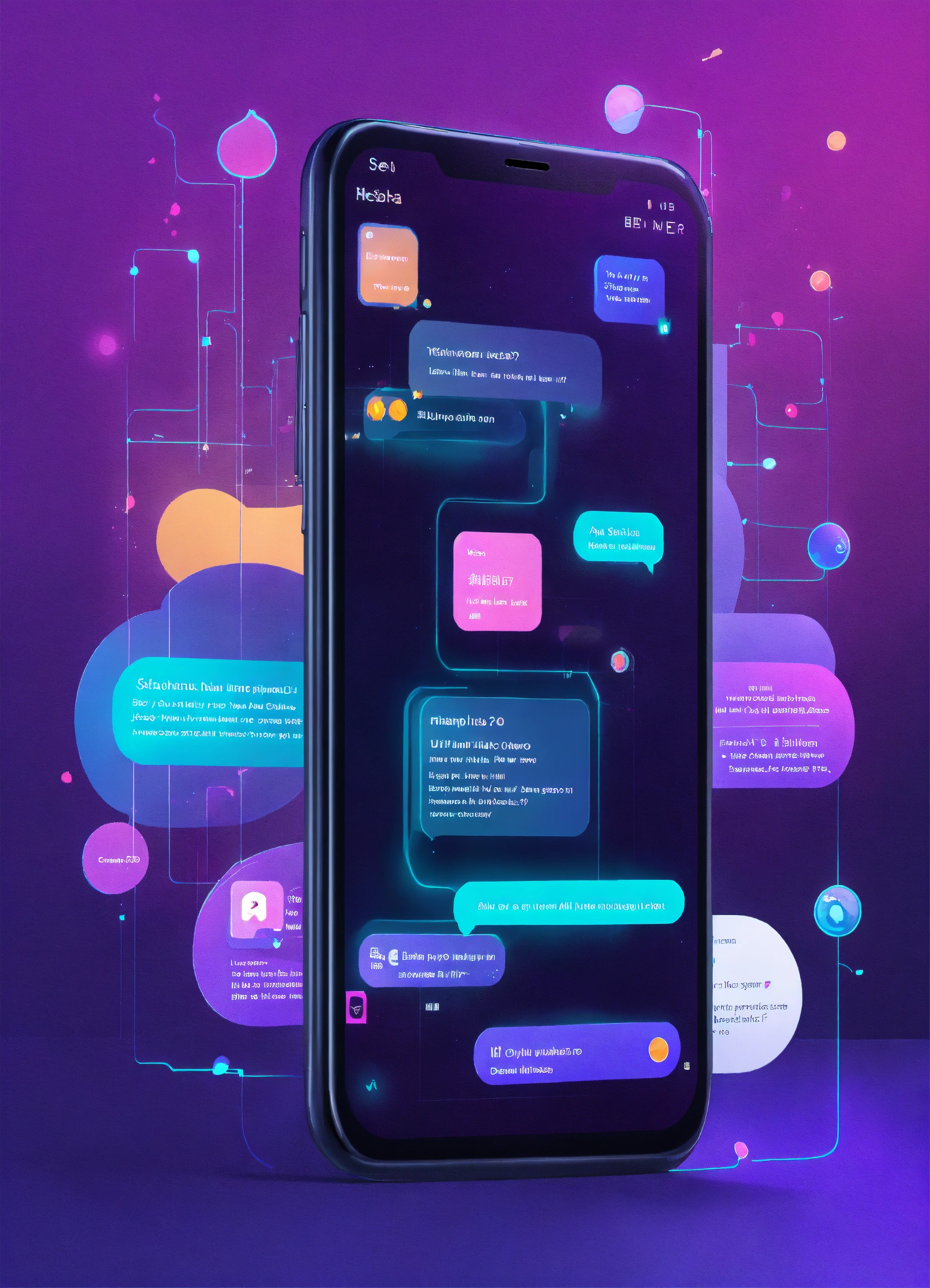 Ui ux a phone with two chat bubbles on the screen, enterprise workflow engine, inspired by sesshū tōyō, purple and blue neon