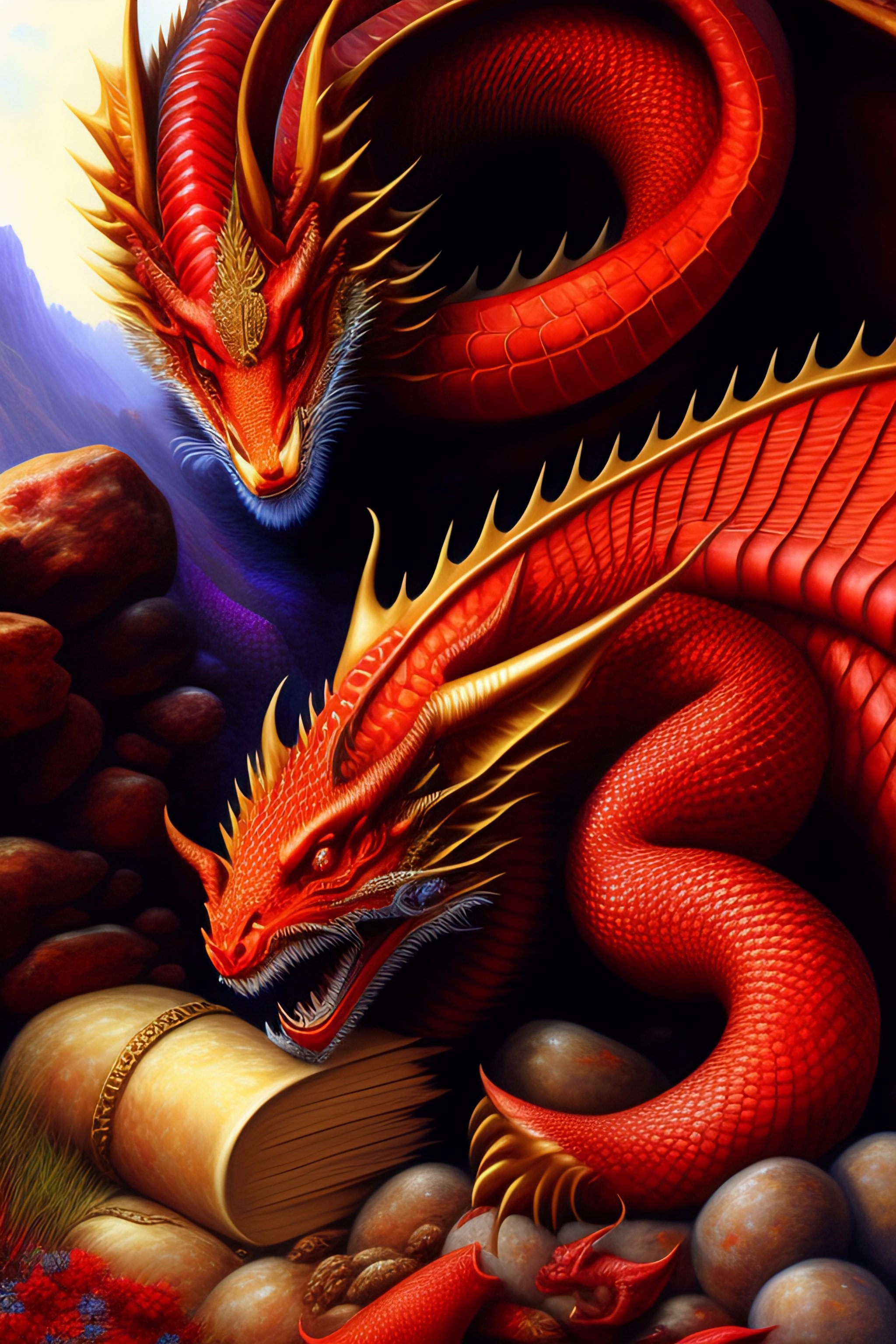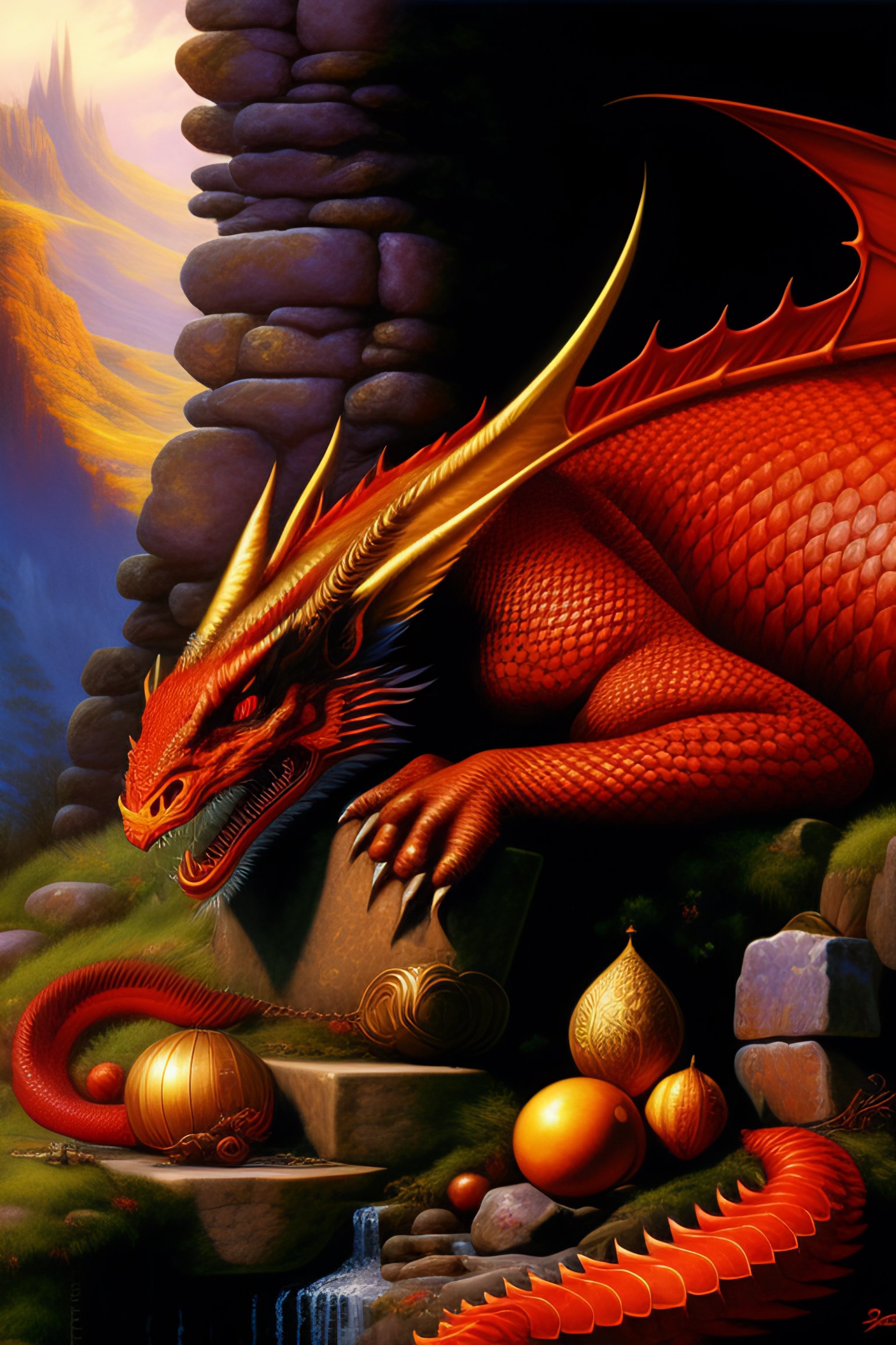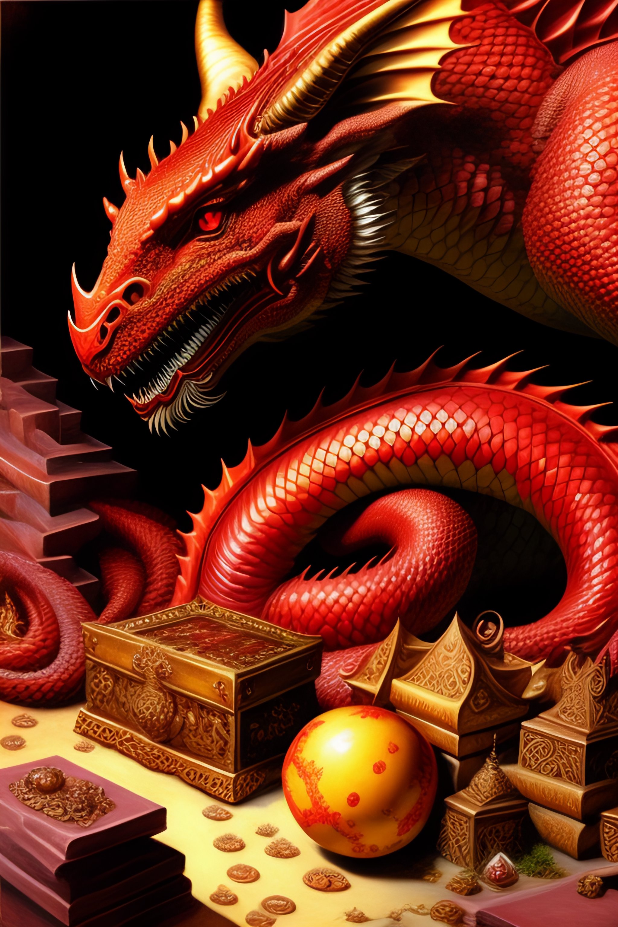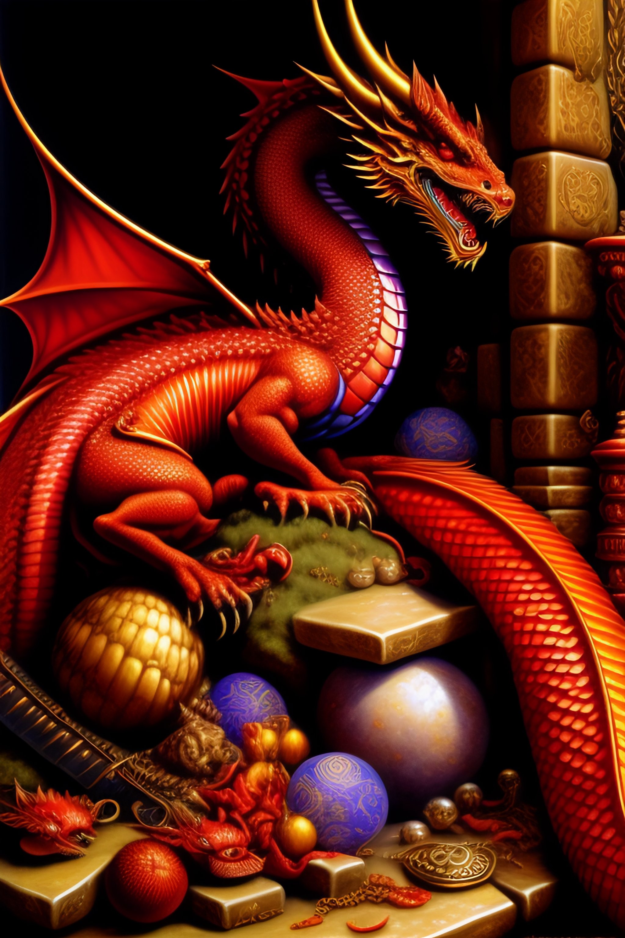 Painting, red dragon lying on pile of treasures, highly detailed, fantasy art, 90s style, by adrian smith, by kentaro miura