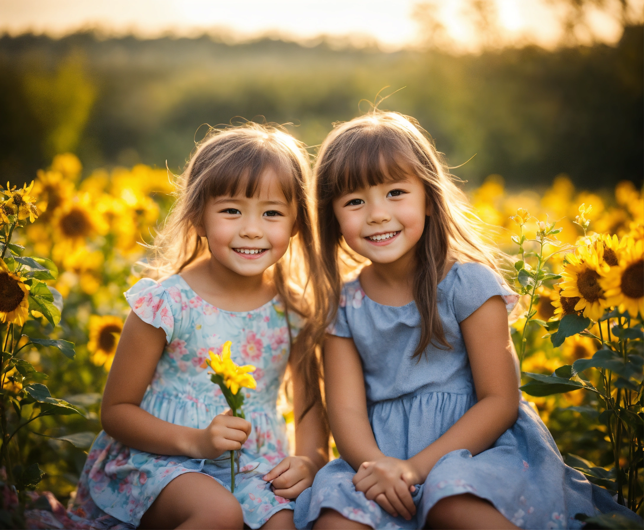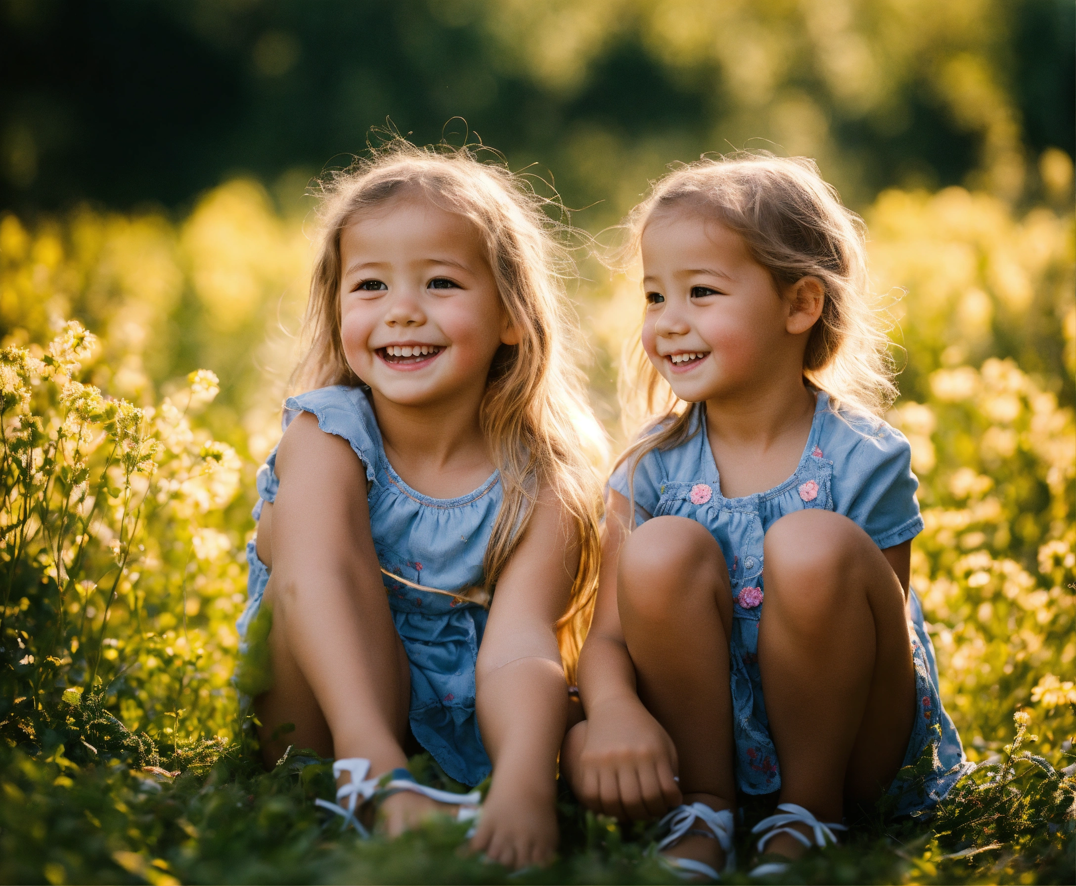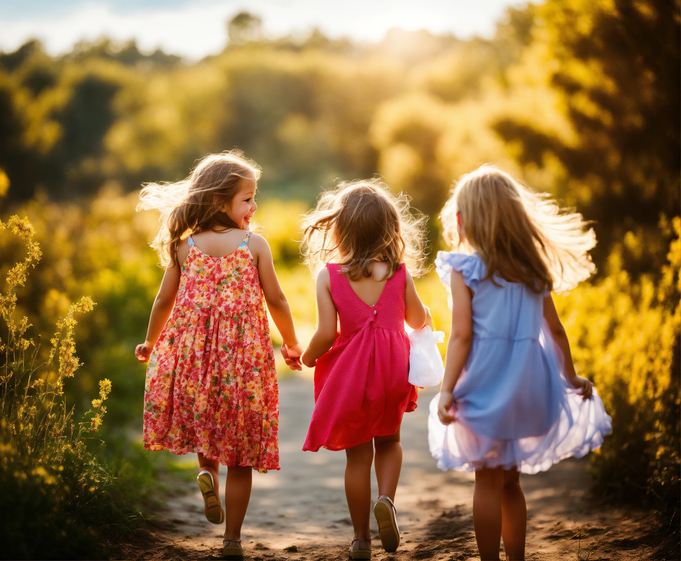 3 little girls 5 years old, happy, nature, sunny day, emotions, low - contrast, ultra - detailed photography