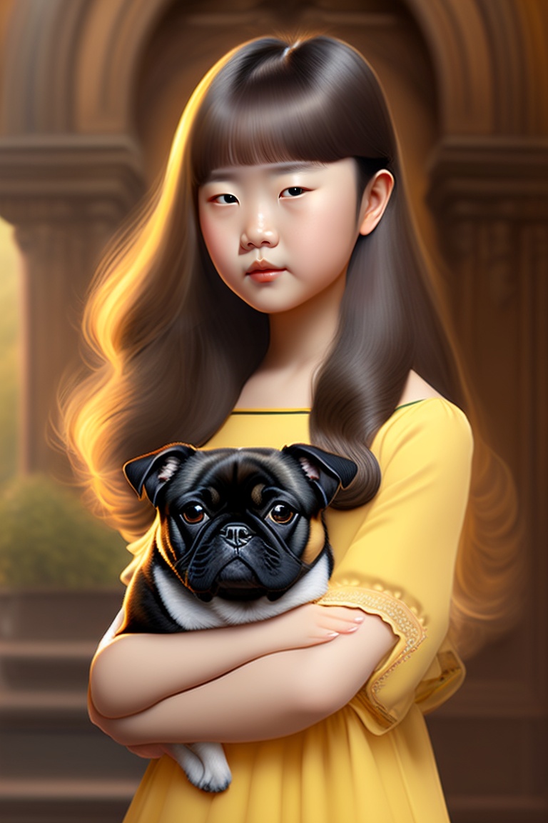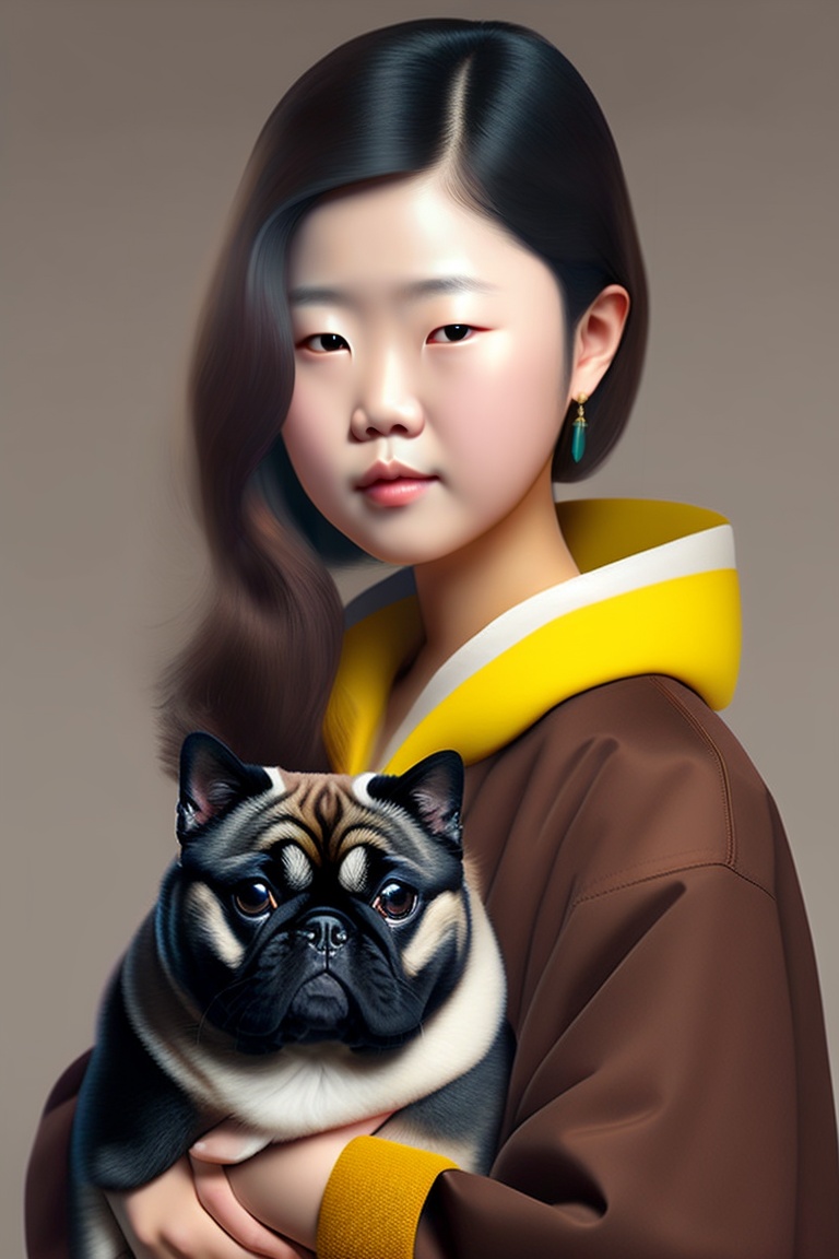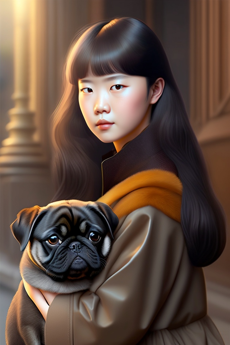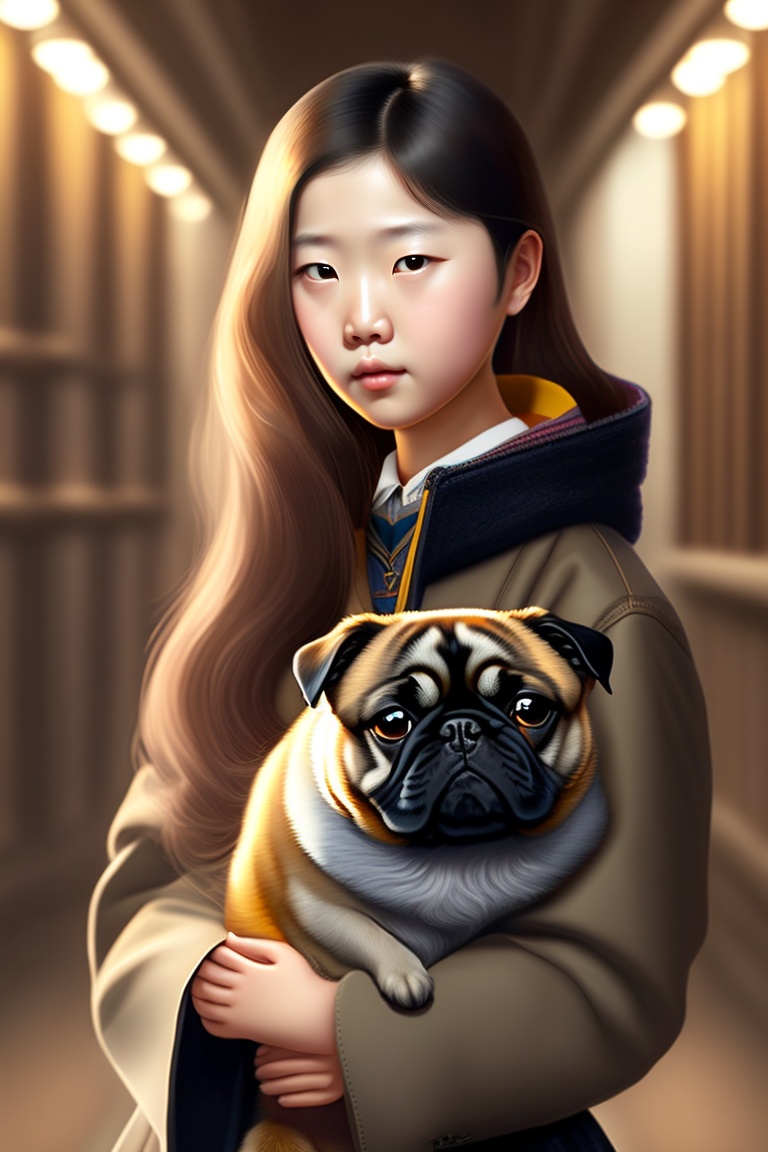 A girl of small stature. half korean, half russian. medium-length dark hair with dark yellow, slim figure. harry potter-esque. with a pug and a cramped cat.
