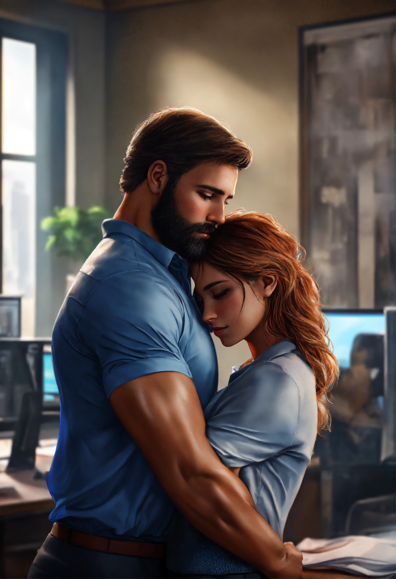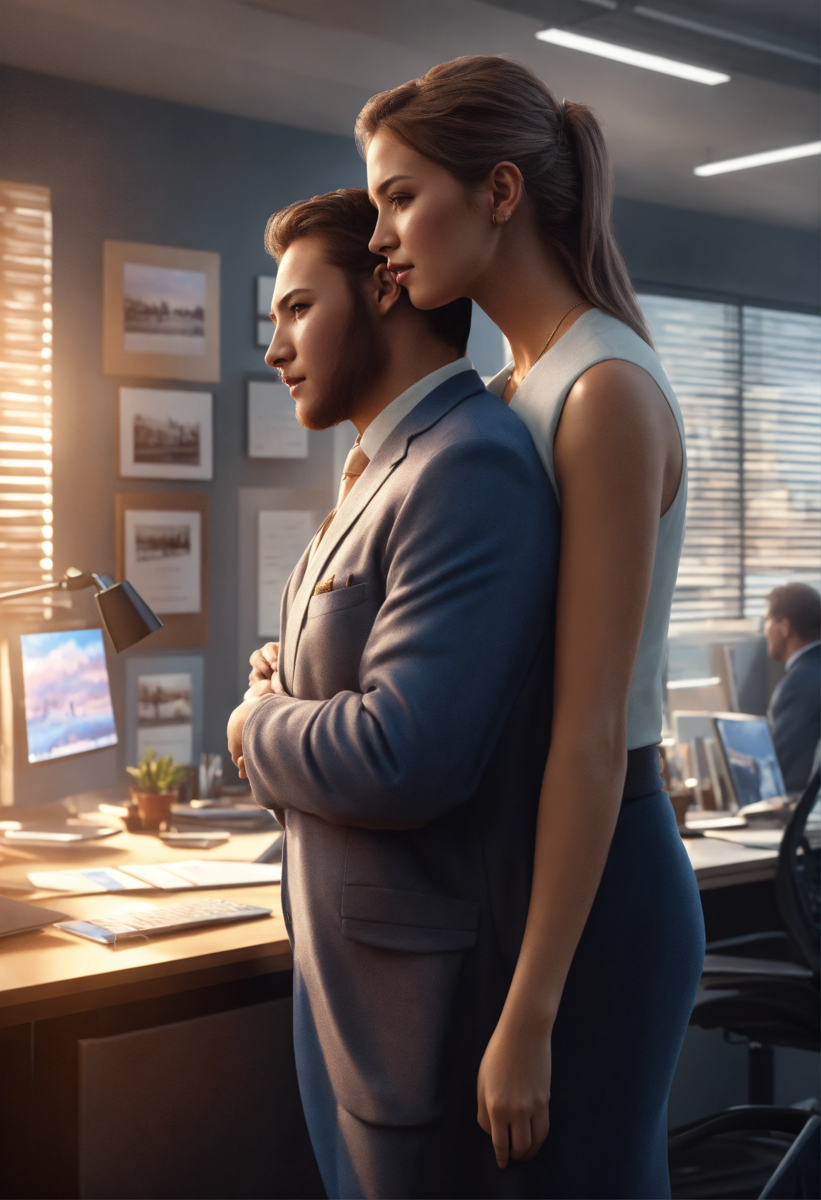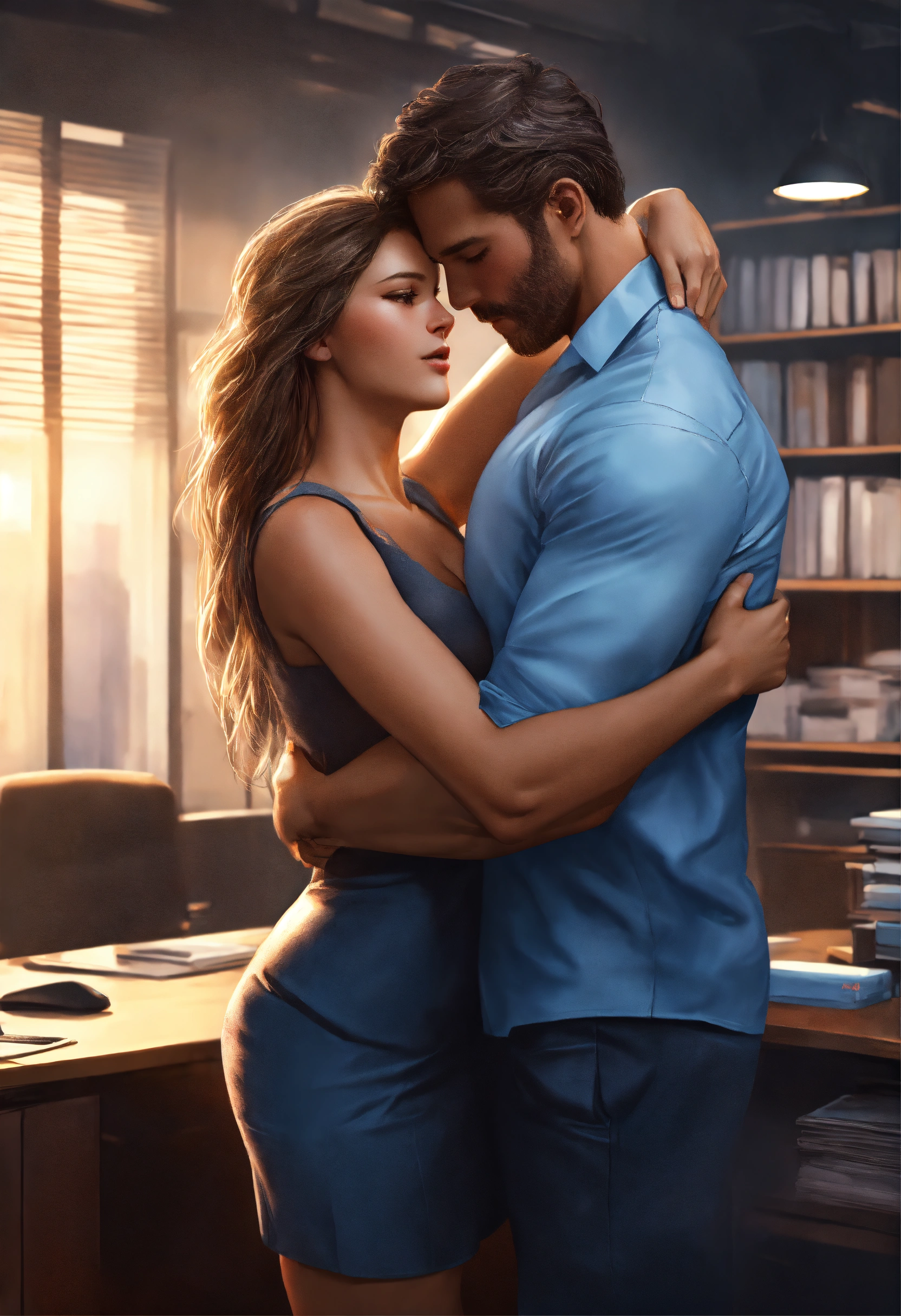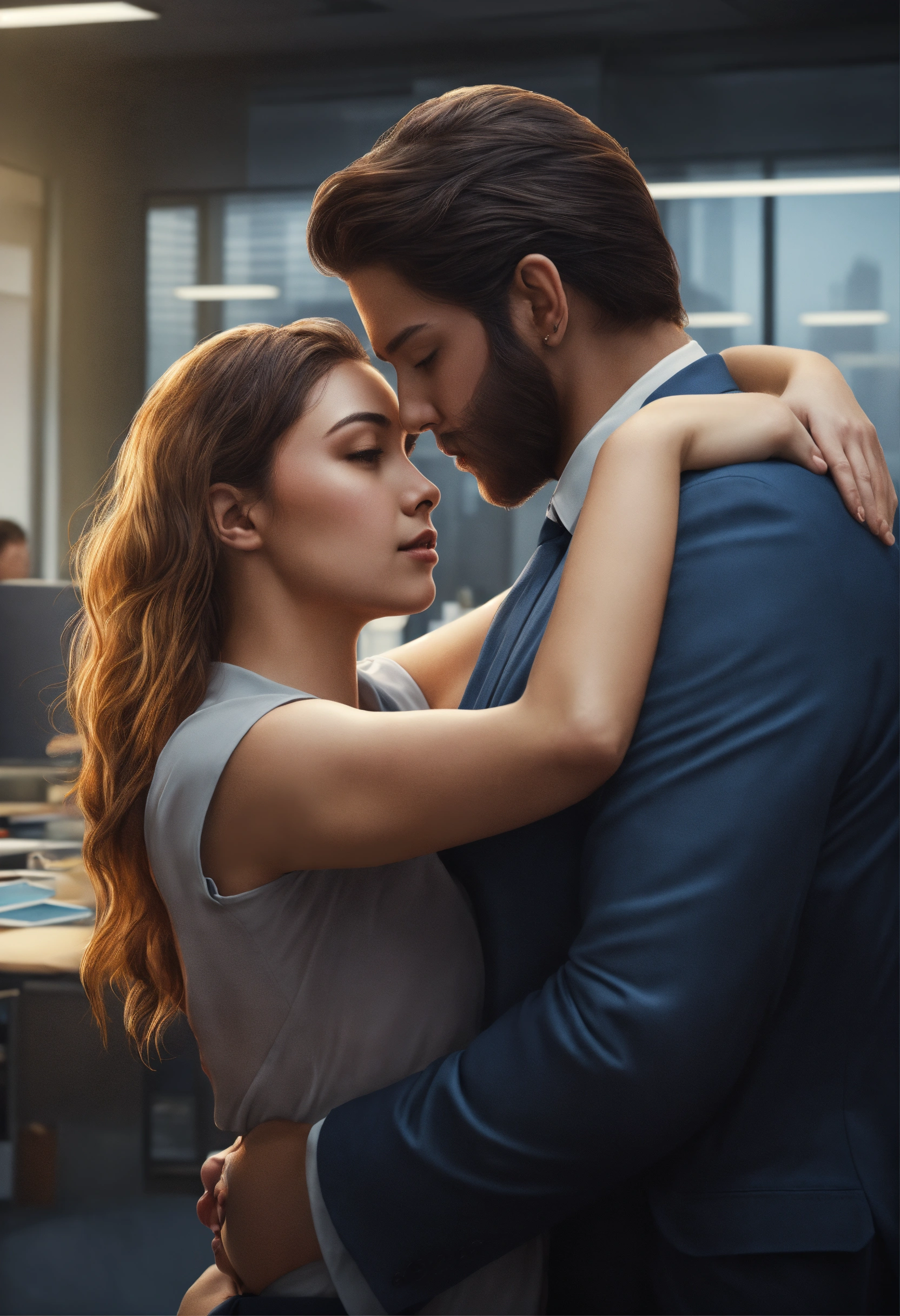 Beautiful girl hugging strong man in office, high detail, realistic photo, high detail, digital painting, cinematic, stunning, hyper realistic, sharp focus, high resolution 8k, insanely detailed