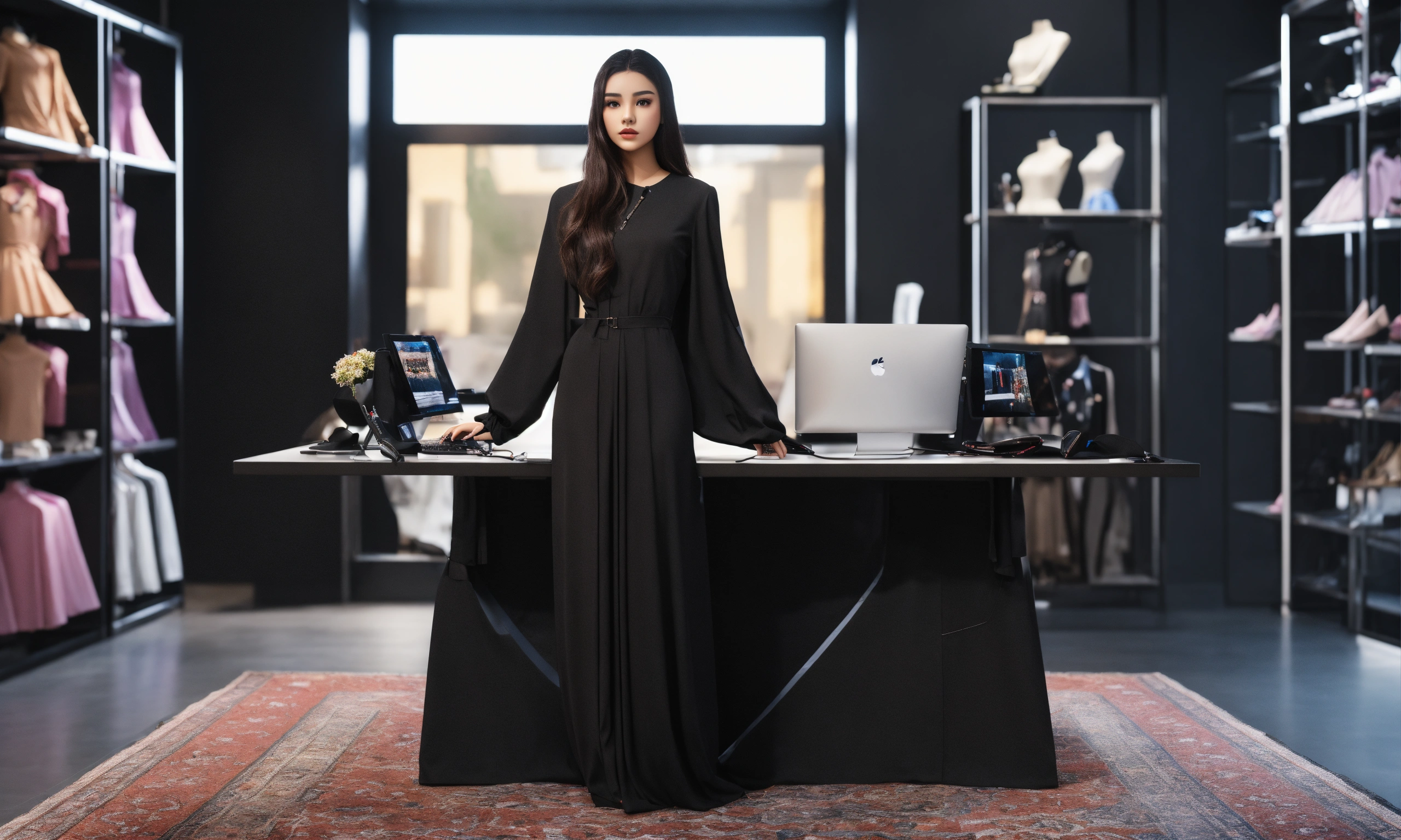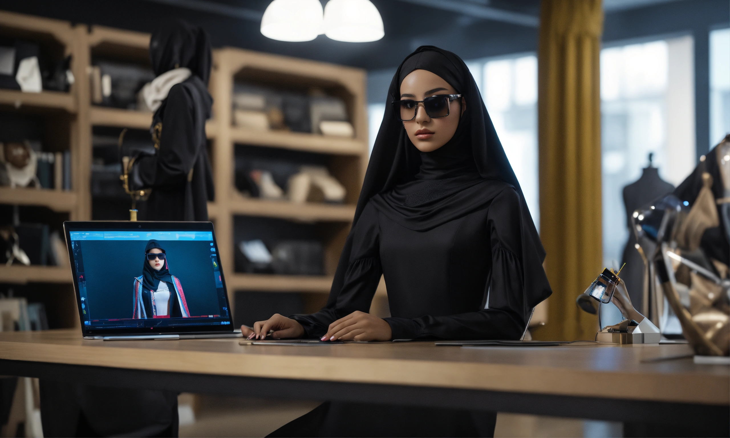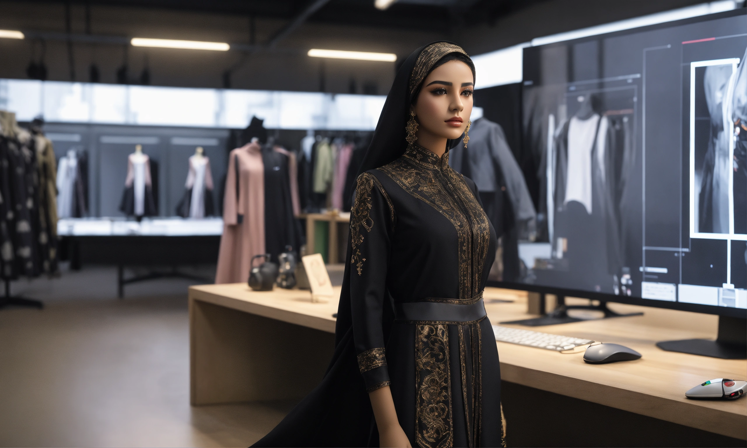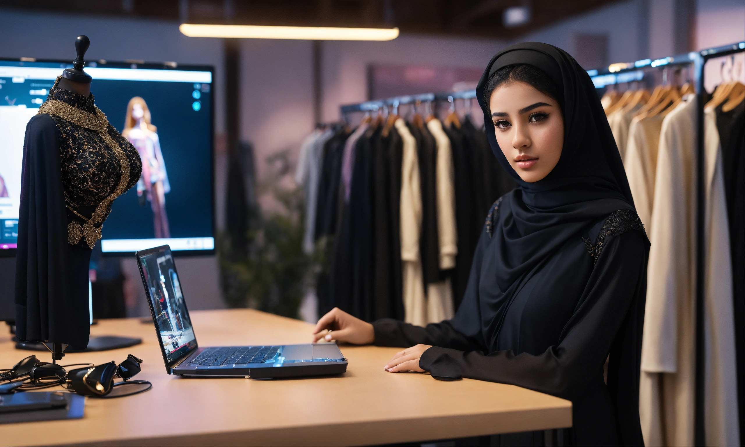 Saudi youth girl, fashion designer, design shop, augmented reality, technology, desk, computer, mannequin, dress, black costume, photo-realistic, 8k, high-definition