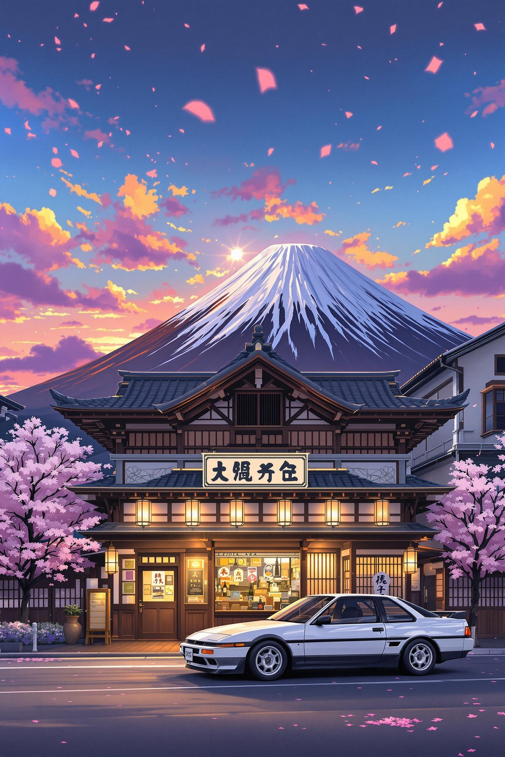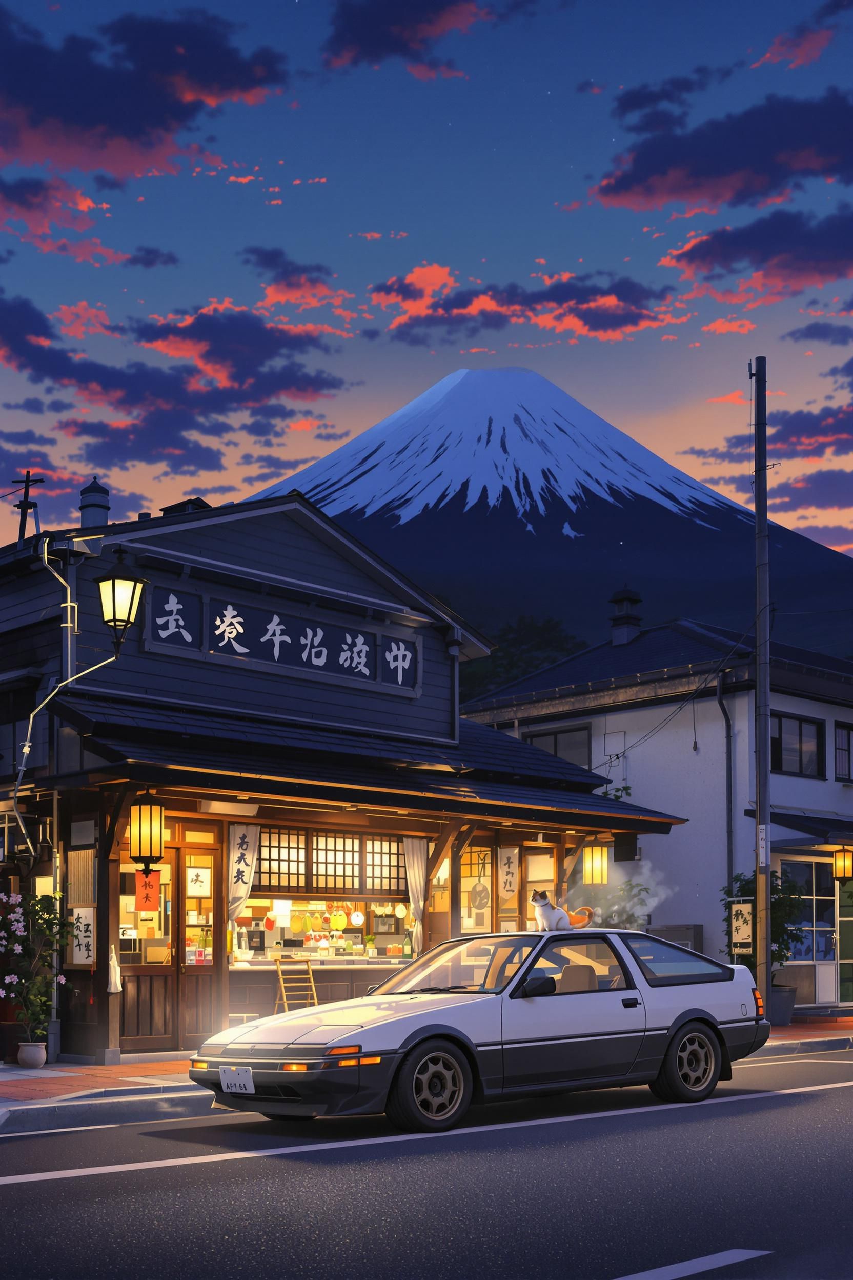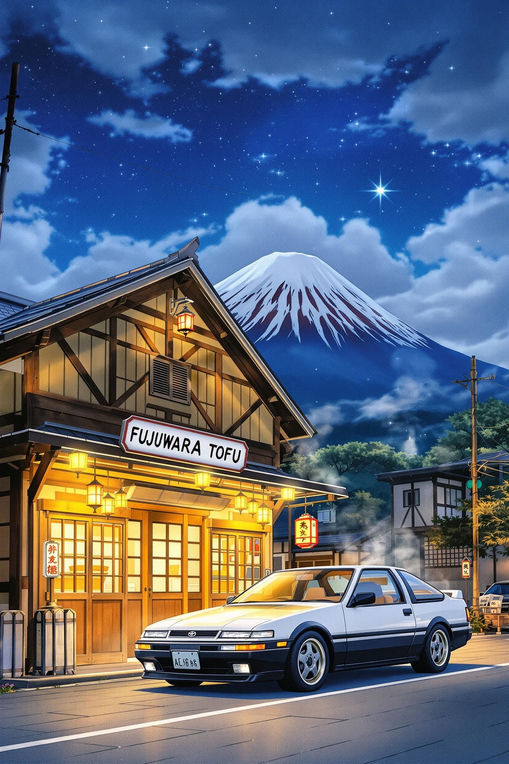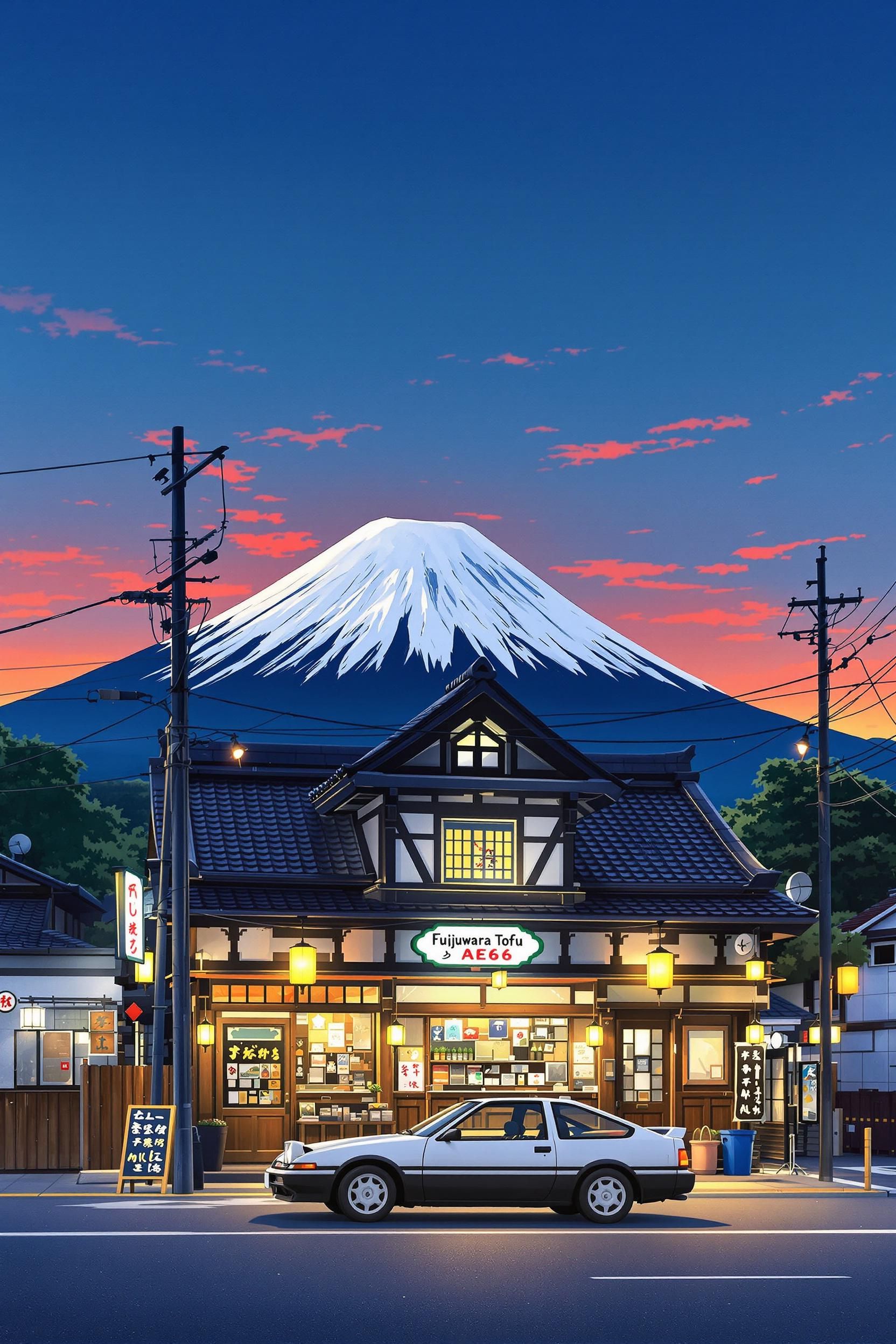 Studio ghibli style, in the evening, a toyota ae86 parked in front of fujiwara tofu shop, warm lights, with mount fuji in the background. the camera is facing the facade of the shop, anime movie-level effect