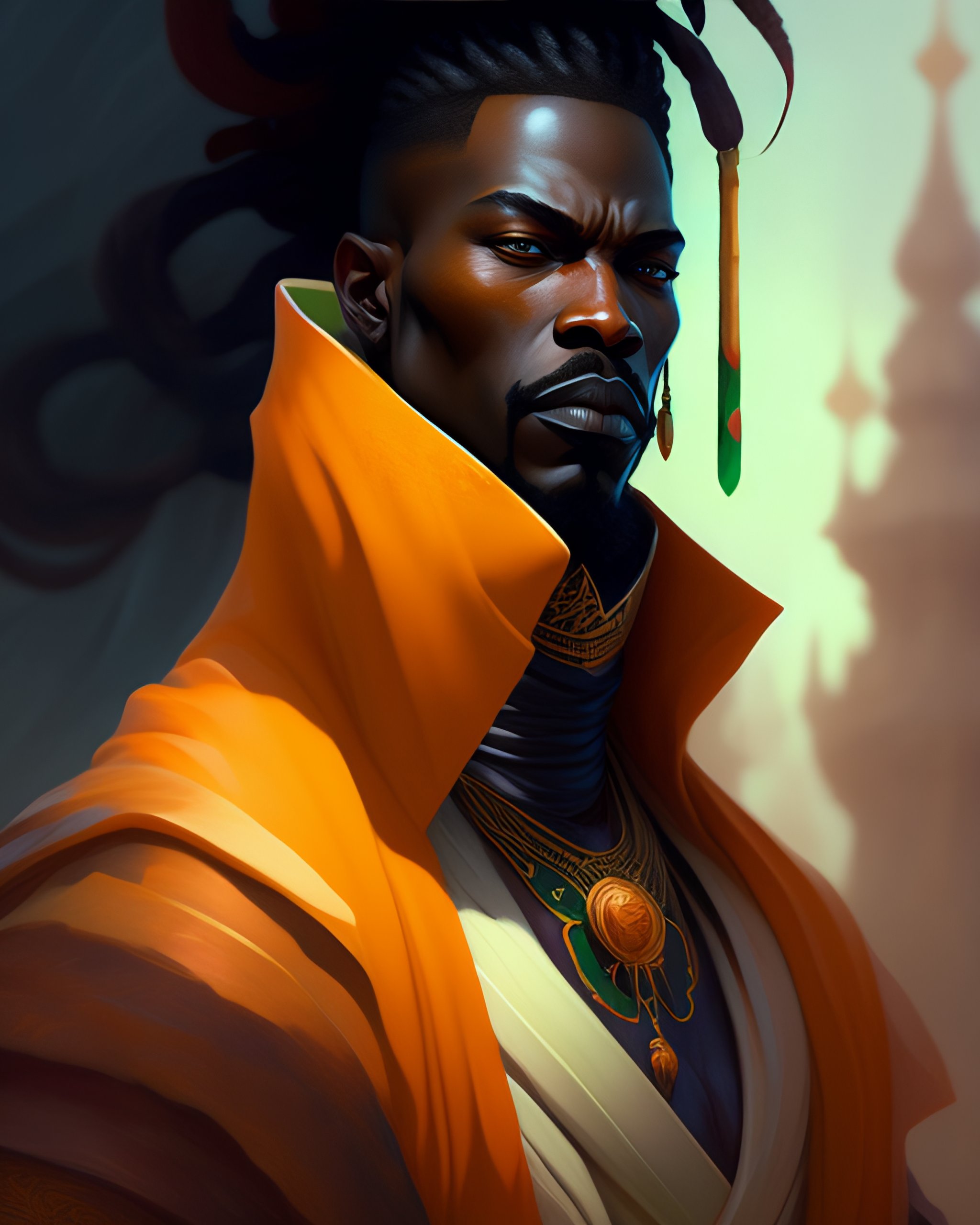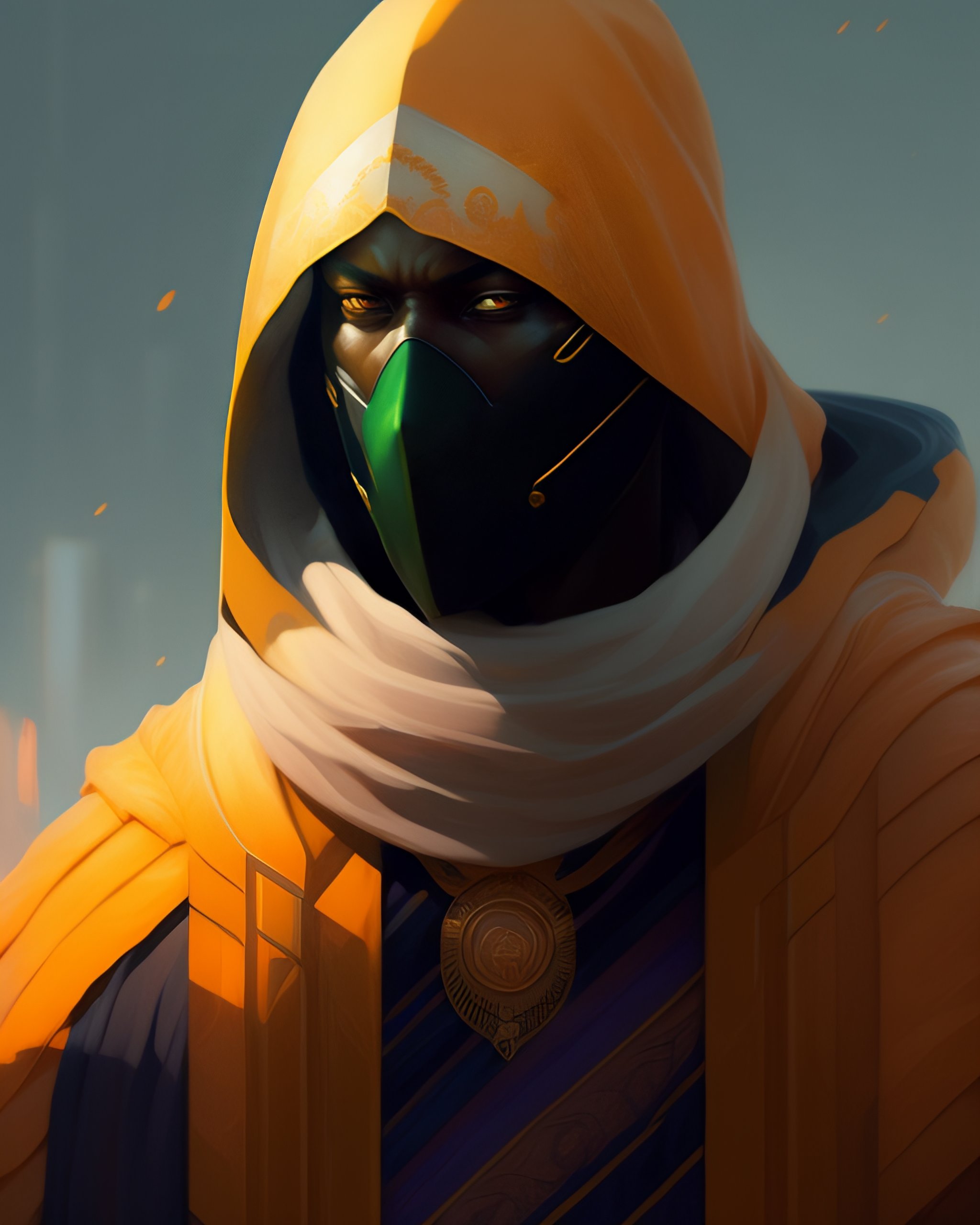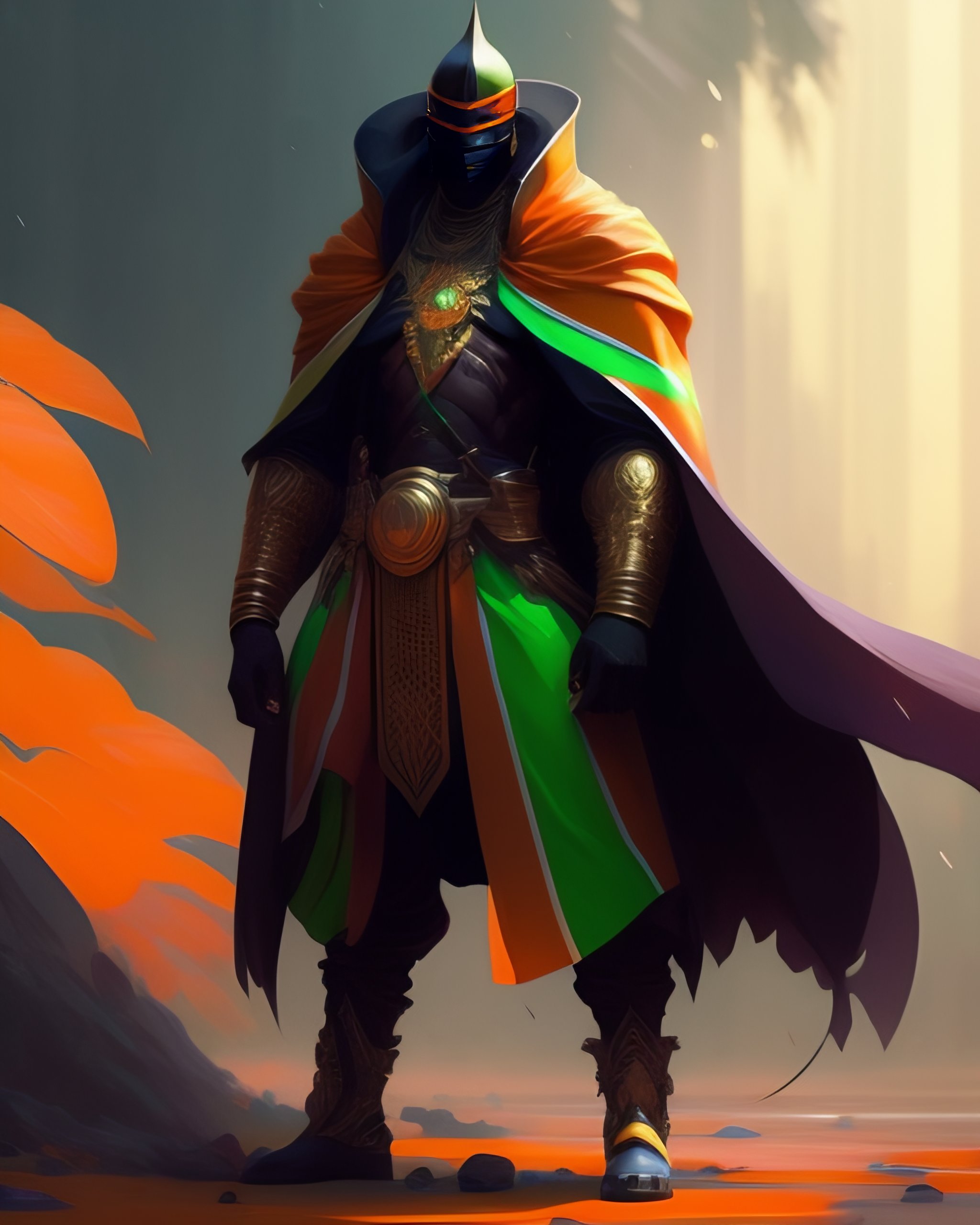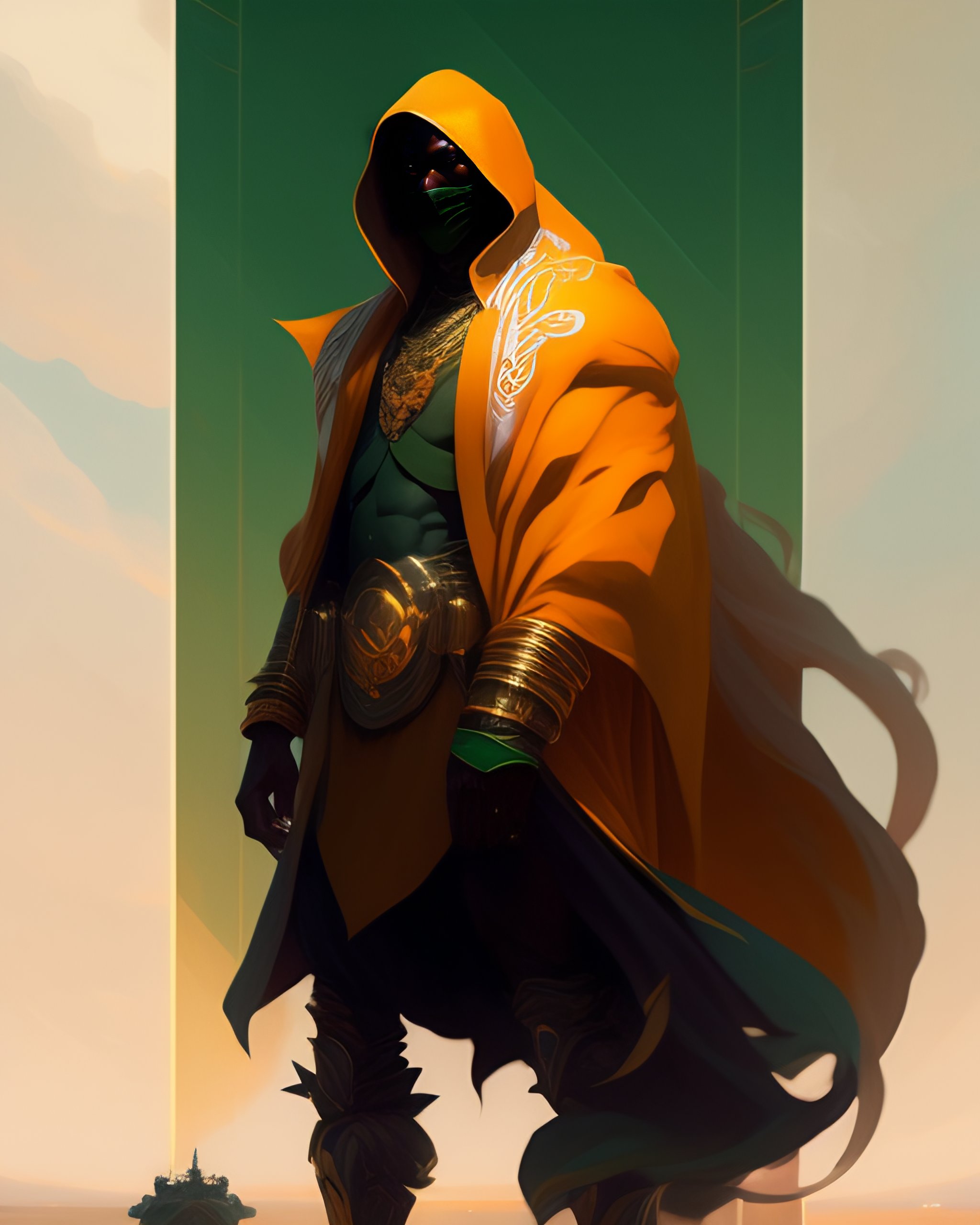 A gloomy art piece depicting a full body man representation of a menacing supervillain from ivory coast, dramatic and intimidating, wearing unique outfit and mask in the colors of the ivorian flag (orange, white, green), include details such as weapons that enhance his villainous persona, afro-futuristic landscape background, gloomy and shadowy environment, imagine a dark backstory for this character, sharp focus, illustration, highly detailed, digital painting, concept, greg rutkowski and alphonse mucha