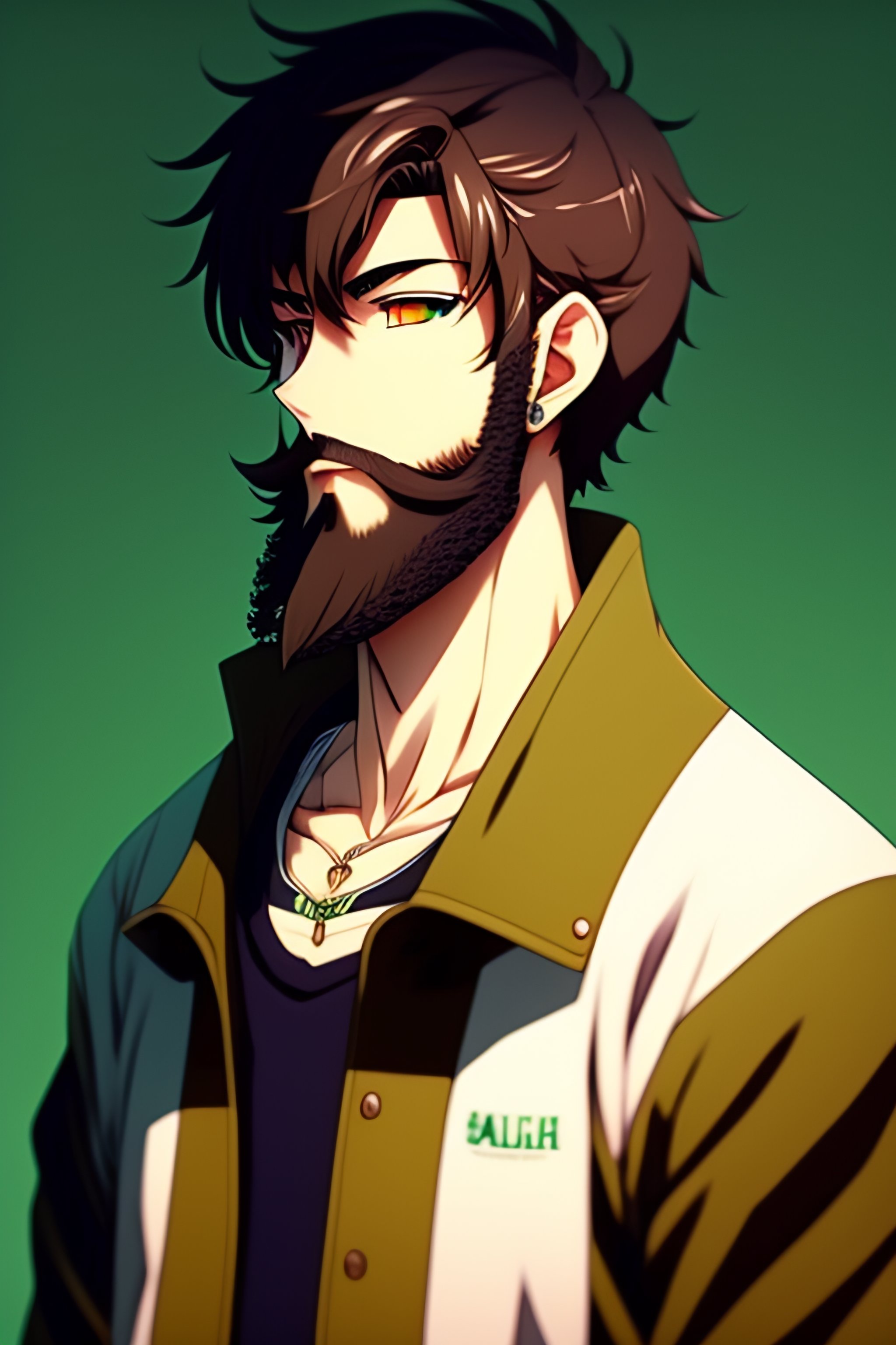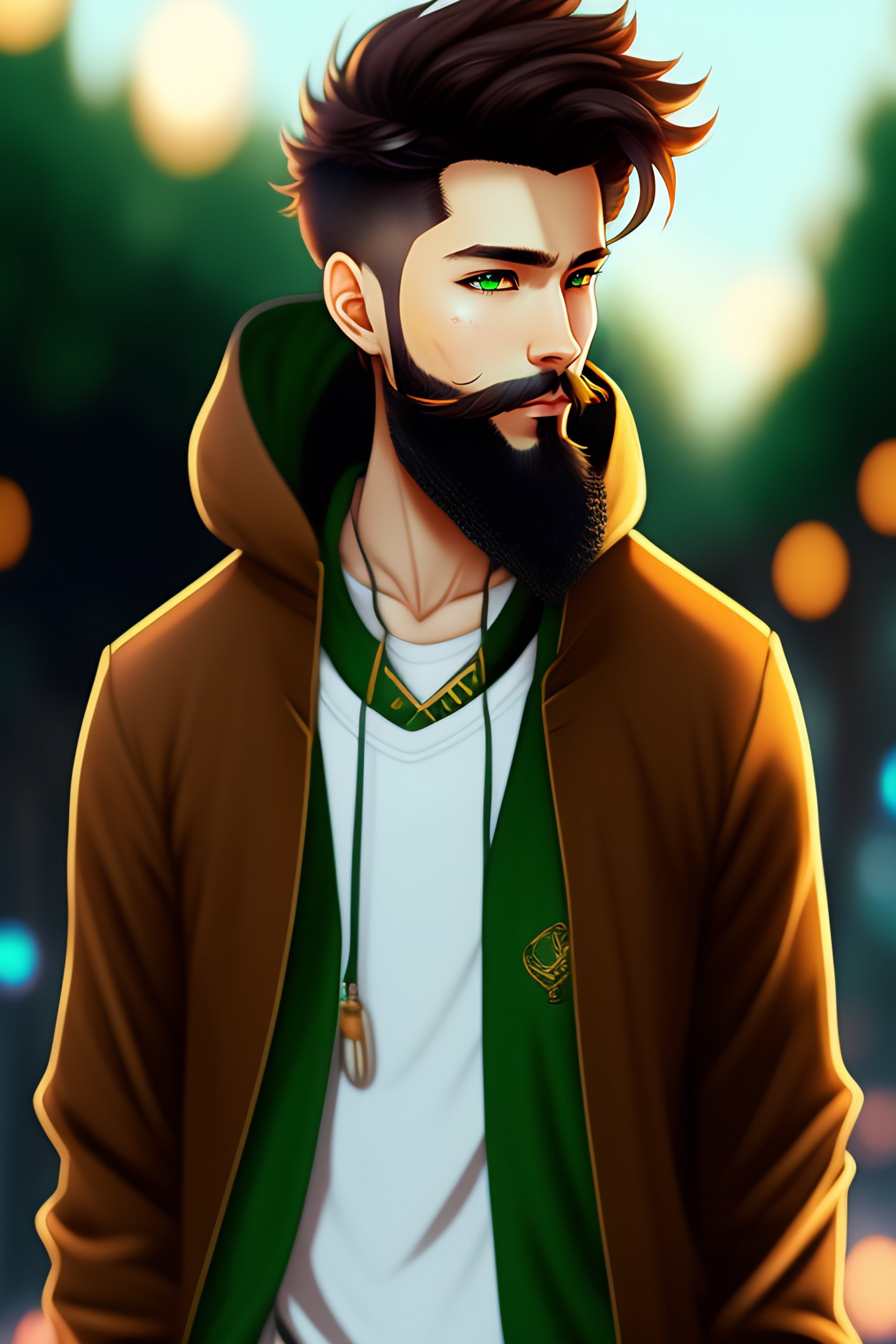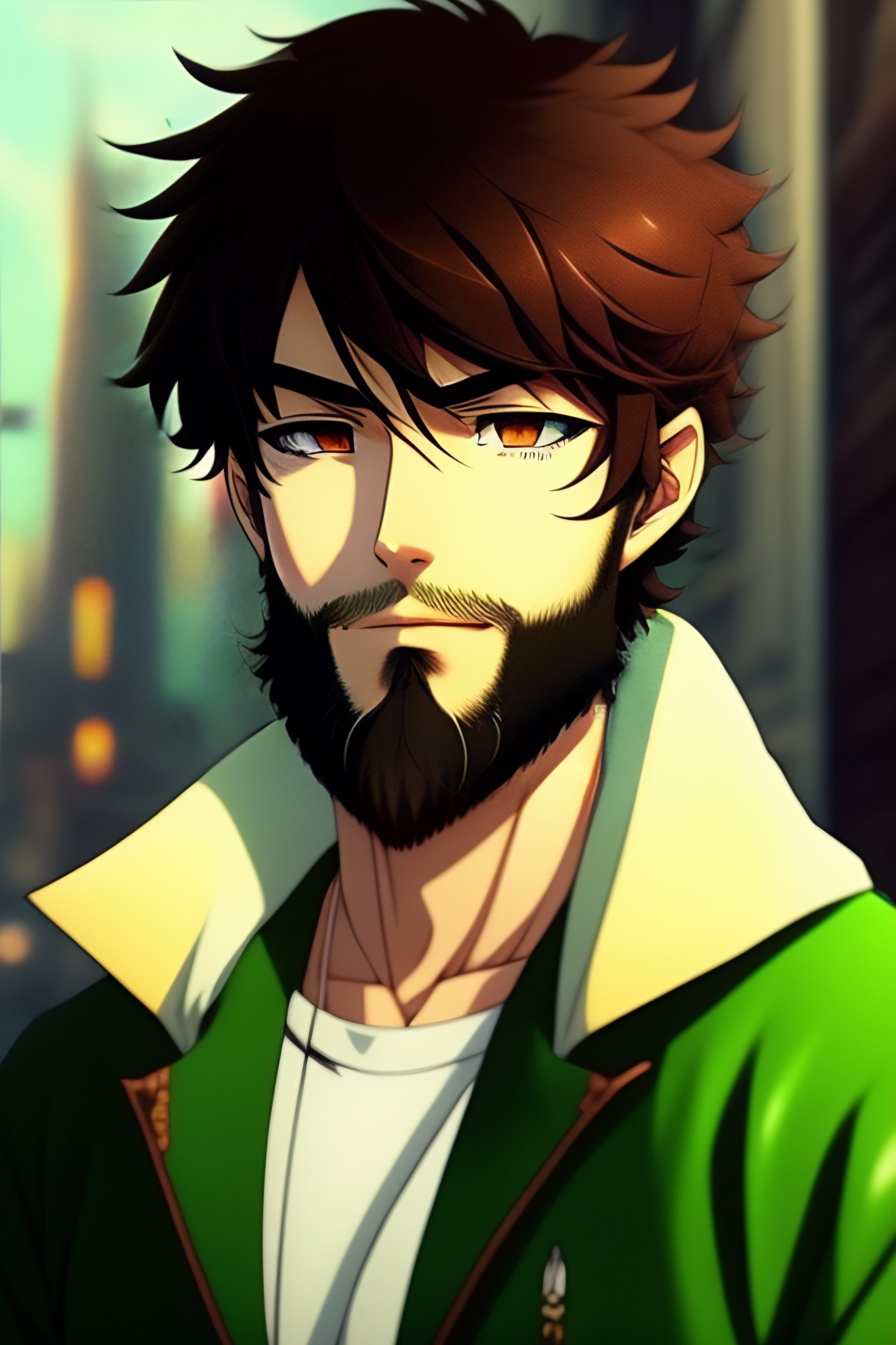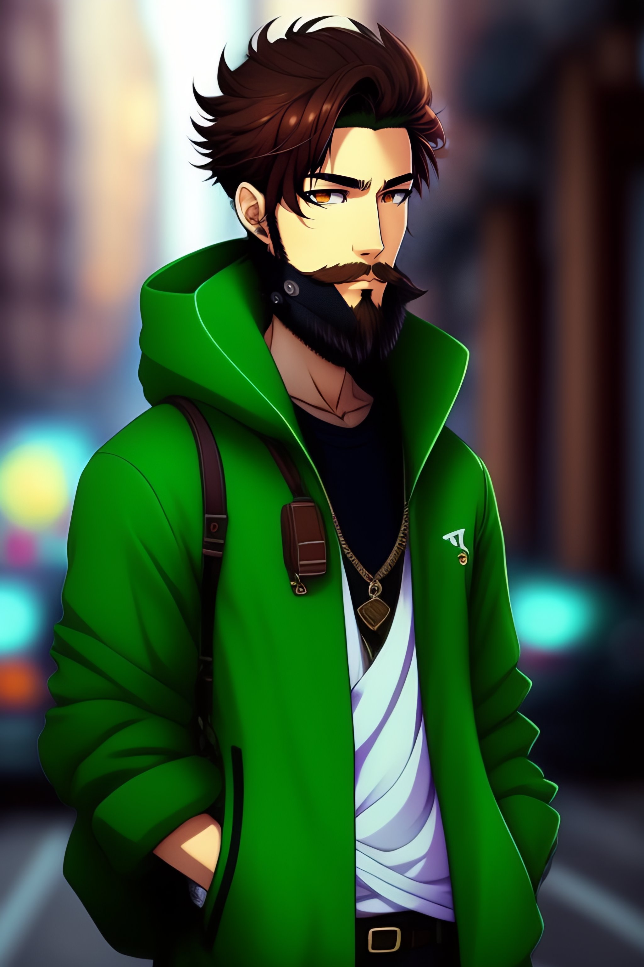 Anime guy, 19 years old, wearing green coat, little bit messy lighter brown hair, long hair, brown full beard, have a beard, full beard, long haied, dark brown eyes, anime style