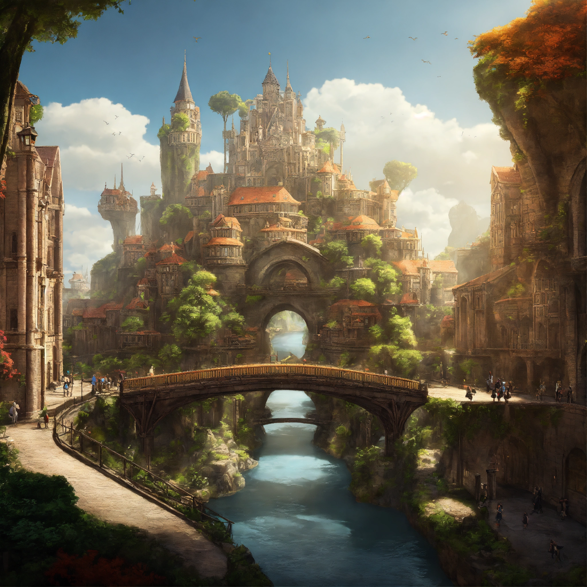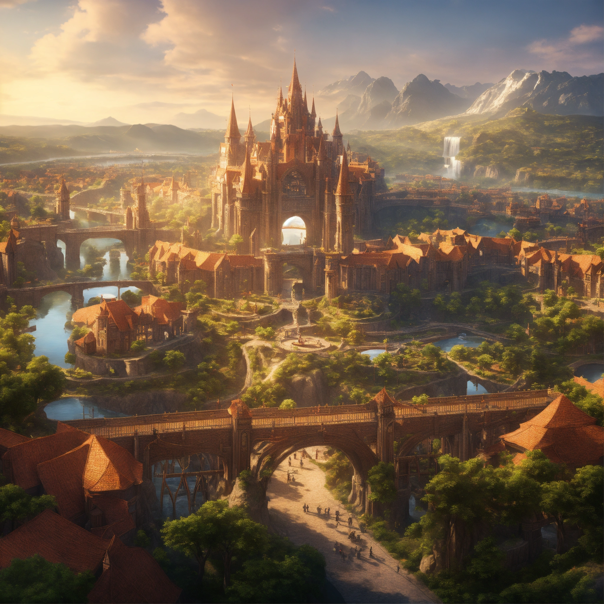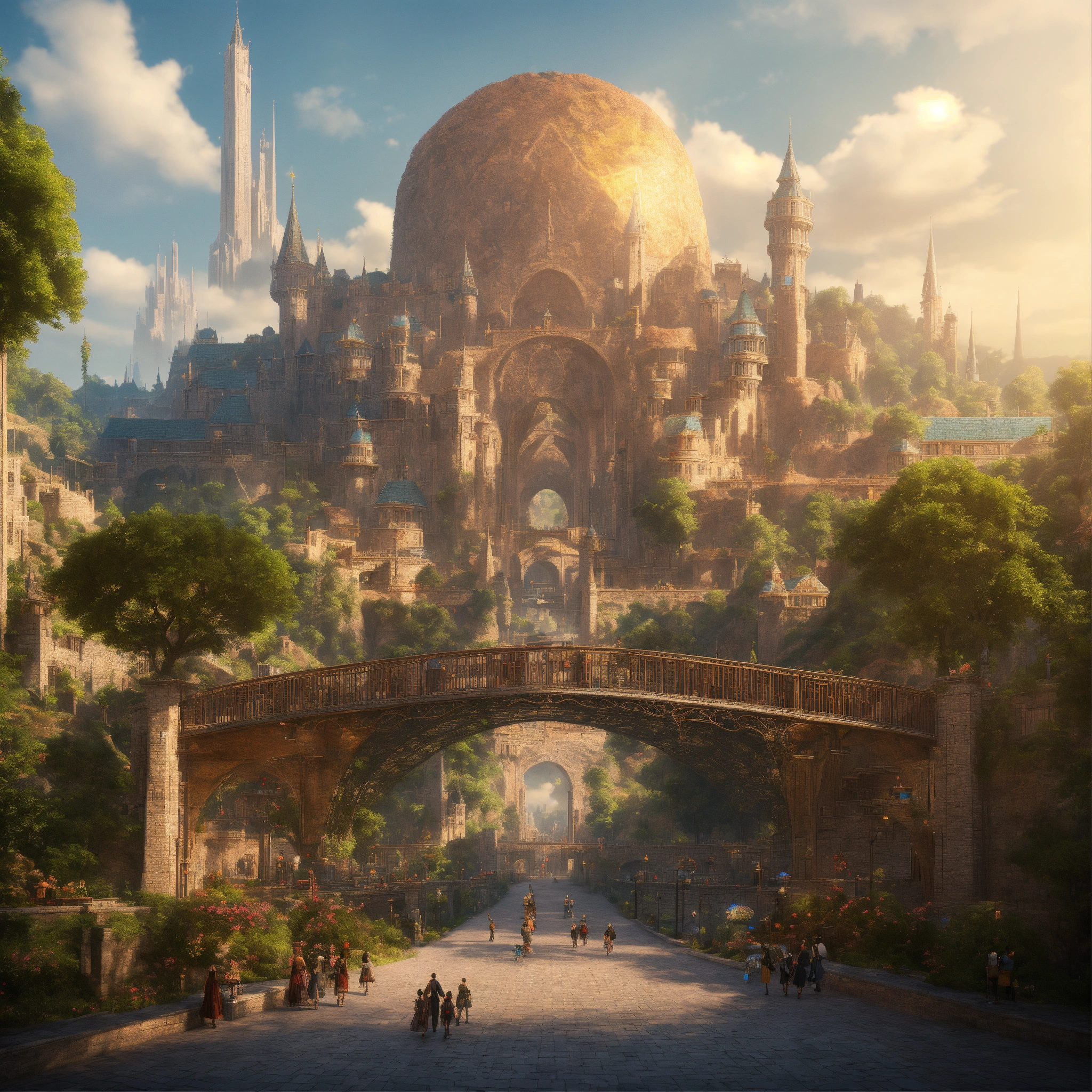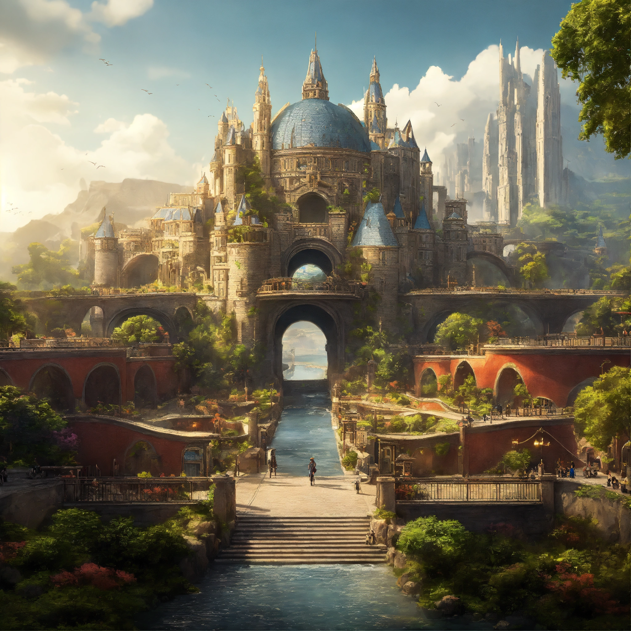 Fantasy city with a colossal academy at the center with a bridge leading up to the entrance