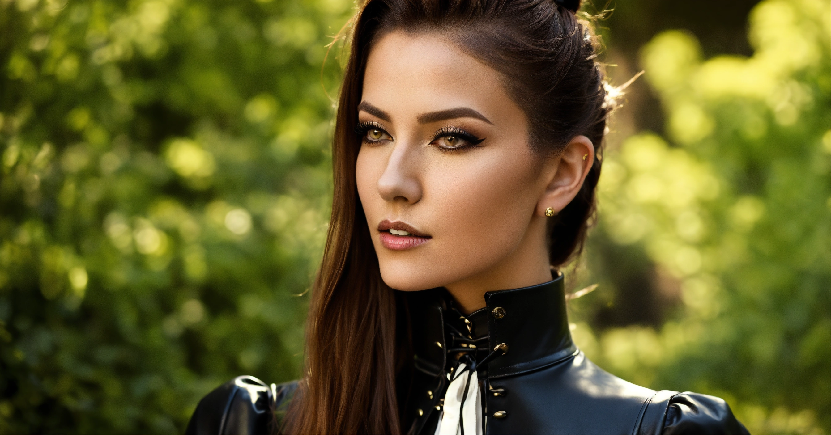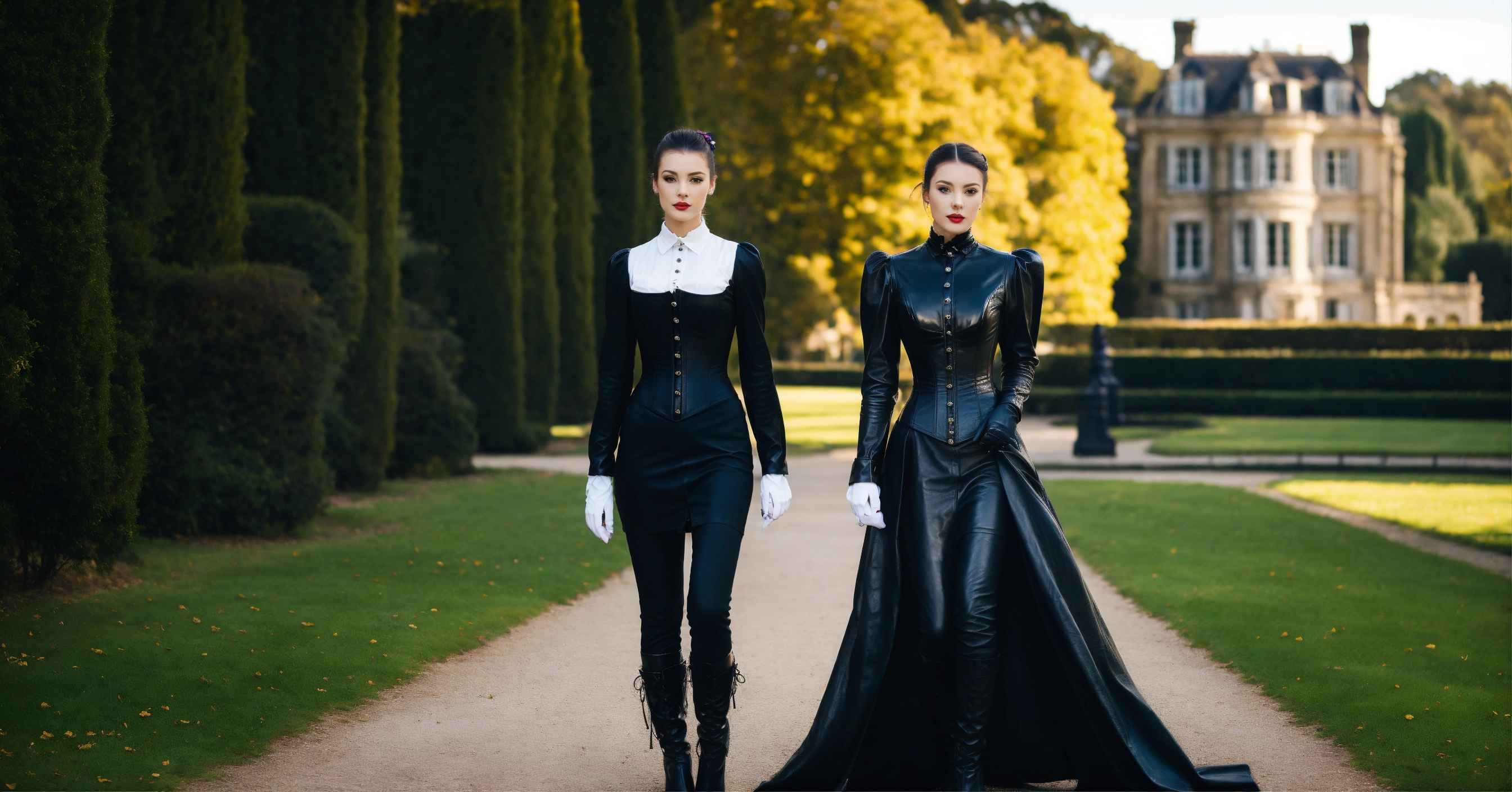 Two stunning french seductress women fashion model, brunette straight high ponytail, black leather corset, long strict victorian governess wide black long leather shirt dress with long big puff sleeves and big buttons, mansion park with sunny daylight, white office shirt collar, leather gloves, eyeliner makeup, black leather boots