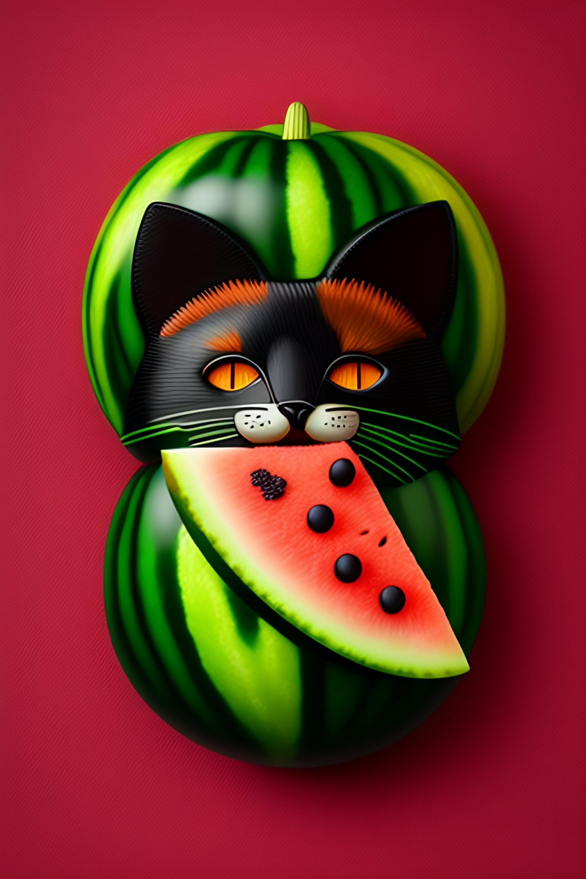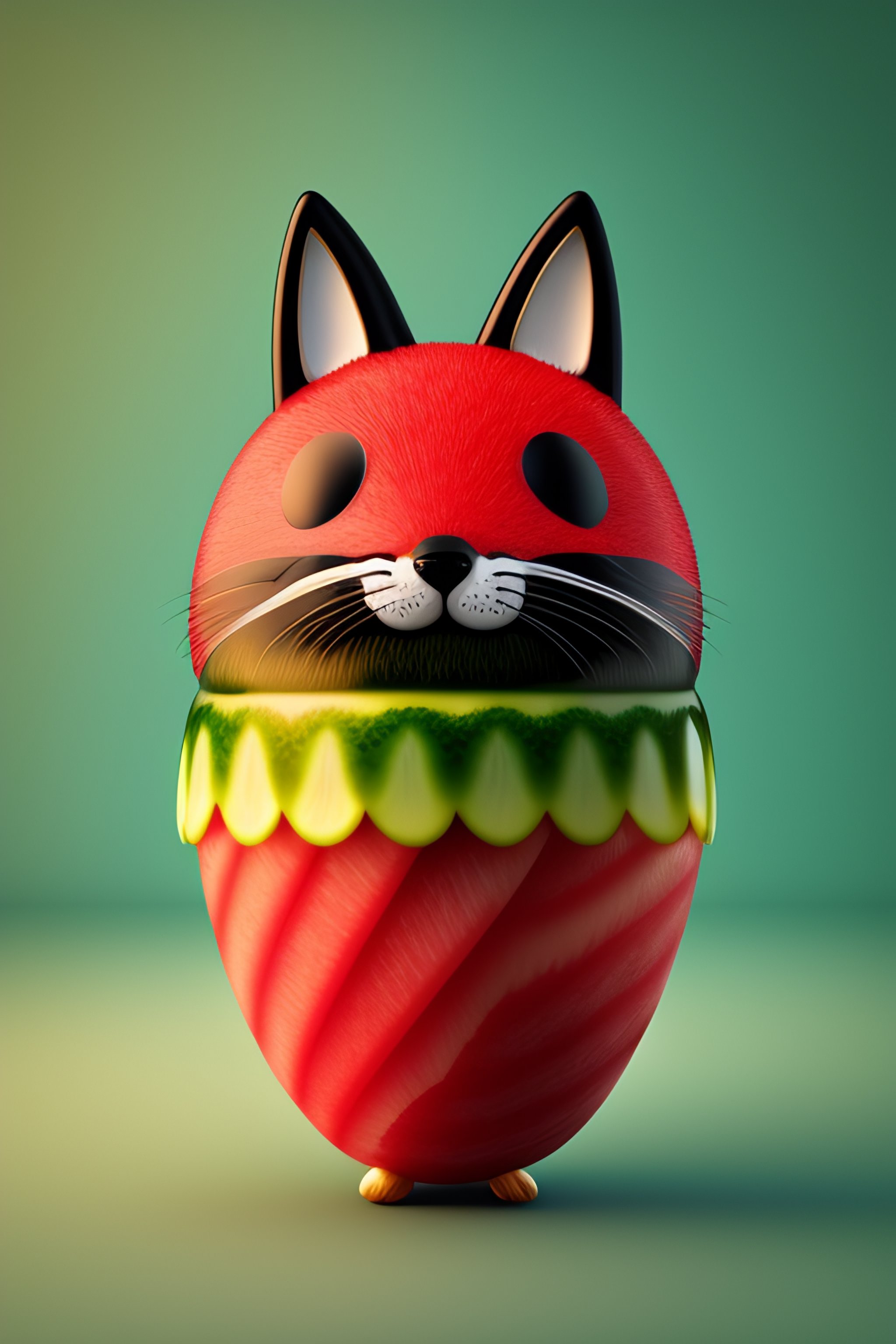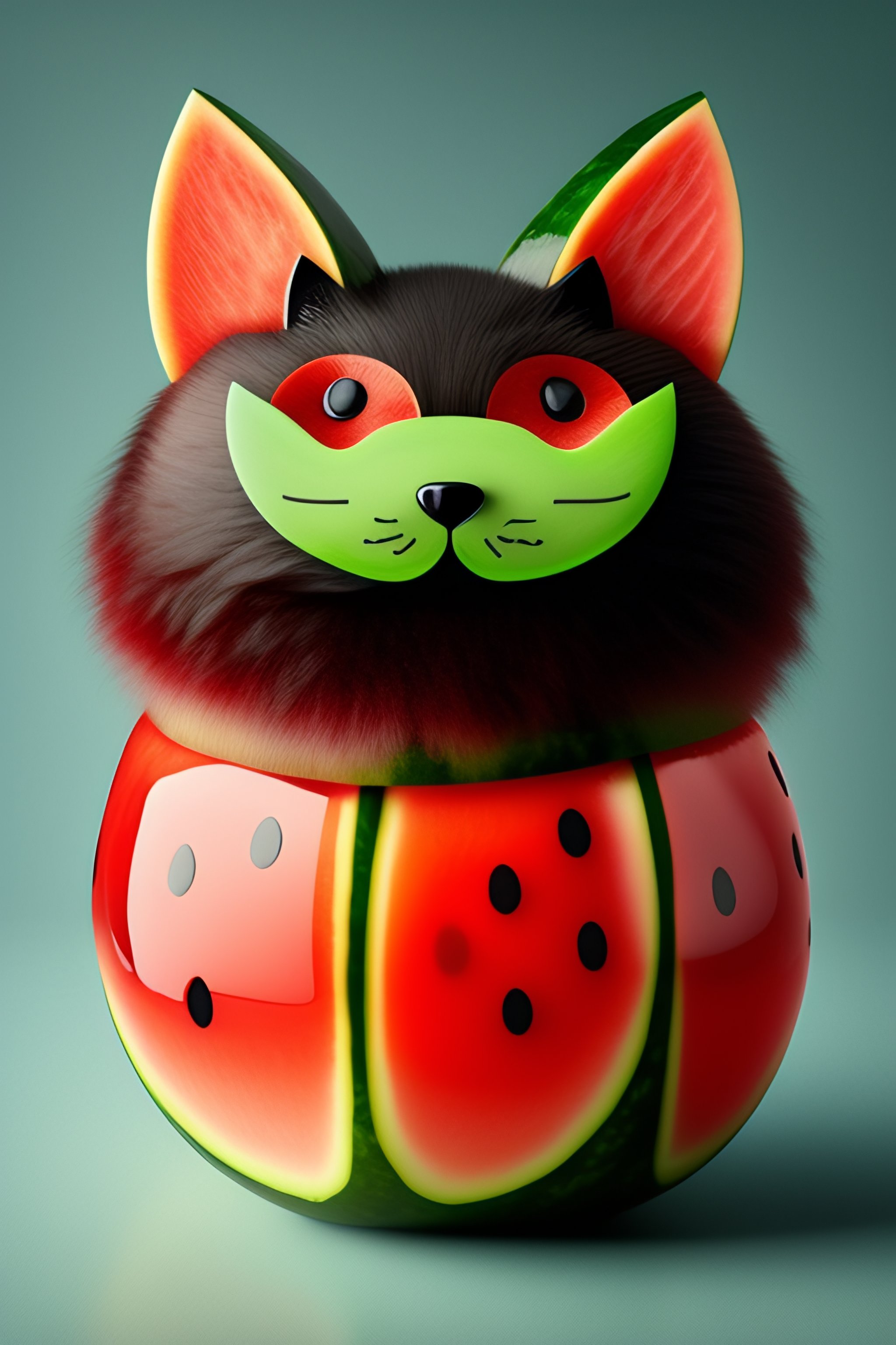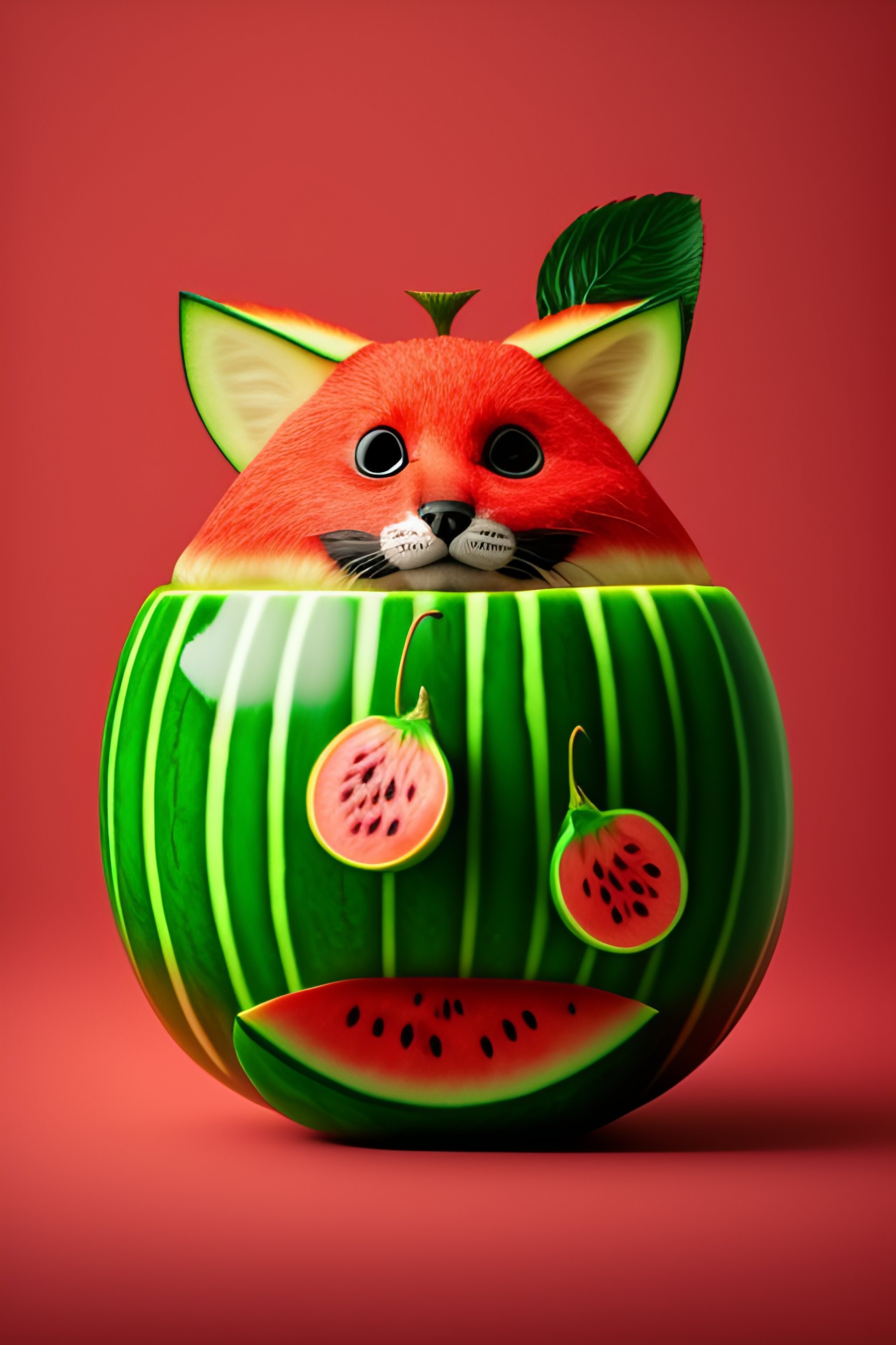 Watermelon with a cat face and a fox tail and spider arms