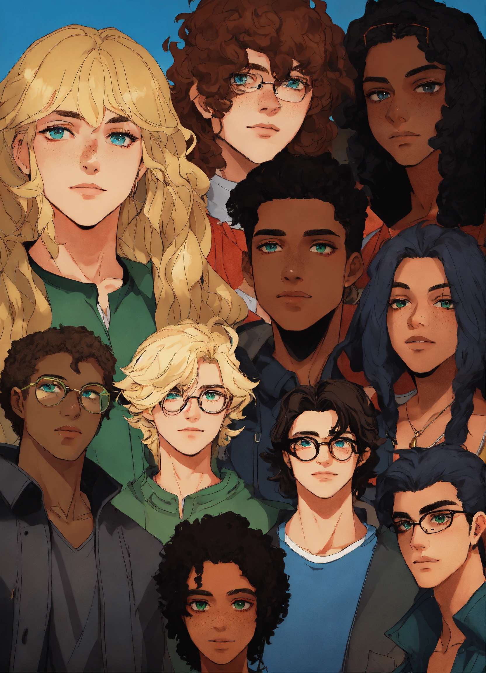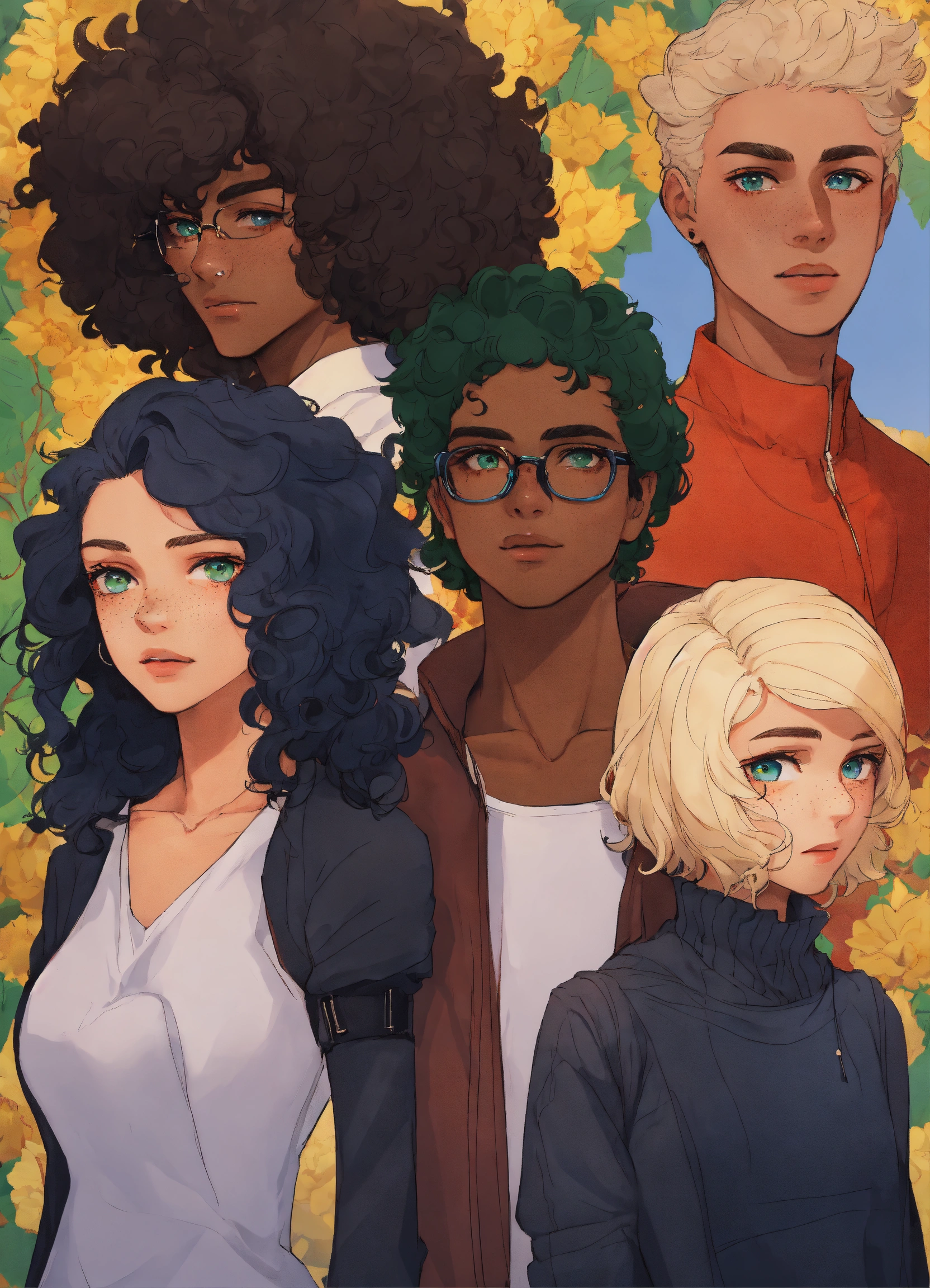 A group of 7 young adults. the first one is an 18-year-old girl with blond long hair, blue eyes and glasses. the second is a 22-year-old man with dark brown hair, grey eyes and late 70s aesthetics. thirs is a black girl with long, dark hair, blue hair strands and bells in her hair, with amber eyes. fourth is an 18-year-old boy with red, curly and short hair and green eyes, latino skin. fifth is a 19-year-old boy with short, black hair and dark blue eyes, aristocrat gothic aesthetics. the sixth is a tall 25-year-old man with dark blond, long, wavy hair, freckles, stublles and green eyes. the seventh is a 25-year-old woman with dark blond, short hair, freckles and green eyes.