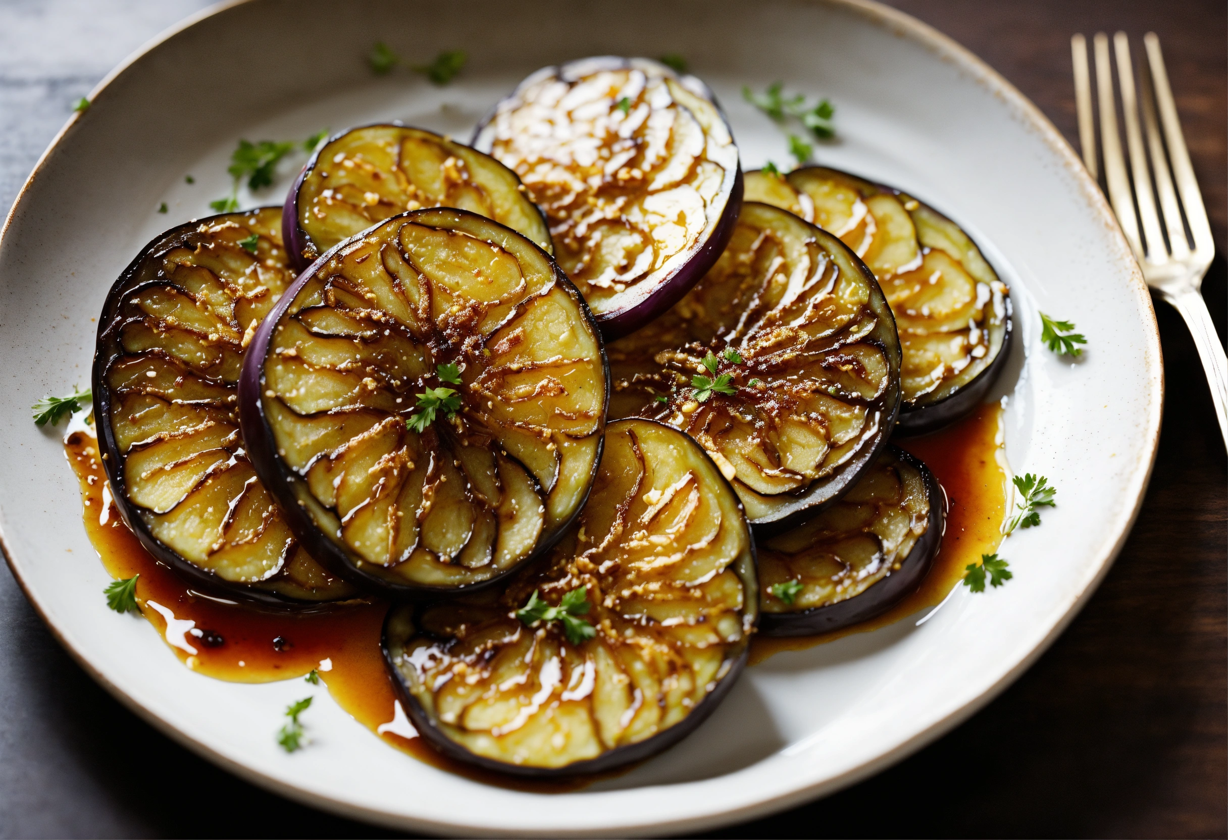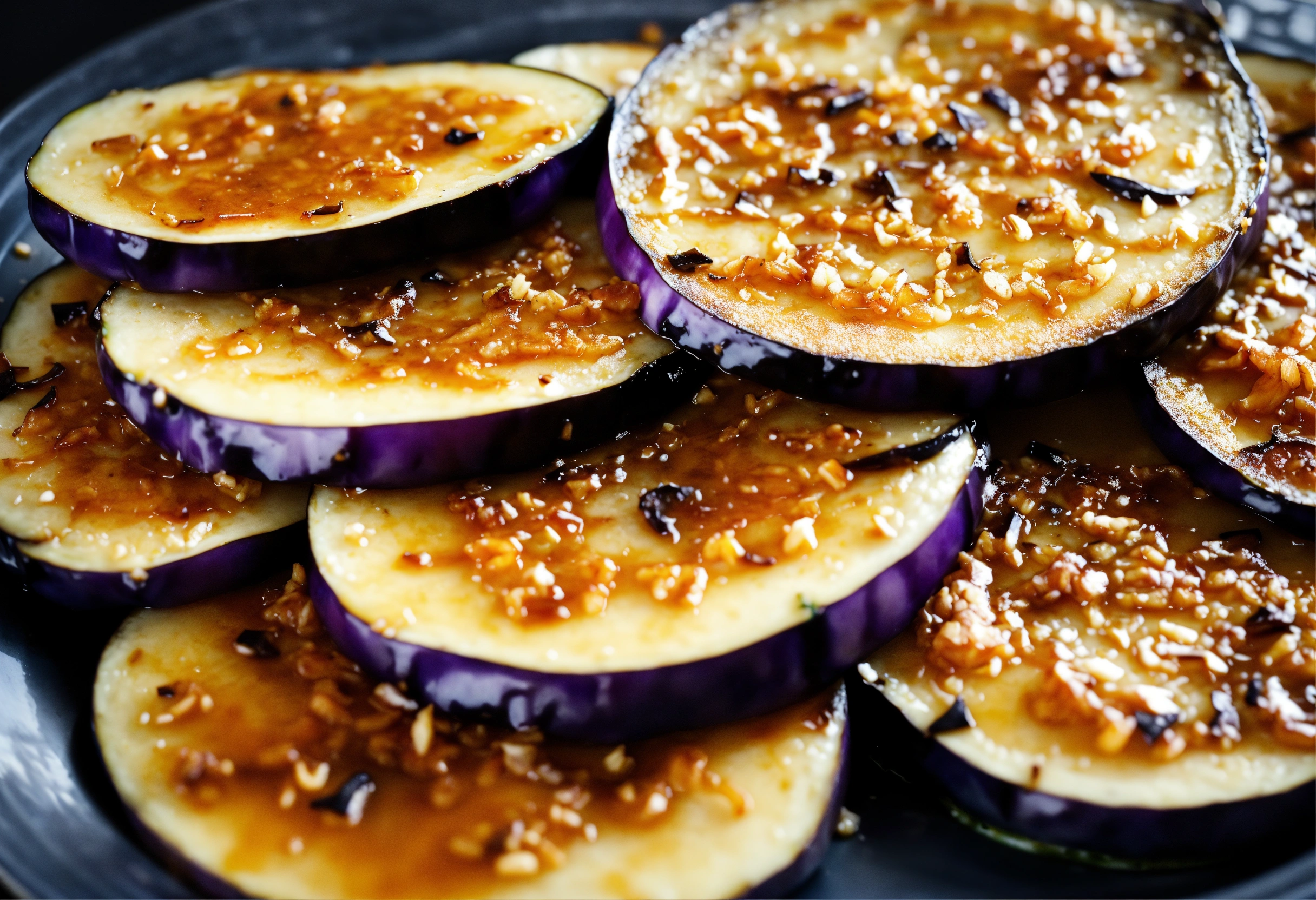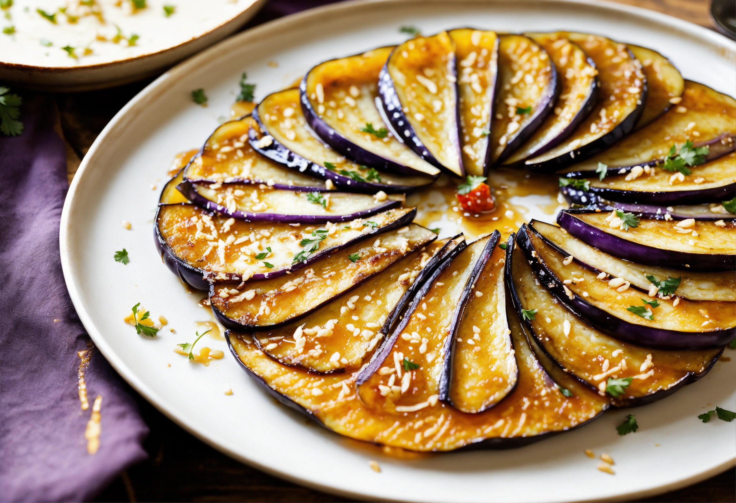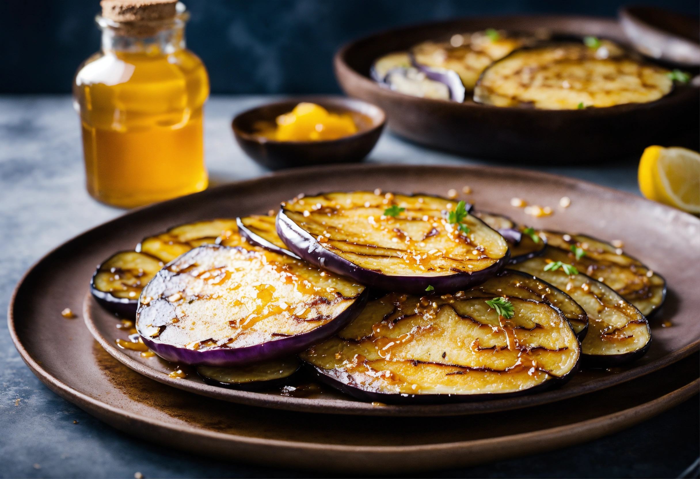 Capture the essence of very thin long slices of eggplant fried drizzled with honey and presented on large rond plate in a single image for our recipe website. show off its golden, lacy texture and the perfect balance. make our readers crave a bite just by looking at your photo. we want to see it in all its mouthwatering glory, ready to inspire cooks and bakers alike. get creative with your composition, lighting, and styling