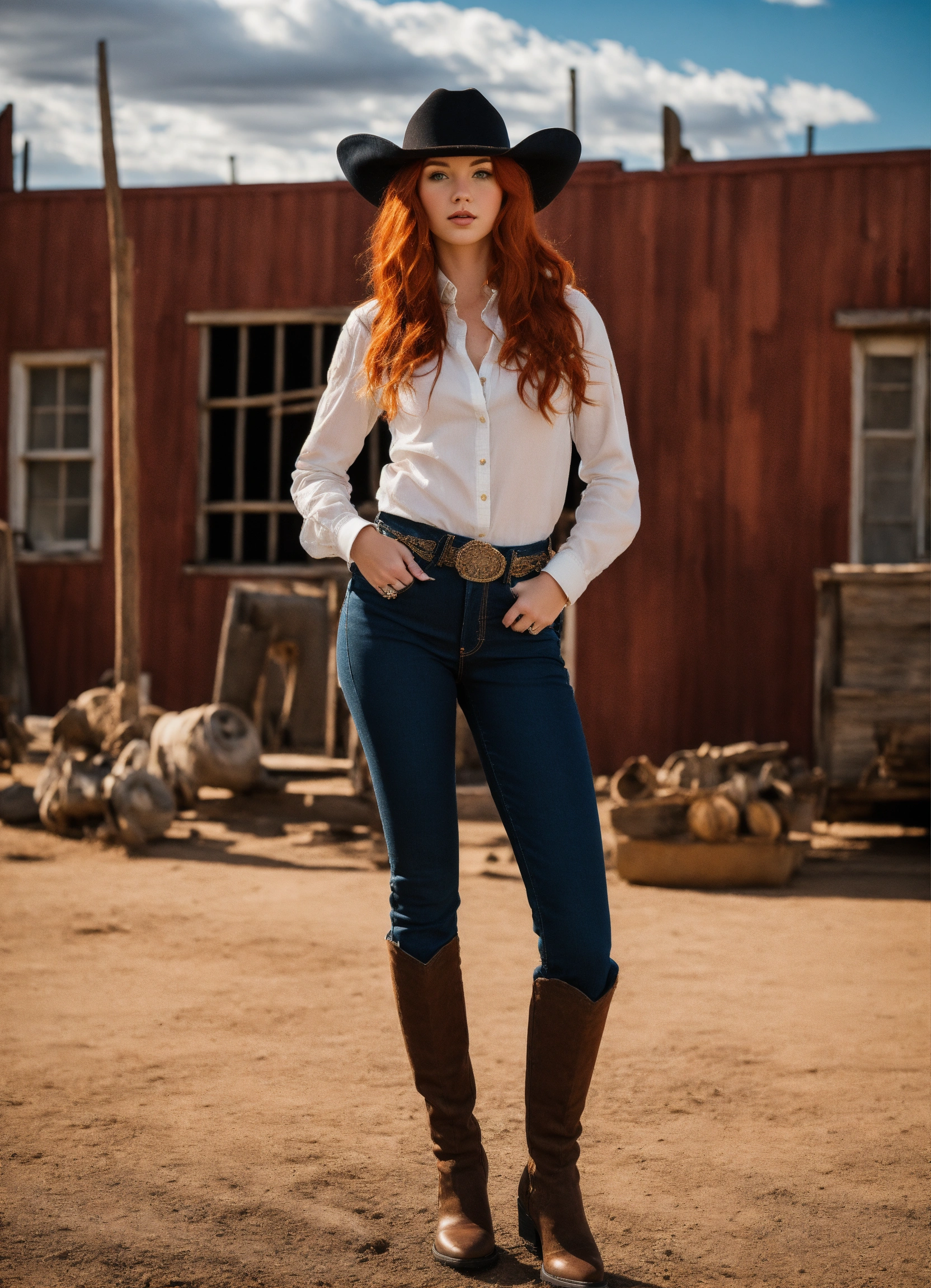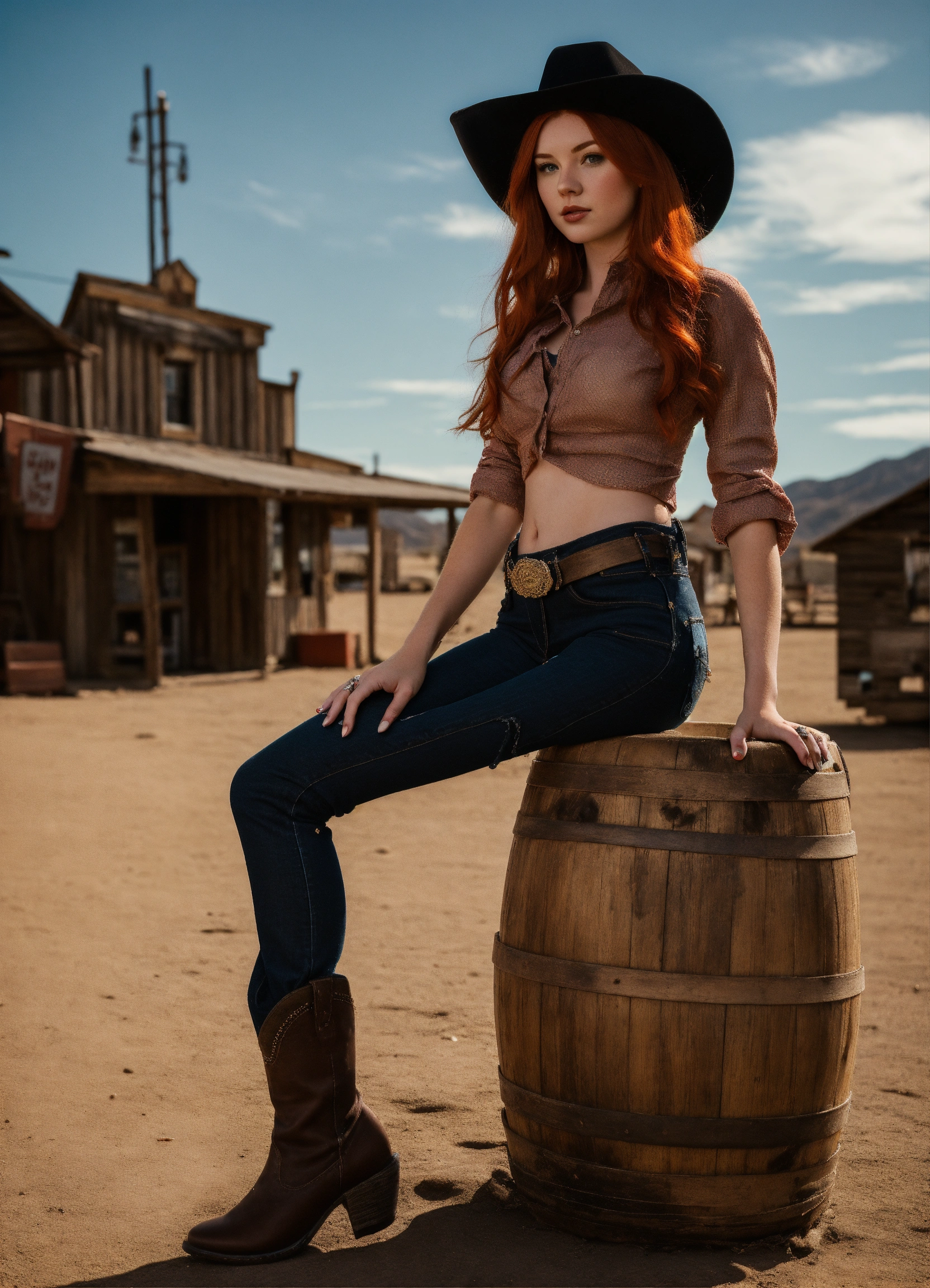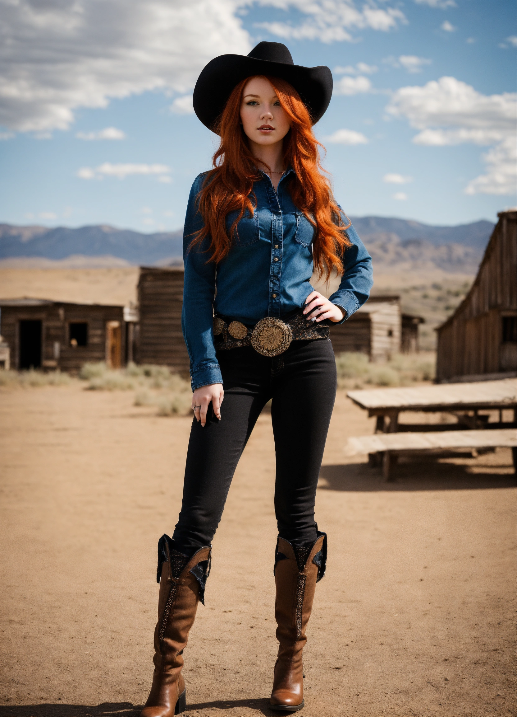 A real photo of a hot 25 year old redhead cowgirl, she is wearing a fishnet and black denim pants, she stands in a very old western alien town