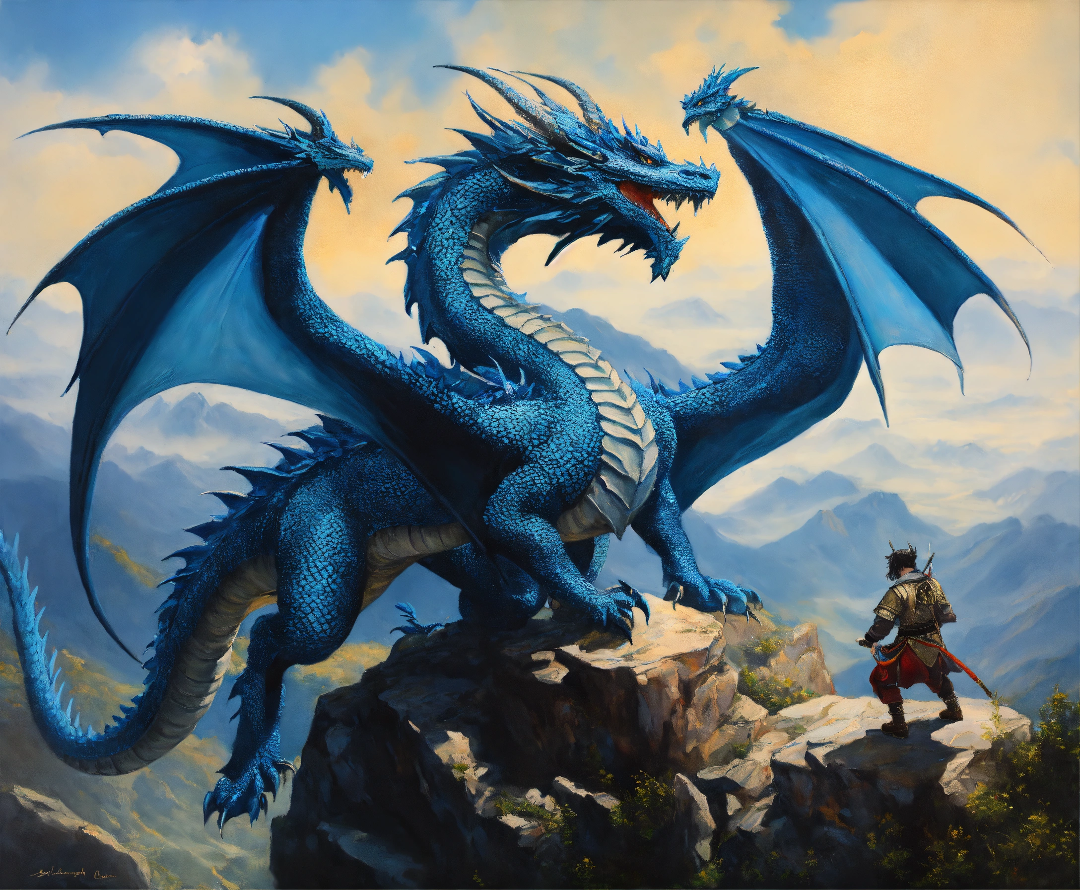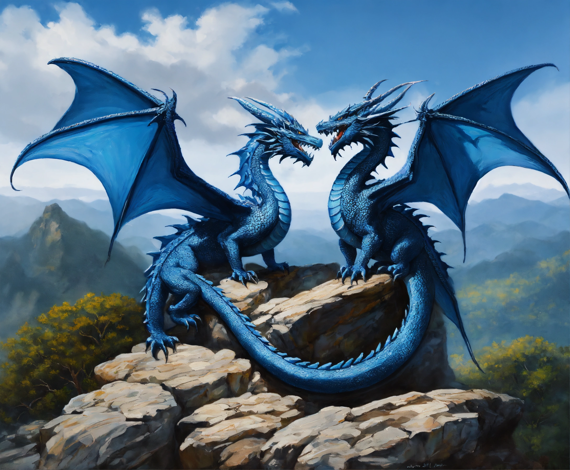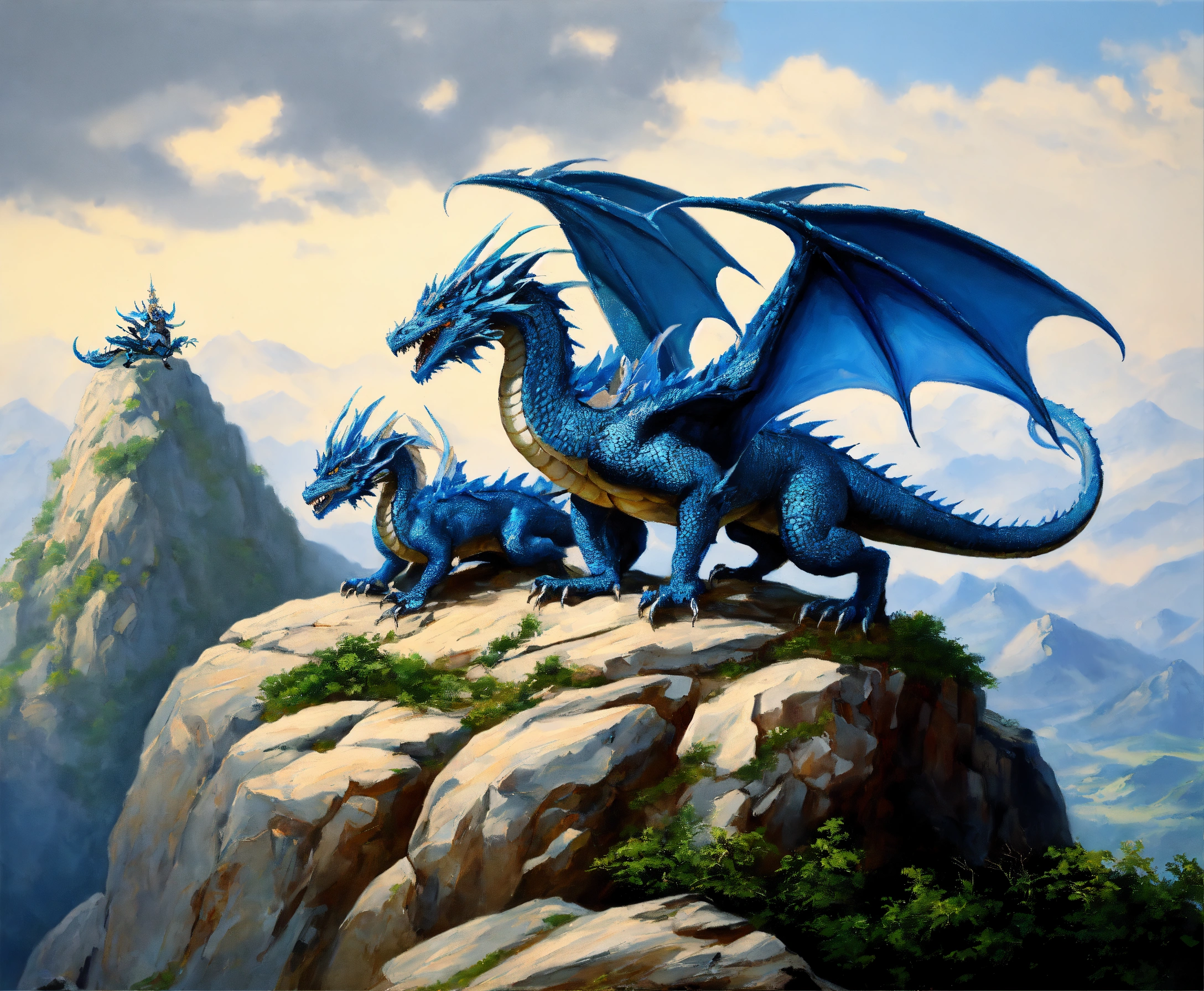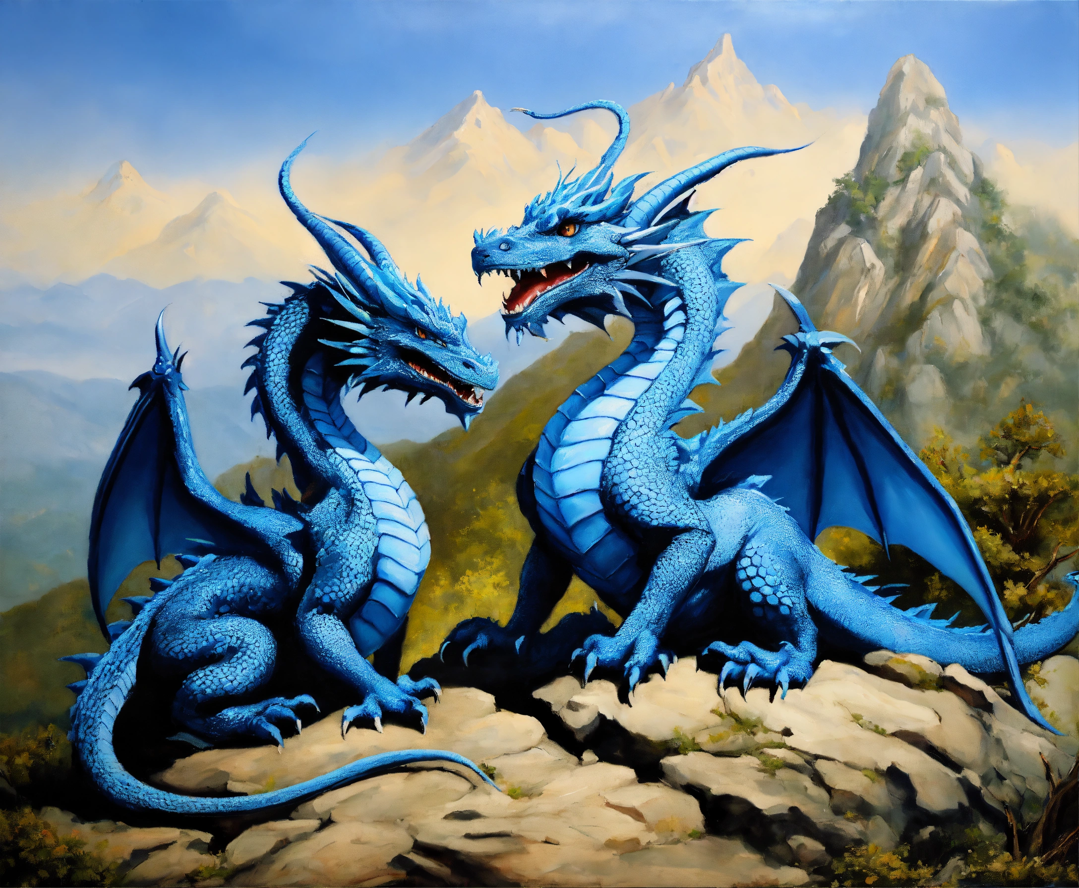 Oil painting of two blue dragons, one dragon is much bigger than the other one, on top of a high mountain, ultra detailled, ultra realistic
