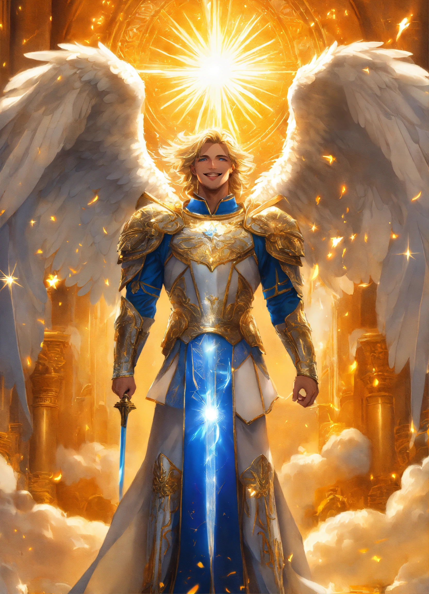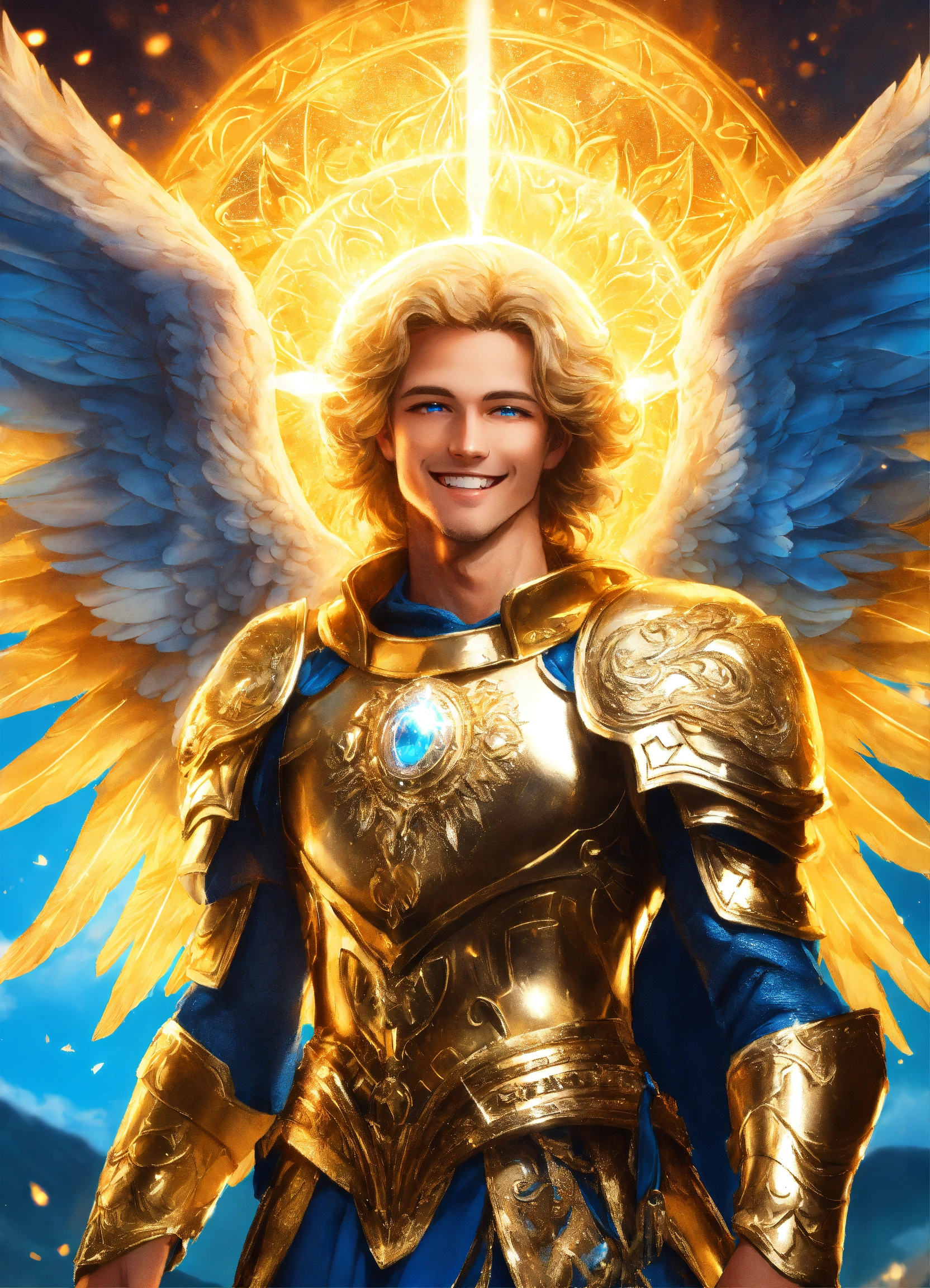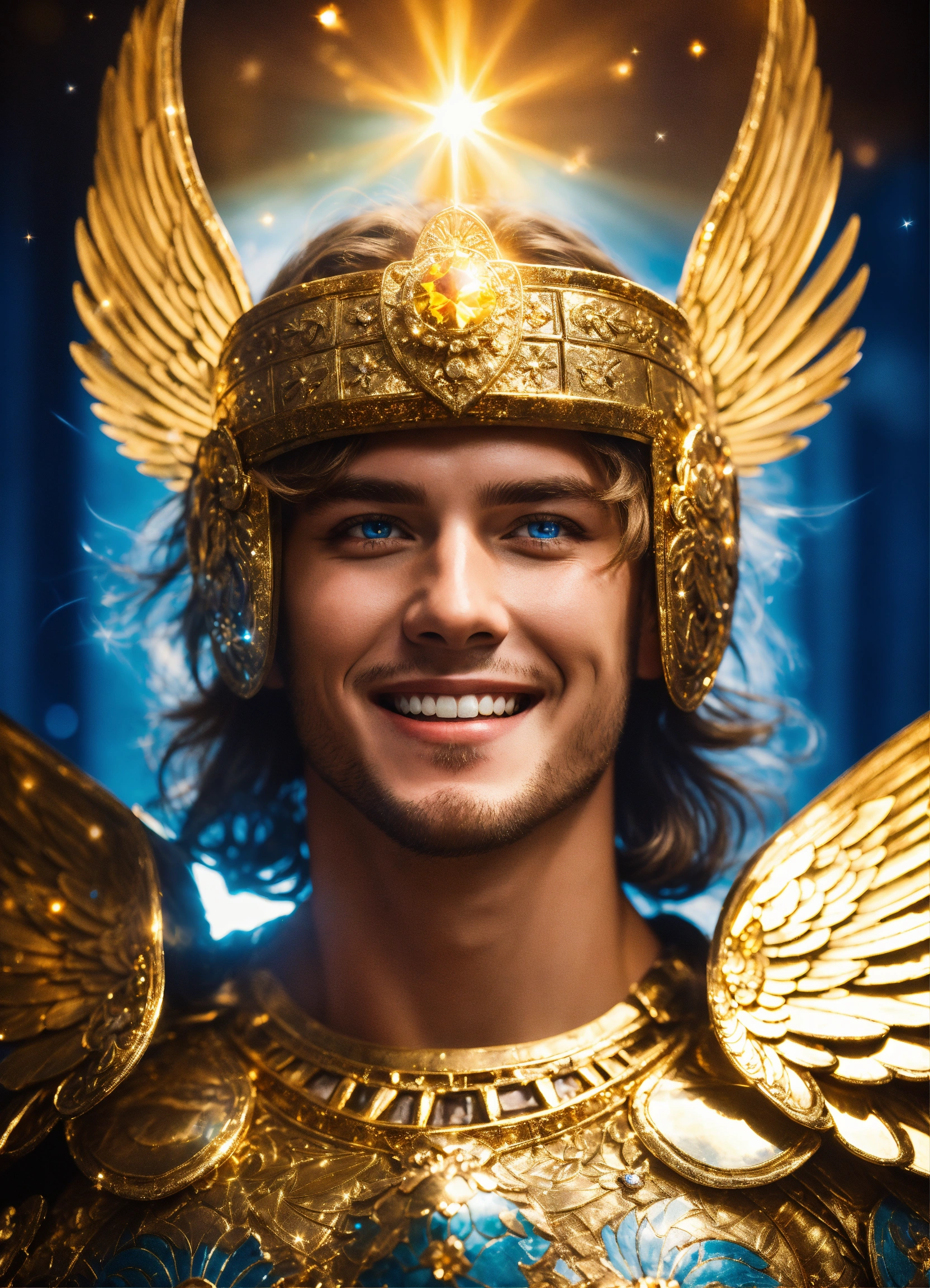 Photograph portrait photo of an archangel with massive full angel wings, a young white powerful warrior male, very handsome, laughing smile with perfect teeth and staring directly forward into camera, beaming with the sun's energy, staring lovingly straight ahead directly into camera at me with glowing bright blue eyes, blond hair, eyes centred directly on me, wearing intricate gold and diamond armour with sun details background is holy spirit explosion of suns and stars and sparkles in bright blue sky.