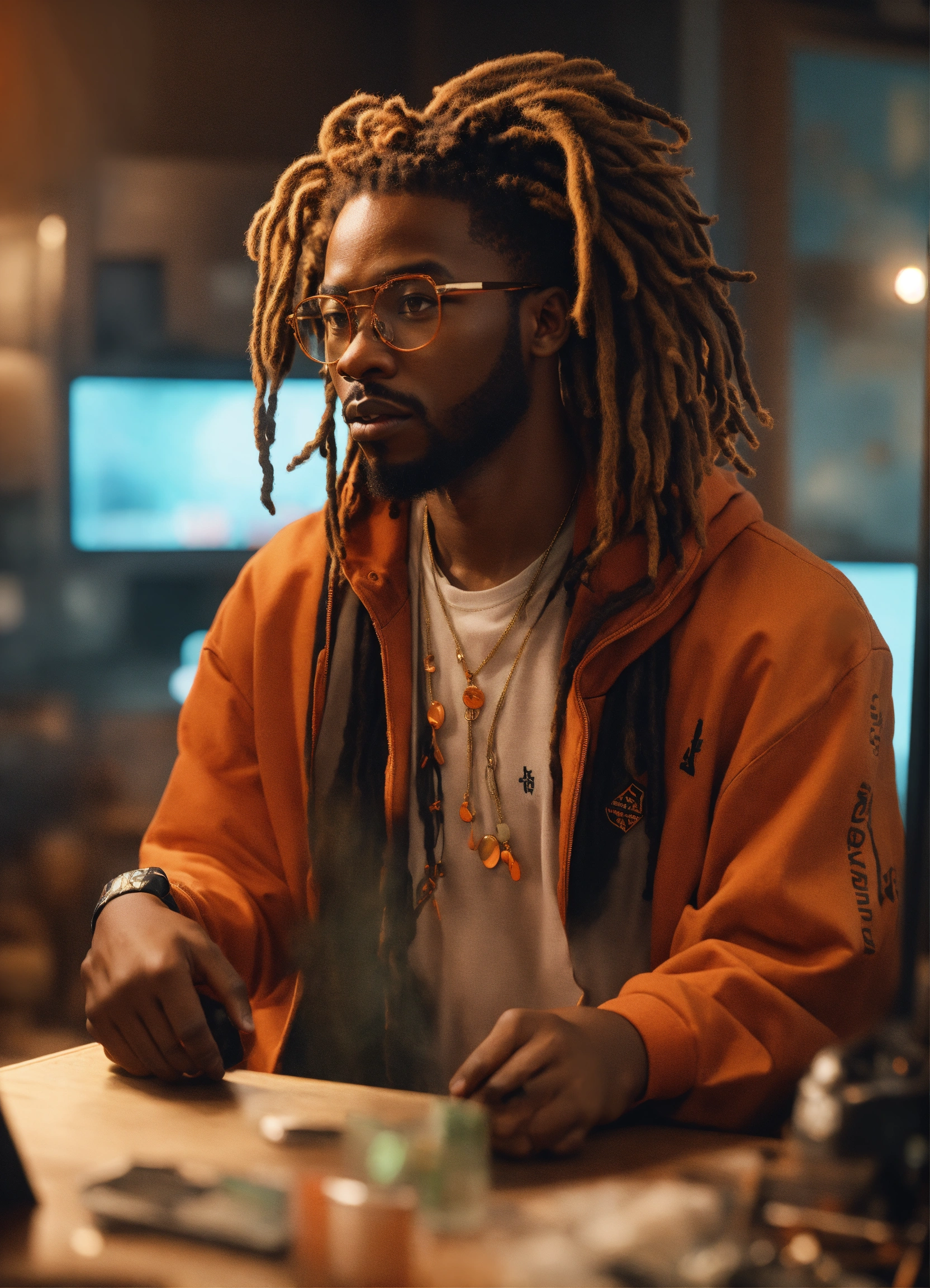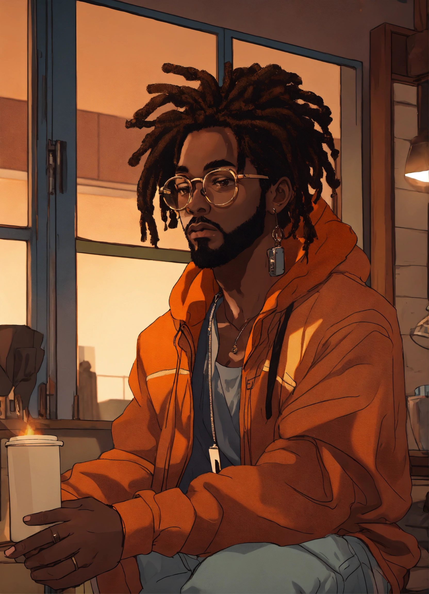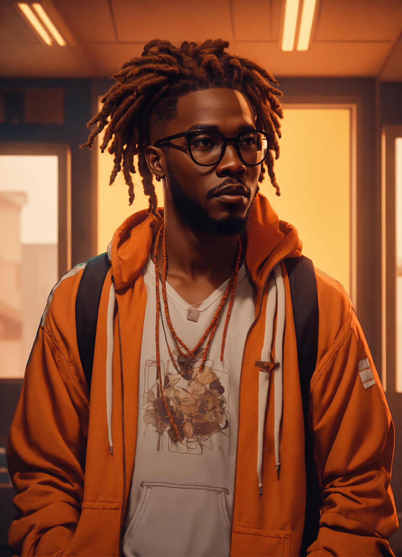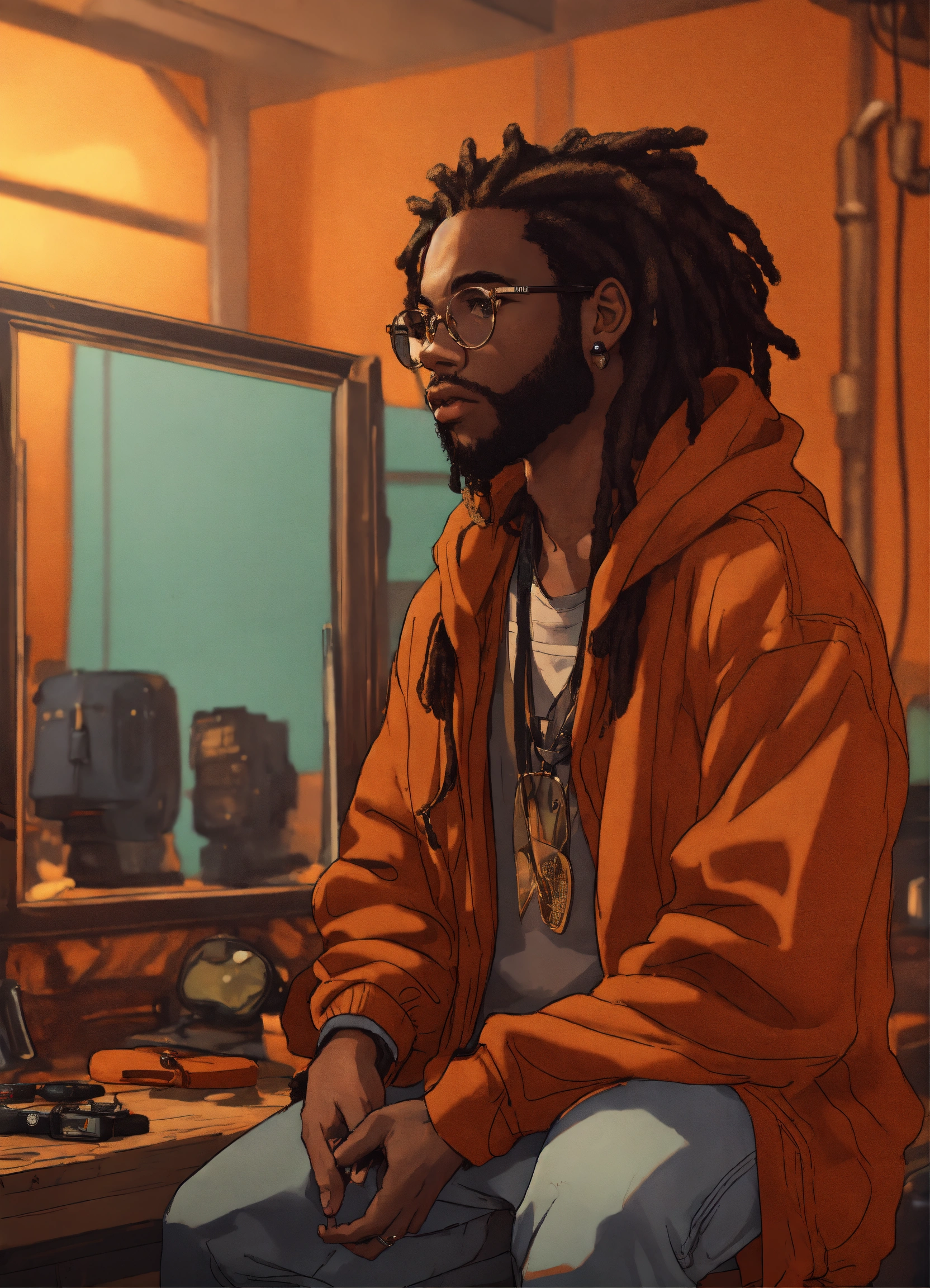 African american man in streetwear, dreadlocks and glasses, talking to himself in a mirror, vintage 90s anime, 4k resolution, unreal 5 engine render, burnt orange and neutral colors