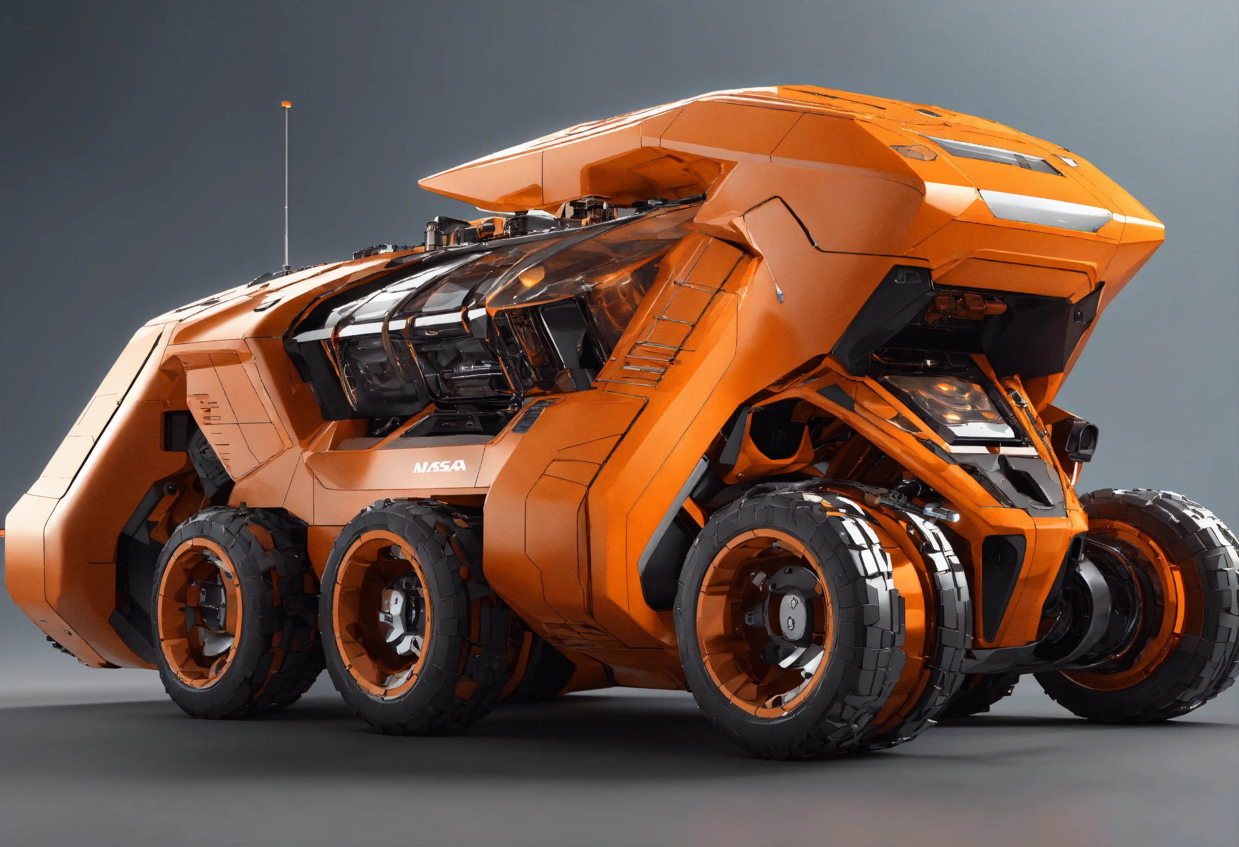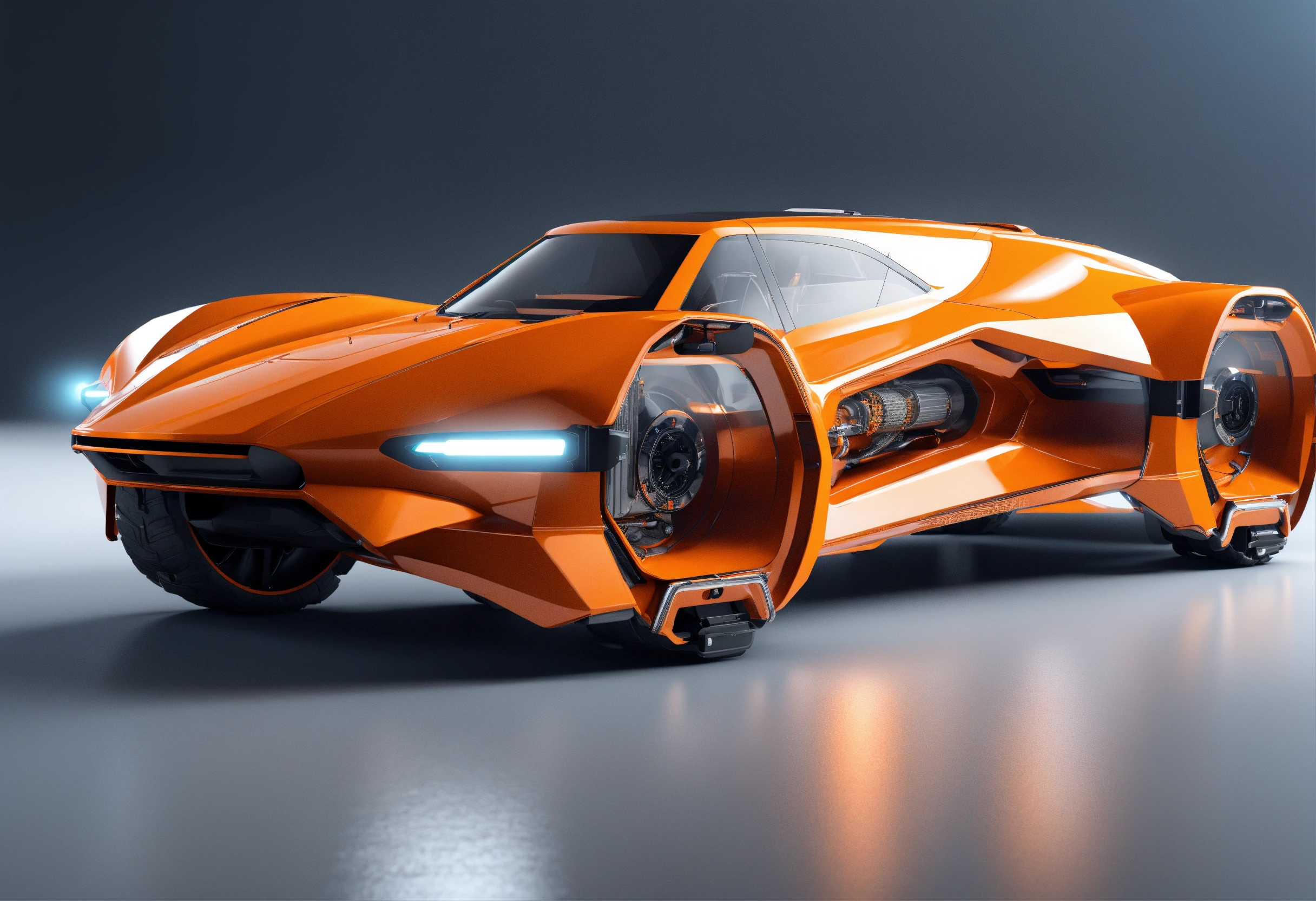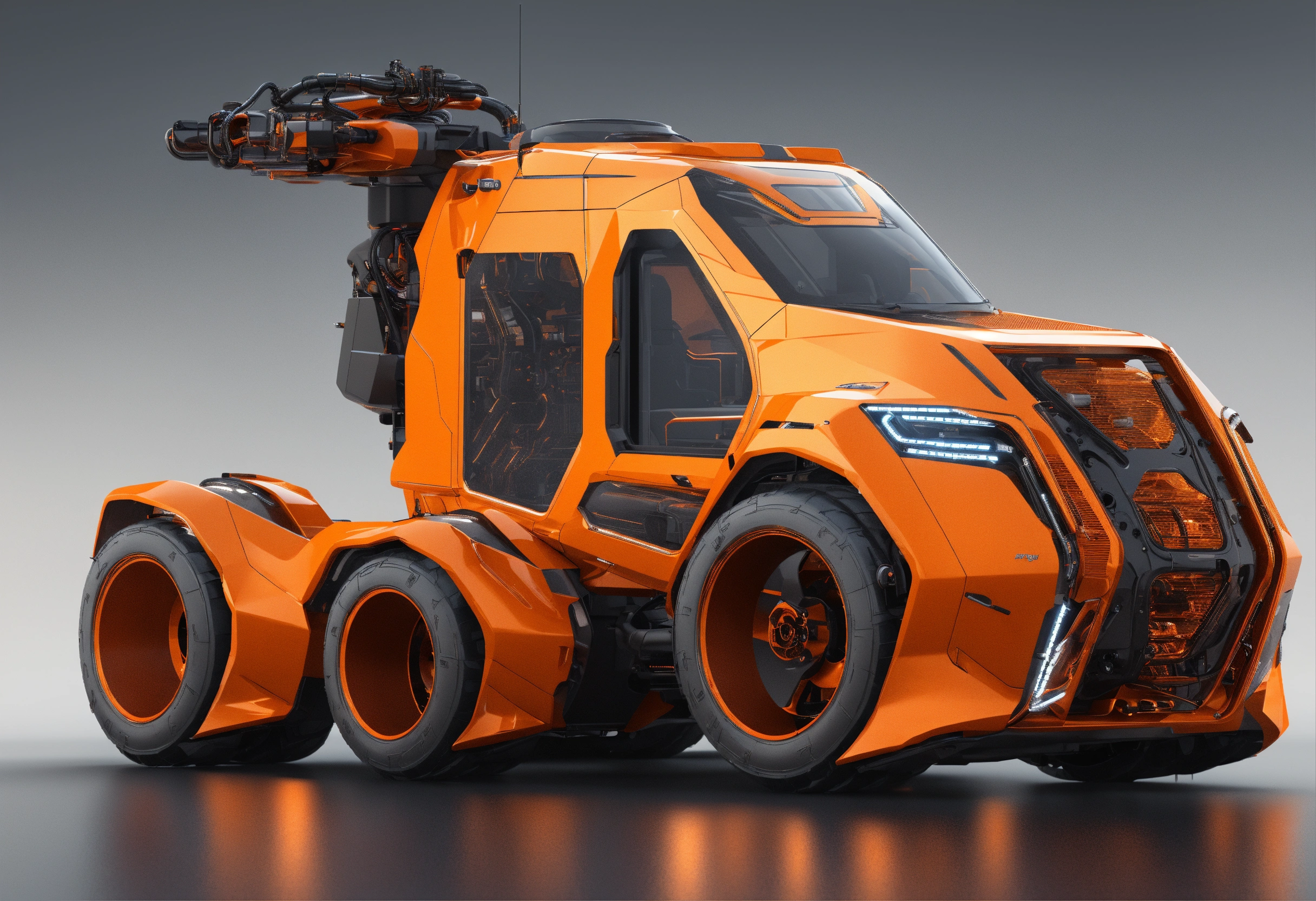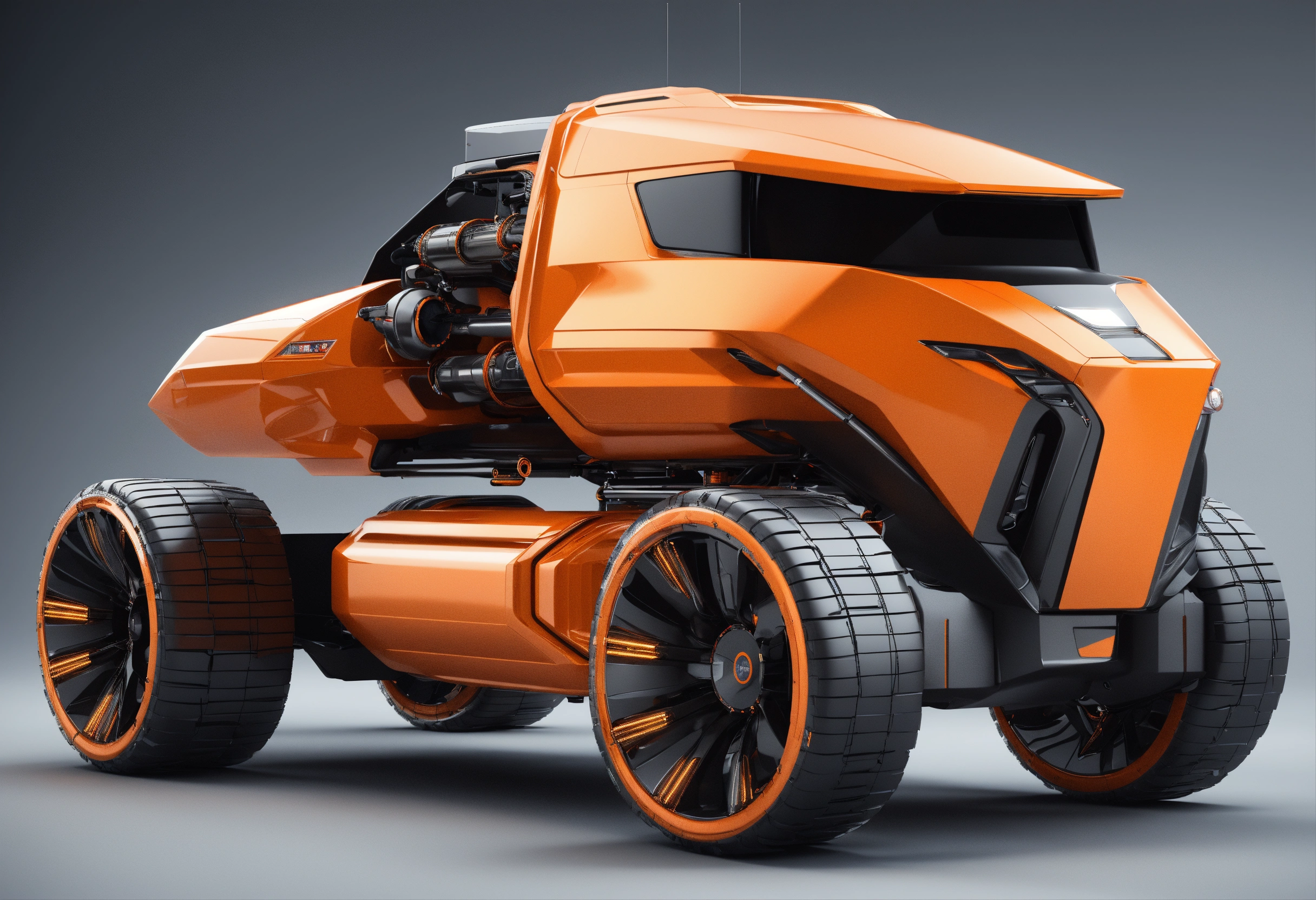 Side view orange color, six wheels futuristic truck design, white isolated background, intrigately complex ultra detailed pipe plug cables, holes, lights buttons mechanical parts clean design blade runner nasa space wehicle style car design 3d modeling octane render high detailed unreal engine sharp edges but to be in motions speed, fast