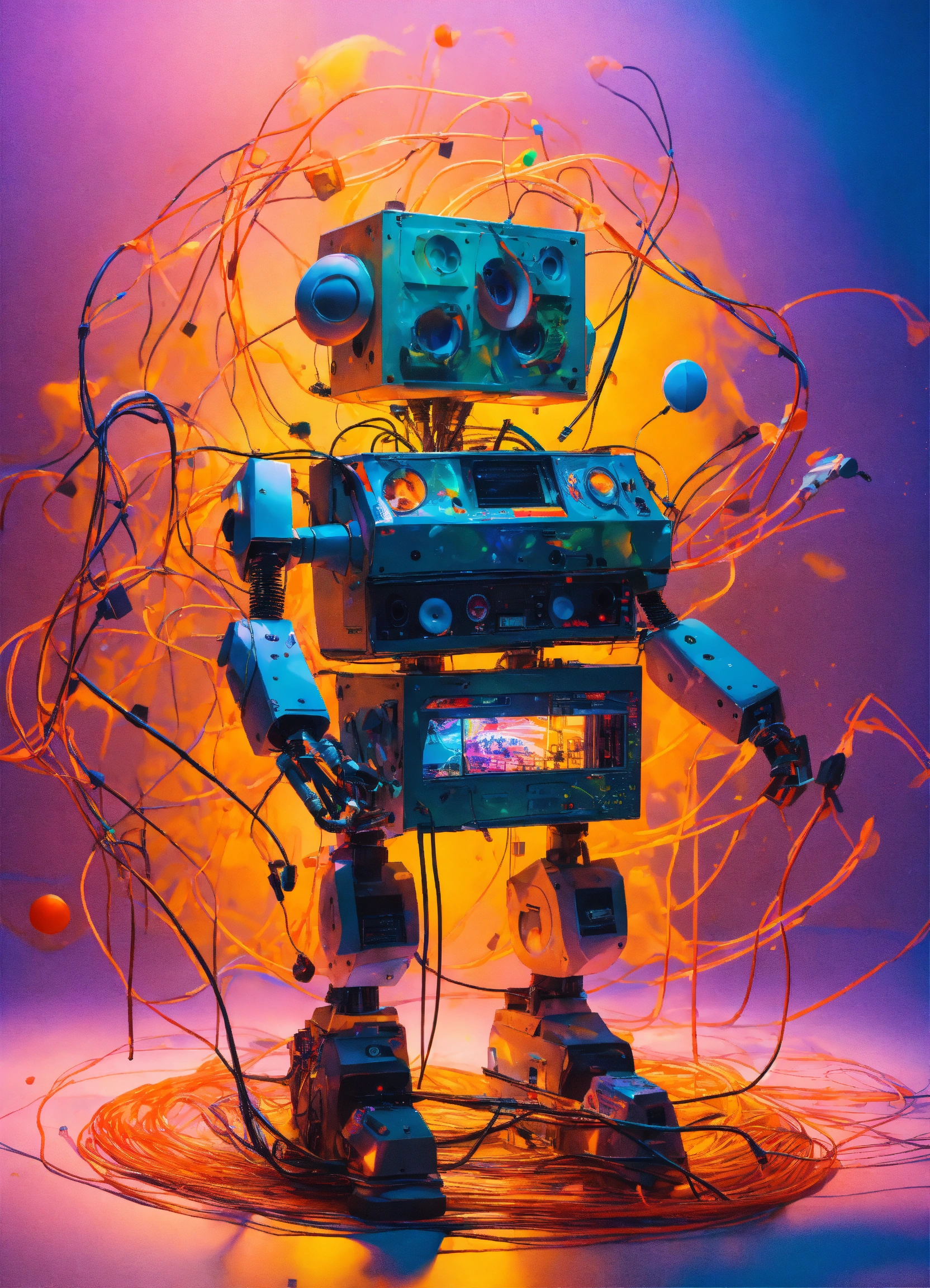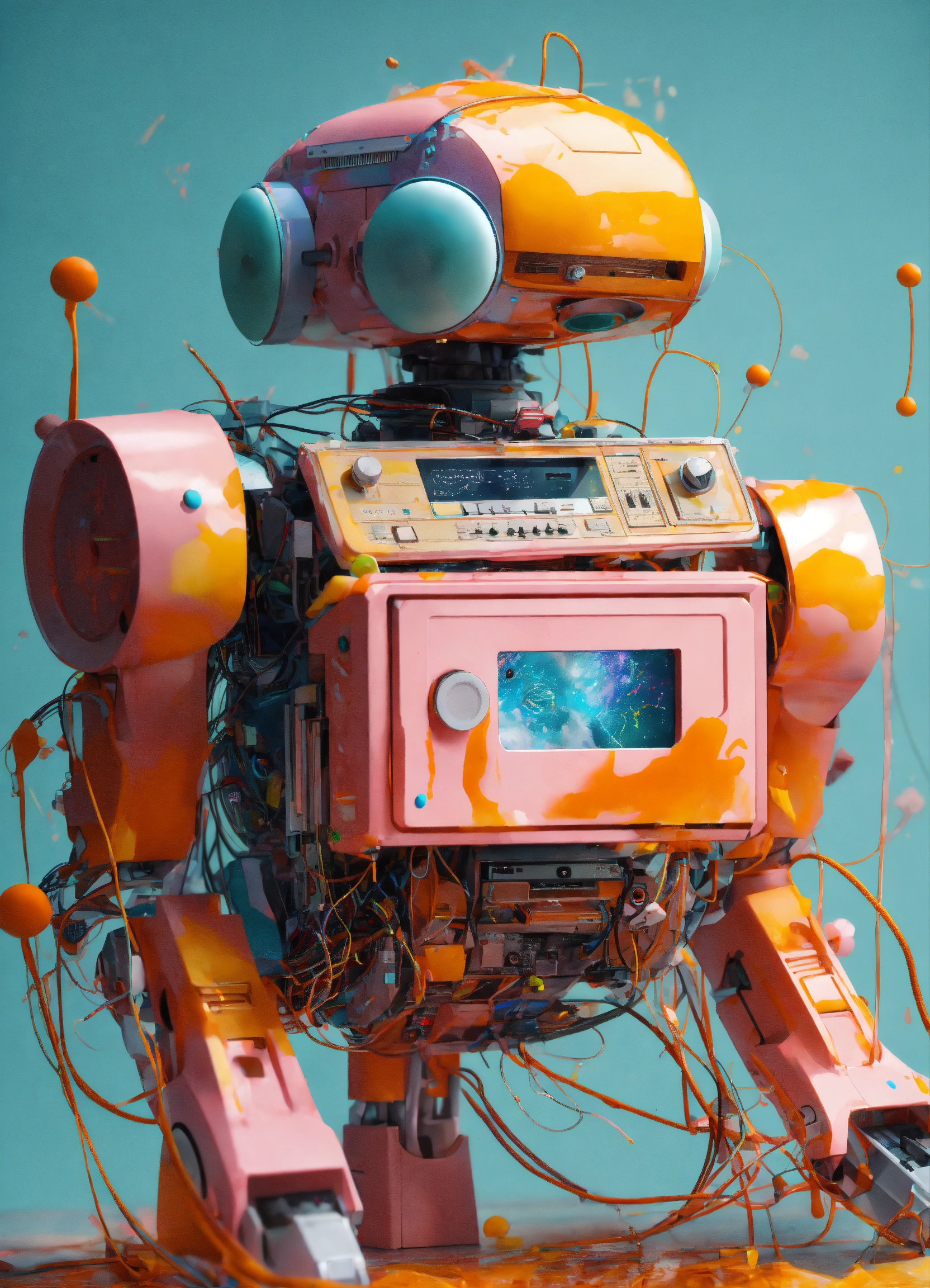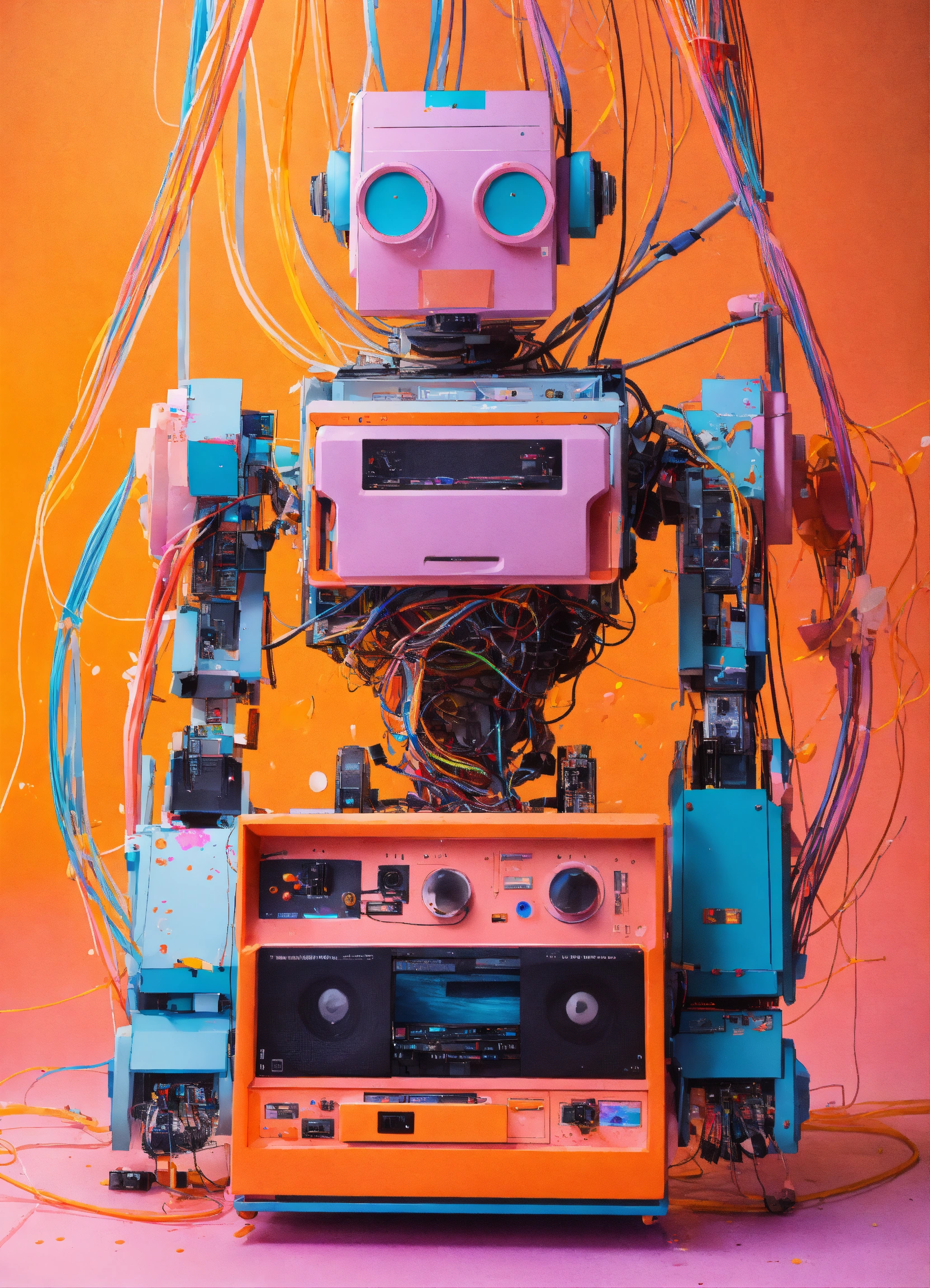 Pastel colors low-angle view shot photography of a robot body emerged from spiral orange ink splatters, flying huge 3d plexiglass multi cassette ghetto blaster, play station, screeen computer, full of cables and wires, with big boomers, 80 degree view