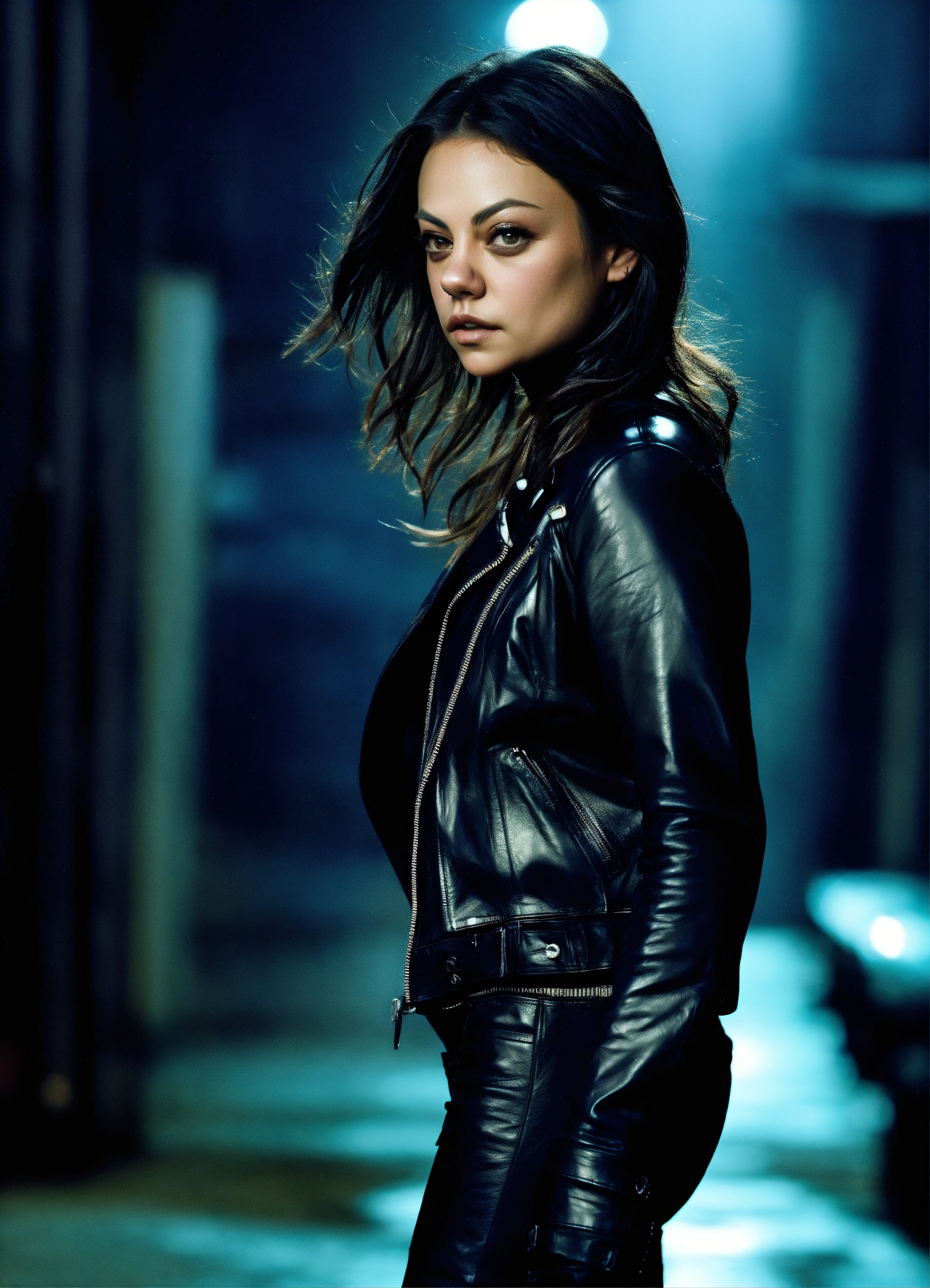 Mila kunis gothic walking in a dark alley wearing black leather pants black leather jackets gloves spikes, hyper-realistic, photographic portrait at night