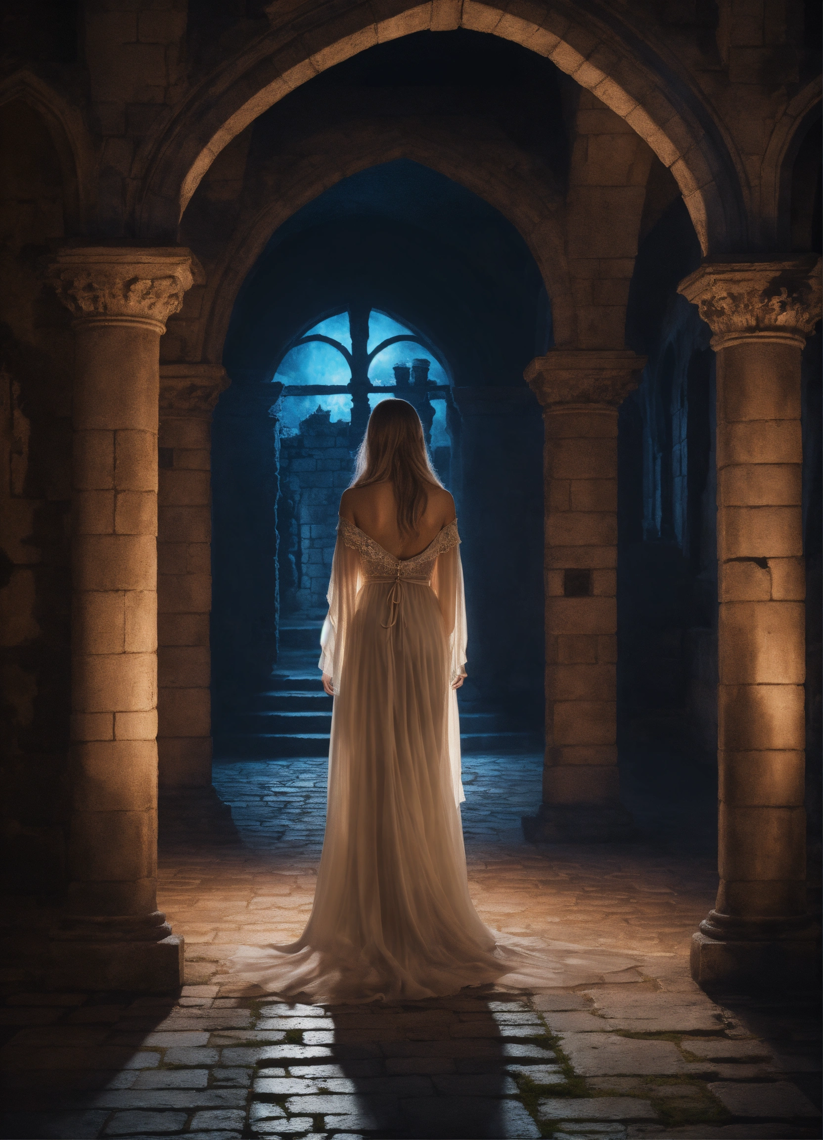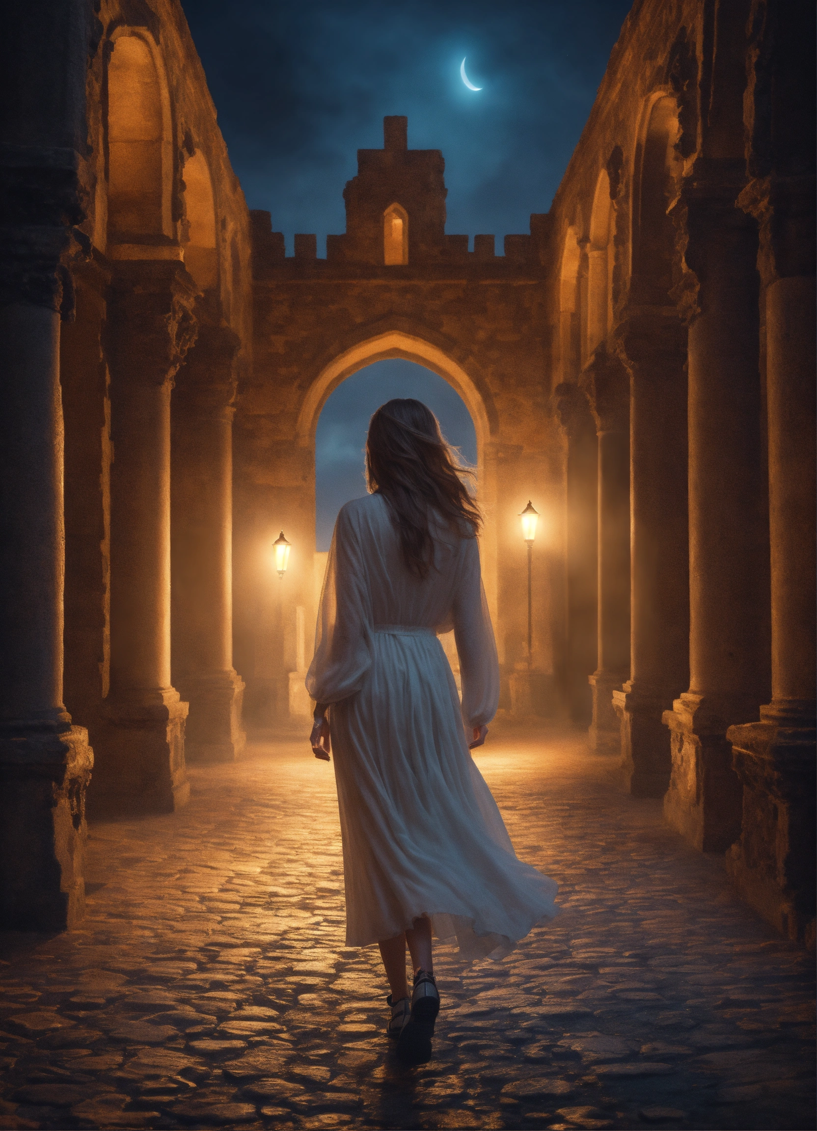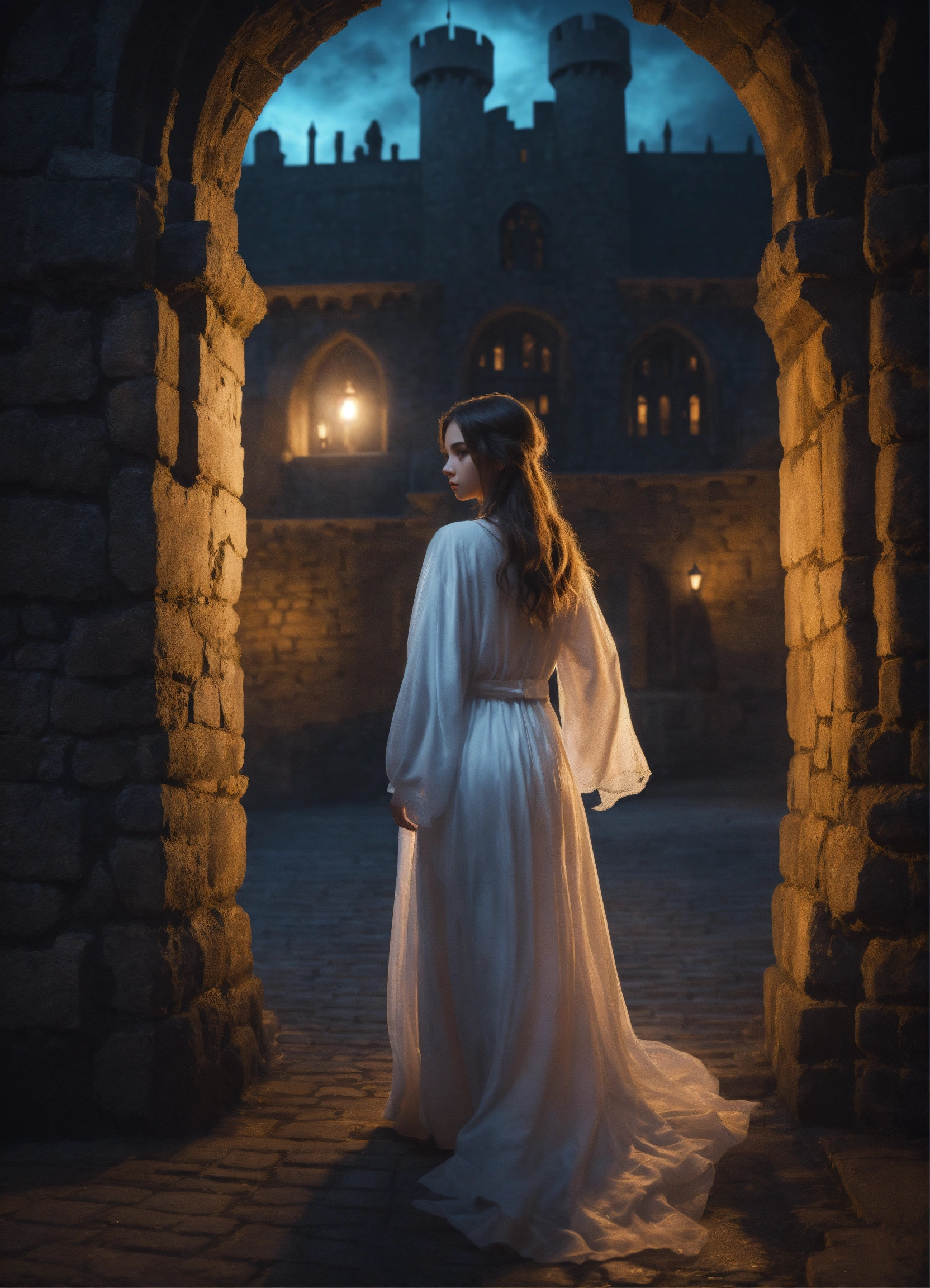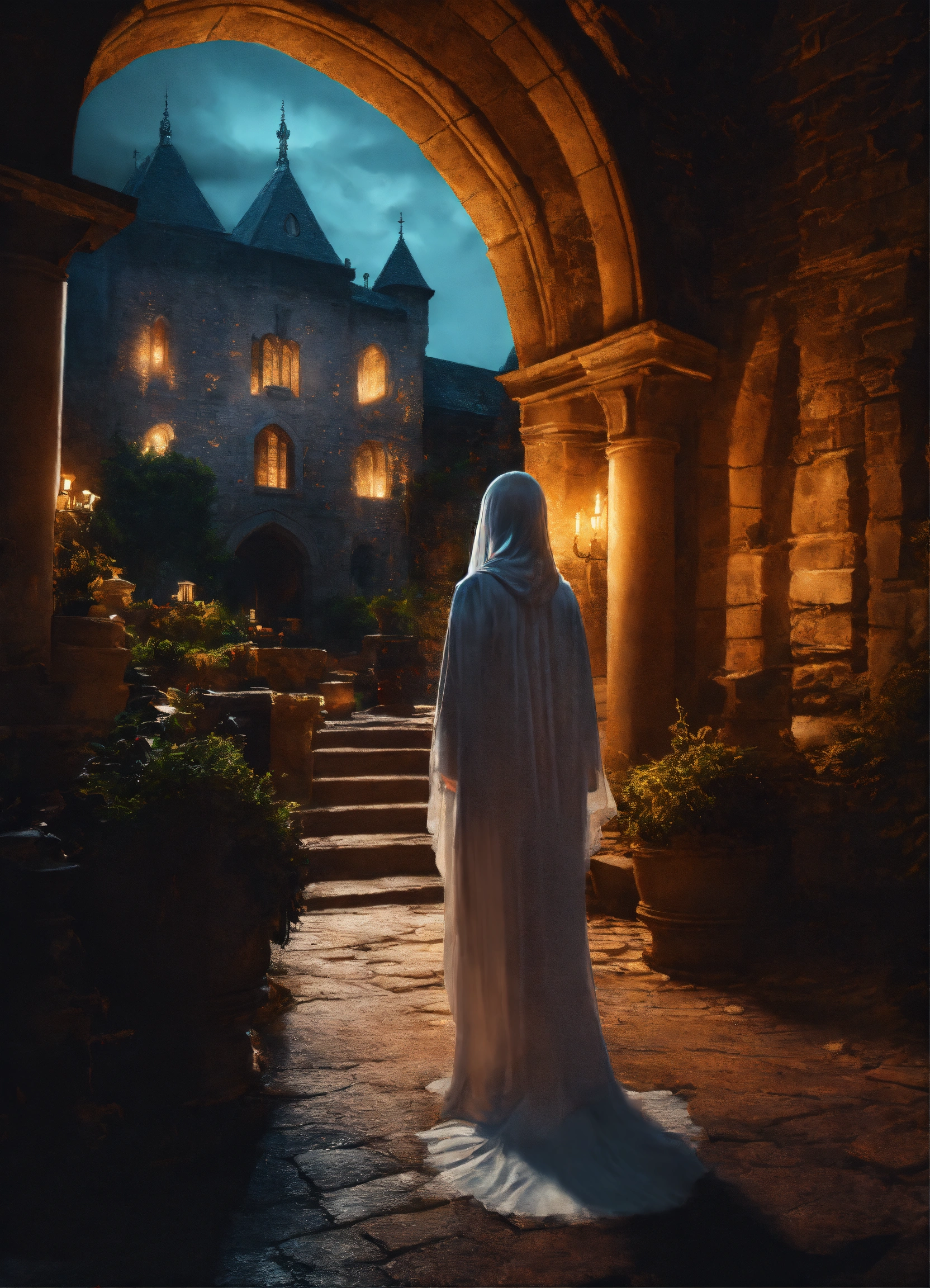Beautiful ghost girl walking through a castle at night, realistic photo, high detail, digital painting, cinematic, stunning, hyper-realistic, sharp focus, high resolution 8k, insanely detailed