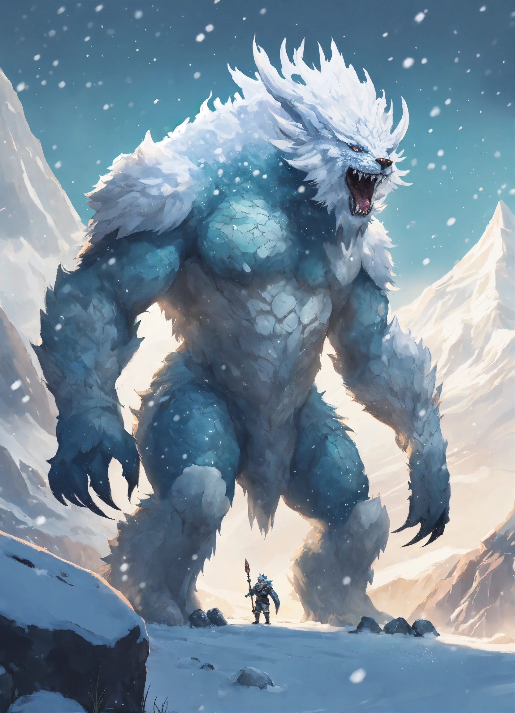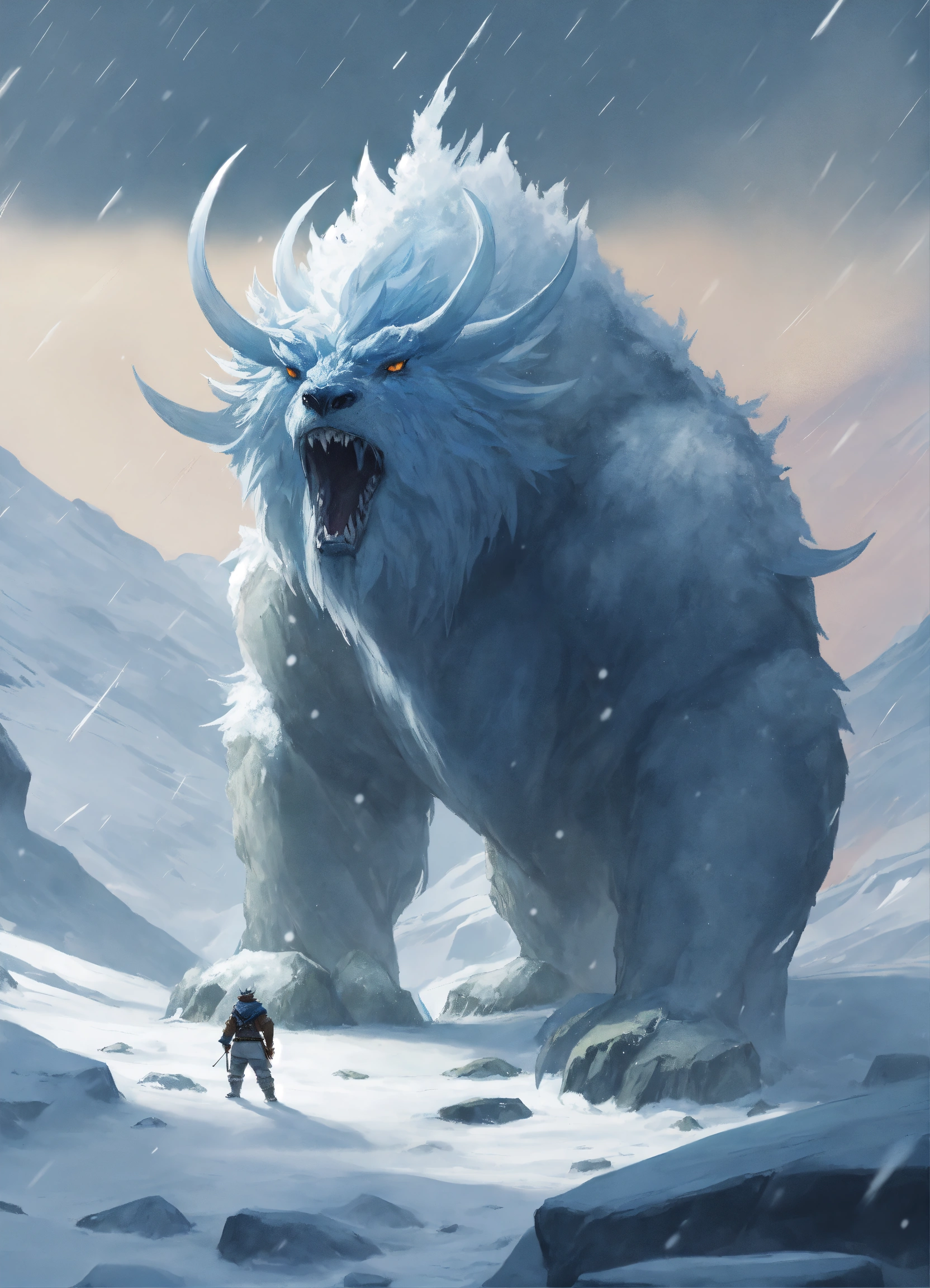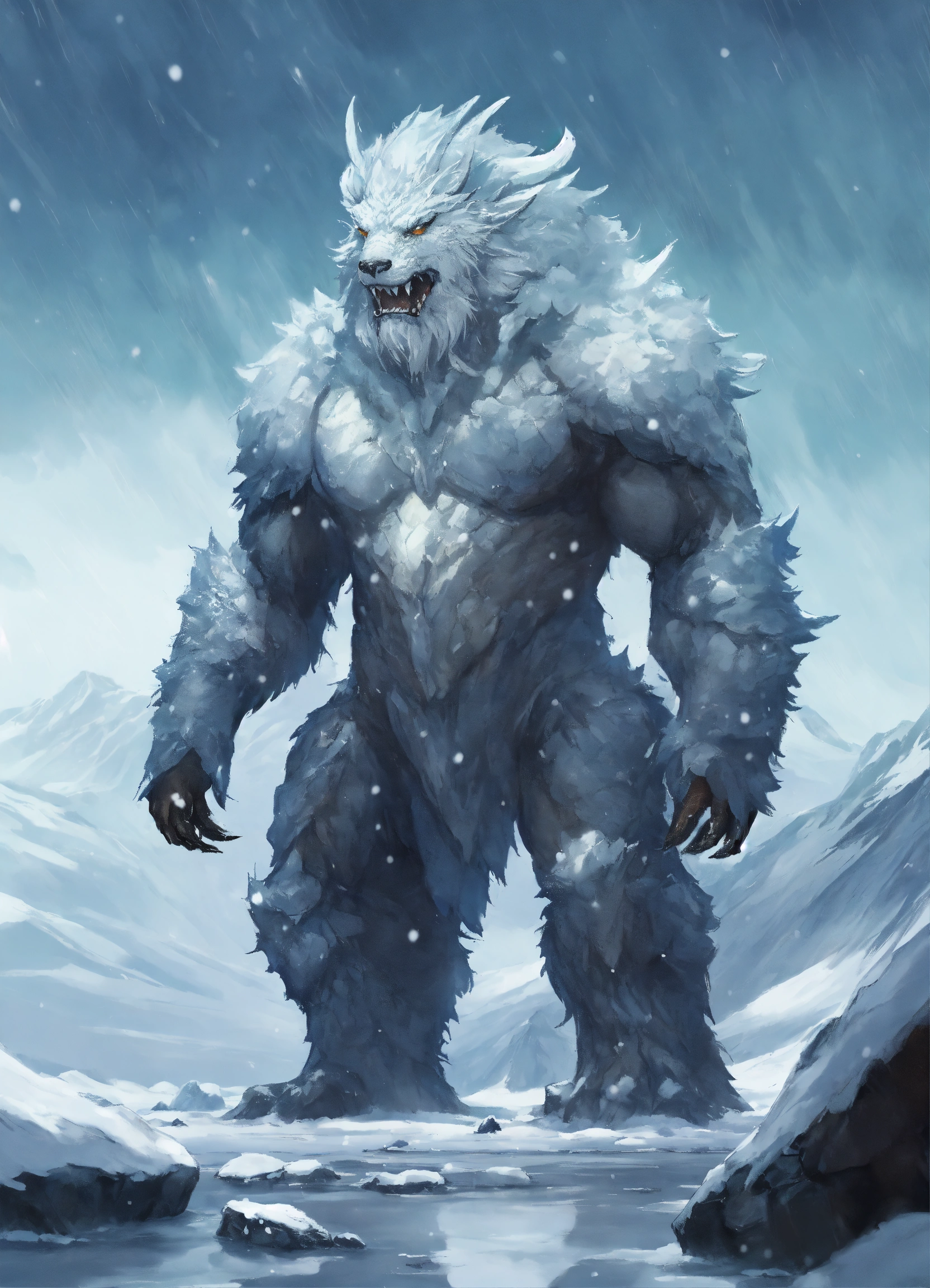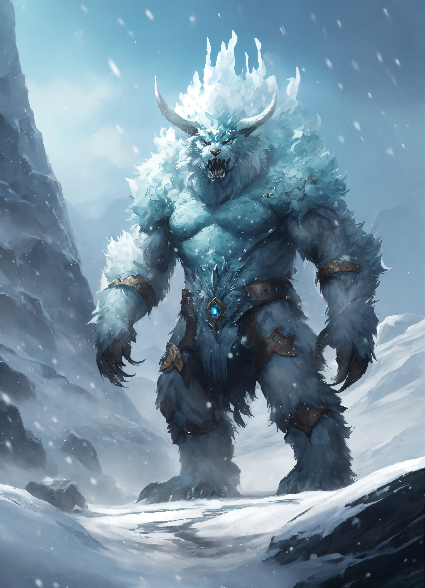 A fantasy monster that is a guardian of the tundra, large in stature, looks like snow, ice, and rocks attached to its body, with snow falling off, background tundra, graphic novel art