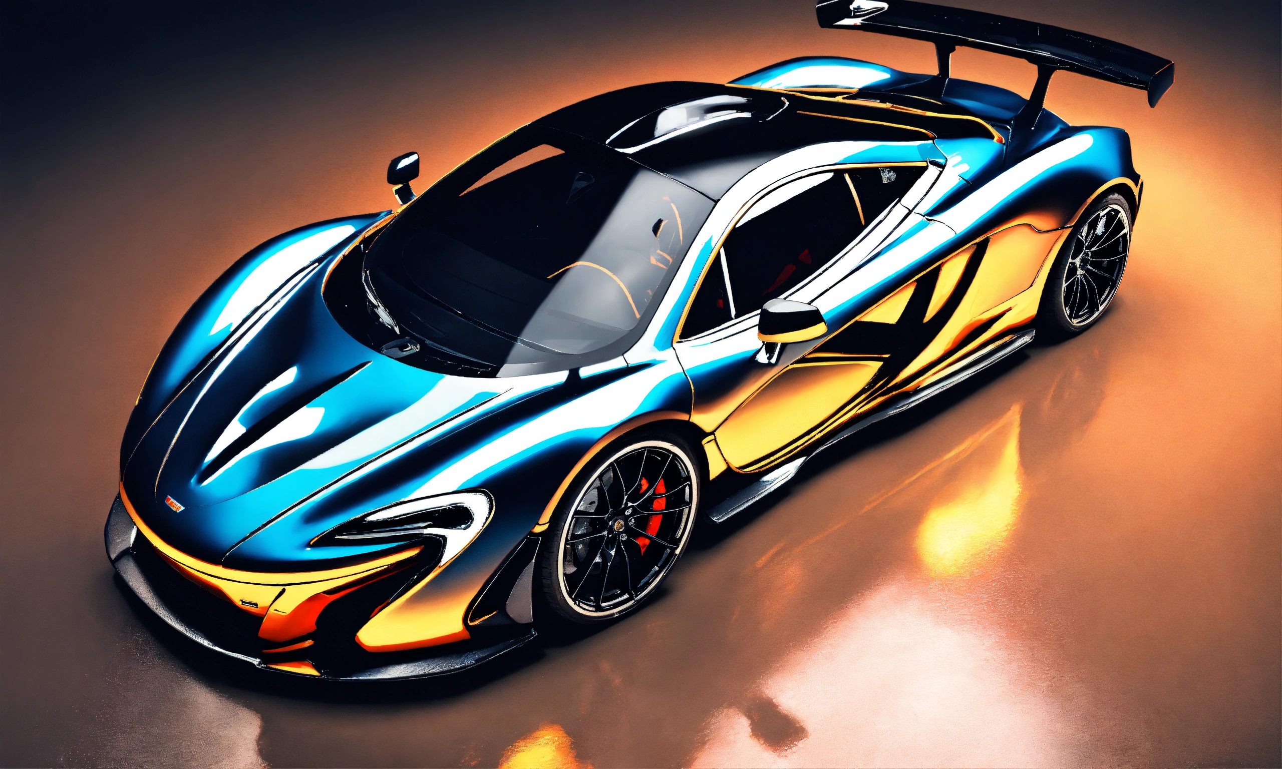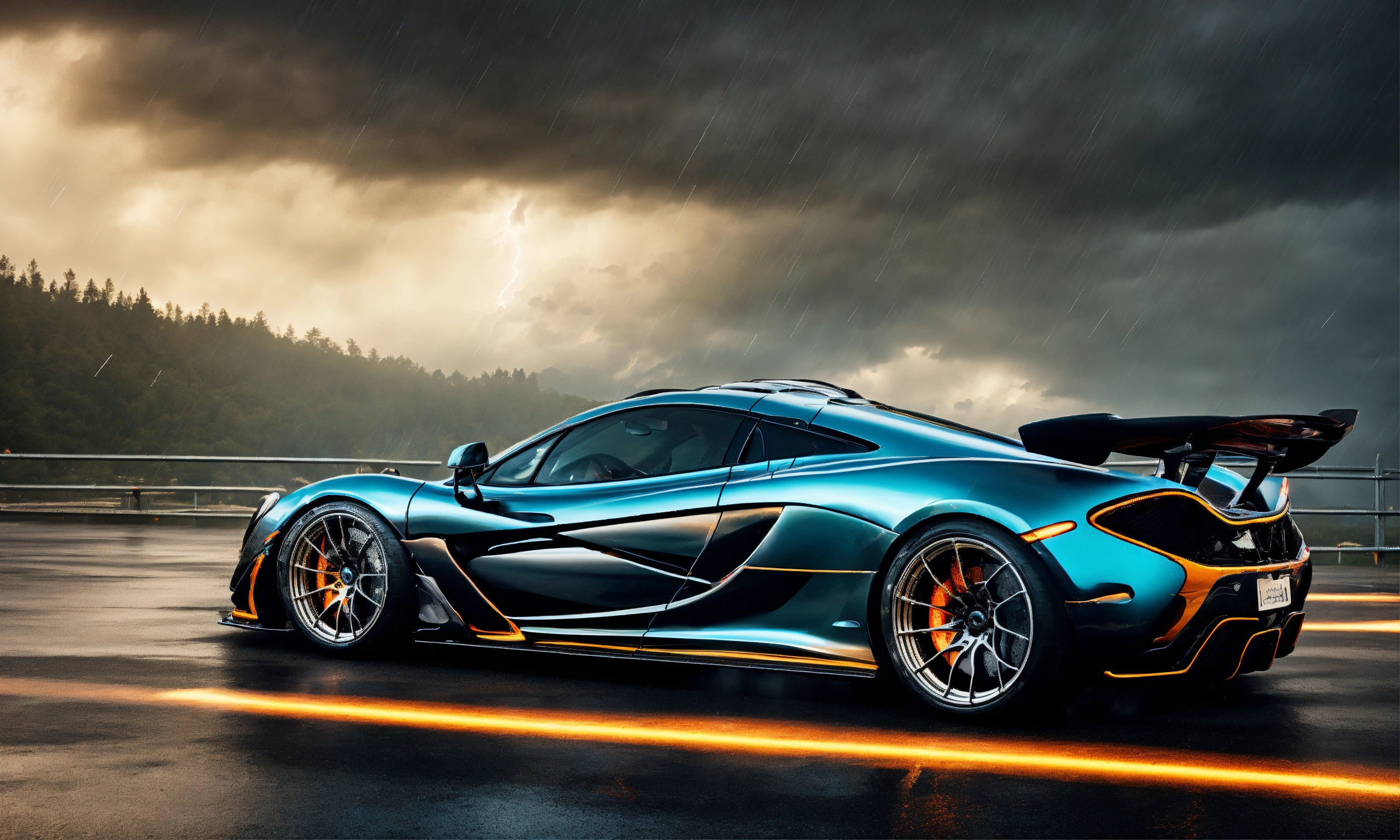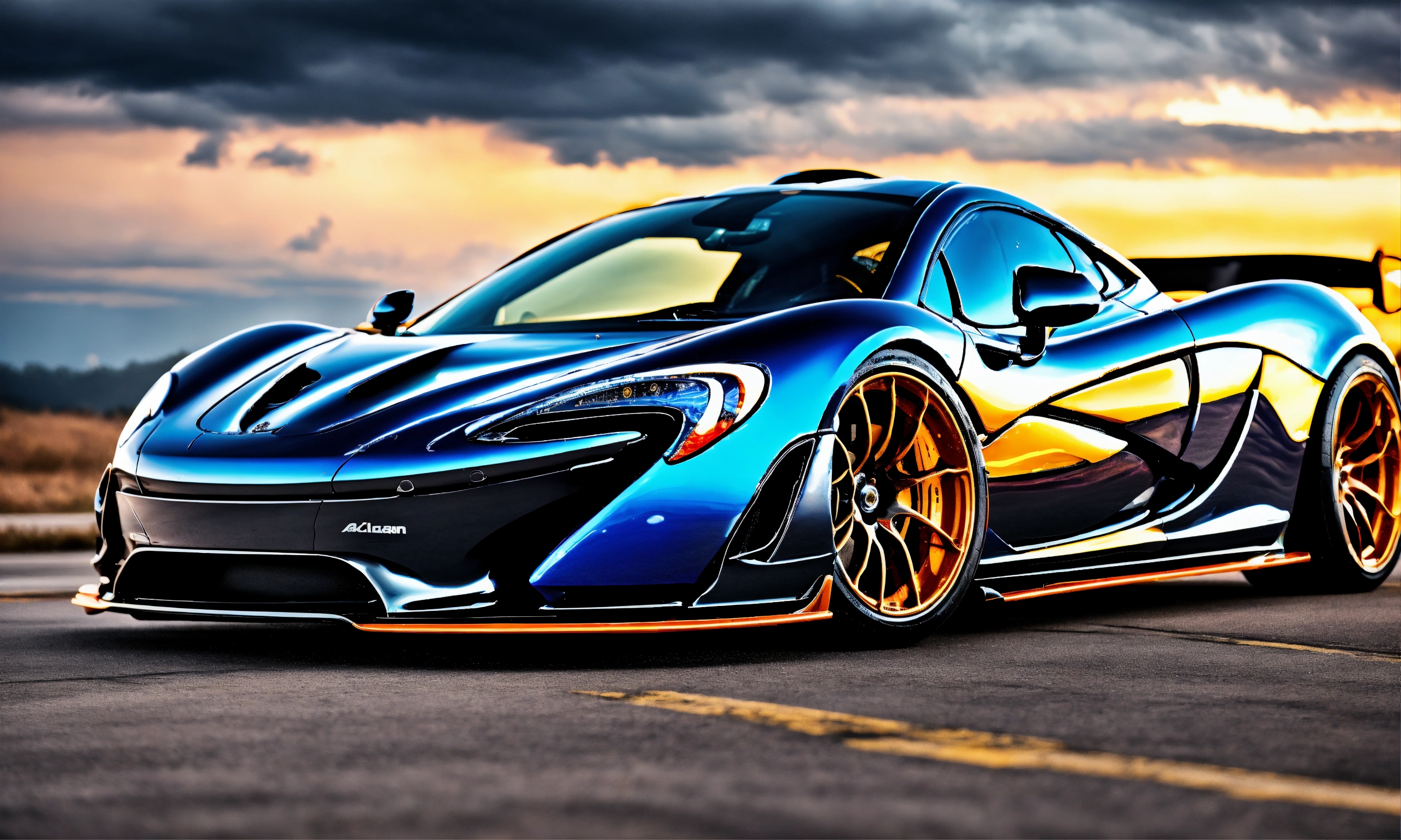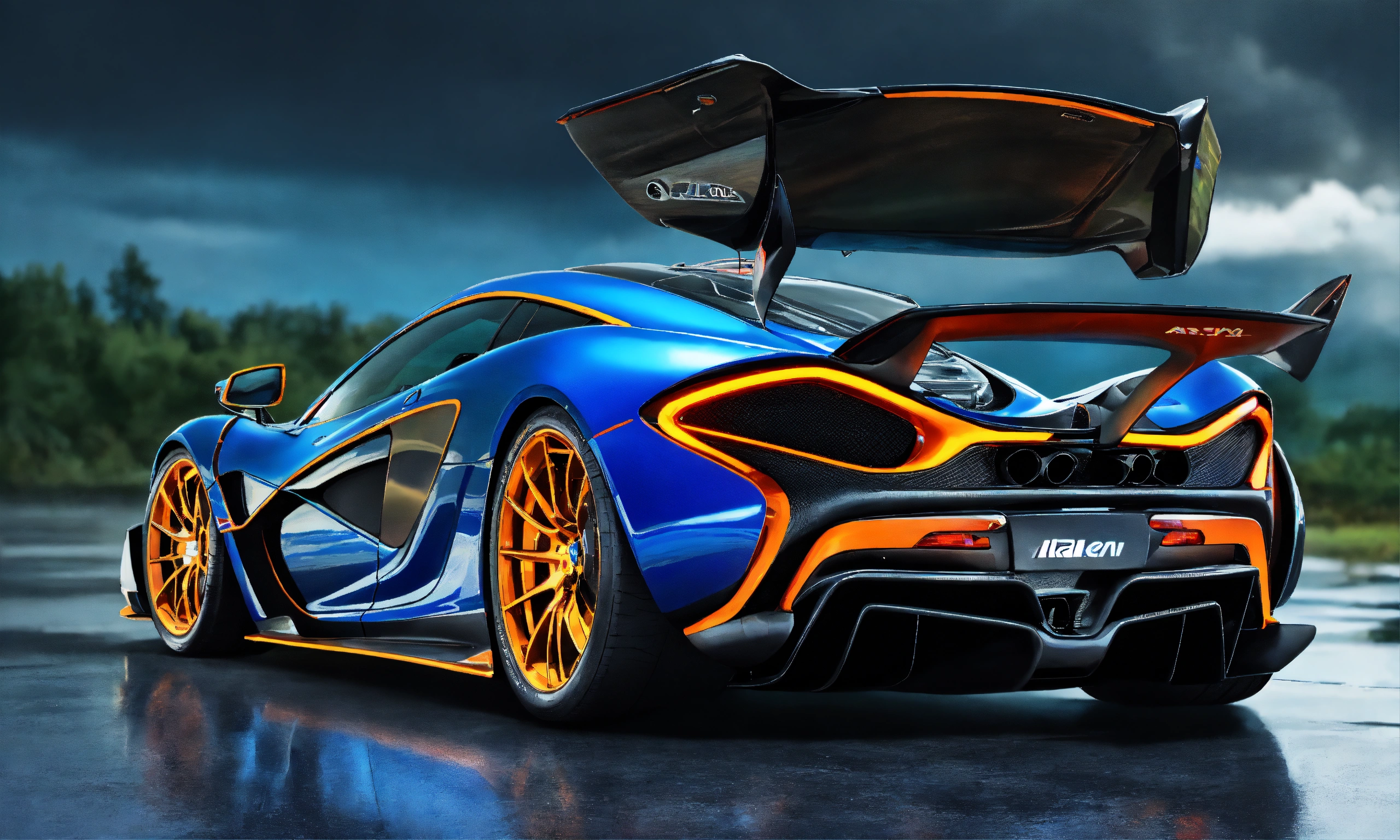 2d, highly realistic virtual tuning superdwidebody of mclaren p1, very intricate details, elegant, sharp edges, dark thunderstorm background, low saturation colors