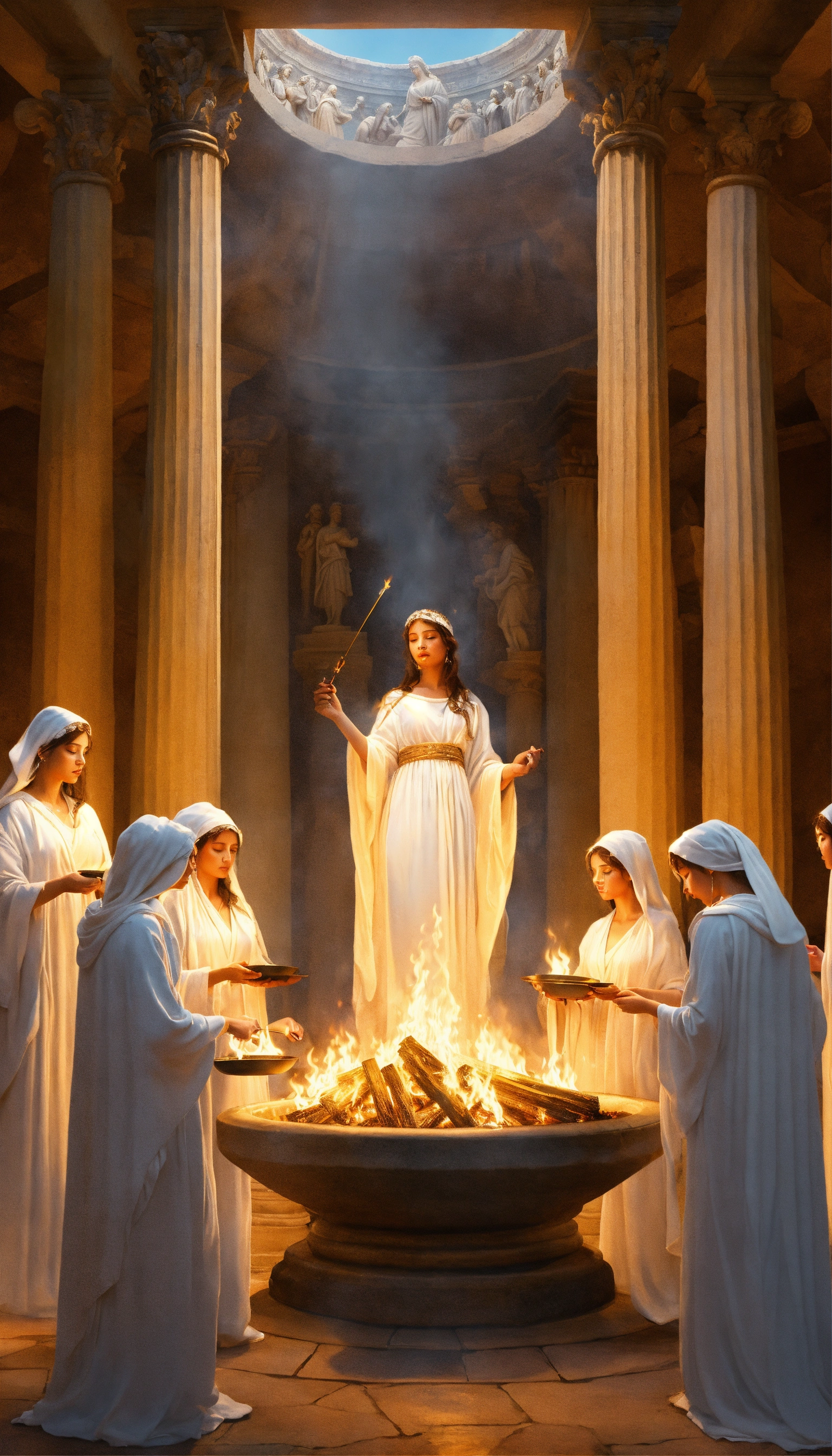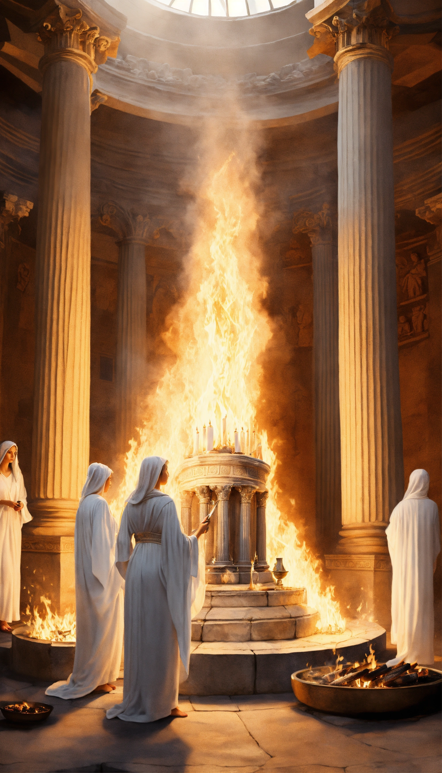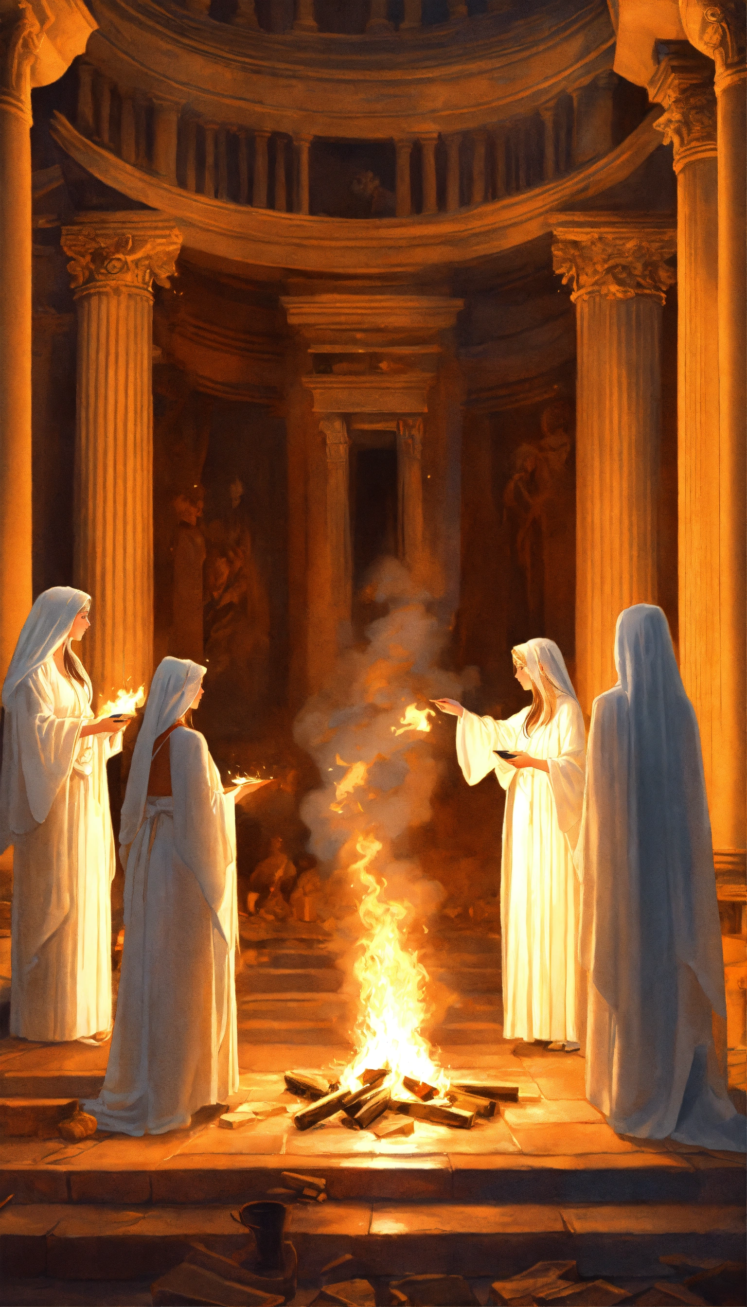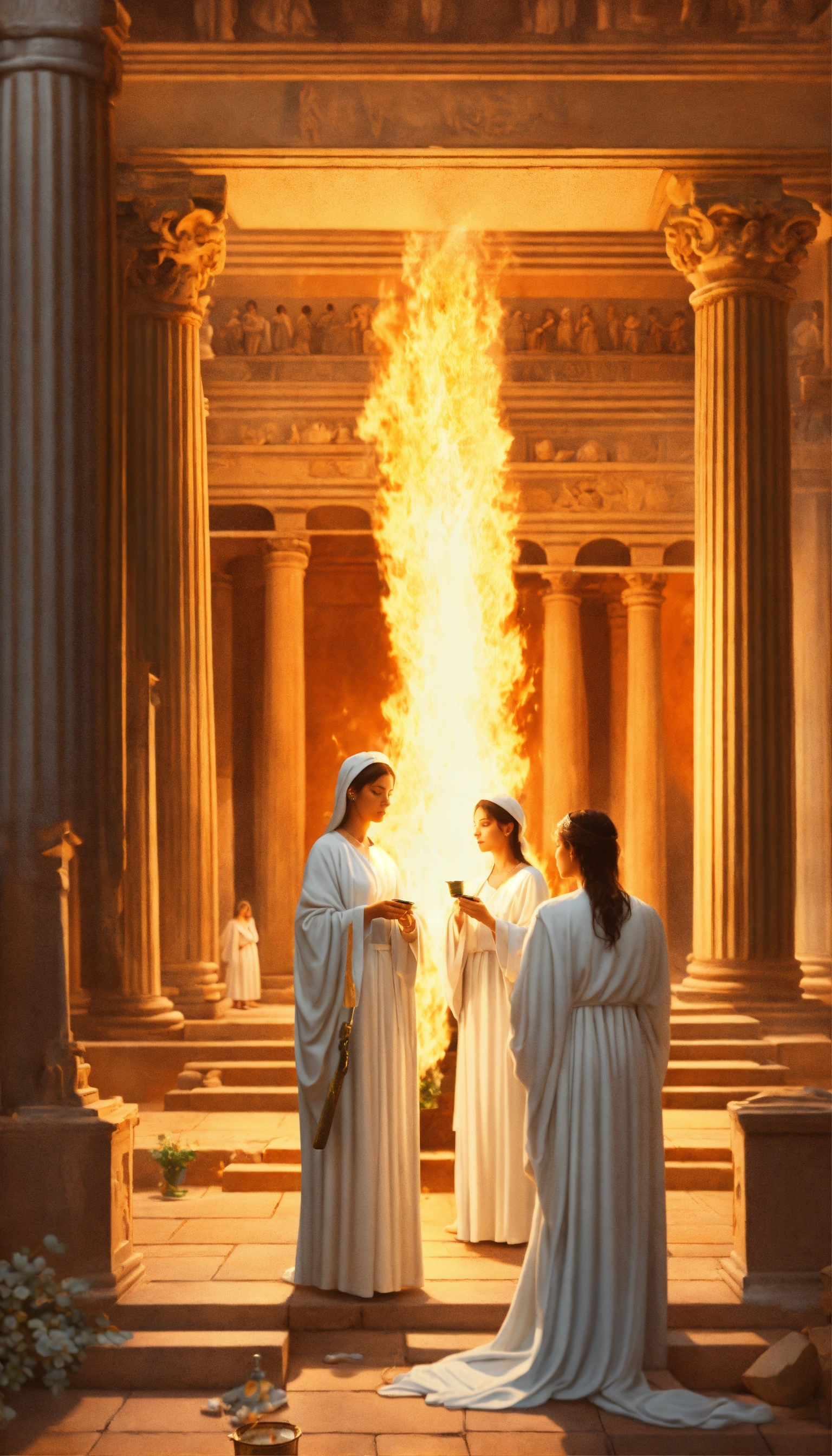 An artistic representation of the vestal virgins in their white robes, tending to the sacred fire in the temple of vesta.