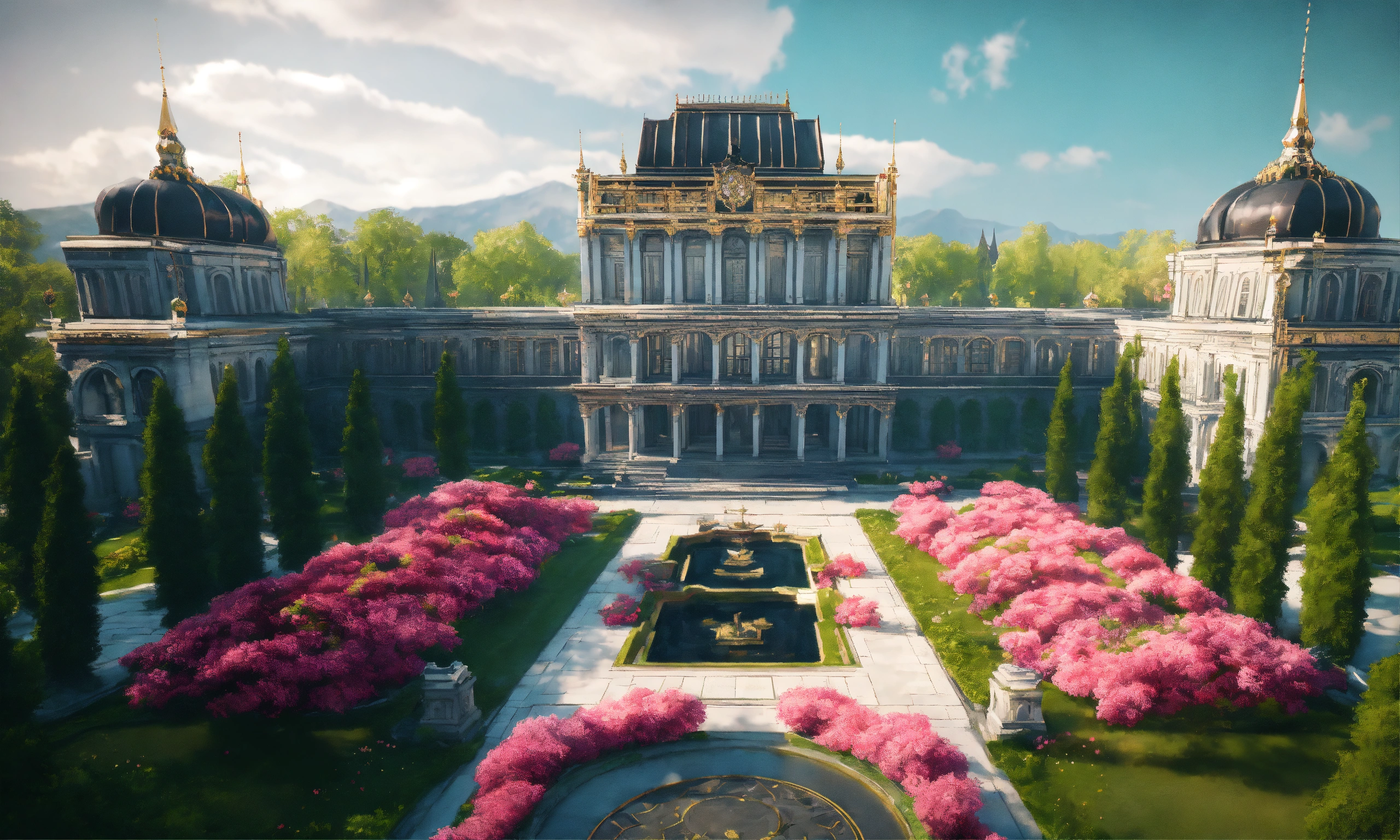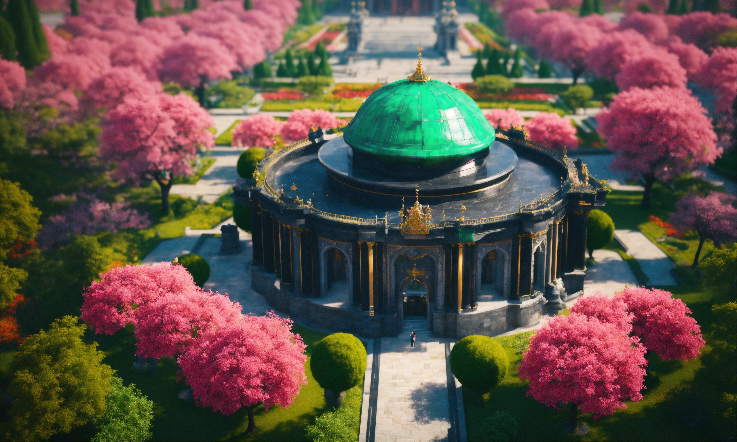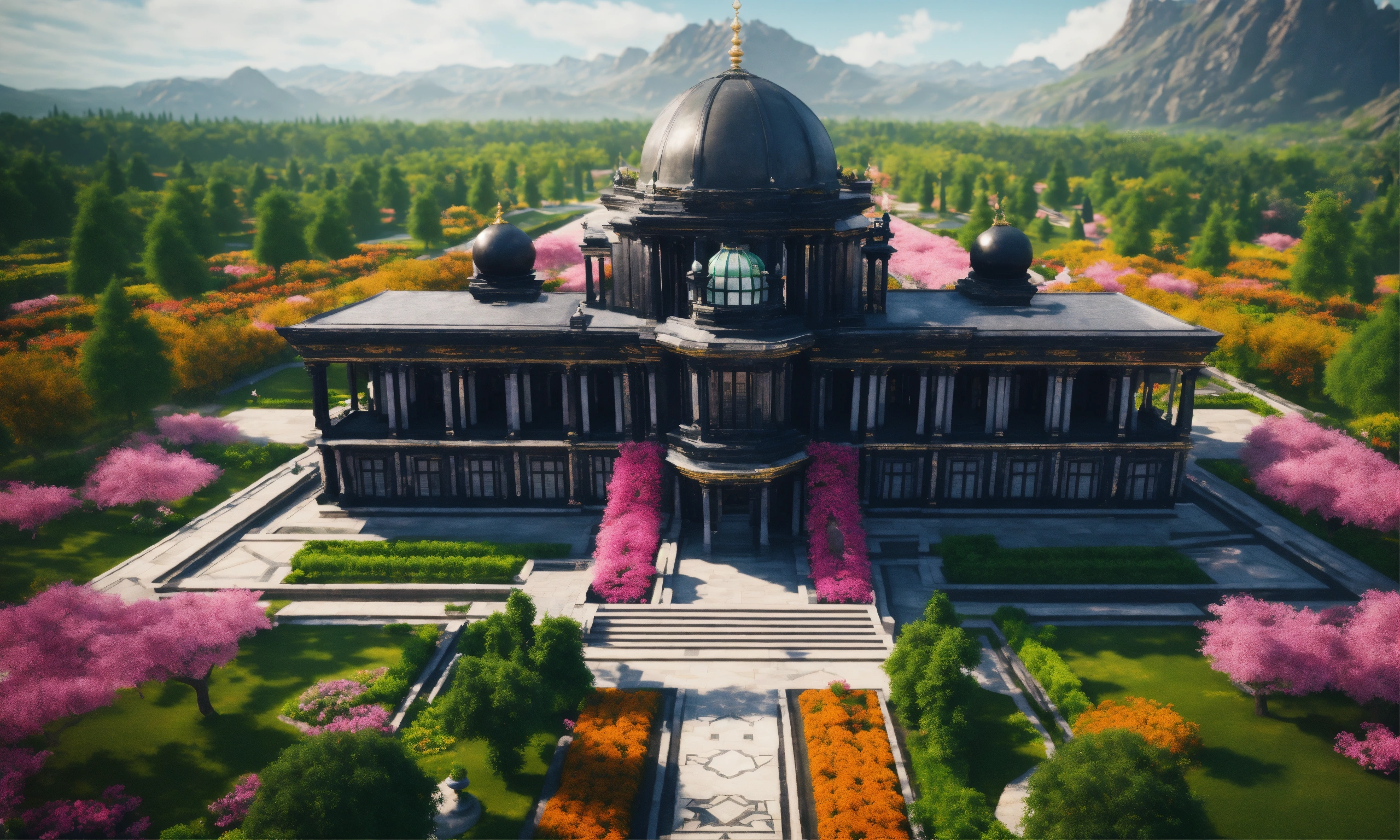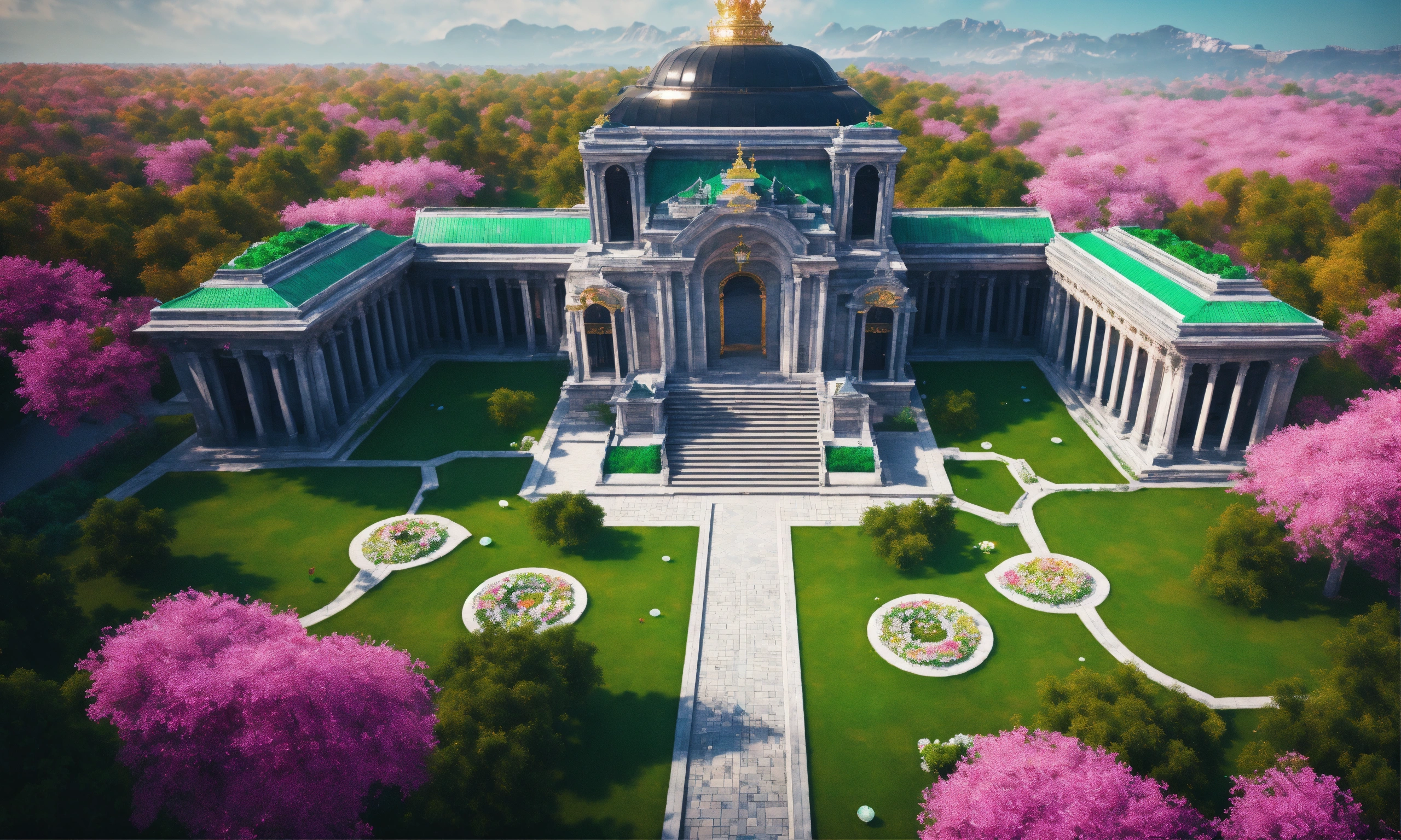 Overhead view of a black marble and jade sci fi symmetrical royal palace in spring, colorful flower gardens around the palace, russian architecture, 8k, unreal engine