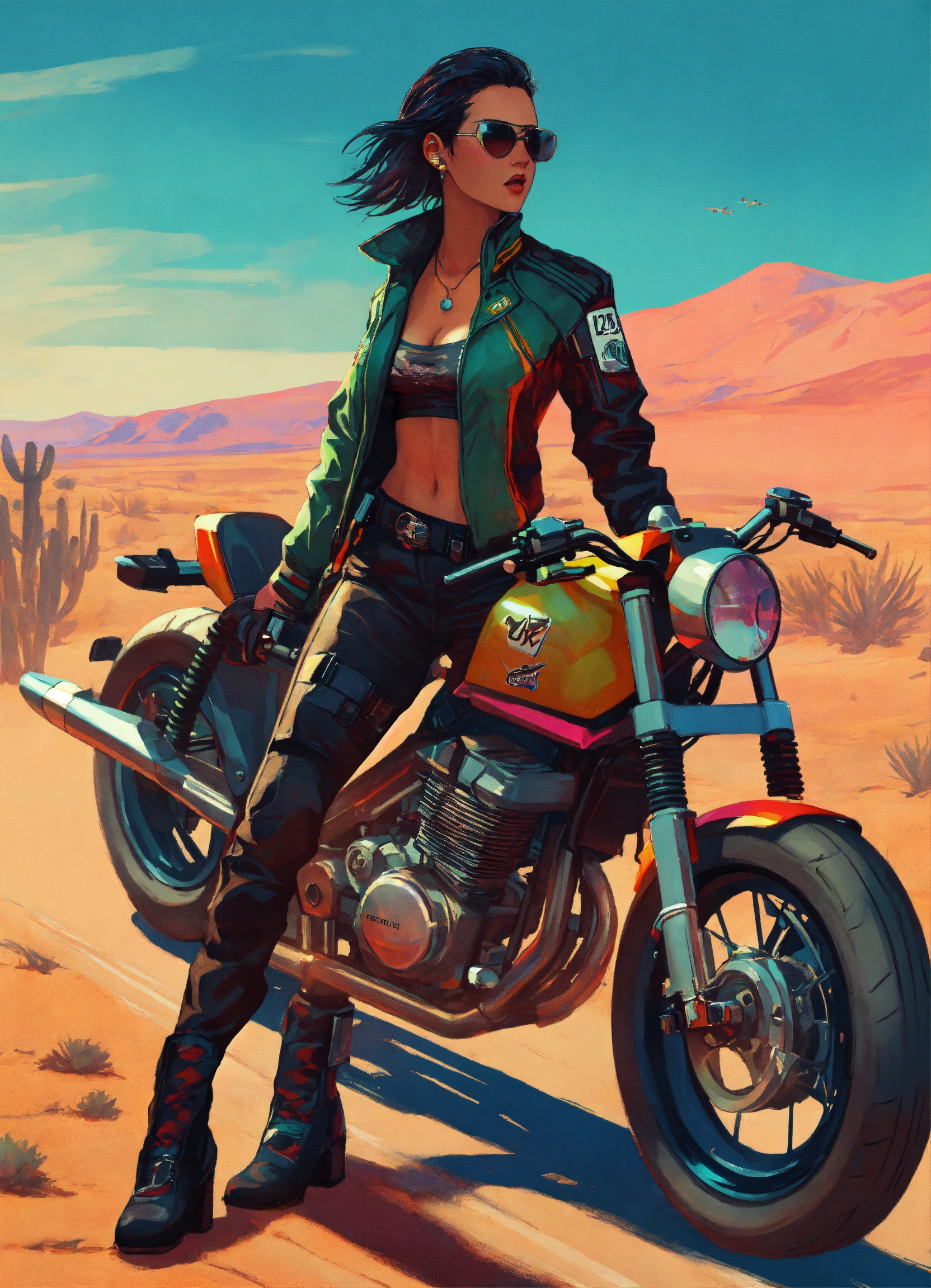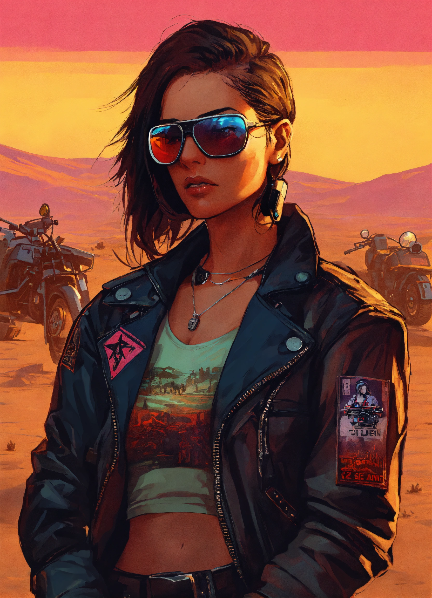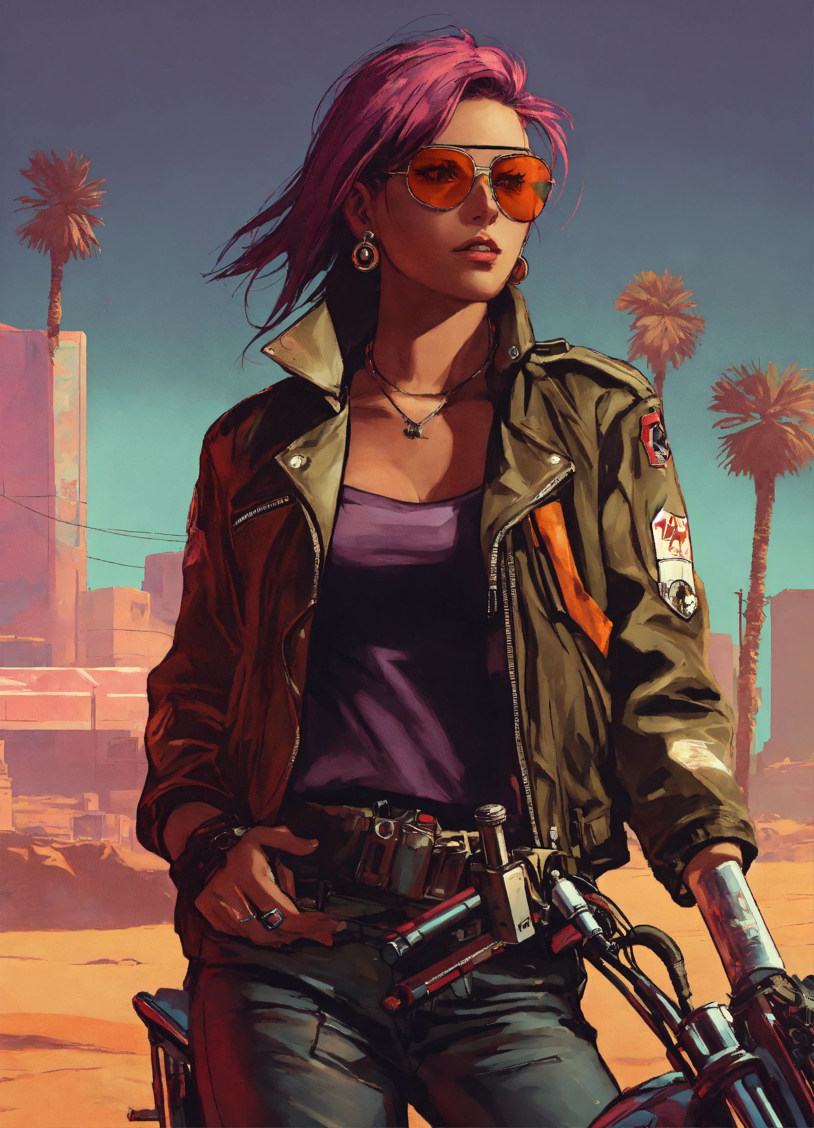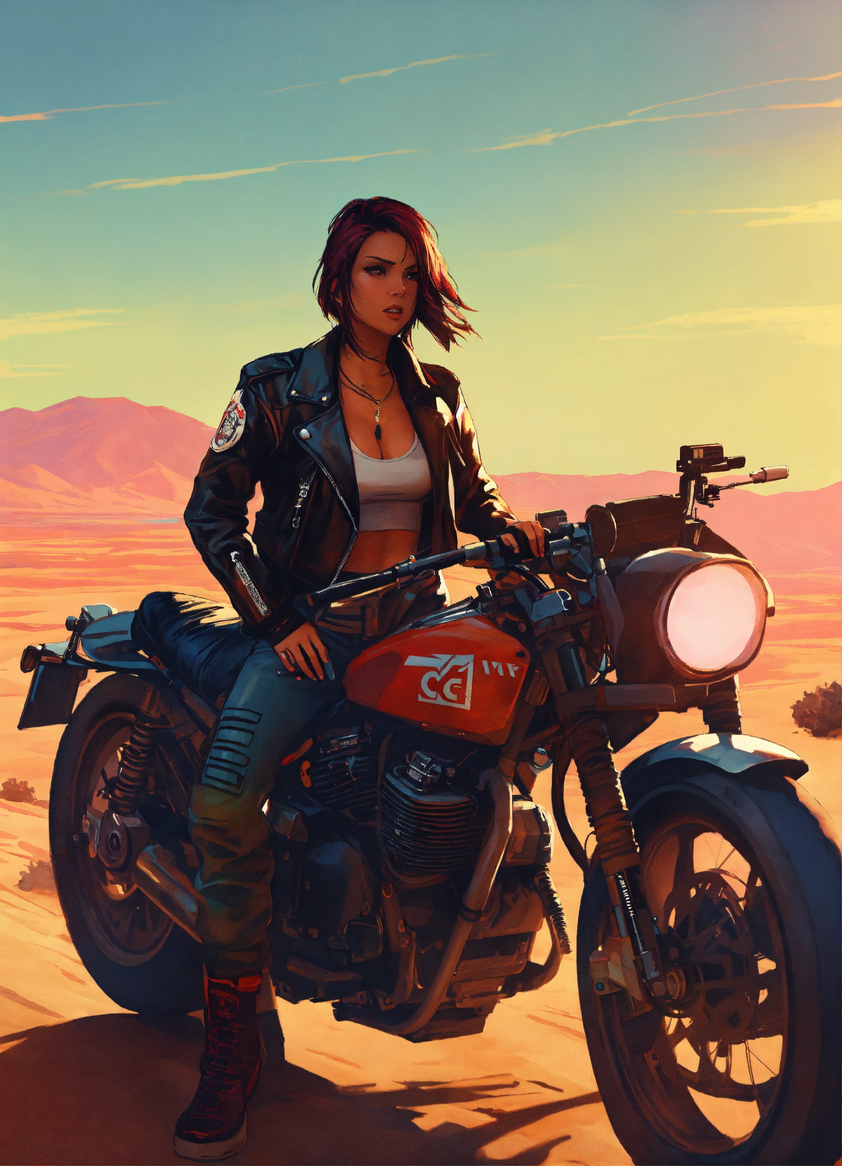 Female cyberpunk early 20's motorcycle gang member naive but tough in a jacket in a desert gta poster art style